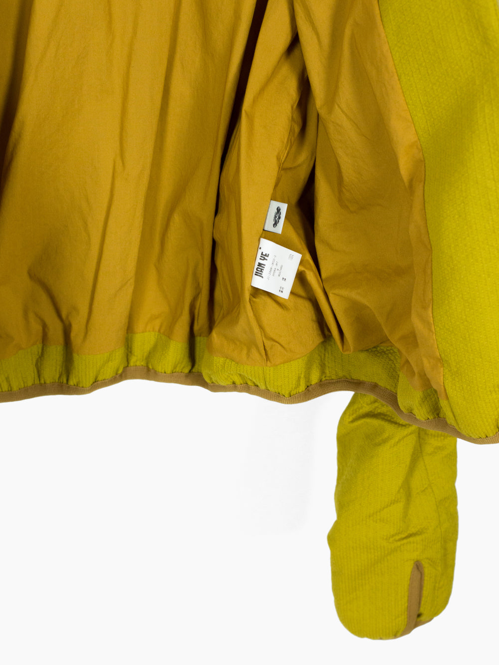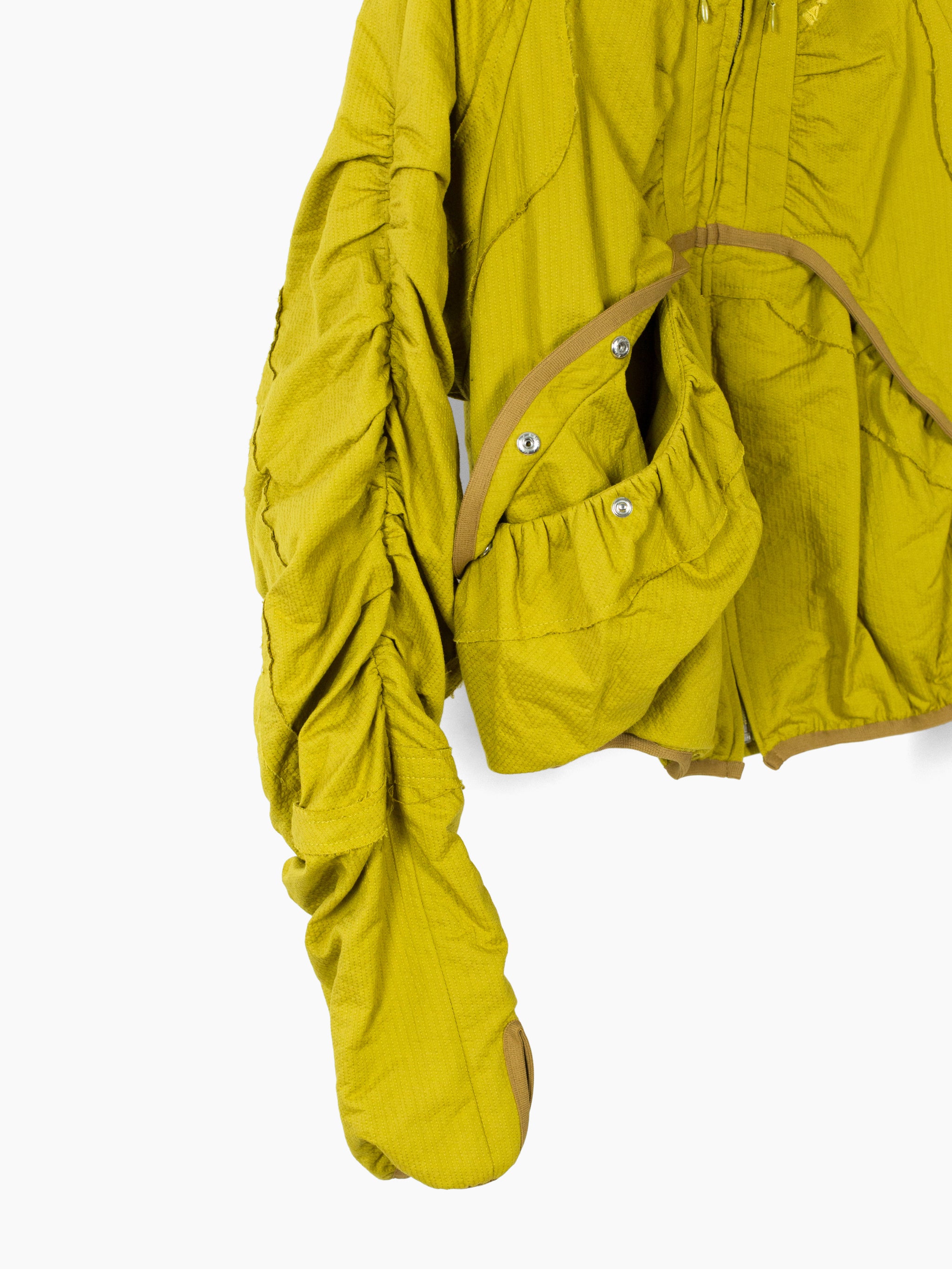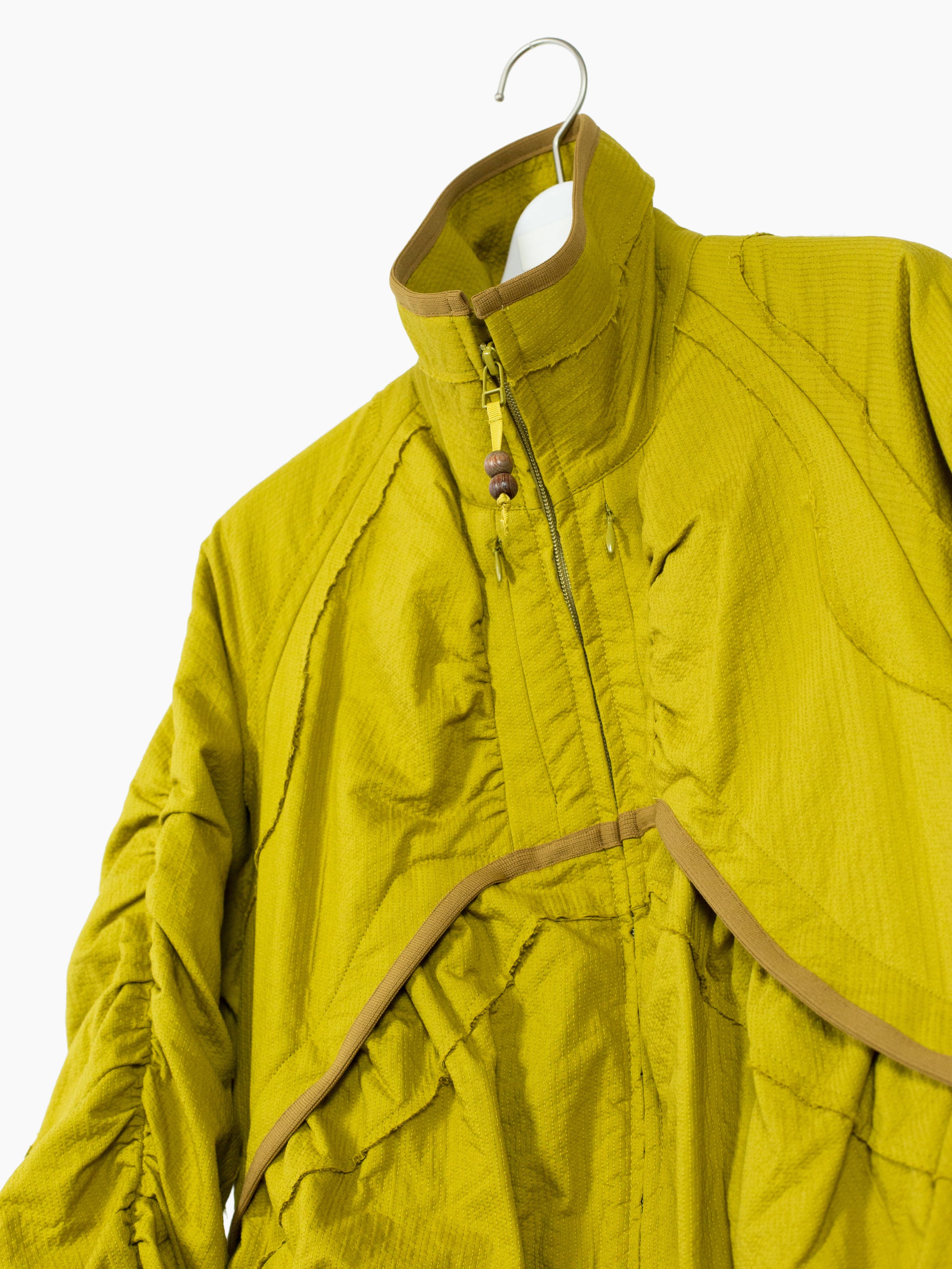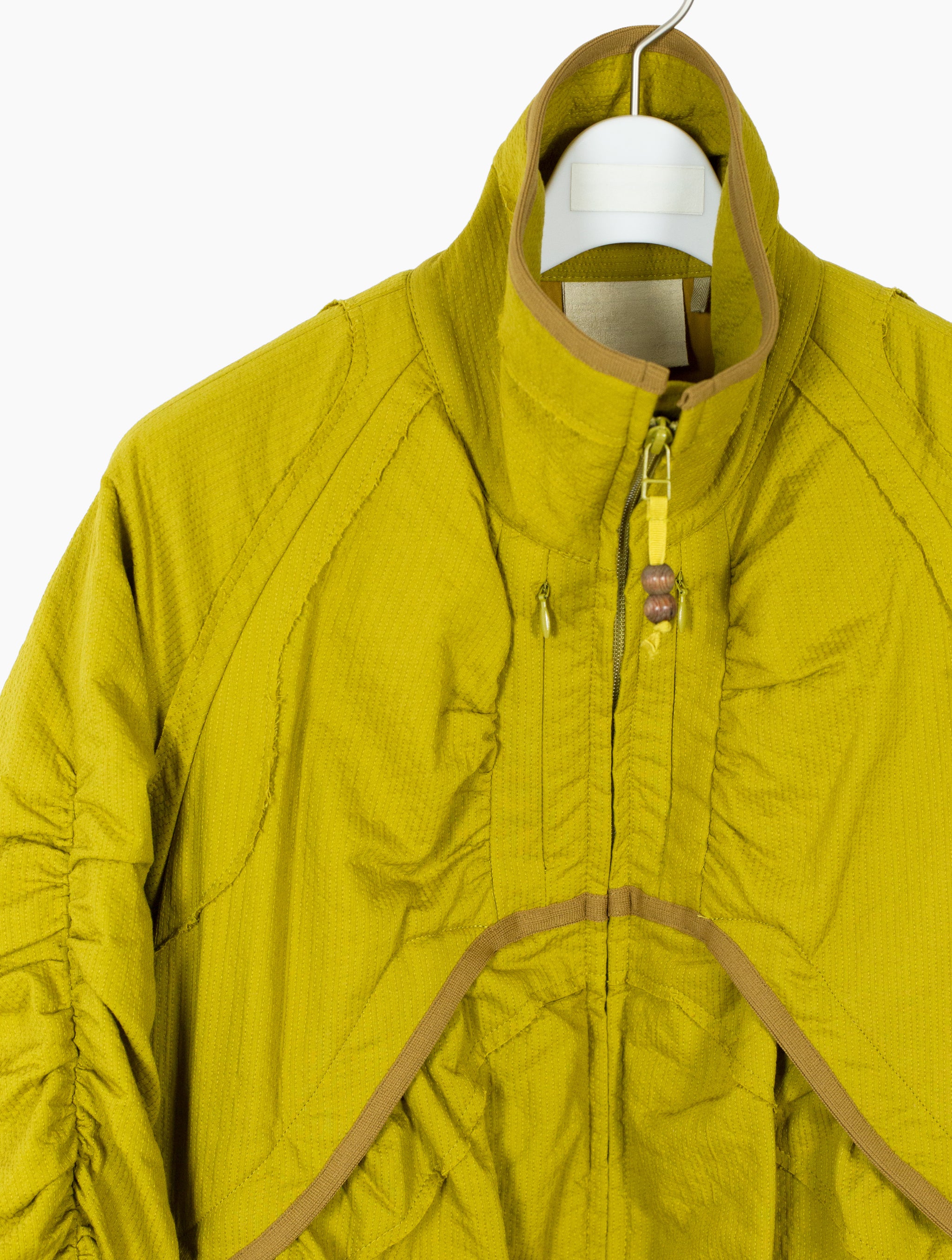 Vibrant mustard yellow cotton with parallel column stitching for texture and visual depth. Fully puckered seams fold and drape to create the impression of reptilian scales Elastic-bound edge finishing at hem, cuffs, pocket flaps, and collar.