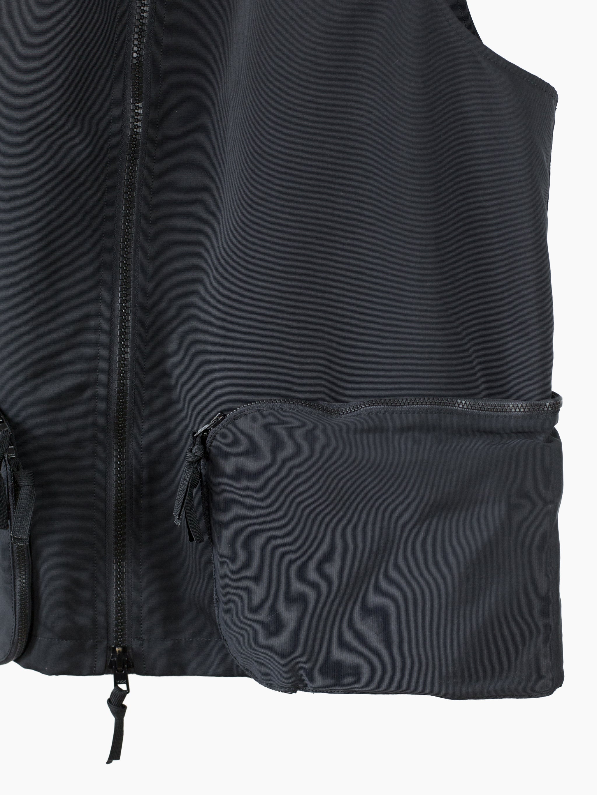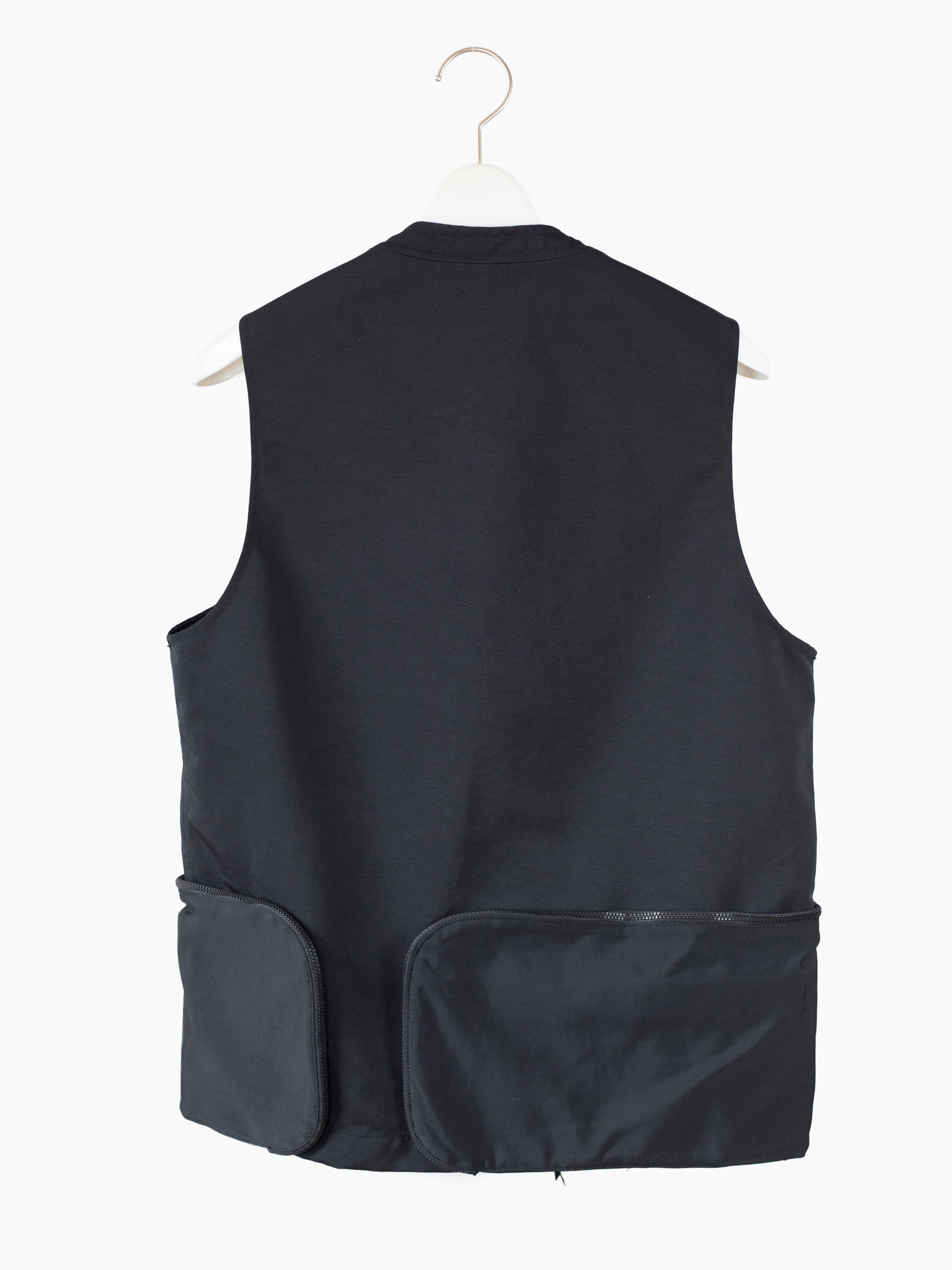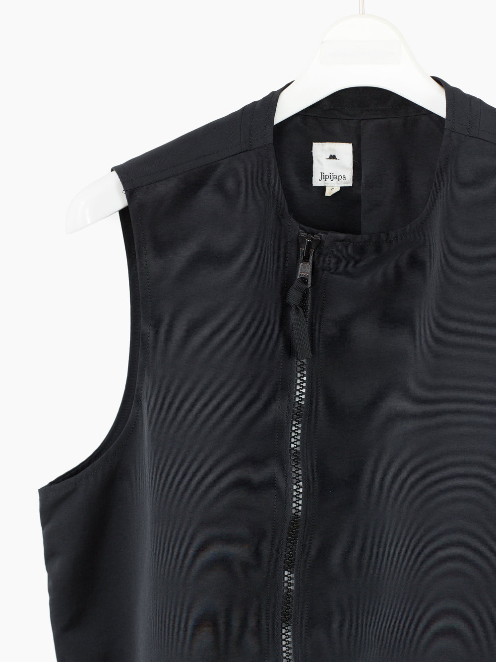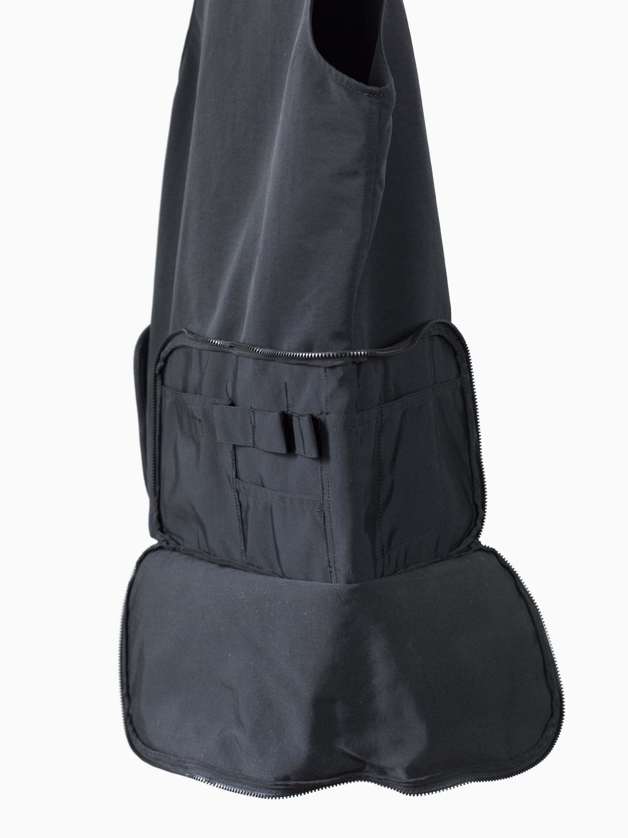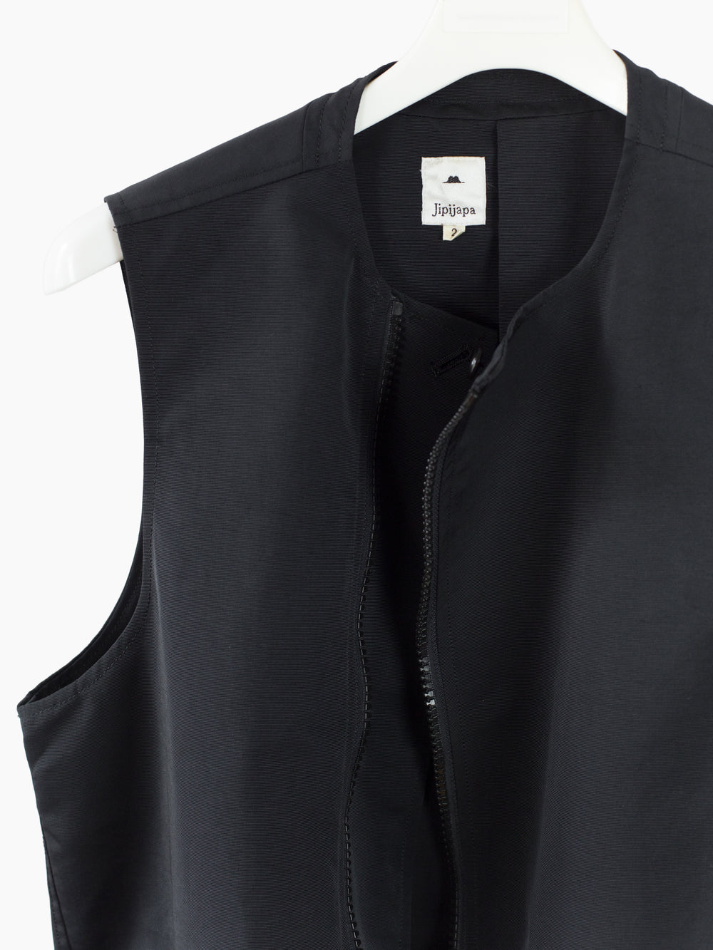 Asymmetrical Cargo vest from 90s Japanese brand Jipijapa, featuring two separate zippered compartments set at the waist that collectively wrap 360 degrees around the body. Double zippered access along the perimeter allows for calibrated access, with a wealth of interior compartmentalization. Offset double-zip front closure gently nods towards biker styling, with additional inner button fastening at the top of the placket.