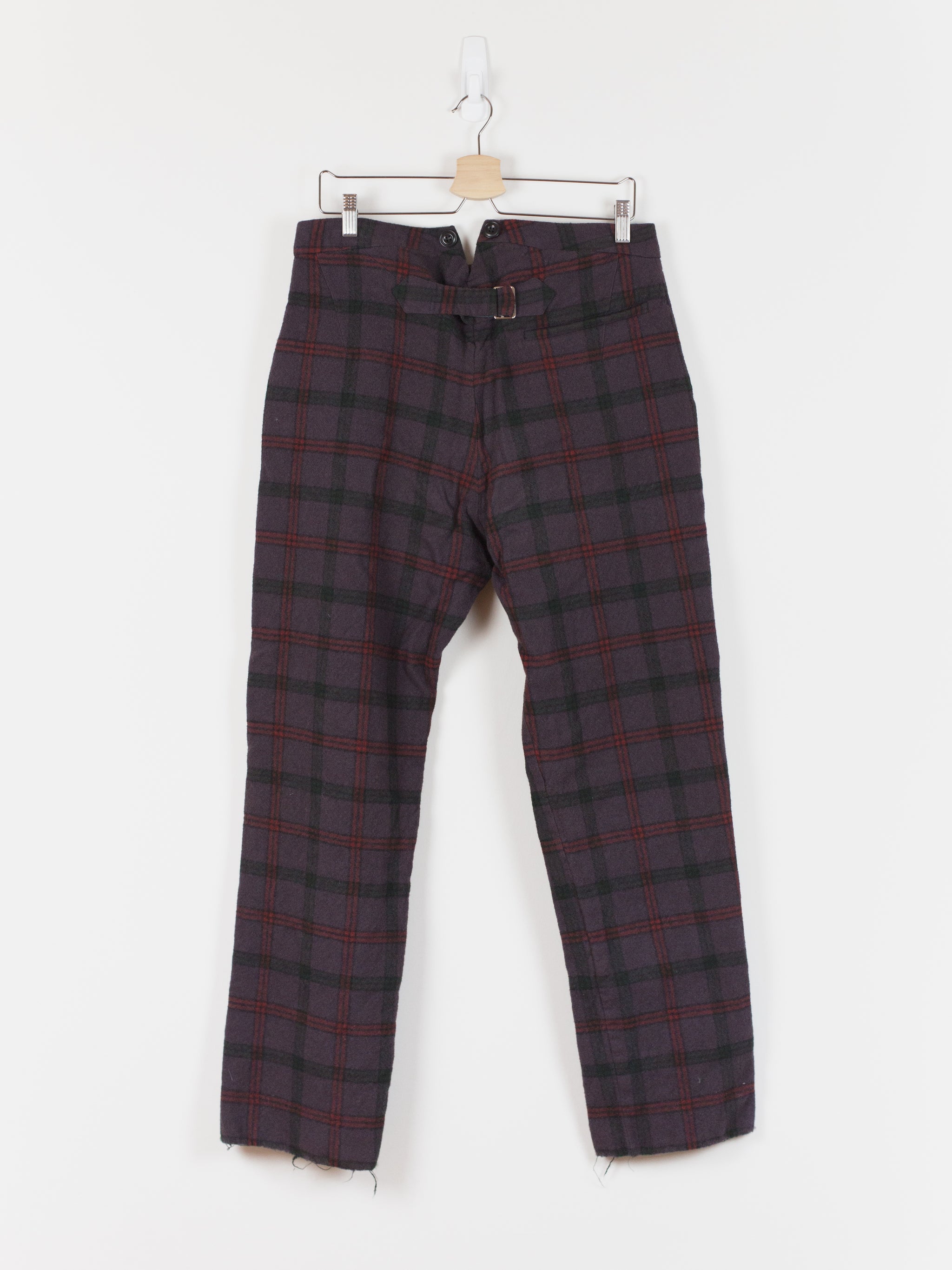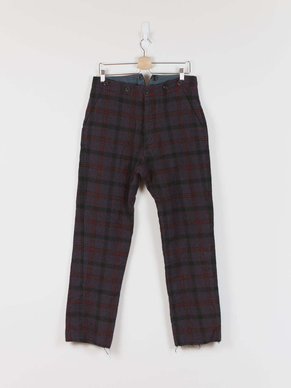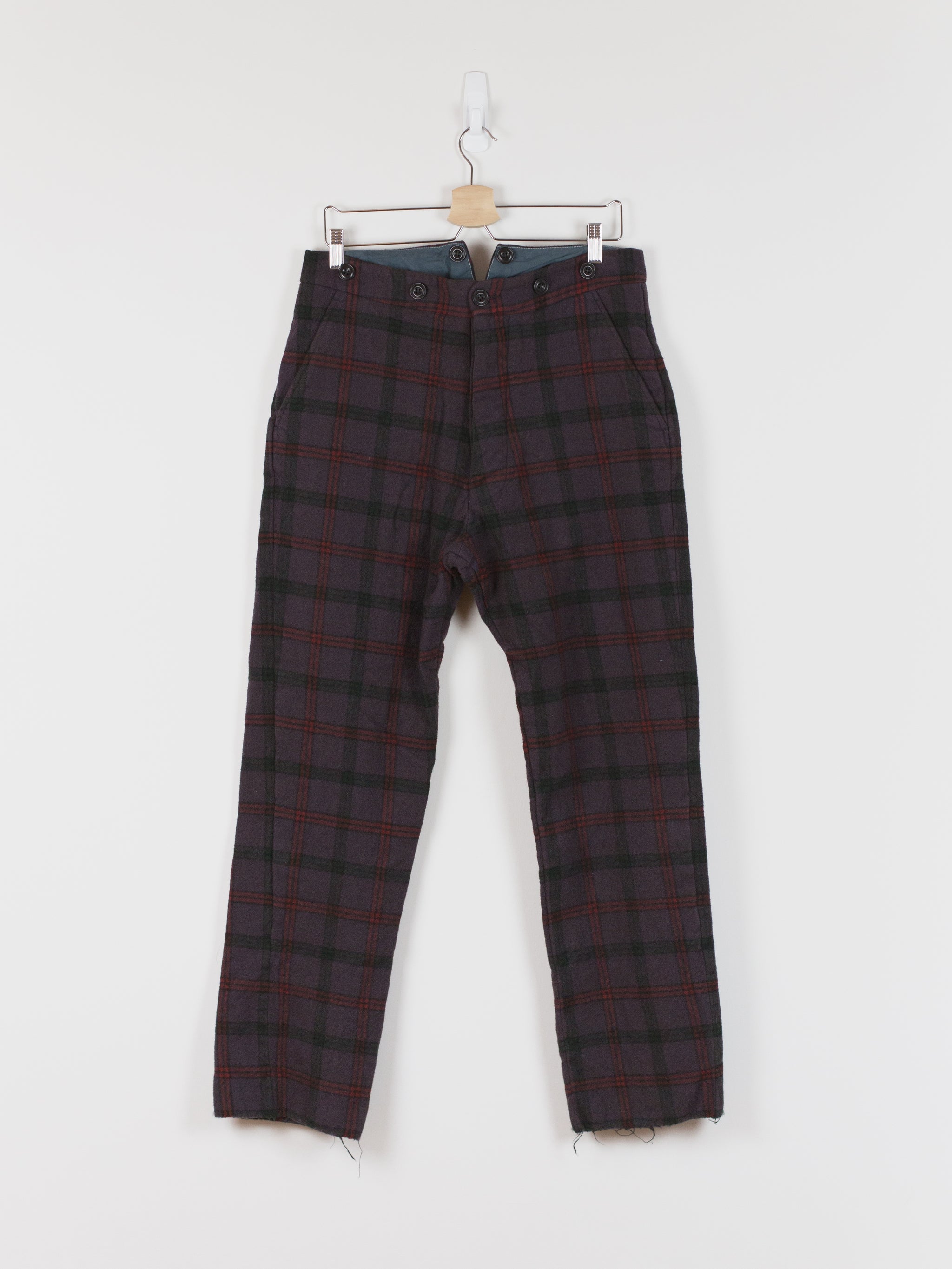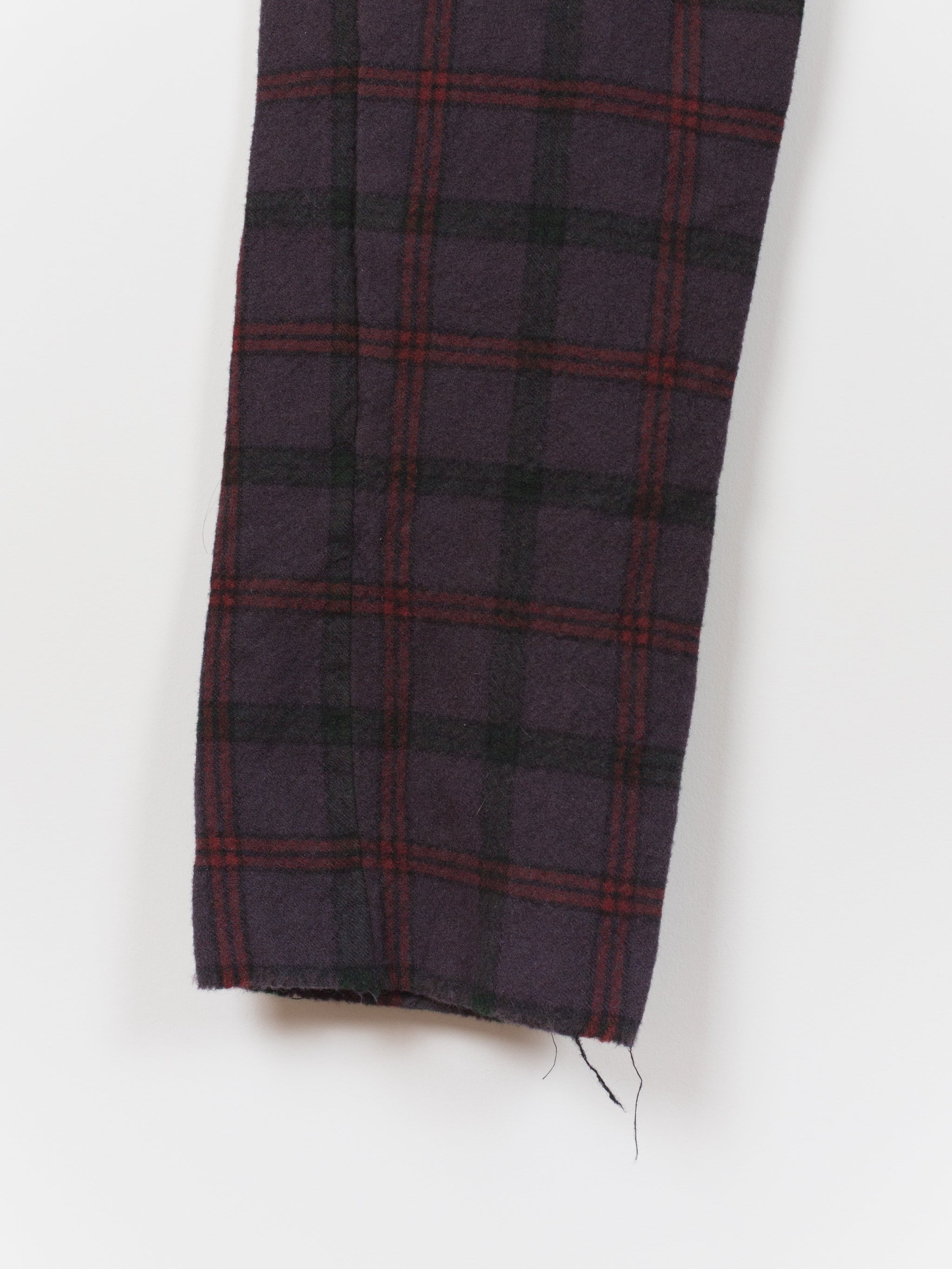 This pant is cut with a slim-straight leg in a soft and substantial melton wool featuring a subtle eggplant check. The plush face fabric has a natural wrinkle and uneven texture that embodies the hand-crafted aesthetic of John Alexander Skelton's work. The soft hand and perceptible thickness of the wool creates a cozy barrier against the cold. Fully tailored waistband and interior construction are sewn out of paper cotton and feature hand-labelled and hand-numbered garment information. This piece is an excellent representation of Skelton's dedication to modernizing historical/antique processes and forms, appearing at once both old and new and carrying with it a versatility for any wardrobe.