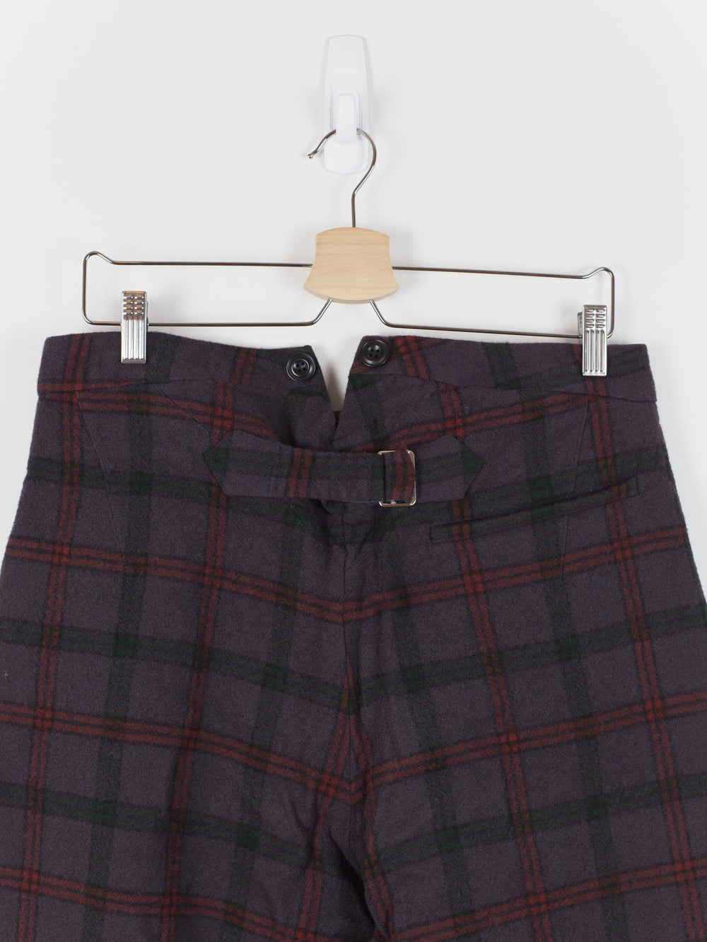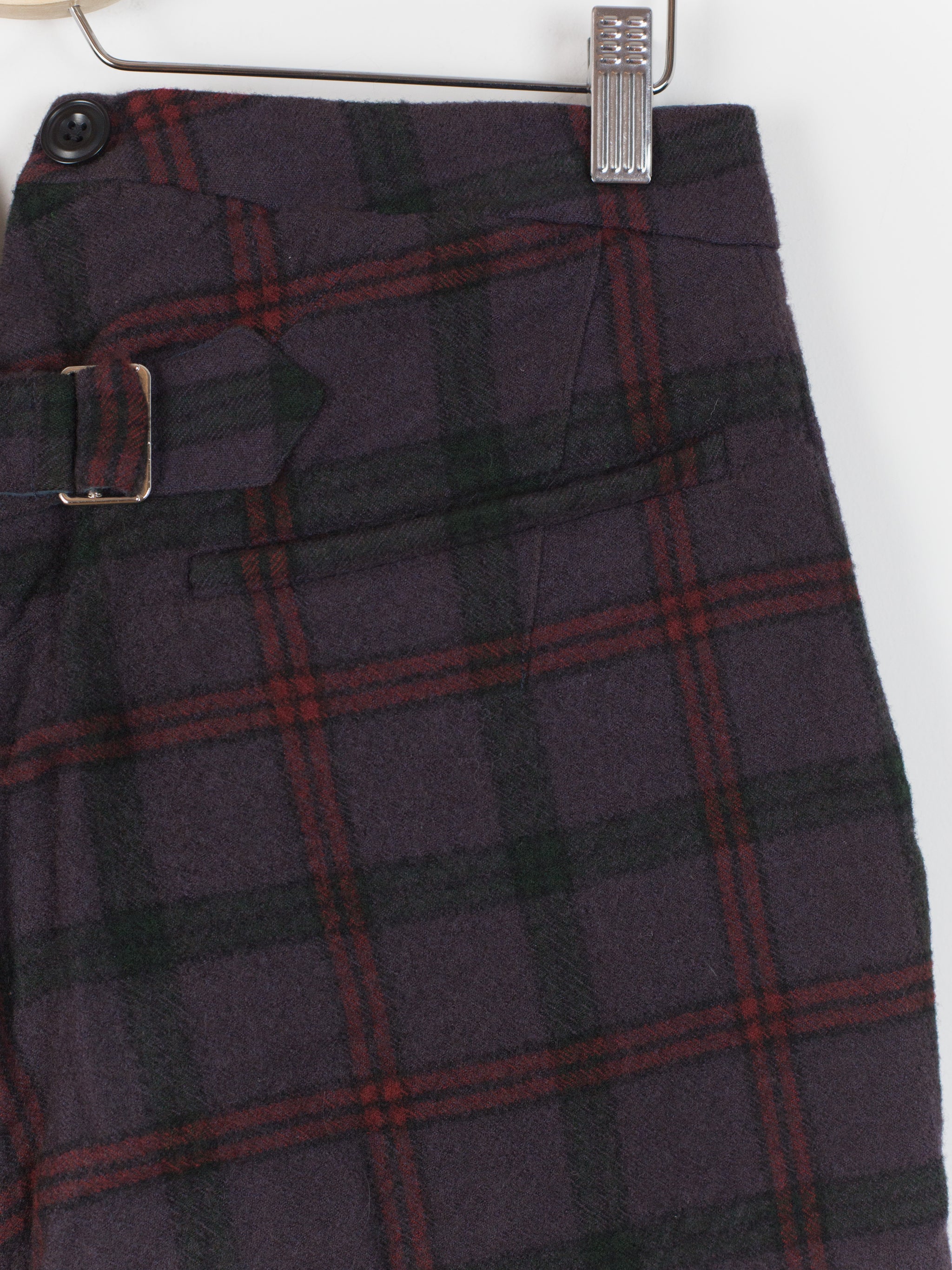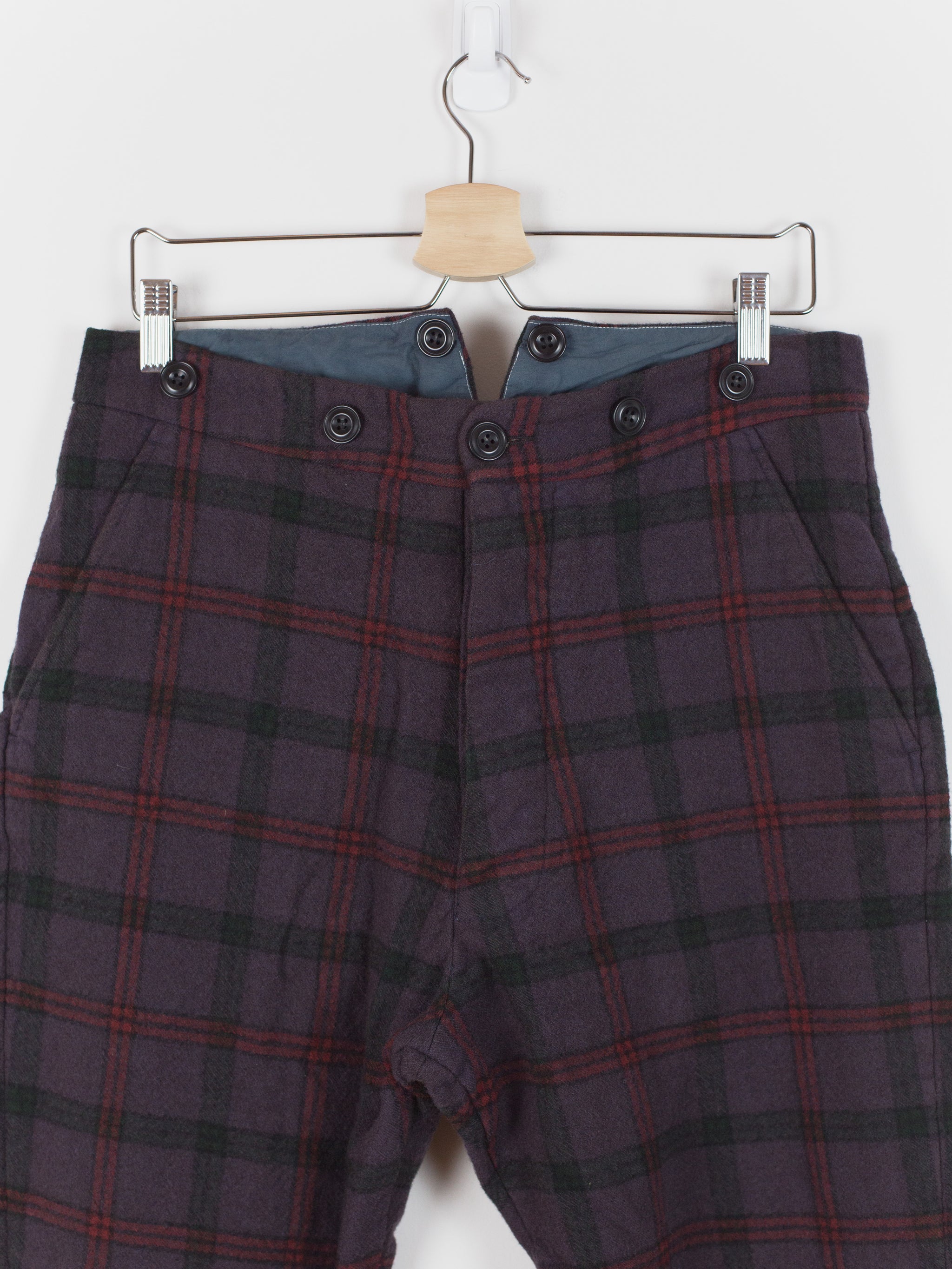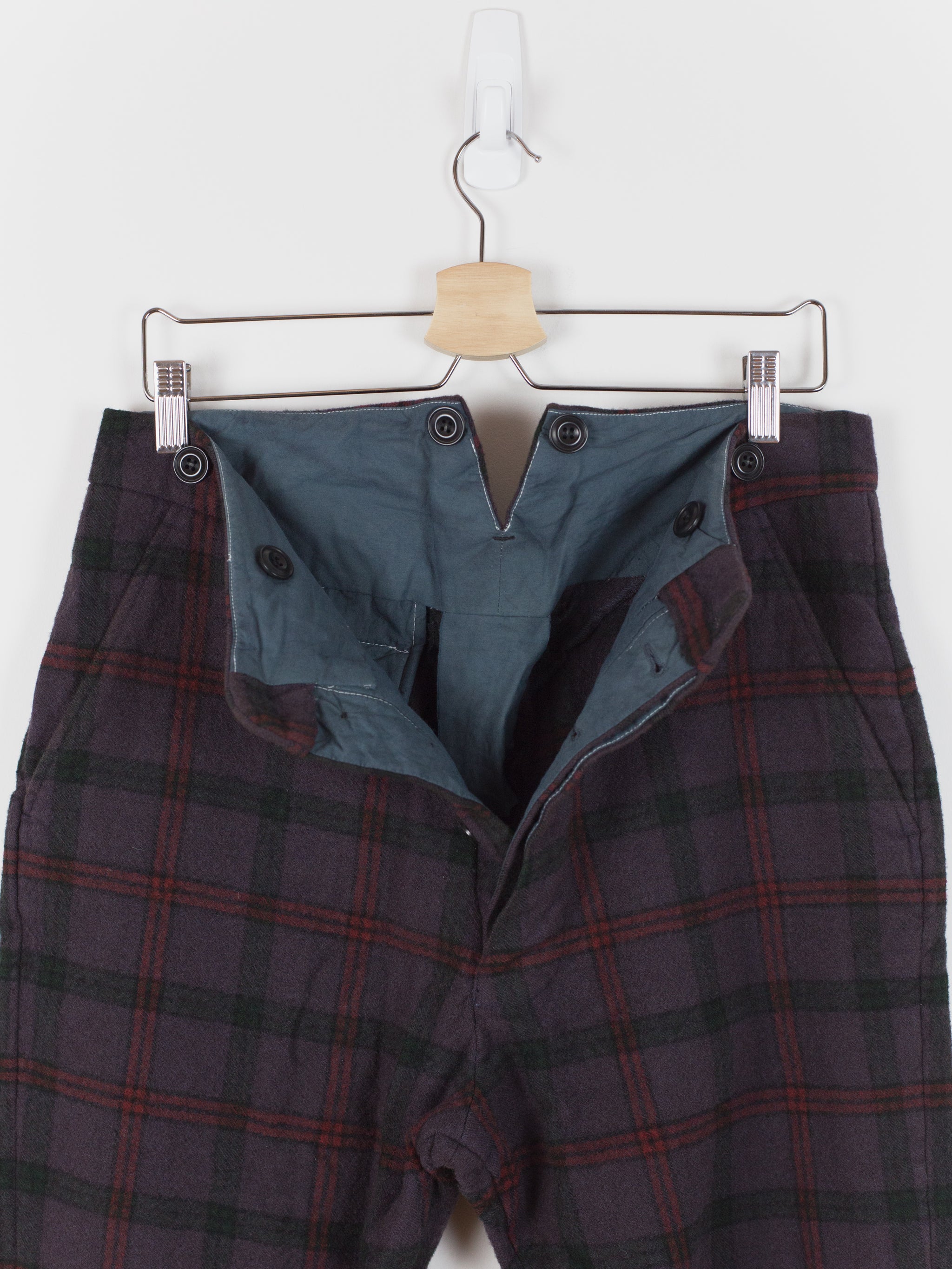 This pant is cut with a slim-straight leg in a soft and substantial melton wool featuring a subtle eggplant check. The plush face fabric has a natural wrinkle and uneven texture that embodies the hand-crafted aesthetic of John Alexander Skelton's work. The soft hand and perceptible thickness of the wool creates a cozy barrier against the cold. Fully tailored waistband and interior construction are sewn out of paper cotton and feature hand-labelled and hand-numbered garment information. This piece is an excellent representation of Skelton's dedication to modernizing historical/antique processes and forms, appearing at once both old and new and carrying with it a versatility for any wardrobe.