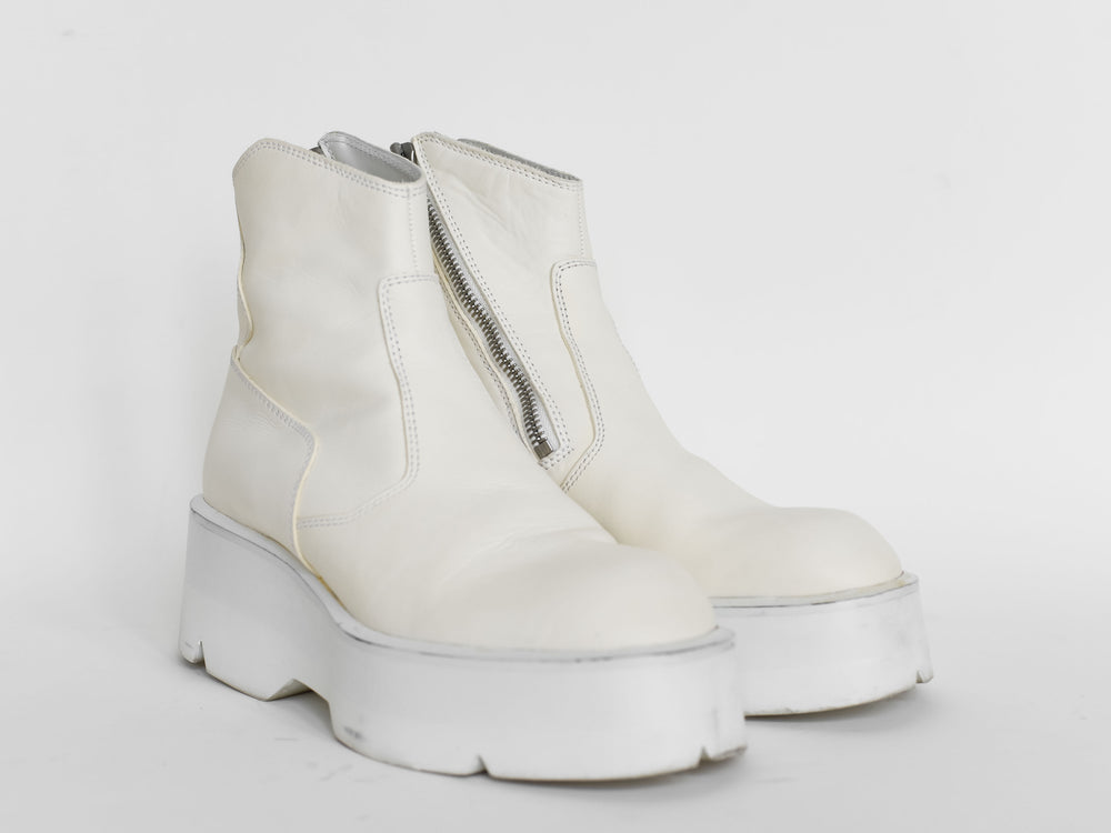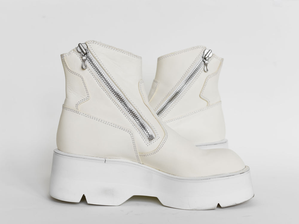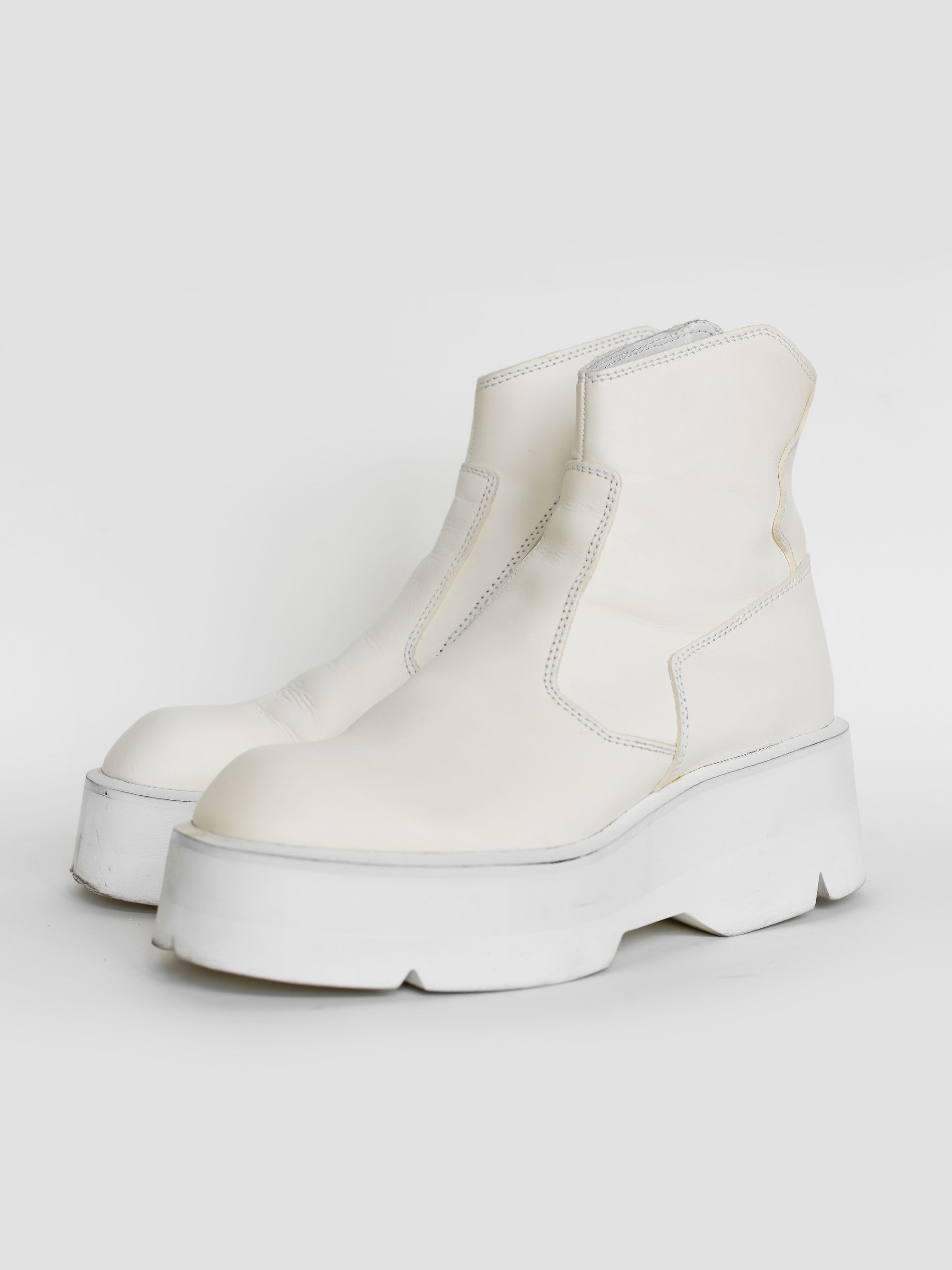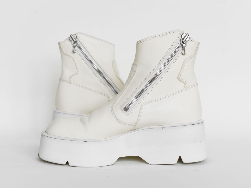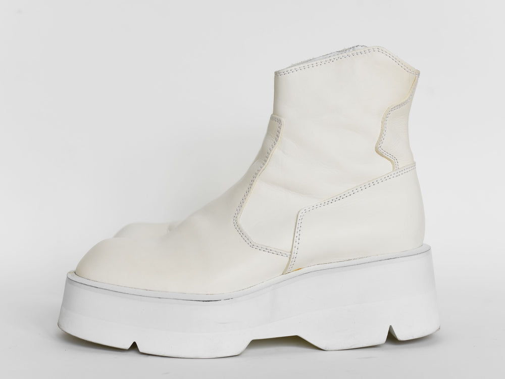 Futuristically paneled leather boots with an oversized Vibram platform and angled side zipper.