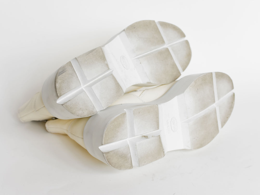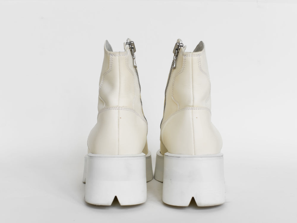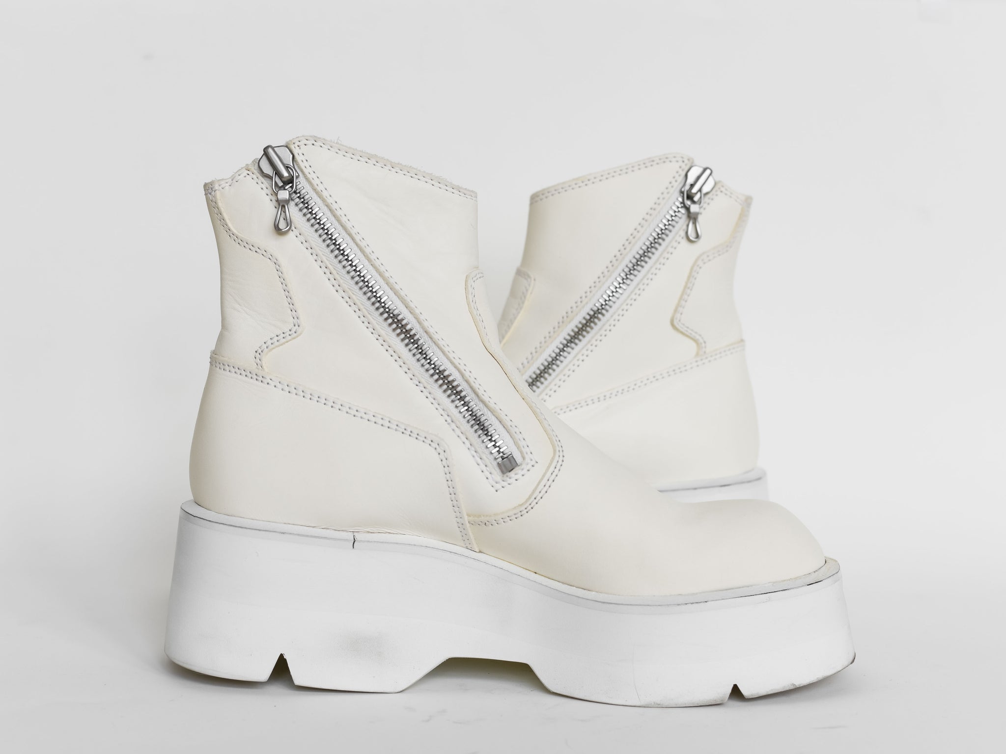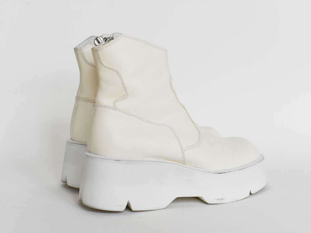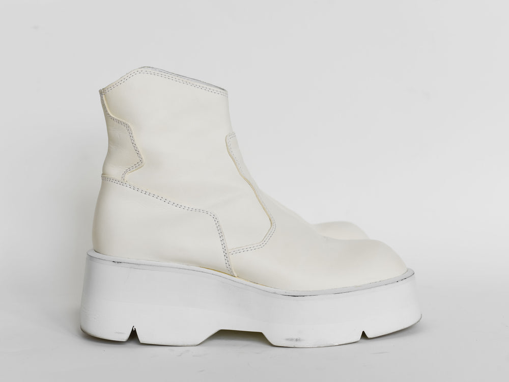 Futuristically paneled leather boots with an oversized Vibram platform and angled side zipper.