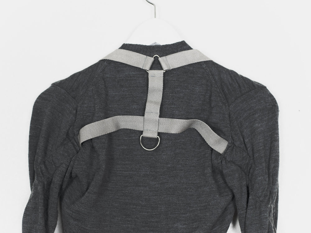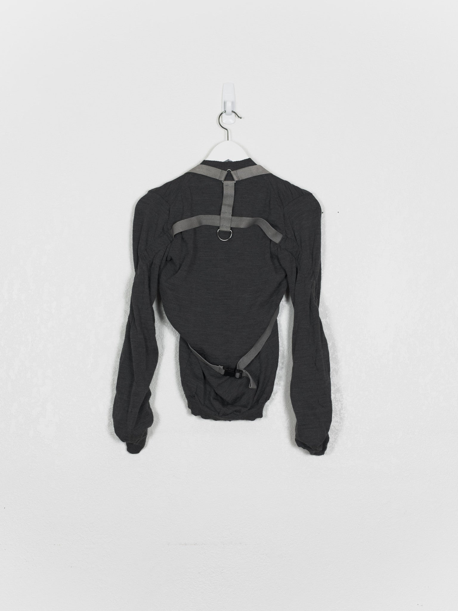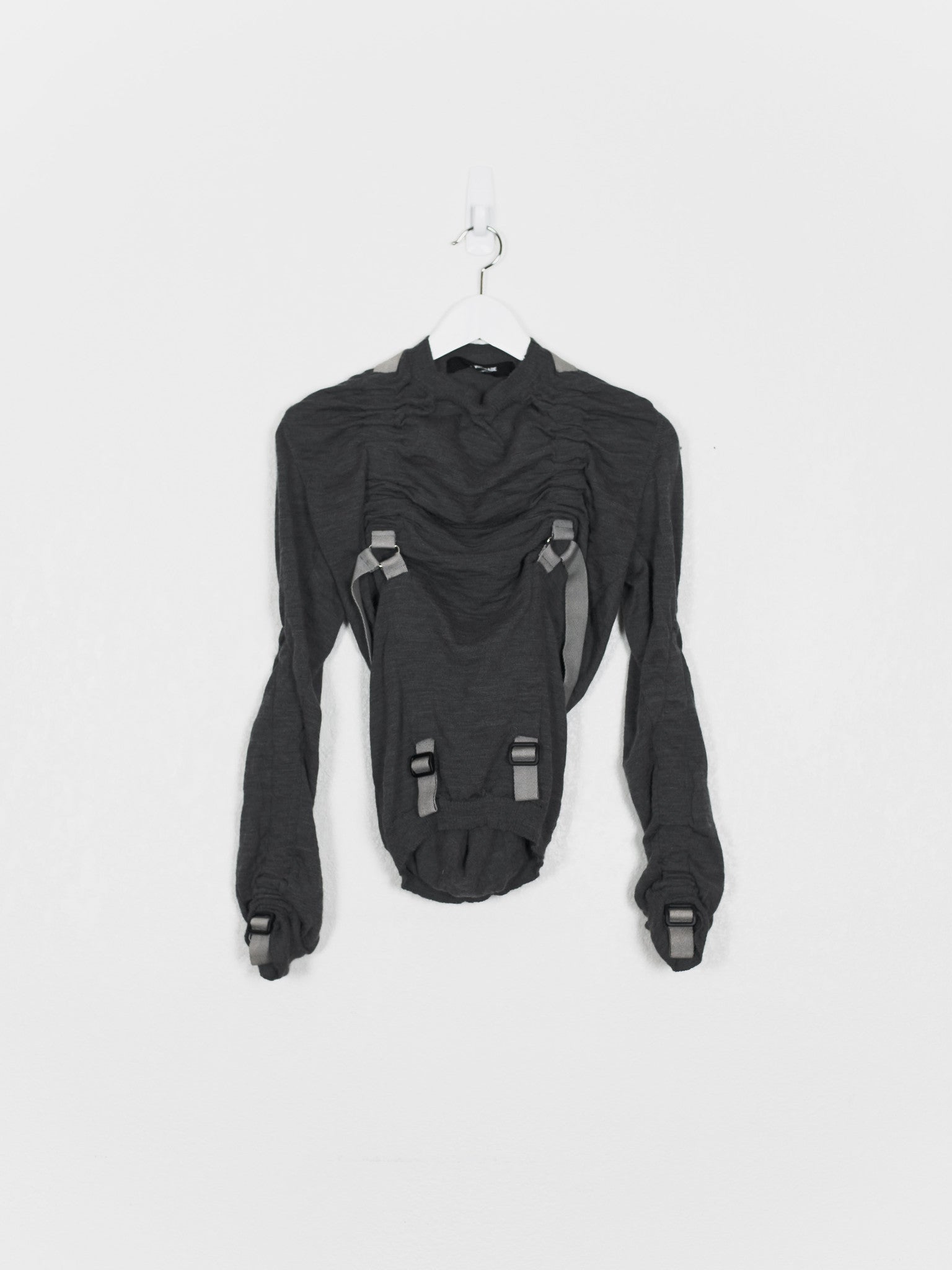 Well known piece featuring contrast grey parachute inspired straps and hardware throughout, giving it a wonderful drape and adjustable fit.