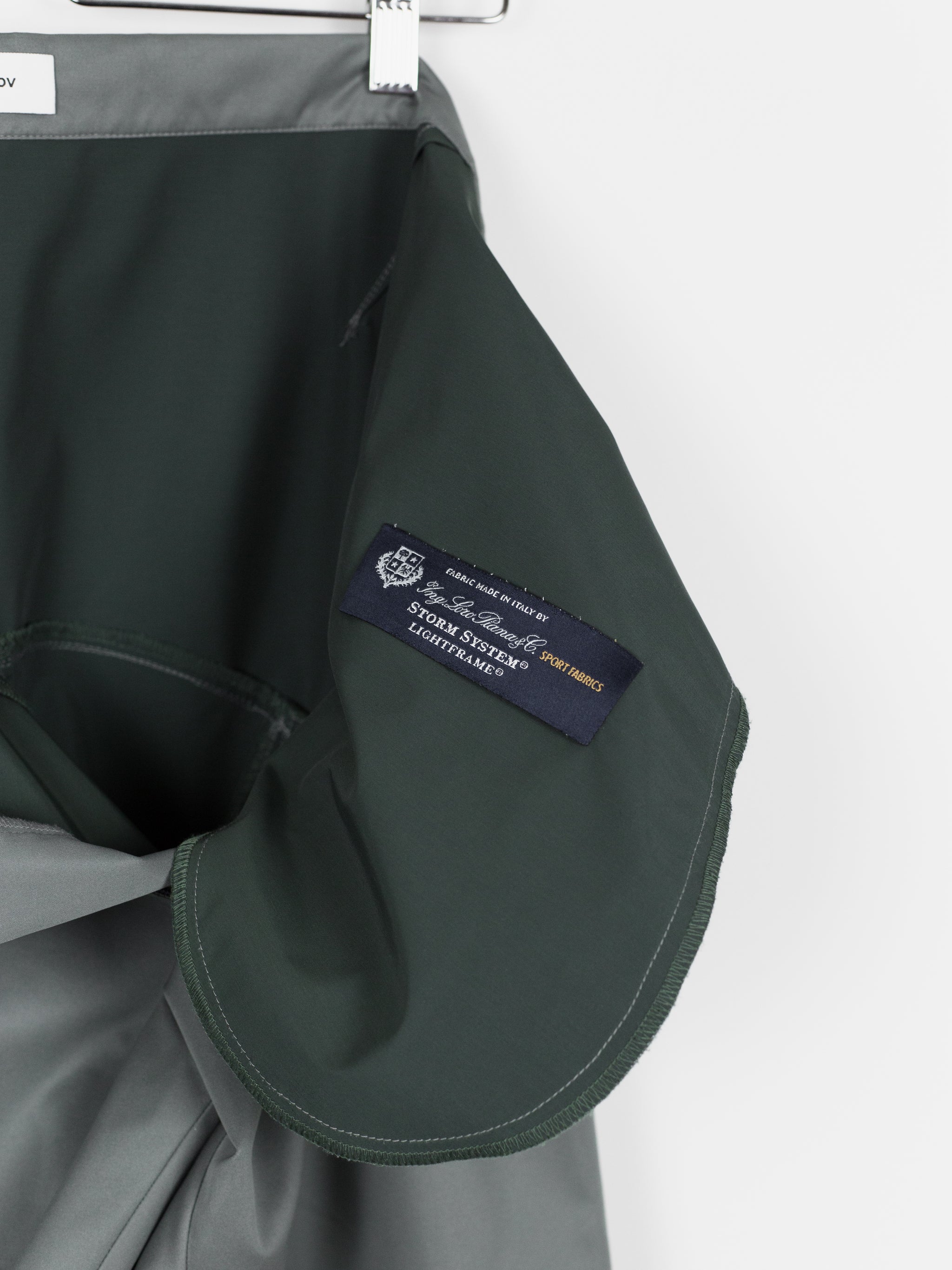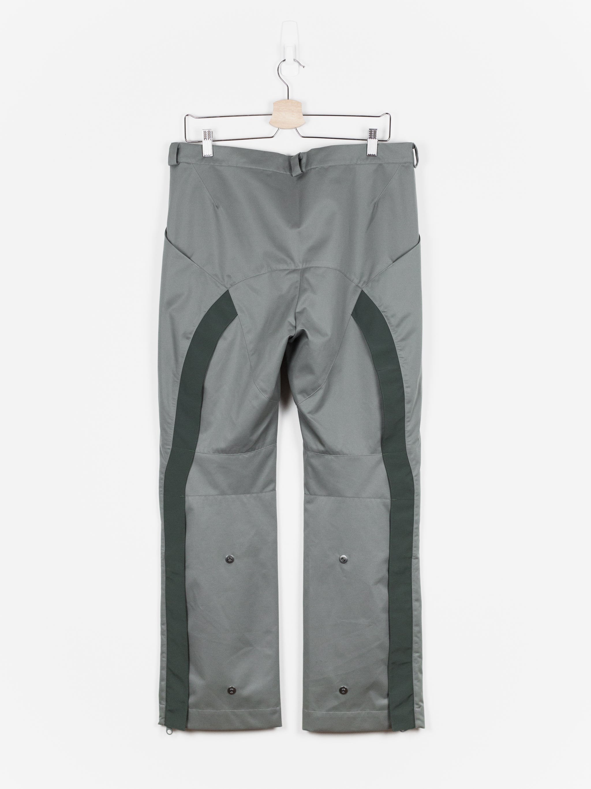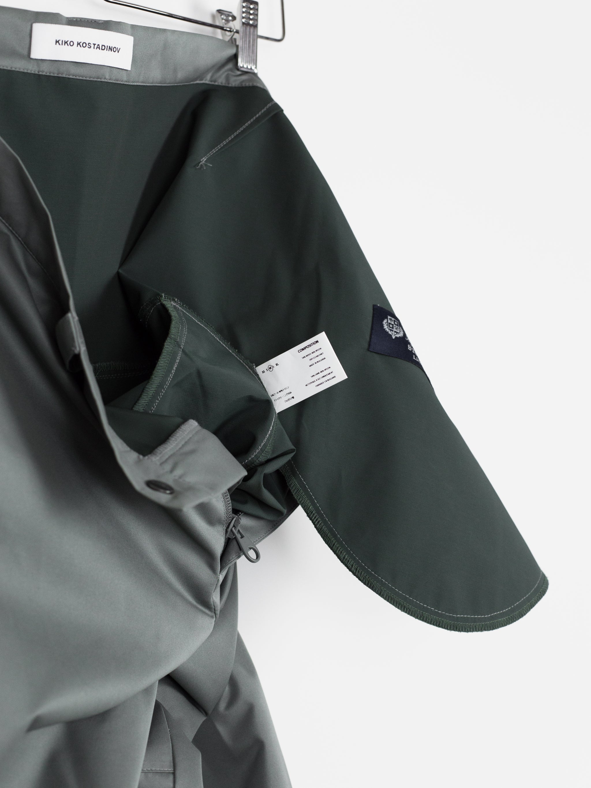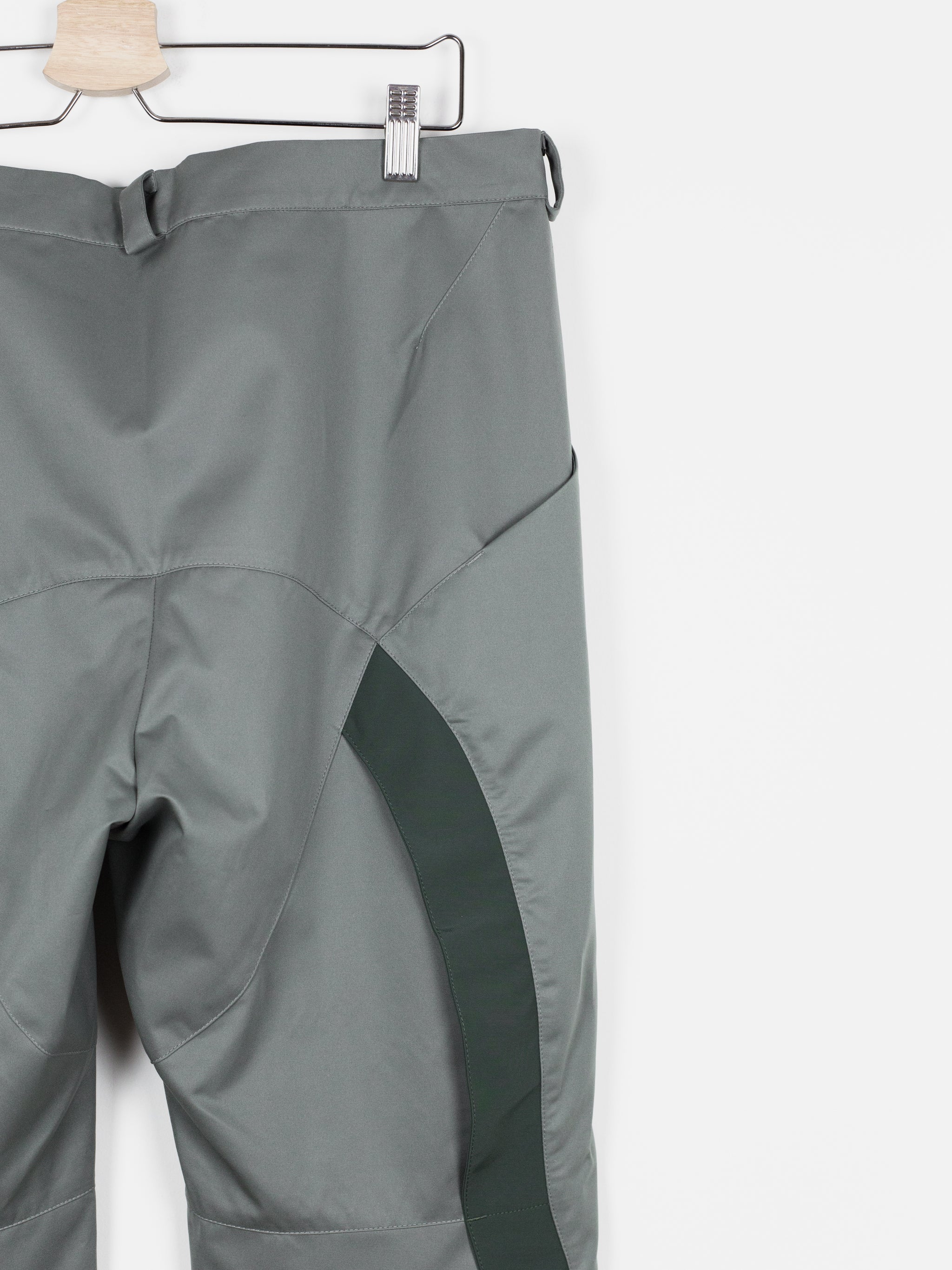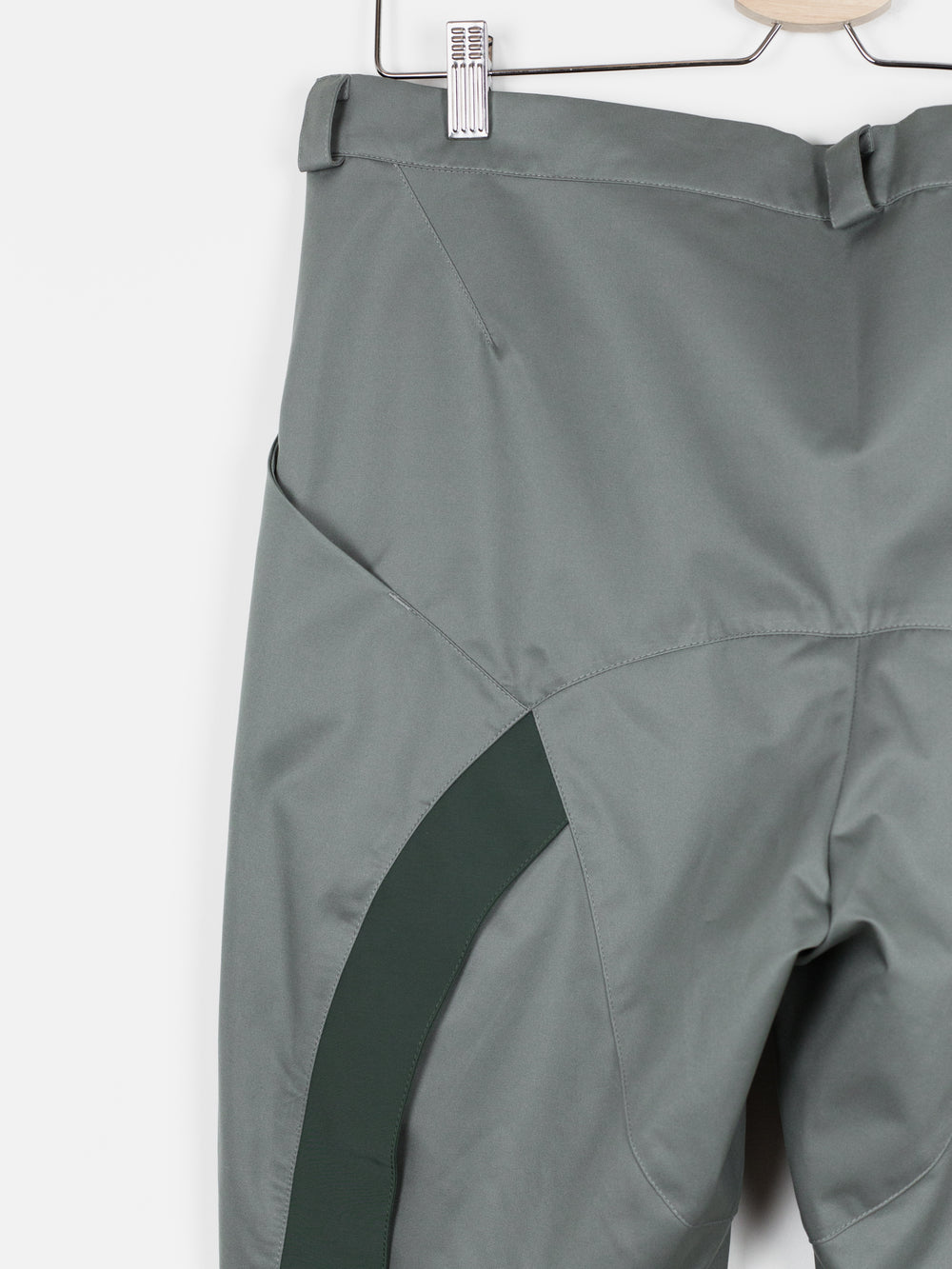 A straight leg trouser cut from Loro Piana storm system featuring graphic back stripe detailing. The stripe features snaps that button into accompanying ones on the trouser leg, allowing the wearer to alter the fit of the trousers--Straight, tapered, or buttoning offset to create a sculptural and deformed silhouette around the calf. Additionally, the hem is zip-closed underneath the green stripe near the hem, letting the wearer change how the pants will break over shoes. The trousers are expertly patterned, with details modeled after Montbell biker pants. The front slash pockets are actually shaped like traditional jean-style J pockets shifted towards the sides, the lines as they sweep around the hips ending at an angle parallel to the darts that shape the yoke. The graphic stripes actually curve according to the articulated panelling at the back of the knees and even after they end, their trajectory continues, creating the panel for the seat. Simple from the front, the Gaetan pants are remarkably detailed, striking, and dynamic once seen from a different angle.