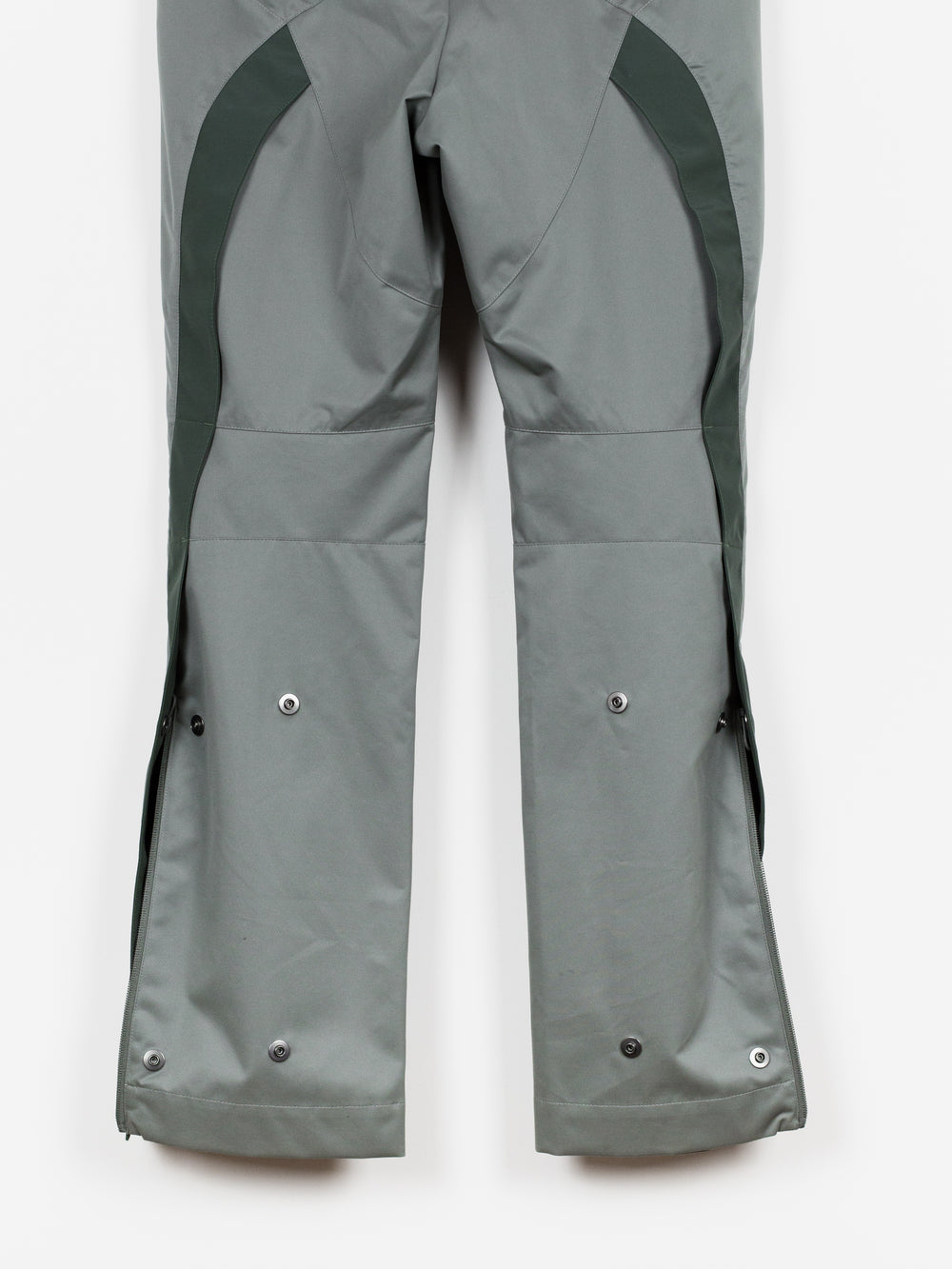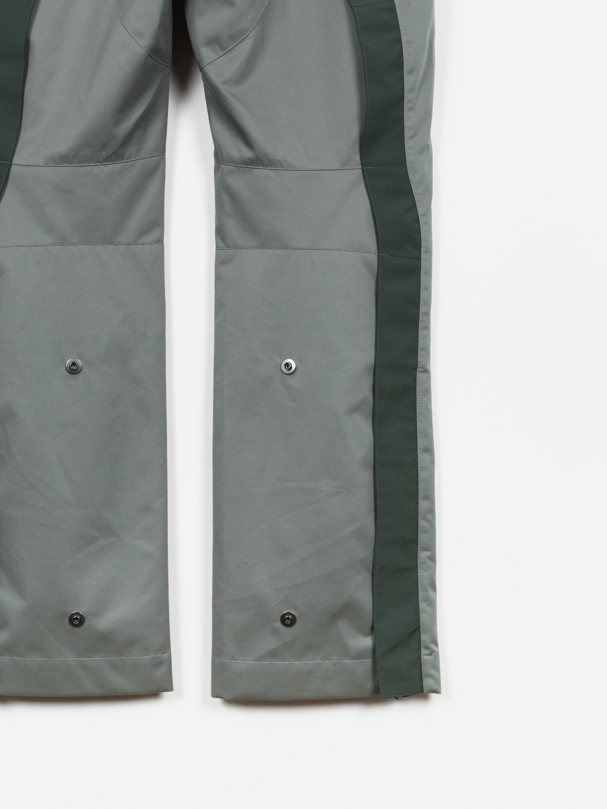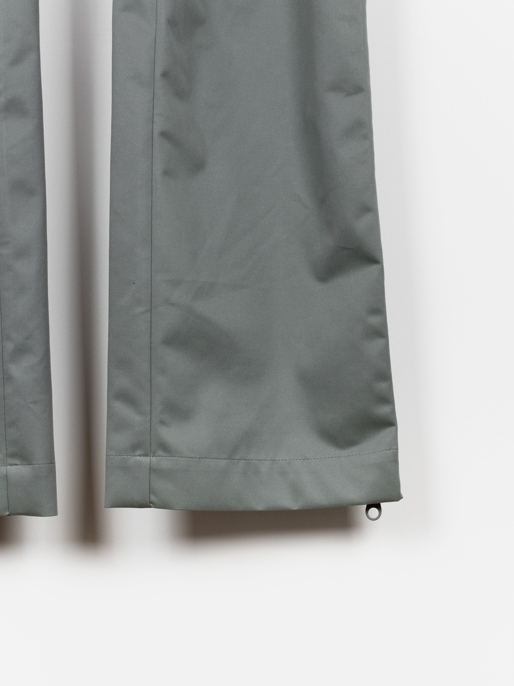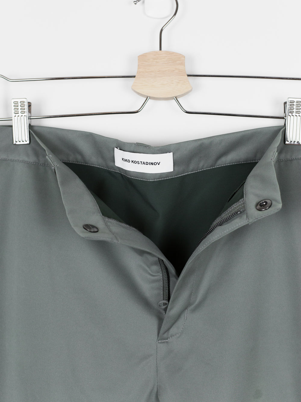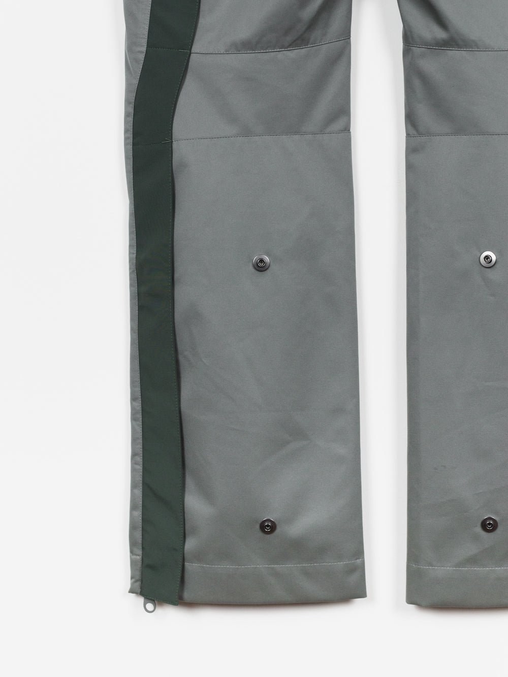 A straight leg trouser cut from Loro Piana storm system featuring graphic back stripe detailing. The stripe features snaps that button into accompanying ones on the trouser leg, allowing the wearer to alter the fit of the trousers--Straight, tapered, or buttoning offset to create a sculptural and deformed silhouette around the calf. Additionally, the hem is zip-closed underneath the green stripe near the hem, letting the wearer change how the pants will break over shoes. The trousers are expertly patterned, with details modeled after Montbell biker pants. The front slash pockets are actually shaped like traditional jean-style J pockets shifted towards the sides, the lines as they sweep around the hips ending at an angle parallel to the darts that shape the yoke. The graphic stripes actually curve according to the articulated panelling at the back of the knees and even after they end, their trajectory continues, creating the panel for the seat. Simple from the front, the Gaetan pants are remarkably detailed, striking, and dynamic once seen from a different angle.