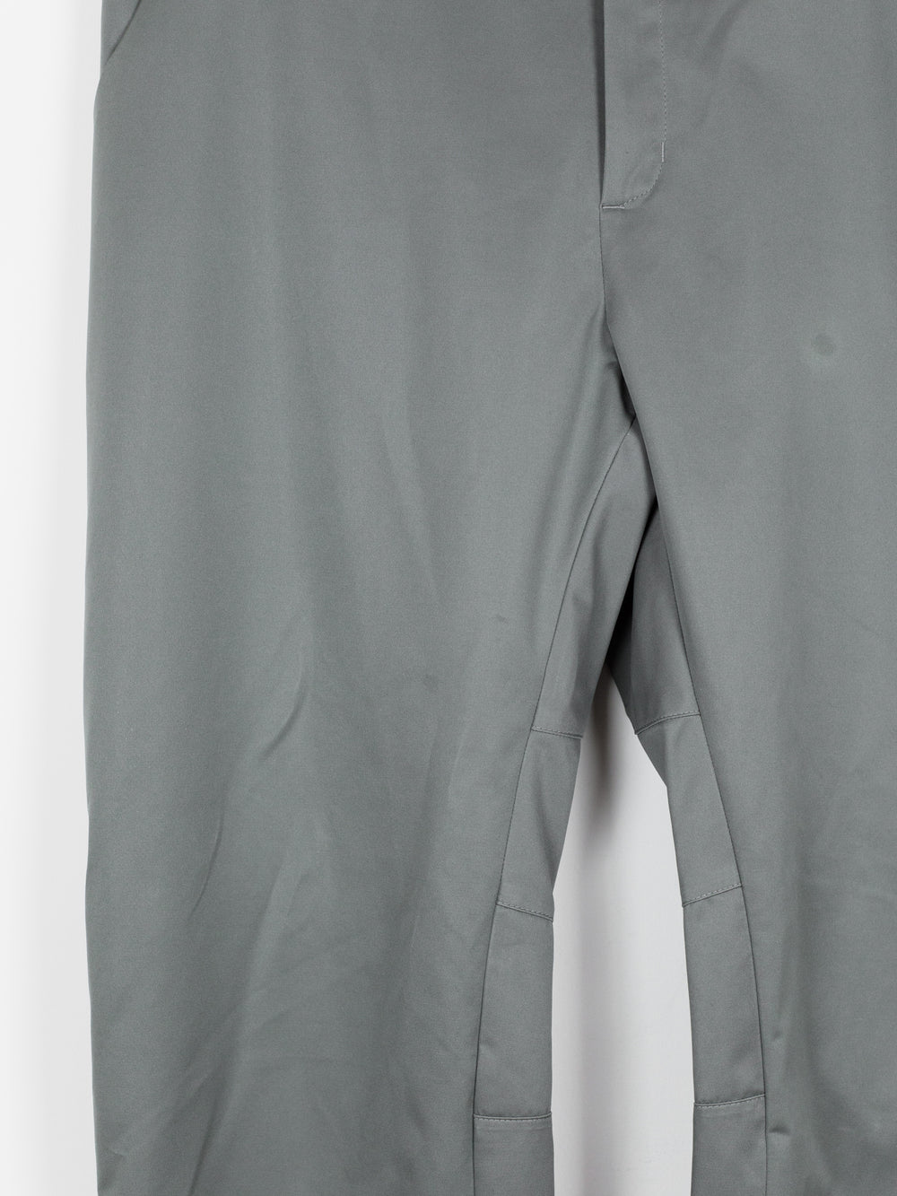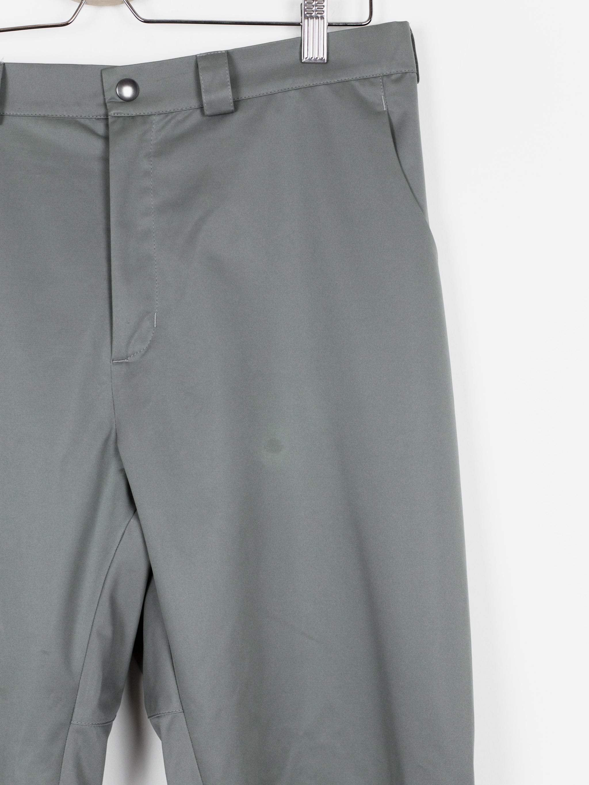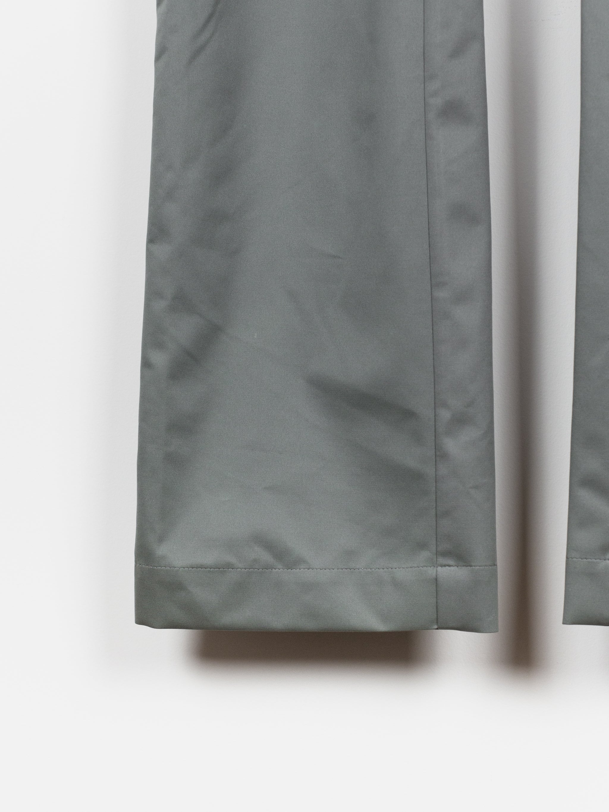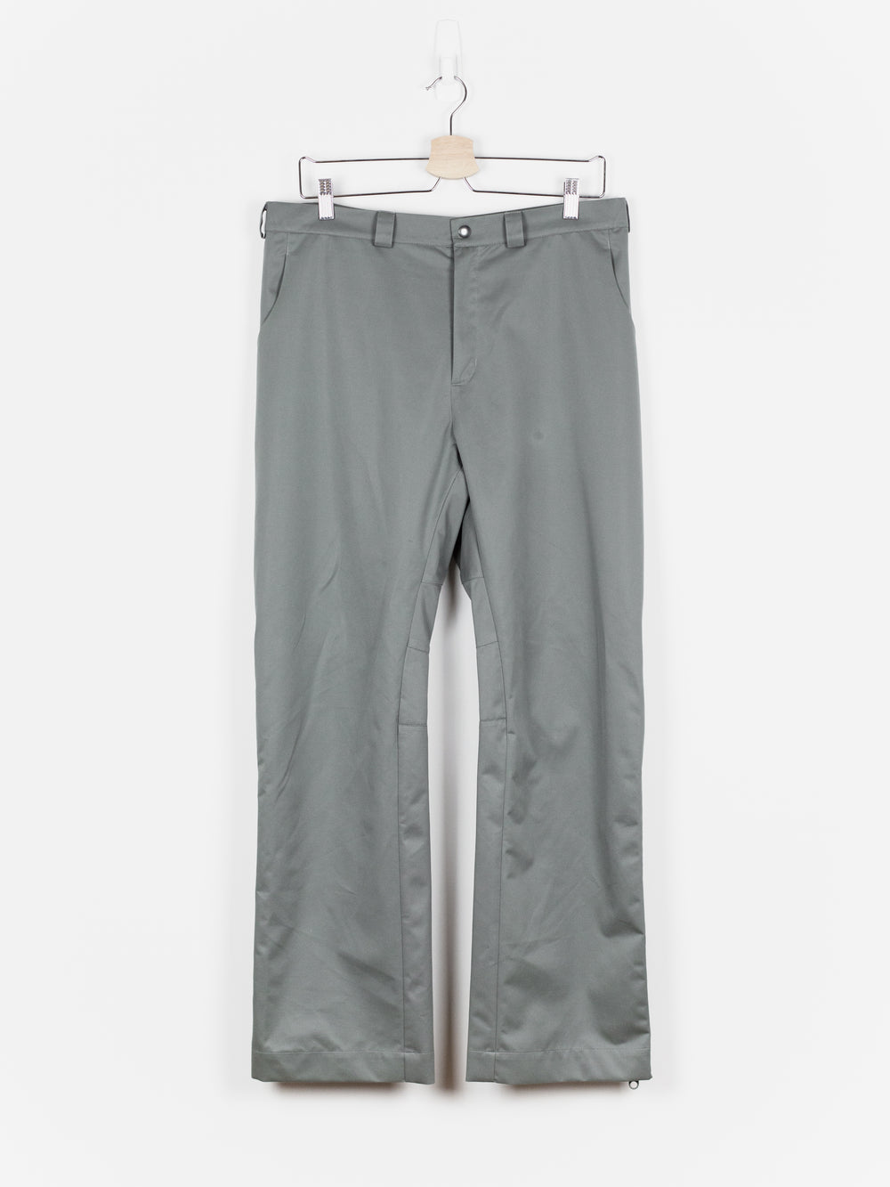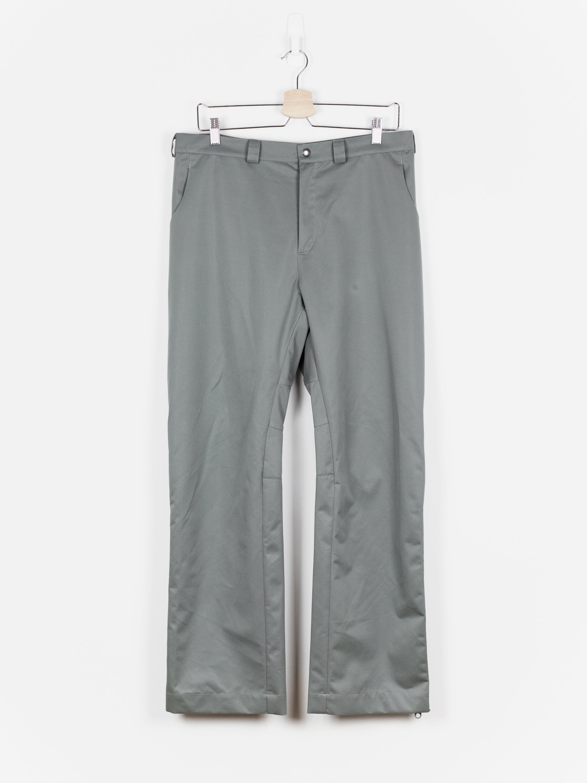 A straight leg trouser cut from Loro Piana storm system featuring graphic back stripe detailing. The stripe features snaps that button into accompanying ones on the trouser leg, allowing the wearer to alter the fit of the trousers--Straight, tapered, or buttoning offset to create a sculptural and deformed silhouette around the calf. Additionally, the hem is zip-closed underneath the green stripe near the hem, letting the wearer change how the pants will break over shoes. The trousers are expertly patterned, with details modeled after Montbell biker pants. The front slash pockets are actually shaped like traditional jean-style J pockets shifted towards the sides, the lines as they sweep around the hips ending at an angle parallel to the darts that shape the yoke. The graphic stripes actually curve according to the articulated panelling at the back of the knees and even after they end, their trajectory continues, creating the panel for the seat. Simple from the front, the Gaetan pants are remarkably detailed, striking, and dynamic once seen from a different angle.