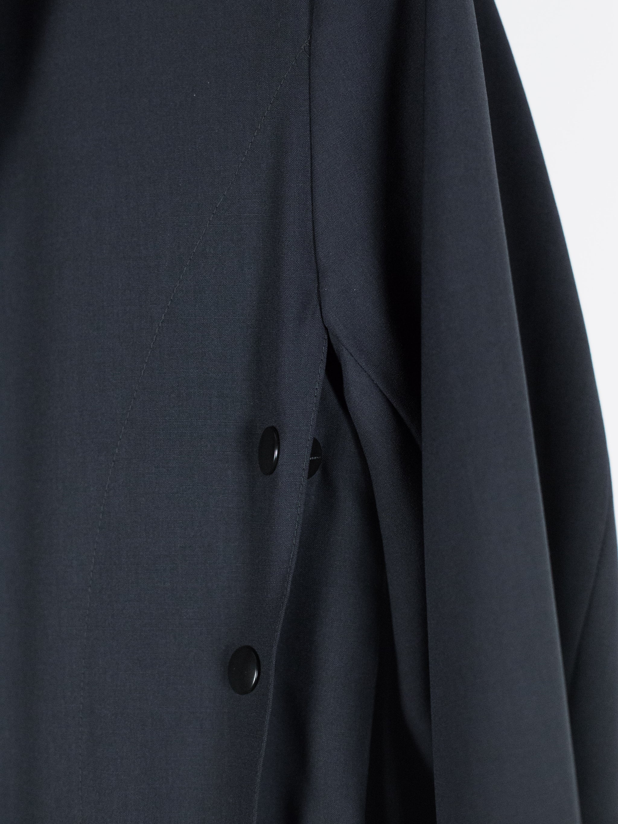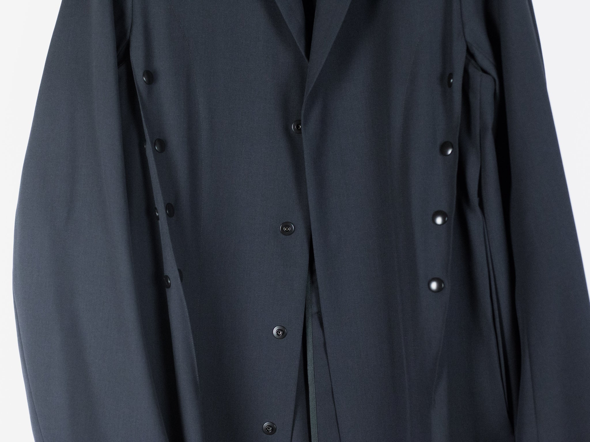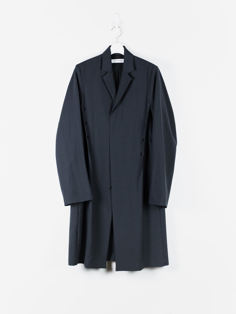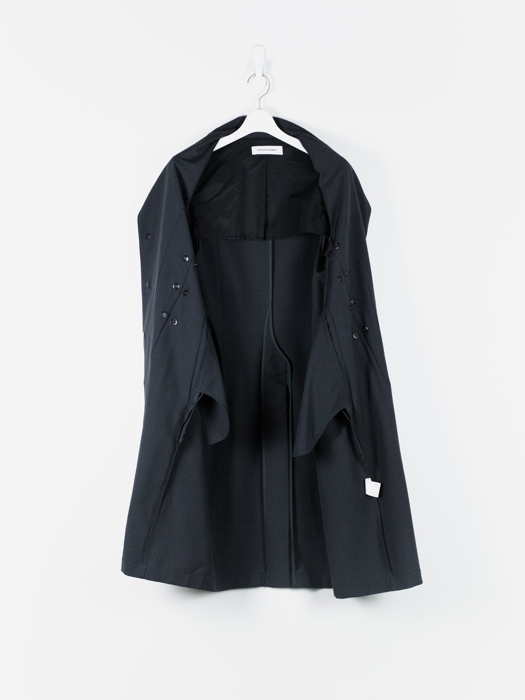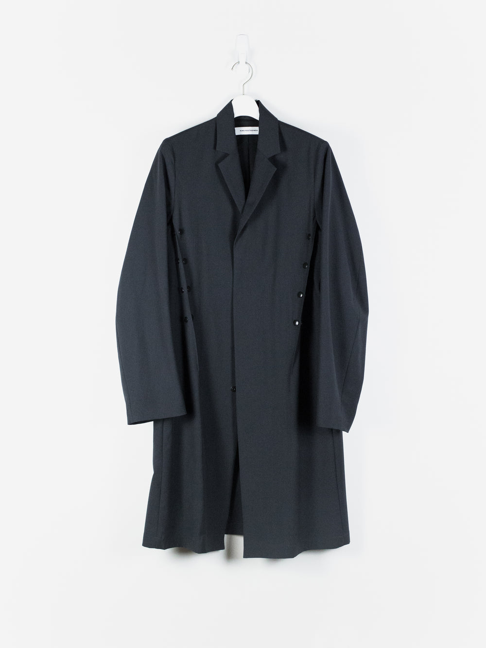 The Burr snap coat is a piece from Kiko Kostadinov's 00042018 Spring/Summer 2018 collection. In a way that is emblematic of Kostadinov's work, the wearer is provided with innovative and unexpected ways to style, interface, and shape the piece. It features button-in darts that lie on the front torso that can alter the shape and fit of the piece depending on how they're done up. Next to the darts are slits that lead to pockets and also open directly to the interior of the coat. On the runway, the sleeves of an accompanying jumpsuit emerge from these slits and tie at the waist, providing a visual break in the long silhouette, cinching the waist in, and letting the punchy lime yellow of the jumpsuit feel more integrated and 'interwoven' as it threads in and out of the coat. In this way, the Burr not only functions as a great standalone piece but can also idiosyncratically 'tie-in' with others in the collection.