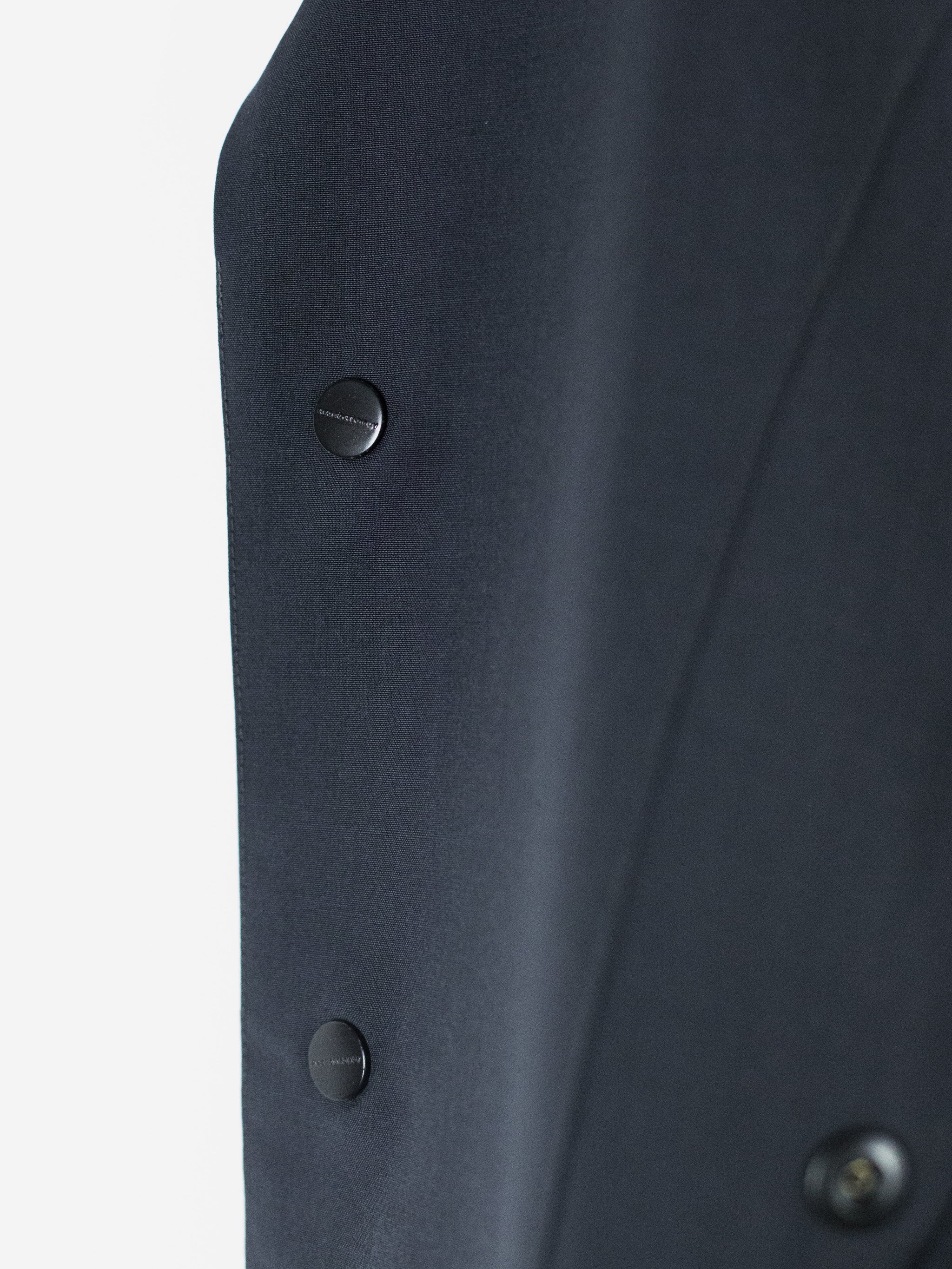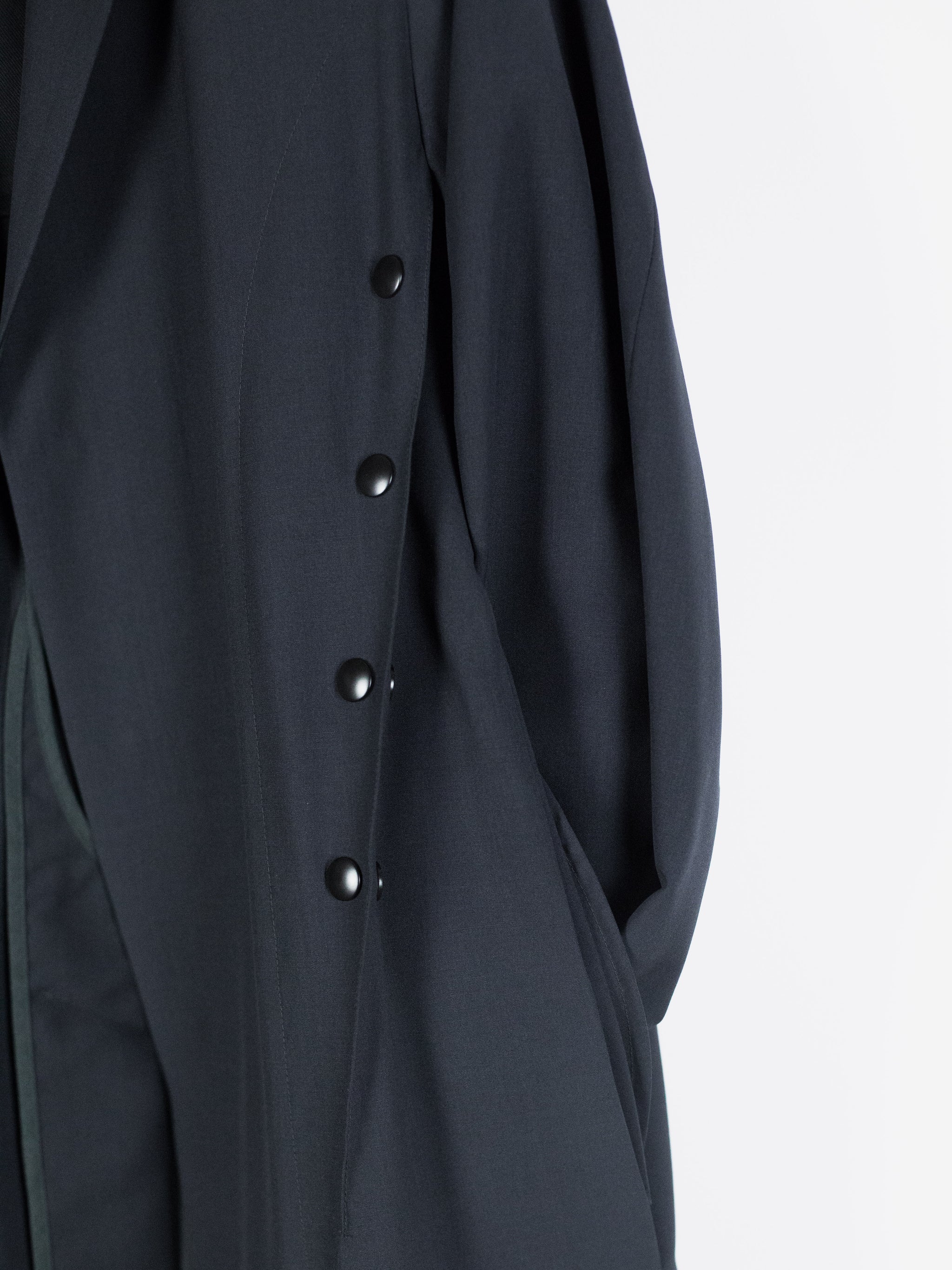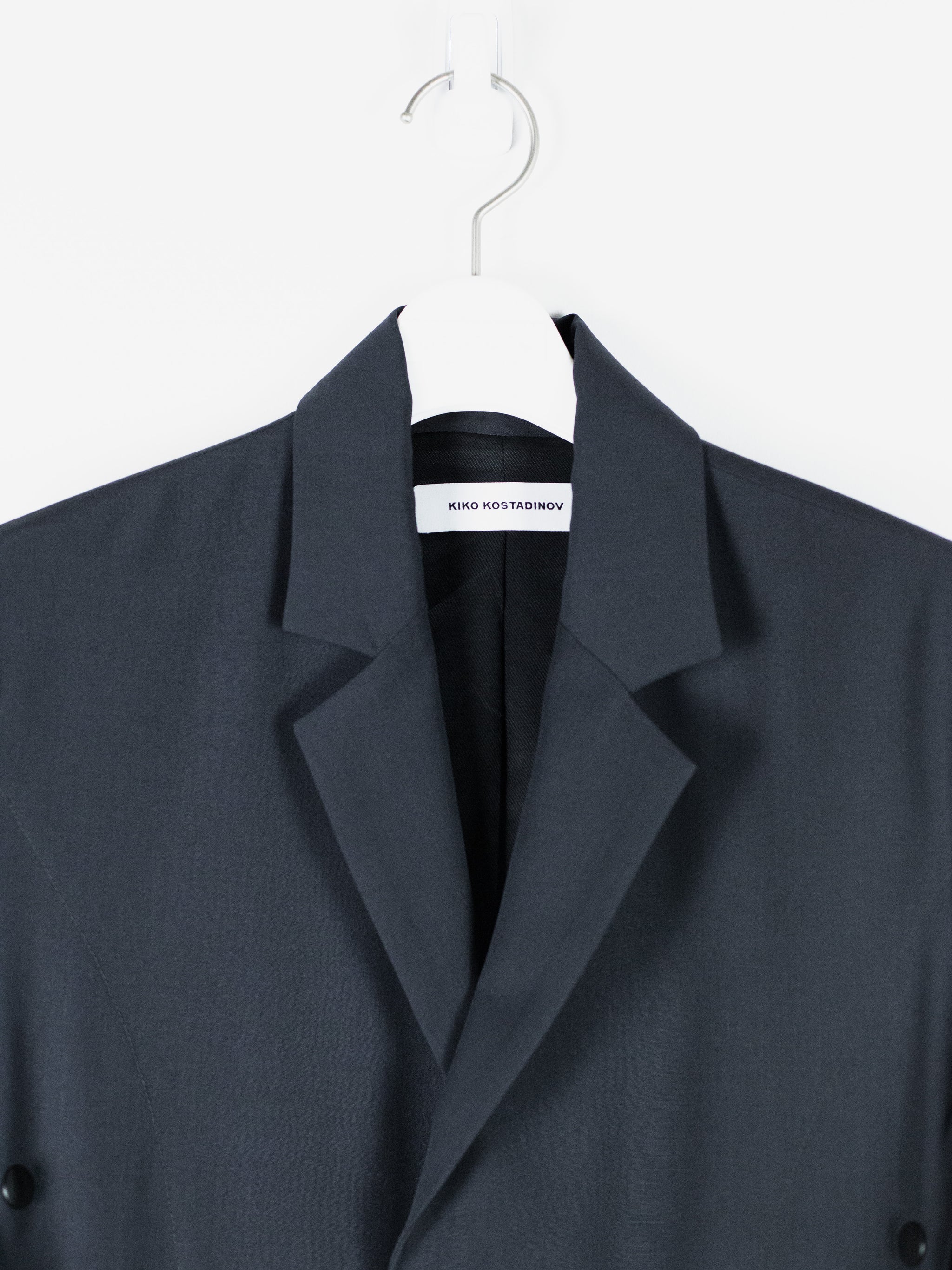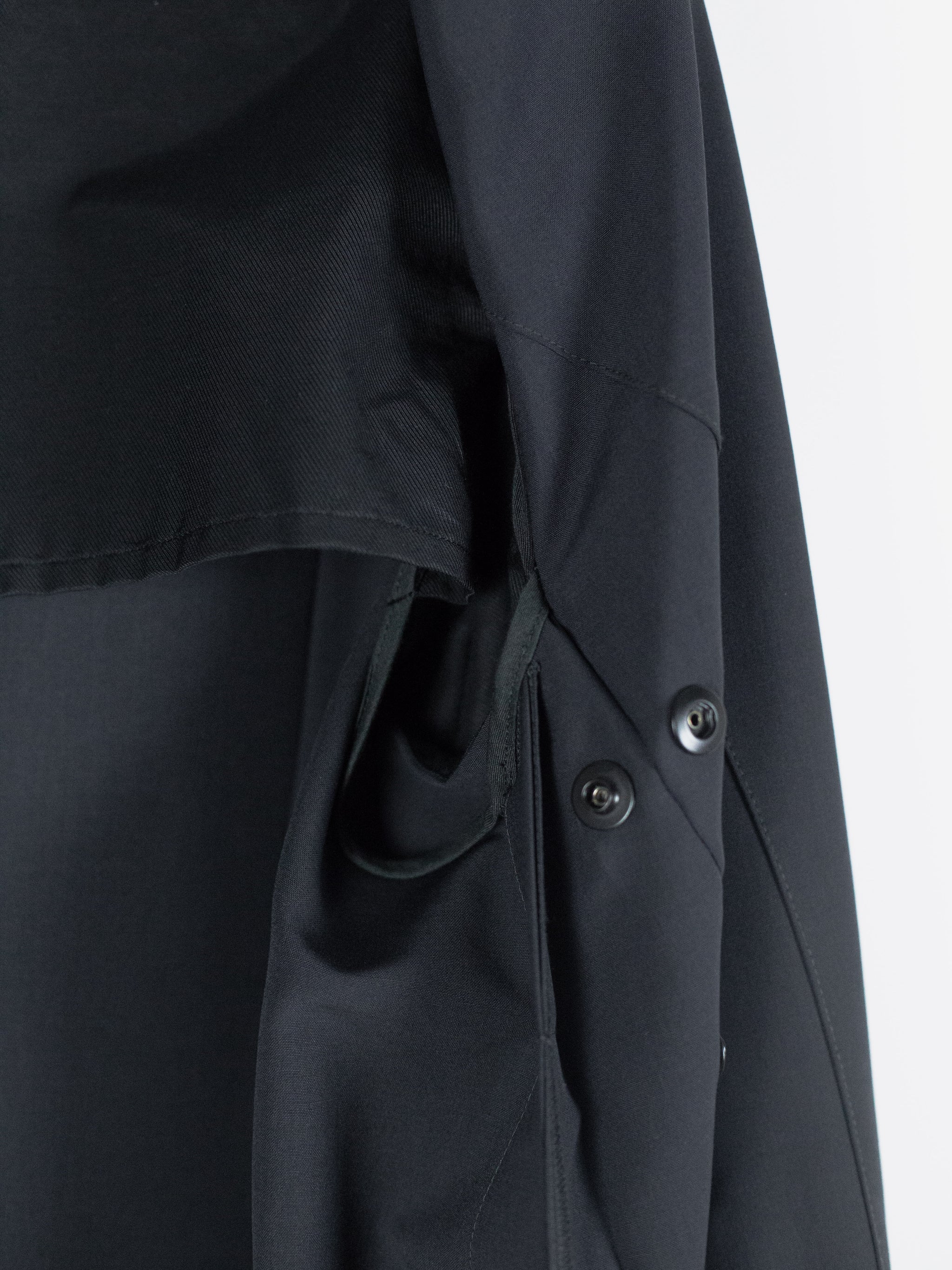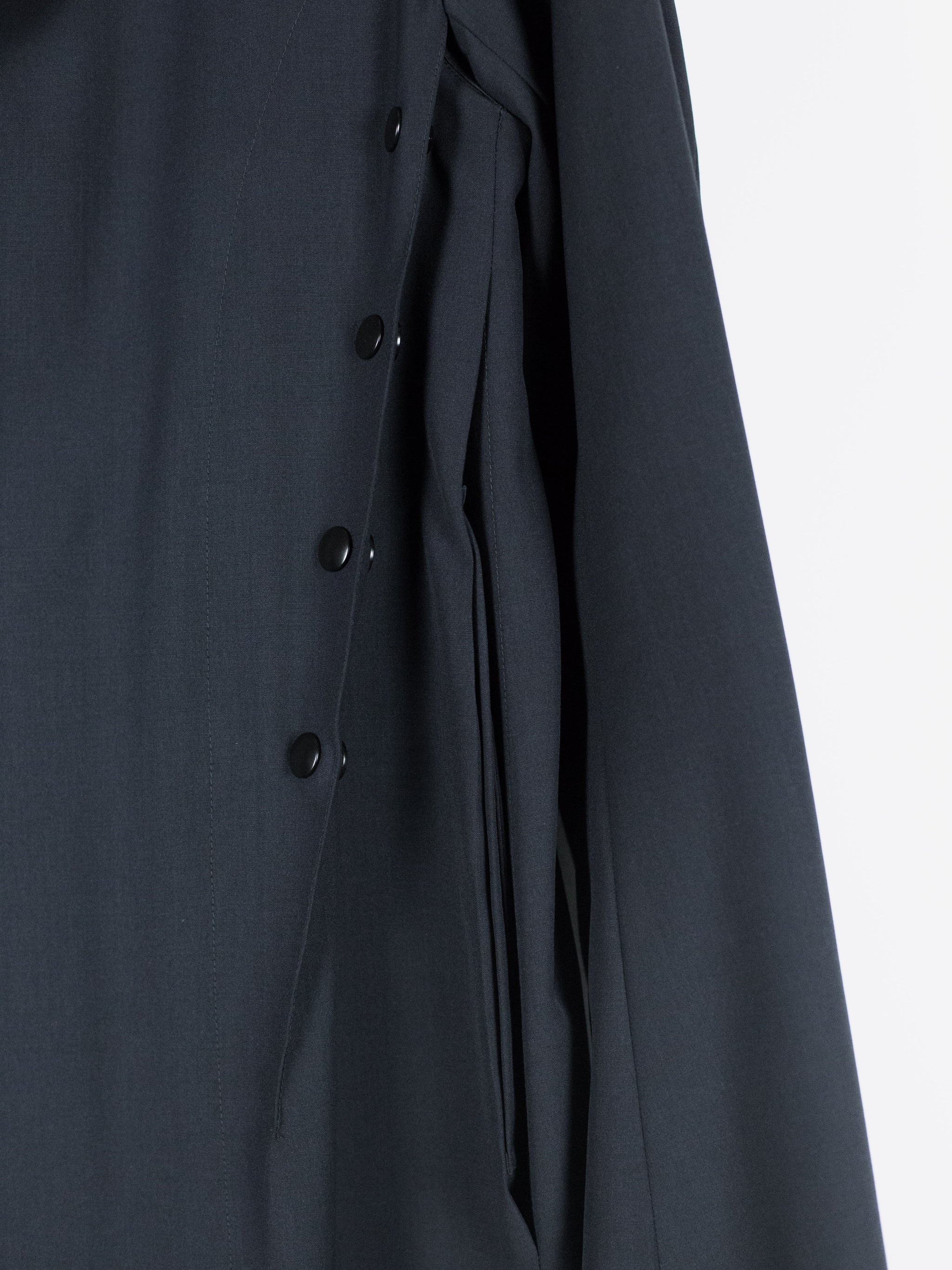 The Burr snap coat is a piece from Kiko Kostadinov's 00042018 Spring/Summer 2018 collection. In a way that is emblematic of Kostadinov's work, the wearer is provided with innovative and unexpected ways to style, interface, and shape the piece. It features button-in darts that lie on the front torso that can alter the shape and fit of the piece depending on how they're done up. Next to the darts are slits that lead to pockets and also open directly to the interior of the coat. On the runway, the sleeves of an accompanying jumpsuit emerge from these slits and tie at the waist, providing a visual break in the long silhouette, cinching the waist in, and letting the punchy lime yellow of the jumpsuit feel more integrated and 'interwoven' as it threads in and out of the coat. In this way, the Burr not only functions as a great standalone piece but can also idiosyncratically 'tie-in' with others in the collection.