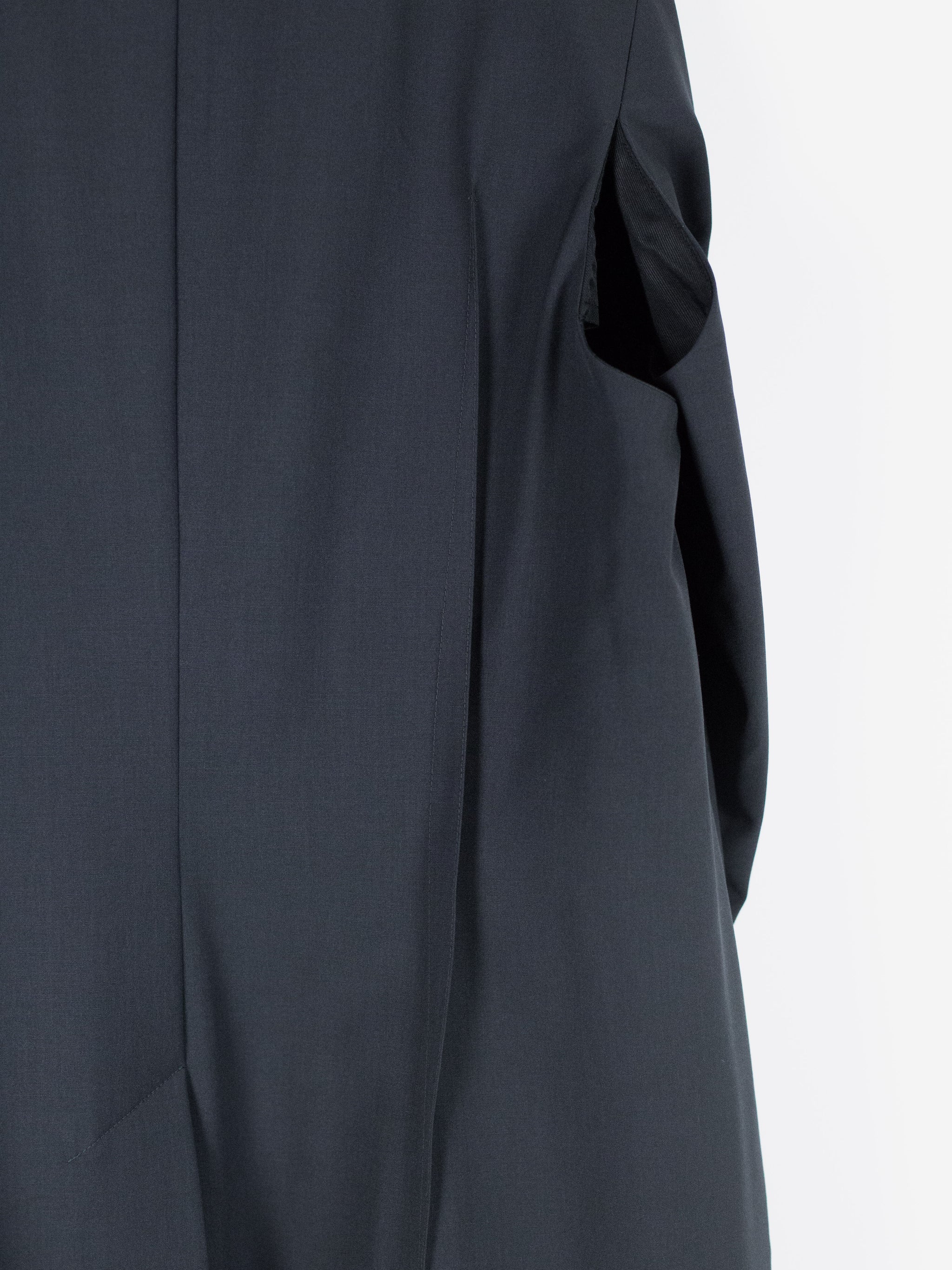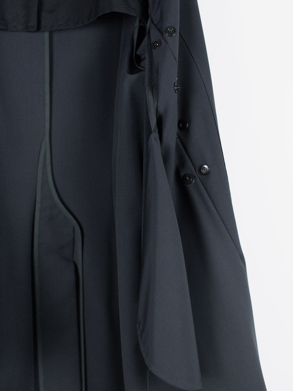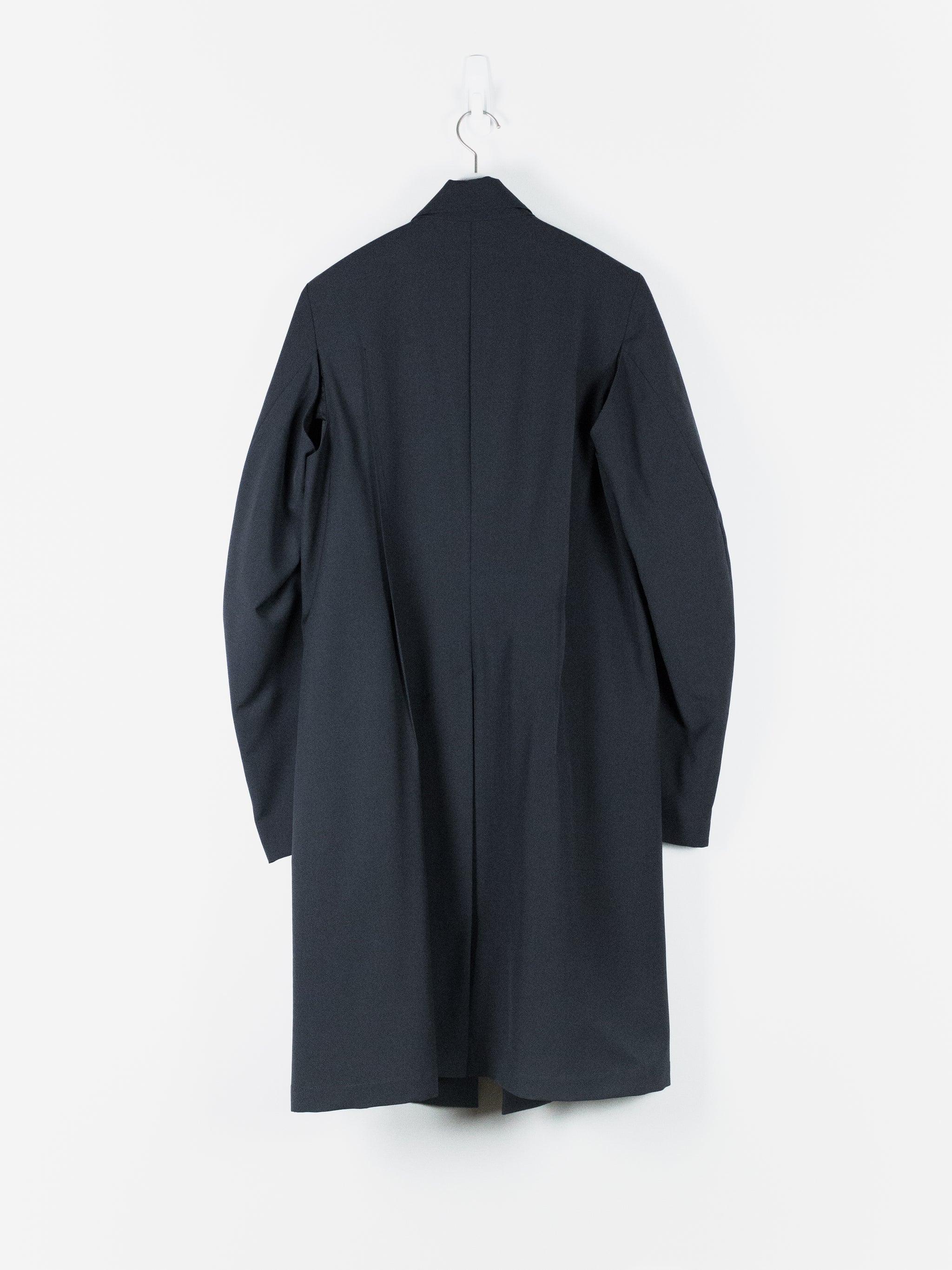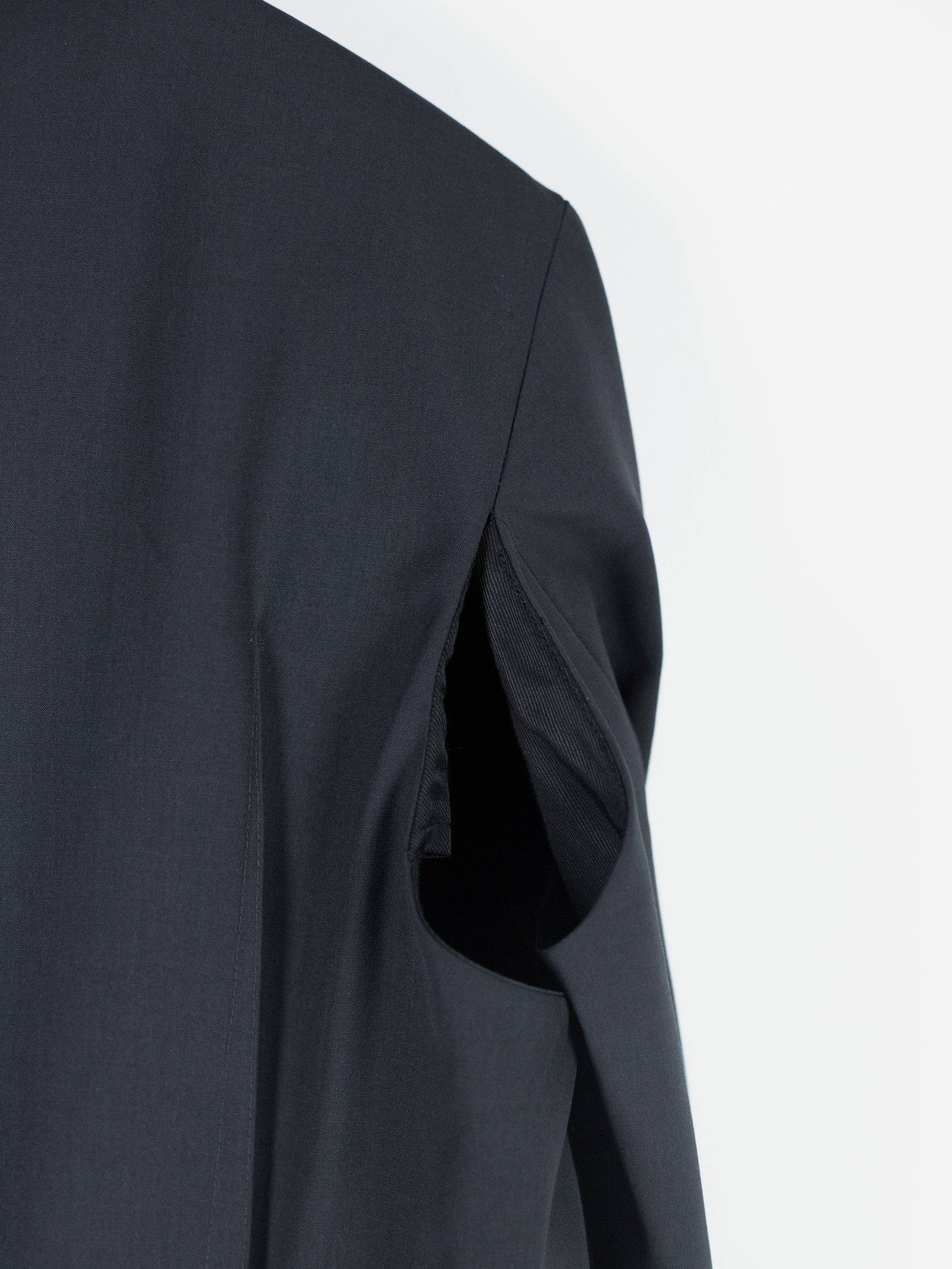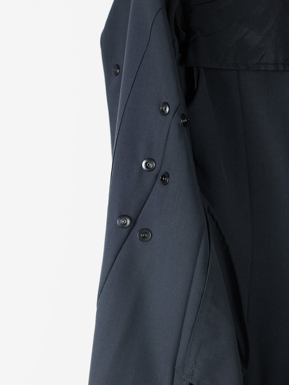 The Burr snap coat is a piece from Kiko Kostadinov's 00042018 Spring/Summer 2018 collection. In a way that is emblematic of Kostadinov's work, the wearer is provided with innovative and unexpected ways to style, interface, and shape the piece. It features button-in darts that lie on the front torso that can alter the shape and fit of the piece depending on how they're done up. Next to the darts are slits that lead to pockets and also open directly to the interior of the coat. On the runway, the sleeves of an accompanying jumpsuit emerge from these slits and tie at the waist, providing a visual break in the long silhouette, cinching the waist in, and letting the punchy lime yellow of the jumpsuit feel more integrated and 'interwoven' as it threads in and out of the coat. In this way, the Burr not only functions as a great standalone piece but can also idiosyncratically 'tie-in' with others in the collection.