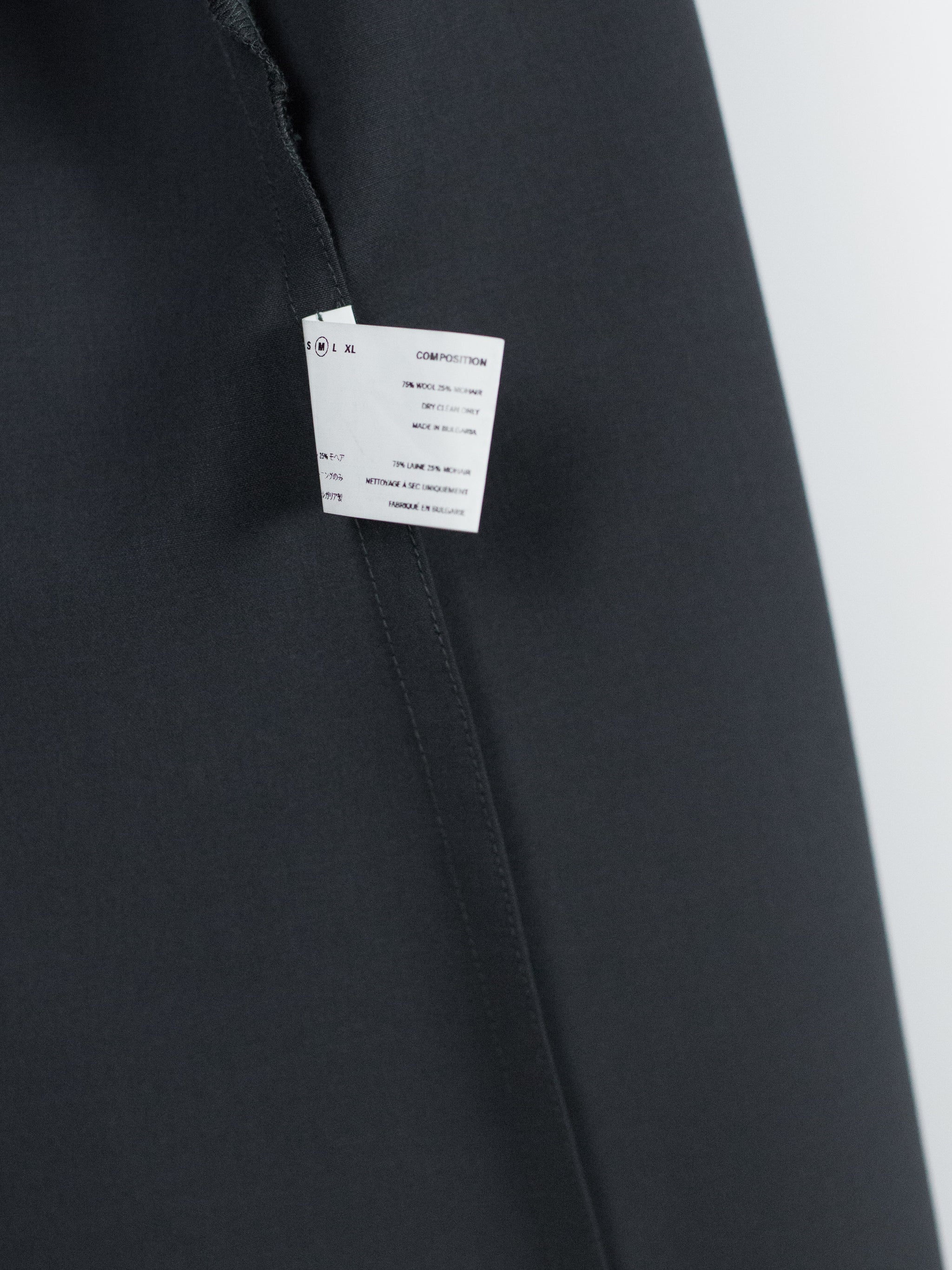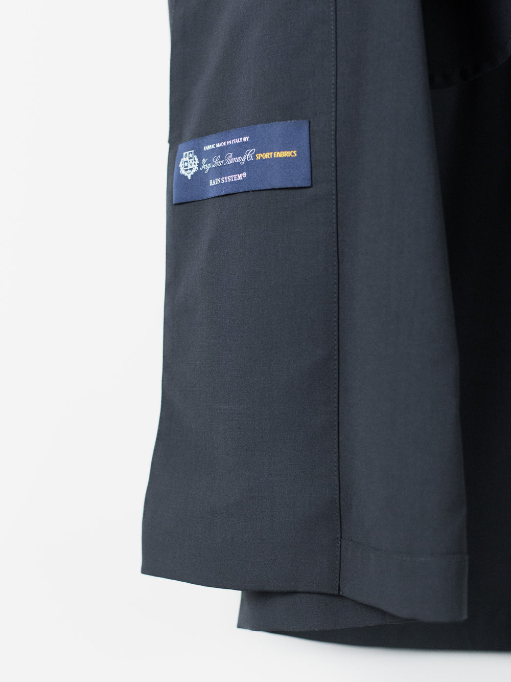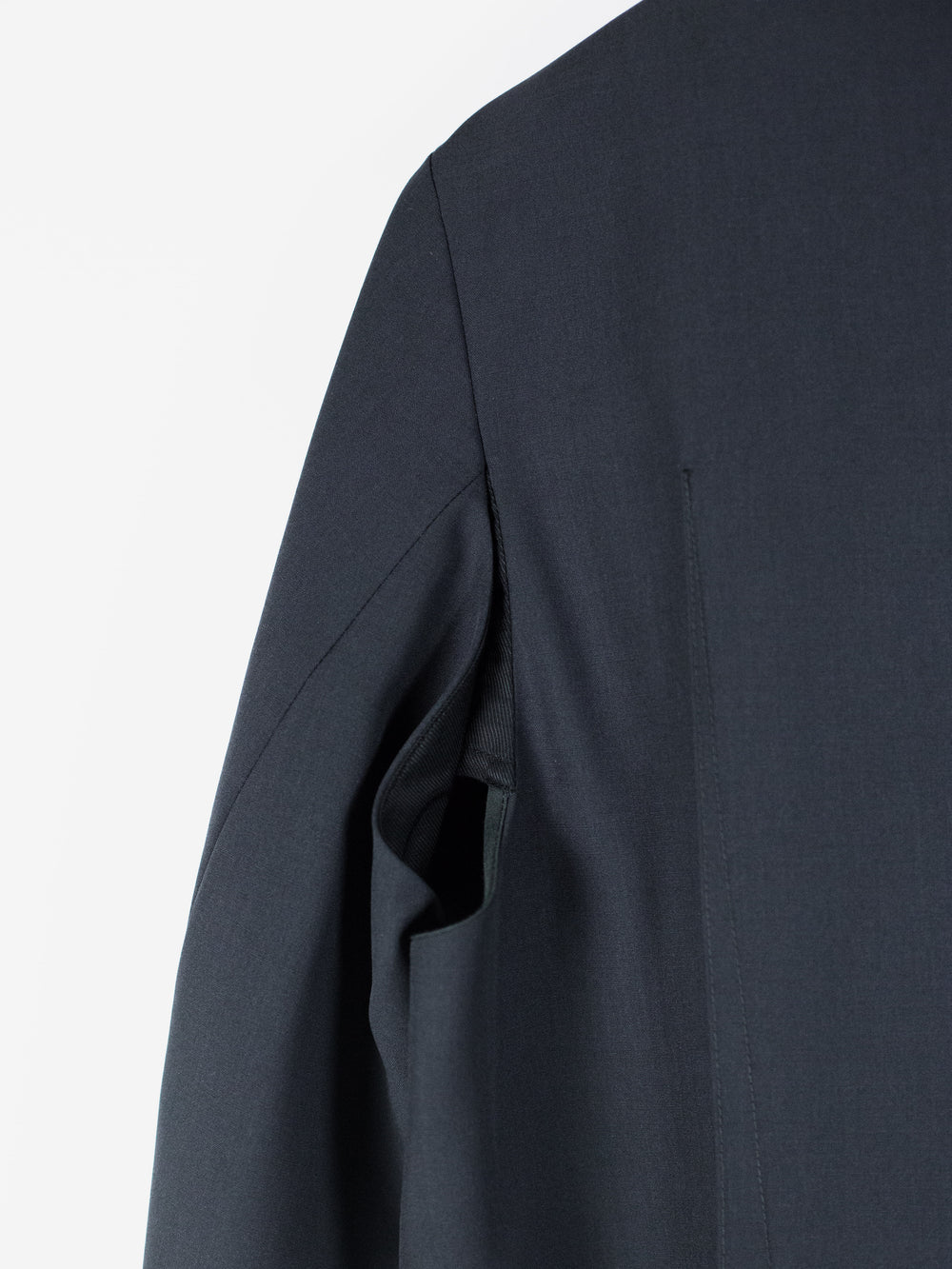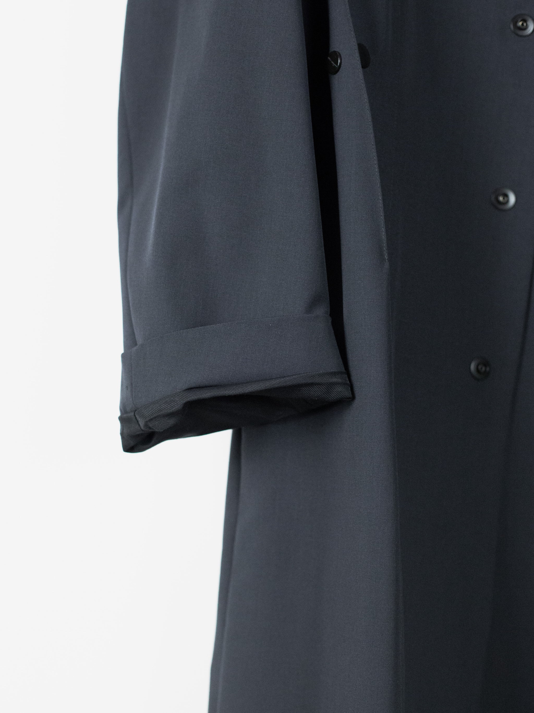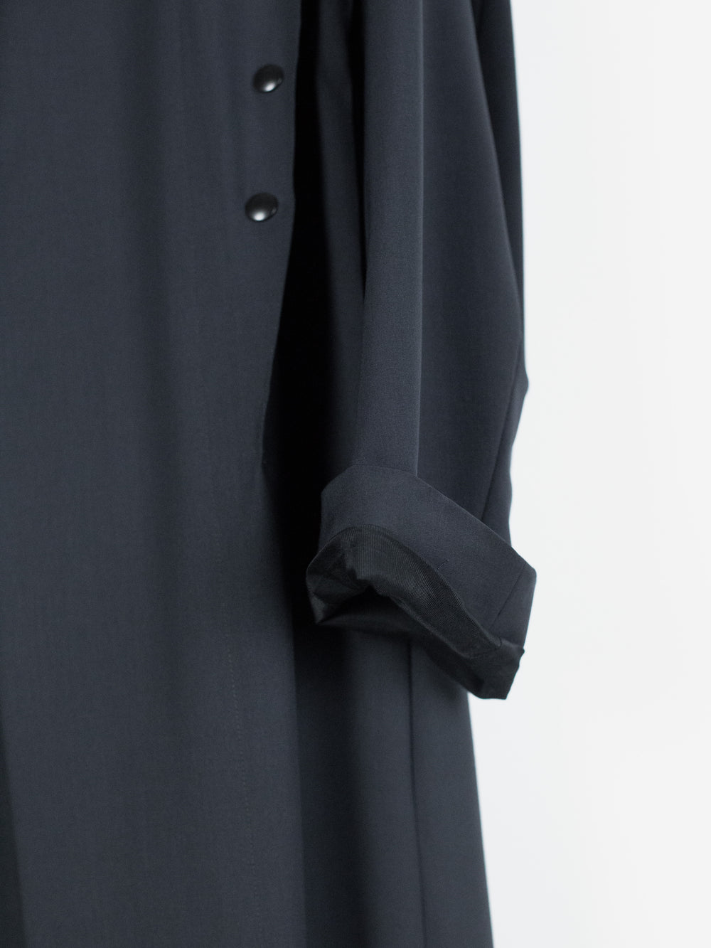 The Burr snap coat is a piece from Kiko Kostadinov's 00042018 Spring/Summer 2018 collection. In a way that is emblematic of Kostadinov's work, the wearer is provided with innovative and unexpected ways to style, interface, and shape the piece. It features button-in darts that lie on the front torso that can alter the shape and fit of the piece depending on how they're done up. Next to the darts are slits that lead to pockets and also open directly to the interior of the coat. On the runway, the sleeves of an accompanying jumpsuit emerge from these slits and tie at the waist, providing a visual break in the long silhouette, cinching the waist in, and letting the punchy lime yellow of the jumpsuit feel more integrated and 'interwoven' as it threads in and out of the coat. In this way, the Burr not only functions as a great standalone piece but can also idiosyncratically 'tie-in' with others in the collection.