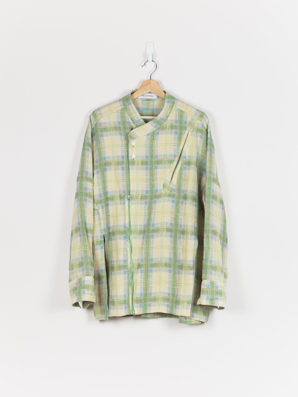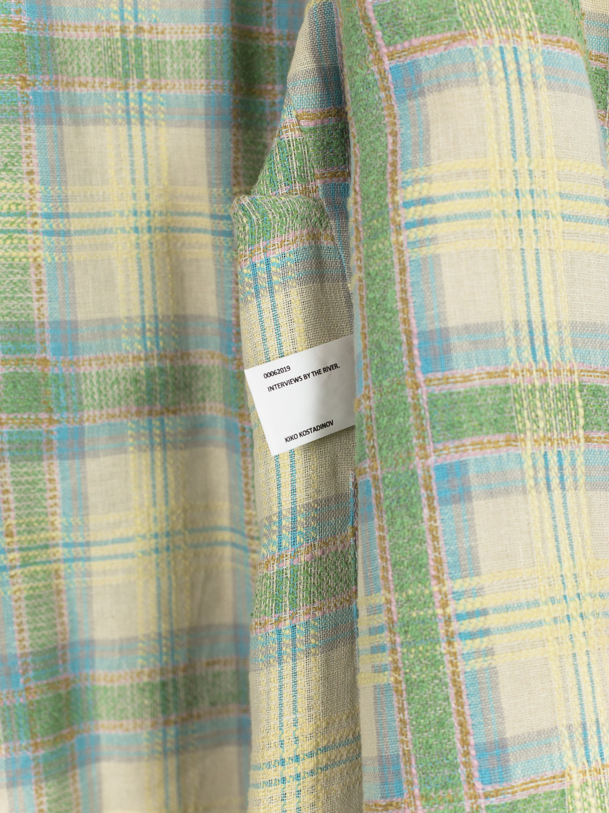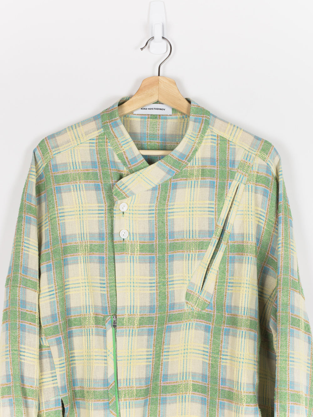 This asymmetrical shirt features a relaxed shape and all the unique detailing to be expected of Kiko Kostadinov. It's cut in the standout fabric from Spring 2019's 'Interviews by the River,' a fresh green, blue, and orange tinted madras check whose Chennai origins align with the collection's inspiration (which is stated by Kiko Kostadinov as being about "imagined men in an imaginary Bengal town going for job interviews"). The fabric is a dense, plush mixture of primarily linen and cotton which gives the piece a substantive drape yet lets it breathe in hot weather. This shirt features a mix of button and zip-closed front, high front double vent, the season's signature constructed keyhole pocket at wearer's left chest, and a curved band collar.
