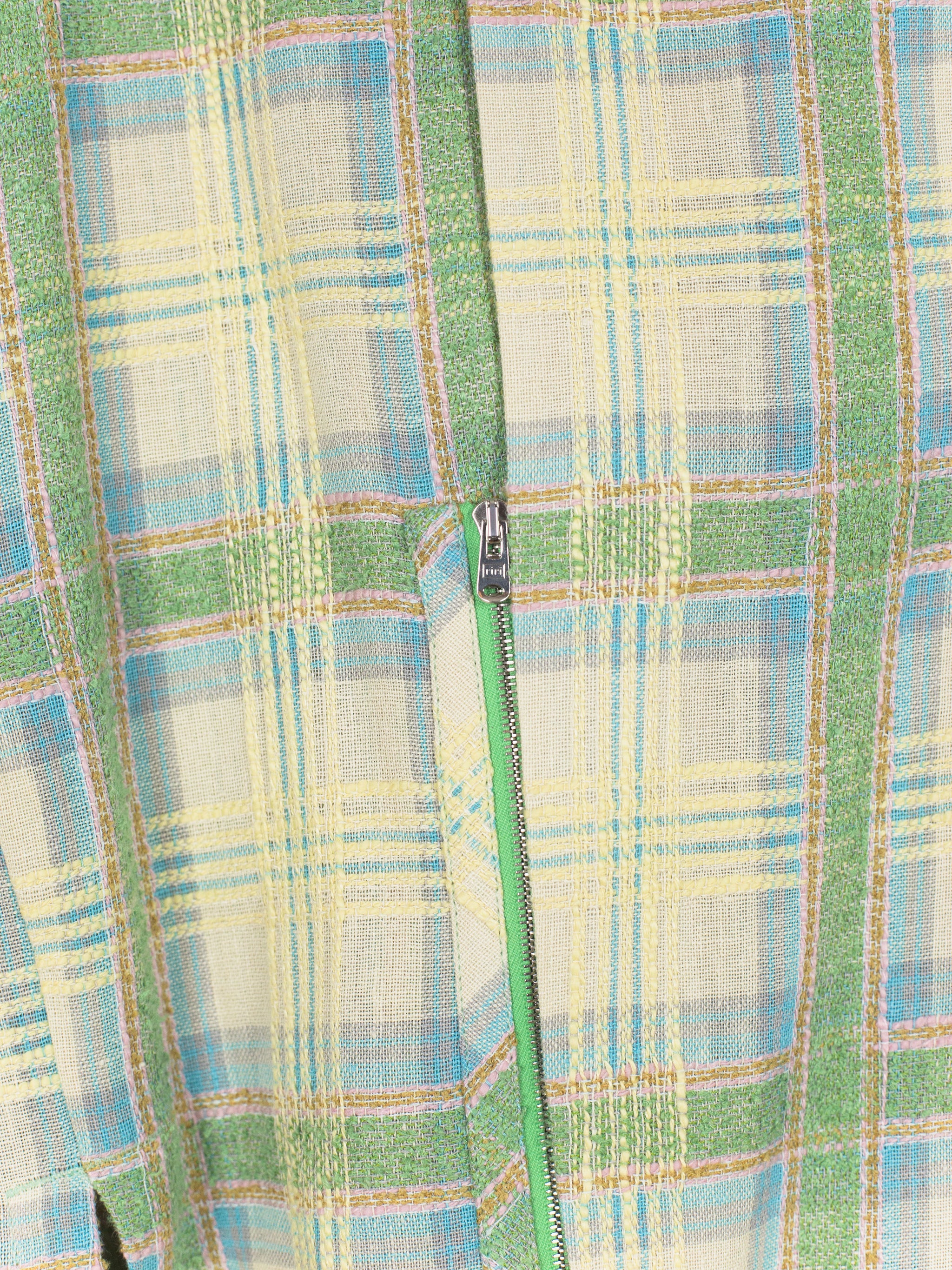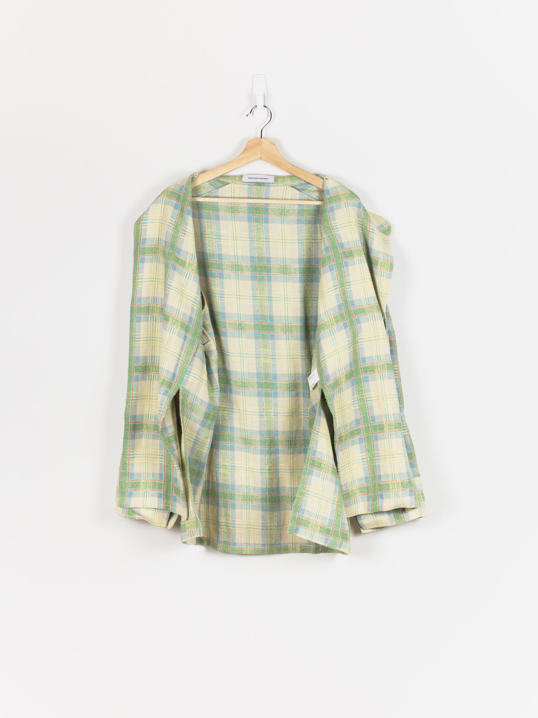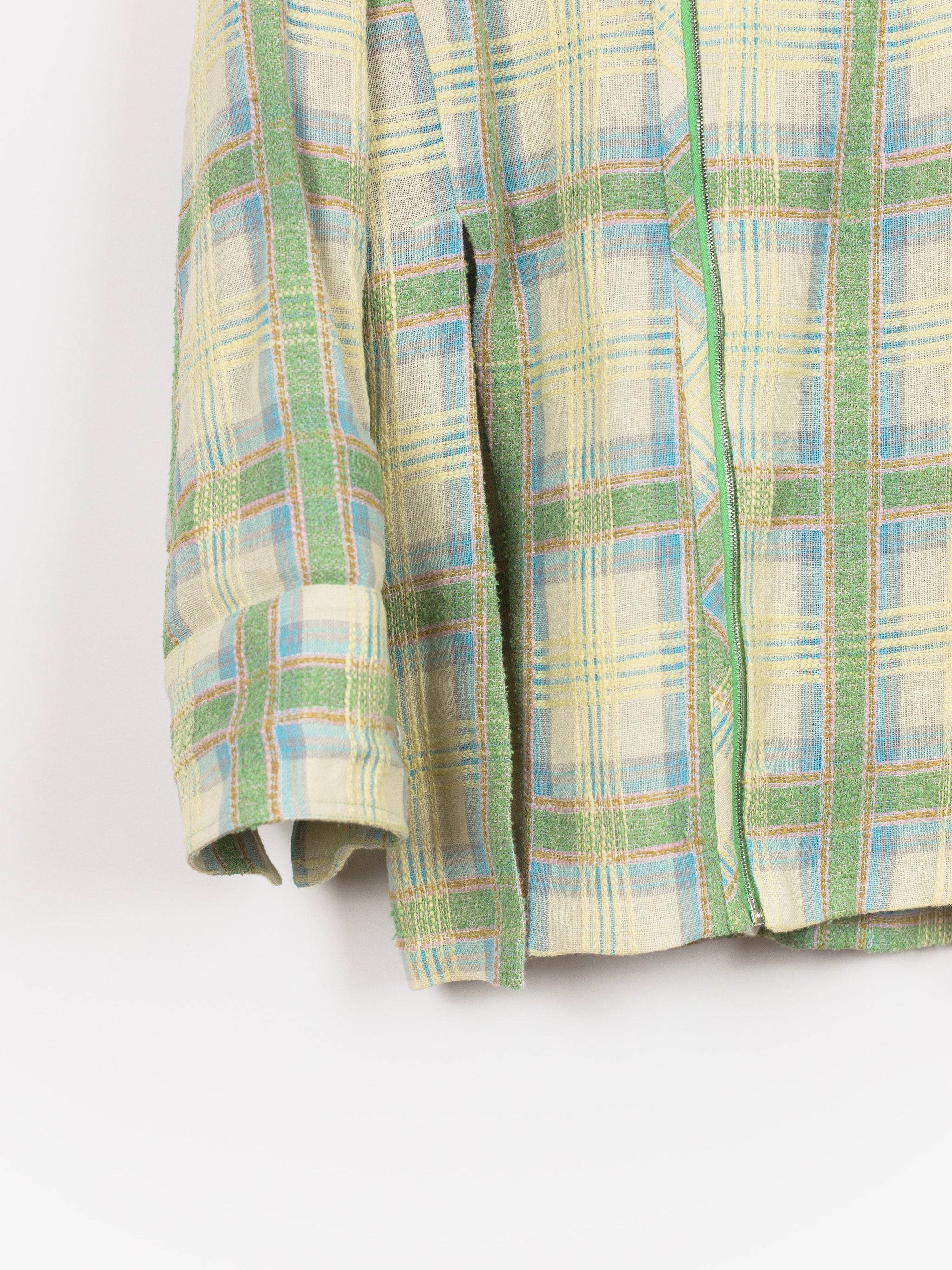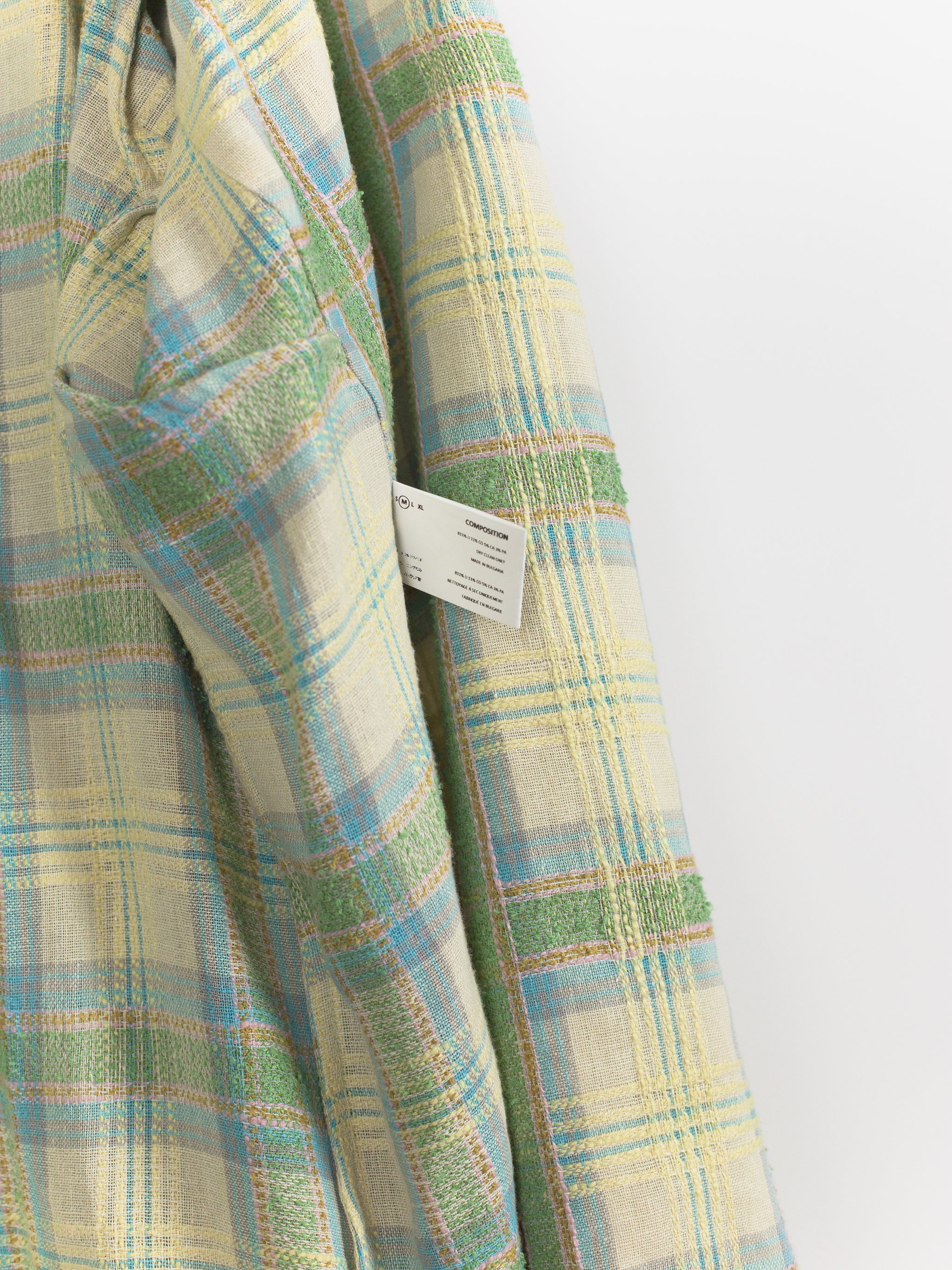 This asymmetrical shirt features a relaxed shape and all the unique detailing to be expected of Kiko Kostadinov. It's cut in the standout fabric from Spring 2019's 'Interviews by the River,' a fresh green, blue, and orange tinted madras check whose Chennai origins align with the collection's inspiration (which is stated by Kiko Kostadinov as being about "imagined men in an imaginary Bengal town going for job interviews"). The fabric is a dense, plush mixture of primarily linen and cotton which gives the piece a substantive drape yet lets it breathe in hot weather. This shirt features a mix of button and zip-closed front, high front double vent, the season's signature constructed keyhole pocket at wearer's left chest, and a curved band collar.