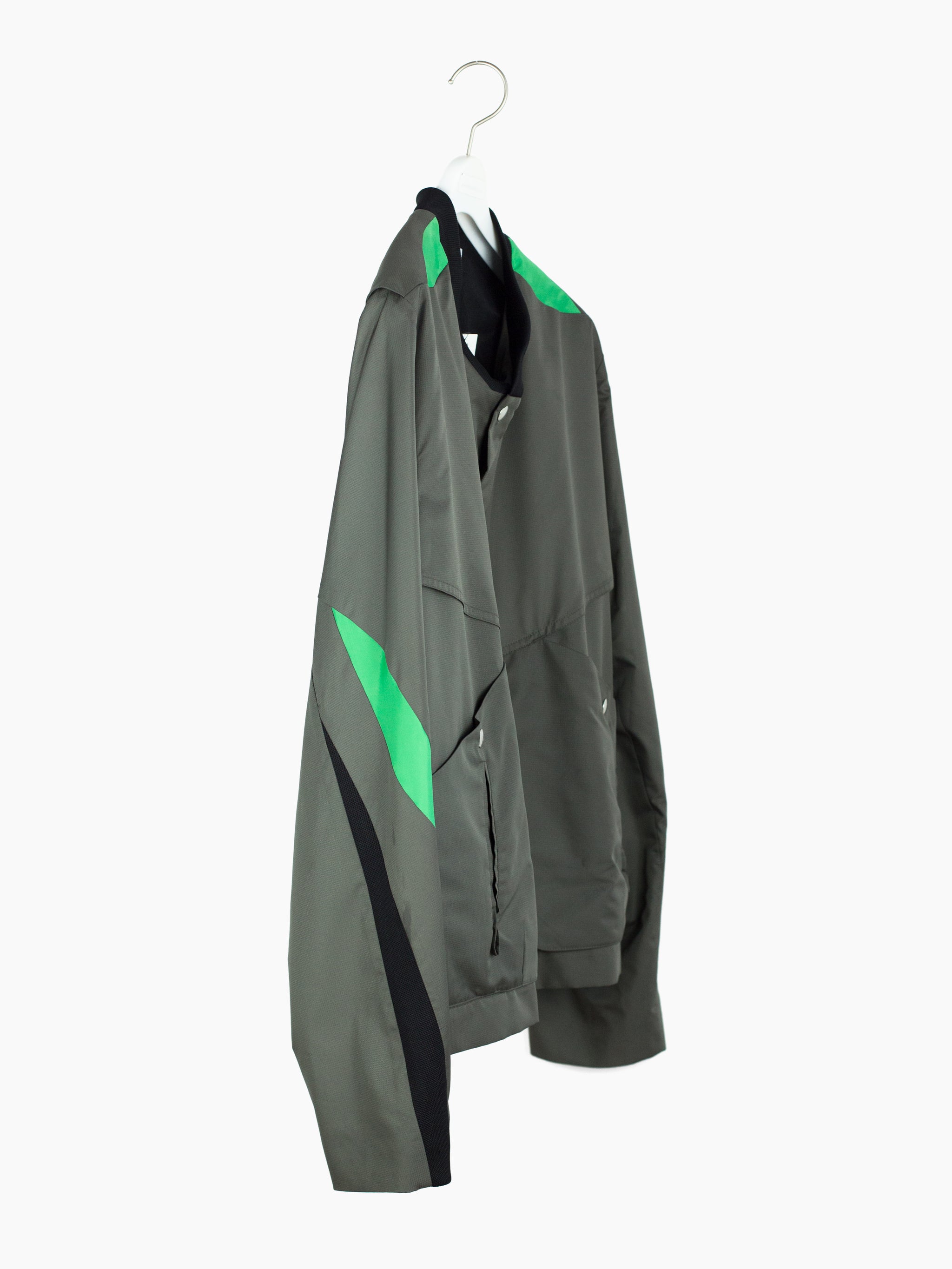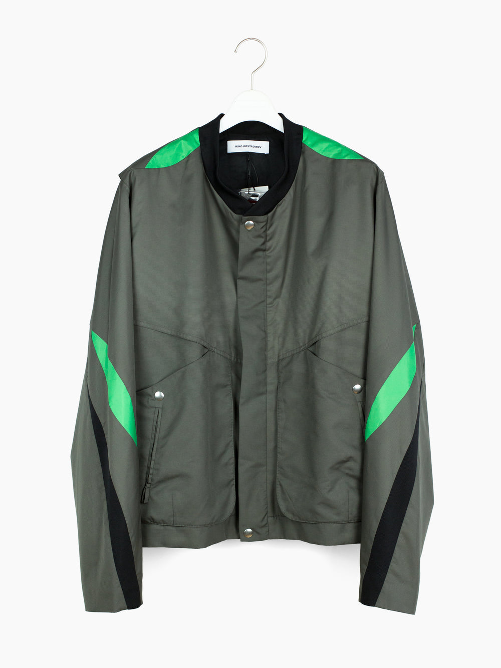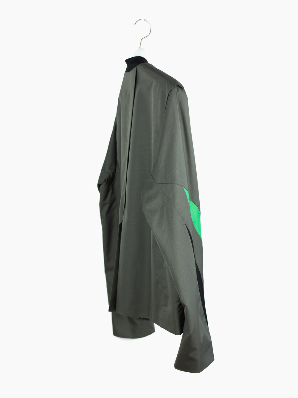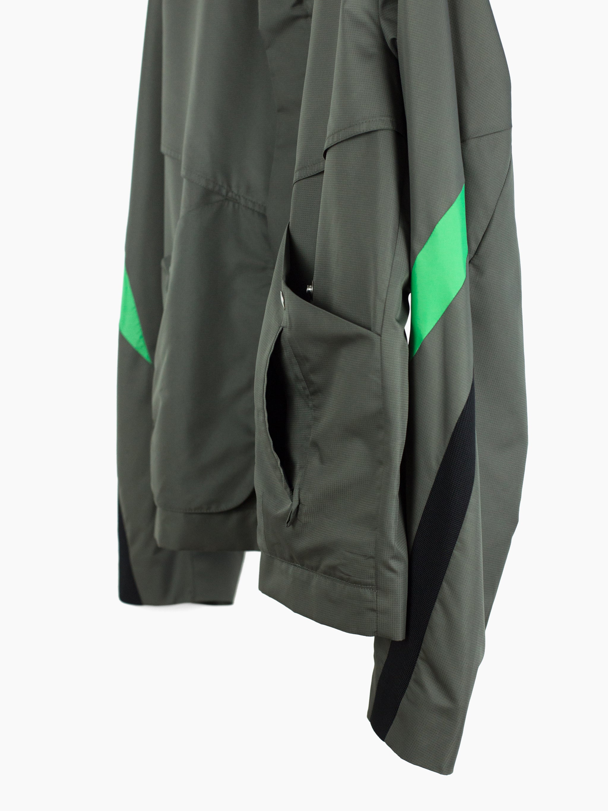 From 00102021 'Sirokkó,' the Minerva blouson is cut in a micro ripstop polyester face fabric with curved leafy bright green + black accent panels that illustrate the collection's Renaissance inspirations. Kiko Kostadinov's expertise comes to the fore as he balances the ornamental with the functional, with the construction of the Minerva belying a wealth of utilitarian features. At the waist, pockets are doubled-- slash side entry pockets (with a deconstructed double welt whose bottom ends loop below the pocket opening as an accent) sit atop snap-closed drop pockets. Easy access and easy organization are artfully cut in geometries that mirror the sharp triangular accent panels. Mobility comes in the form of a back shoulder pleat and gusseted armpit construction while an untraditionally constructed center back vent leaves excess fabric on the outside, creating a pleat that traces all the way up to the neckline.