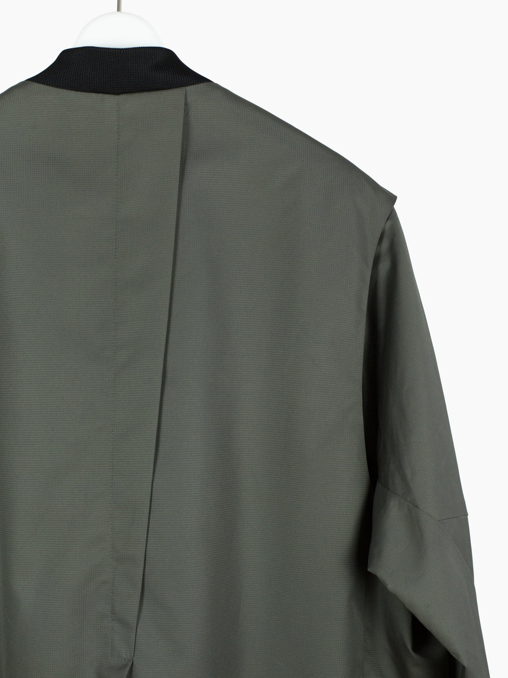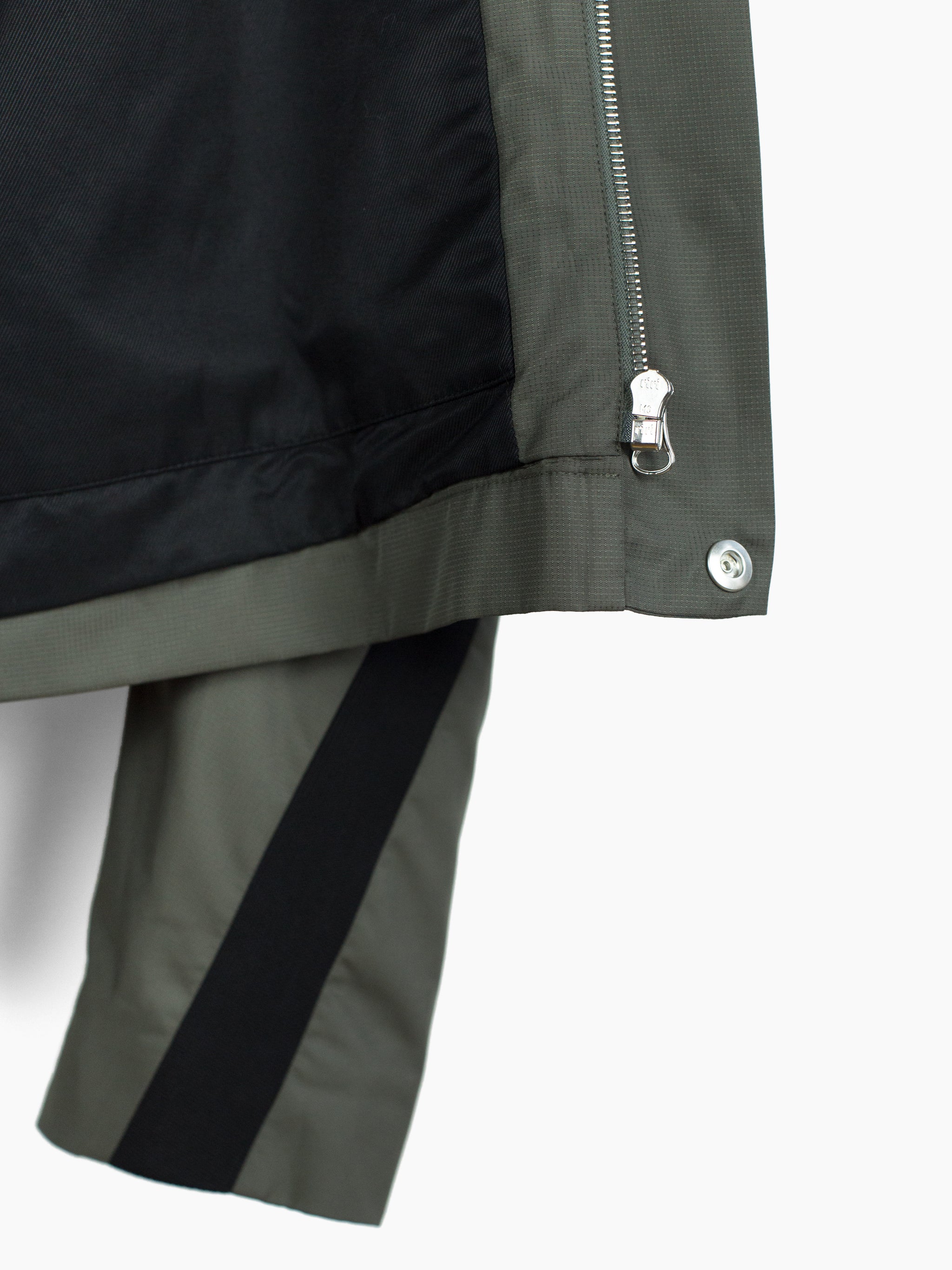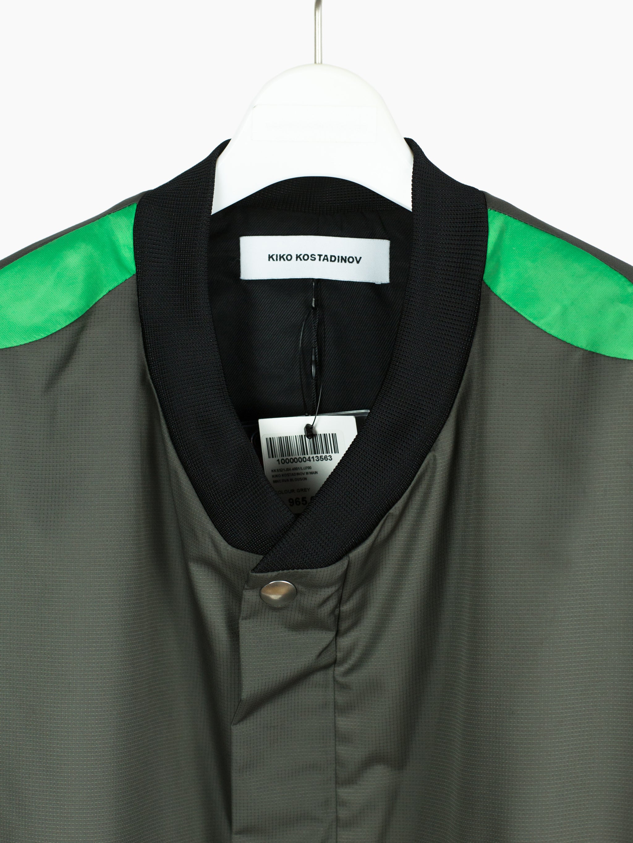 From 00102021 'Sirokkó,' the Minerva blouson is cut in a micro ripstop polyester face fabric with curved leafy bright green + black accent panels that illustrate the collection's Renaissance inspirations. Kiko Kostadinov's expertise comes to the fore as he balances the ornamental with the functional, with the construction of the Minerva belying a wealth of utilitarian features. At the waist, pockets are doubled-- slash side entry pockets (with a deconstructed double welt whose bottom ends loop below the pocket opening as an accent) sit atop snap-closed drop pockets. Easy access and easy organization are artfully cut in geometries that mirror the sharp triangular accent panels. Mobility comes in the form of a back shoulder pleat and gusseted armpit construction while an untraditionally constructed center back vent leaves excess fabric on the outside, creating a pleat that traces all the way up to the neckline.