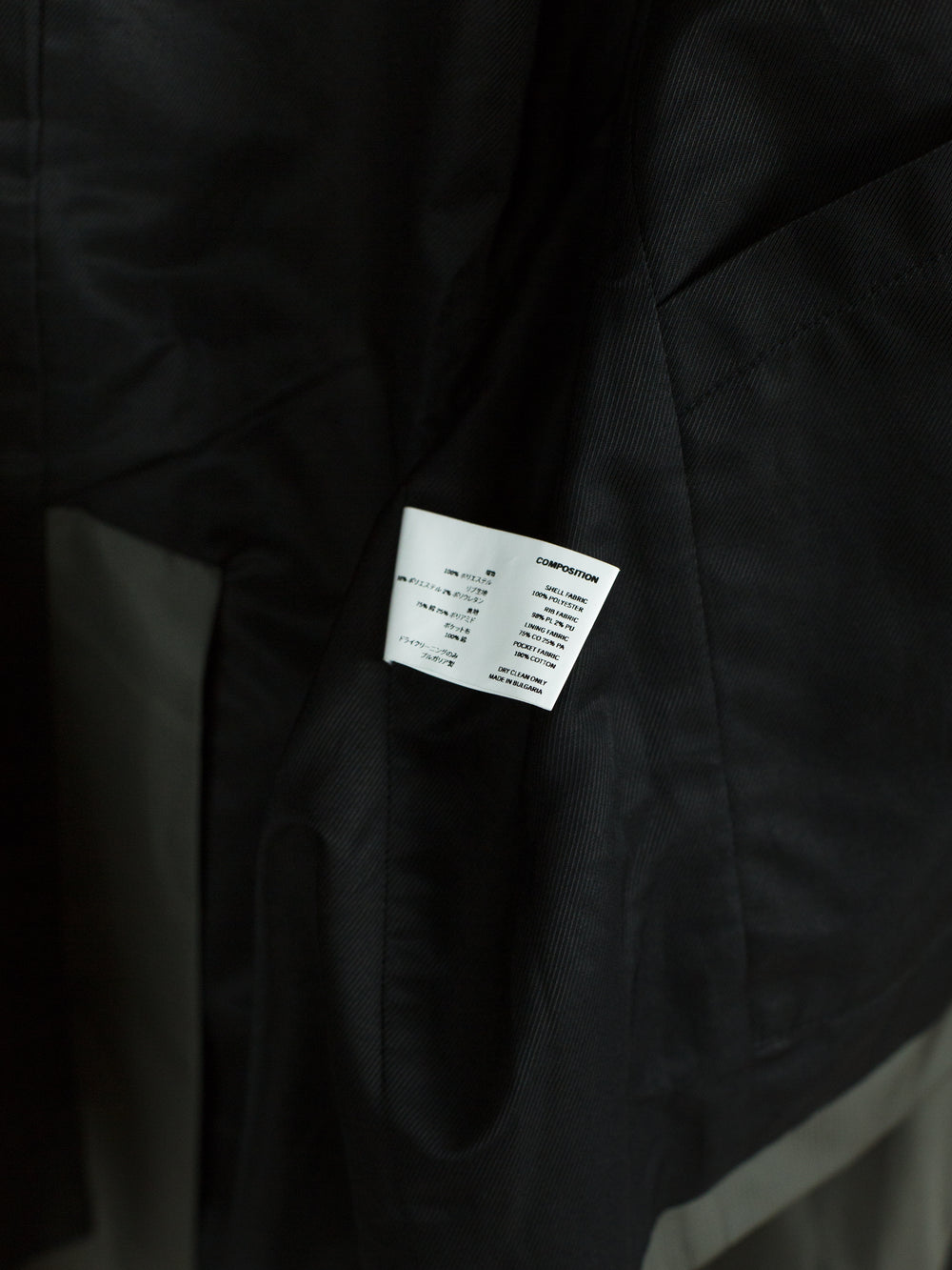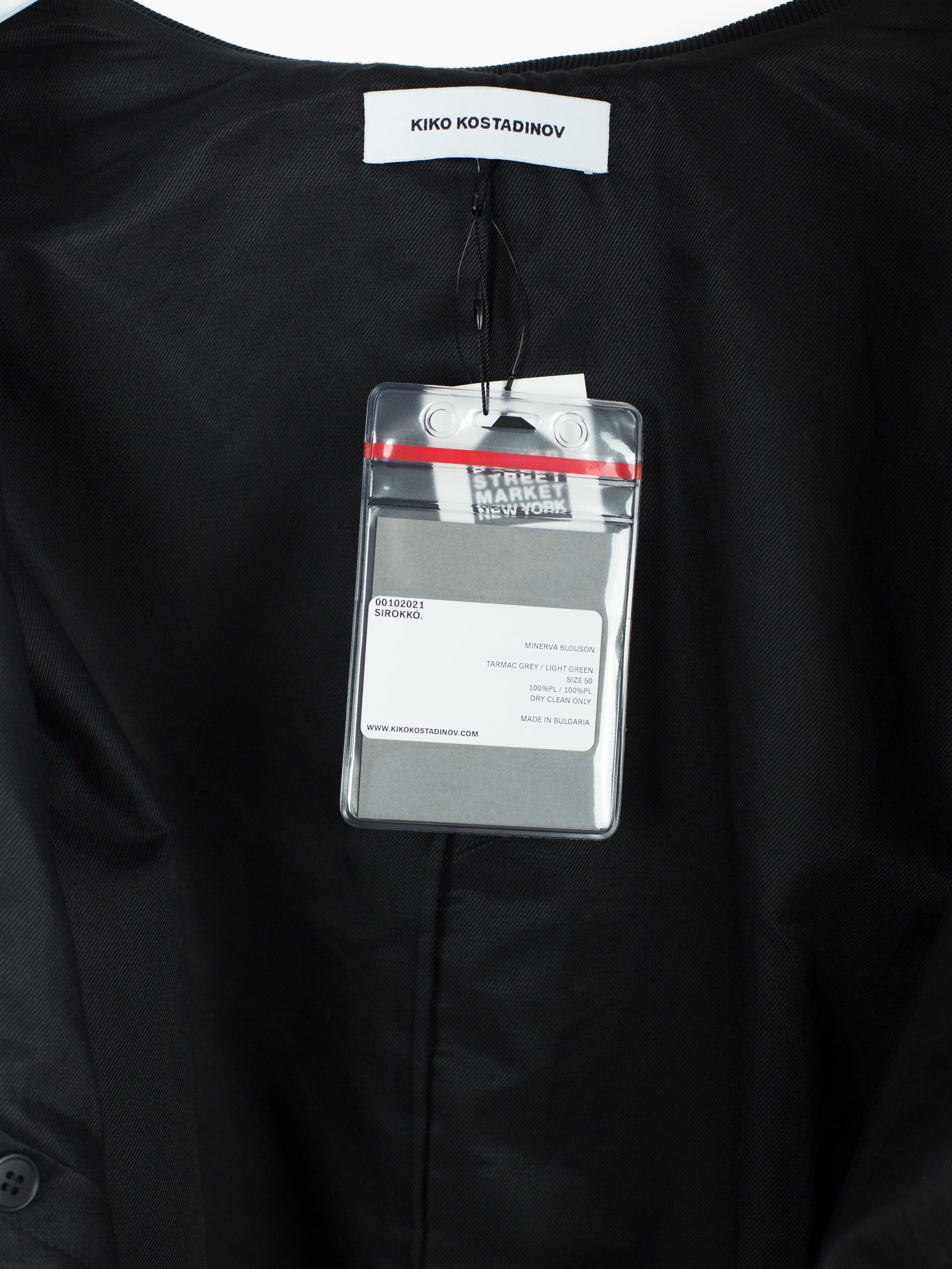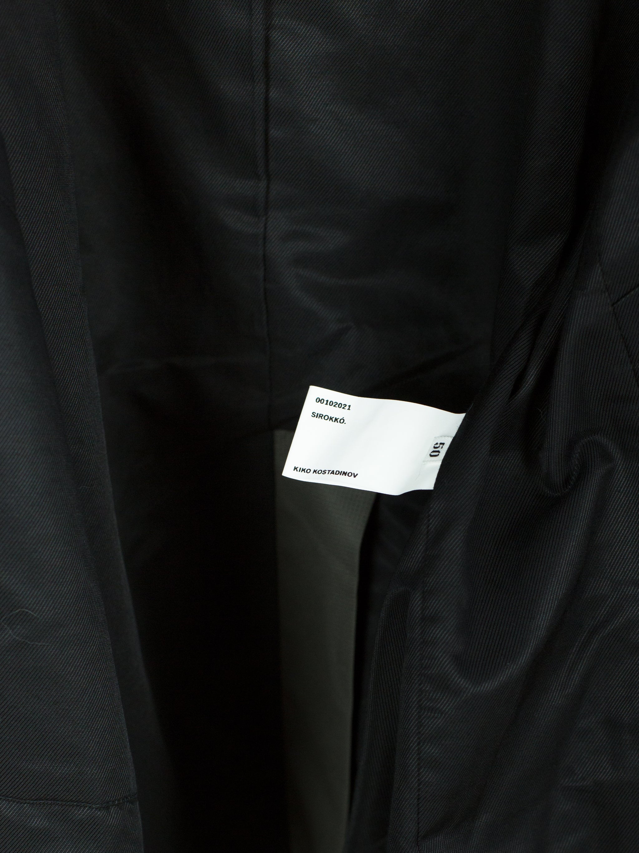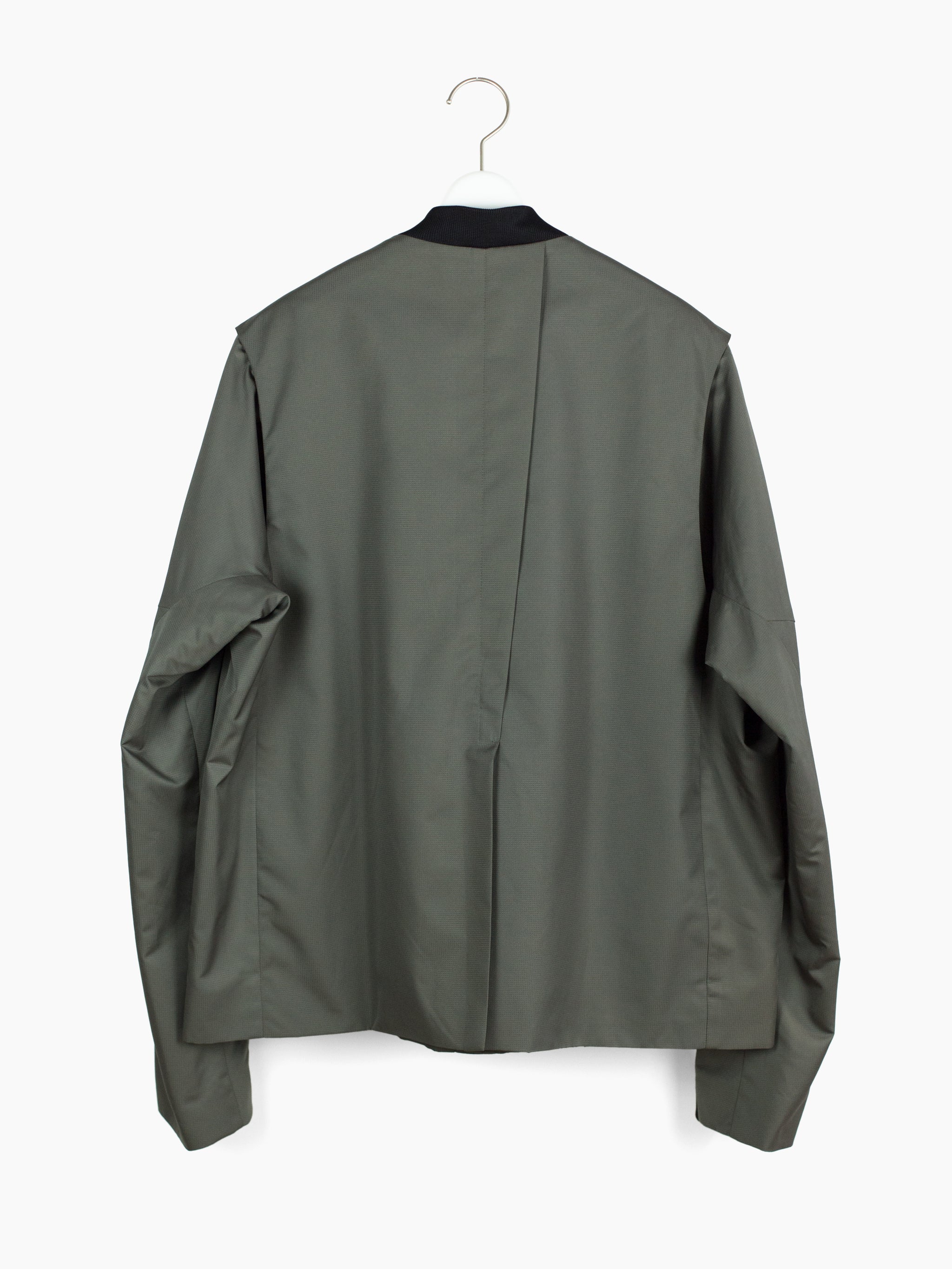 From 00102021 'Sirokkó,' the Minerva blouson is cut in a micro ripstop polyester face fabric with curved leafy bright green + black accent panels that illustrate the collection's Renaissance inspirations. Kiko Kostadinov's expertise comes to the fore as he balances the ornamental with the functional, with the construction of the Minerva belying a wealth of utilitarian features. At the waist, pockets are doubled-- slash side entry pockets (with a deconstructed double welt whose bottom ends loop below the pocket opening as an accent) sit atop snap-closed drop pockets. Easy access and easy organization are artfully cut in geometries that mirror the sharp triangular accent panels. Mobility comes in the form of a back shoulder pleat and gusseted armpit construction while an untraditionally constructed center back vent leaves excess fabric on the outside, creating a pleat that traces all the way up to the neckline.