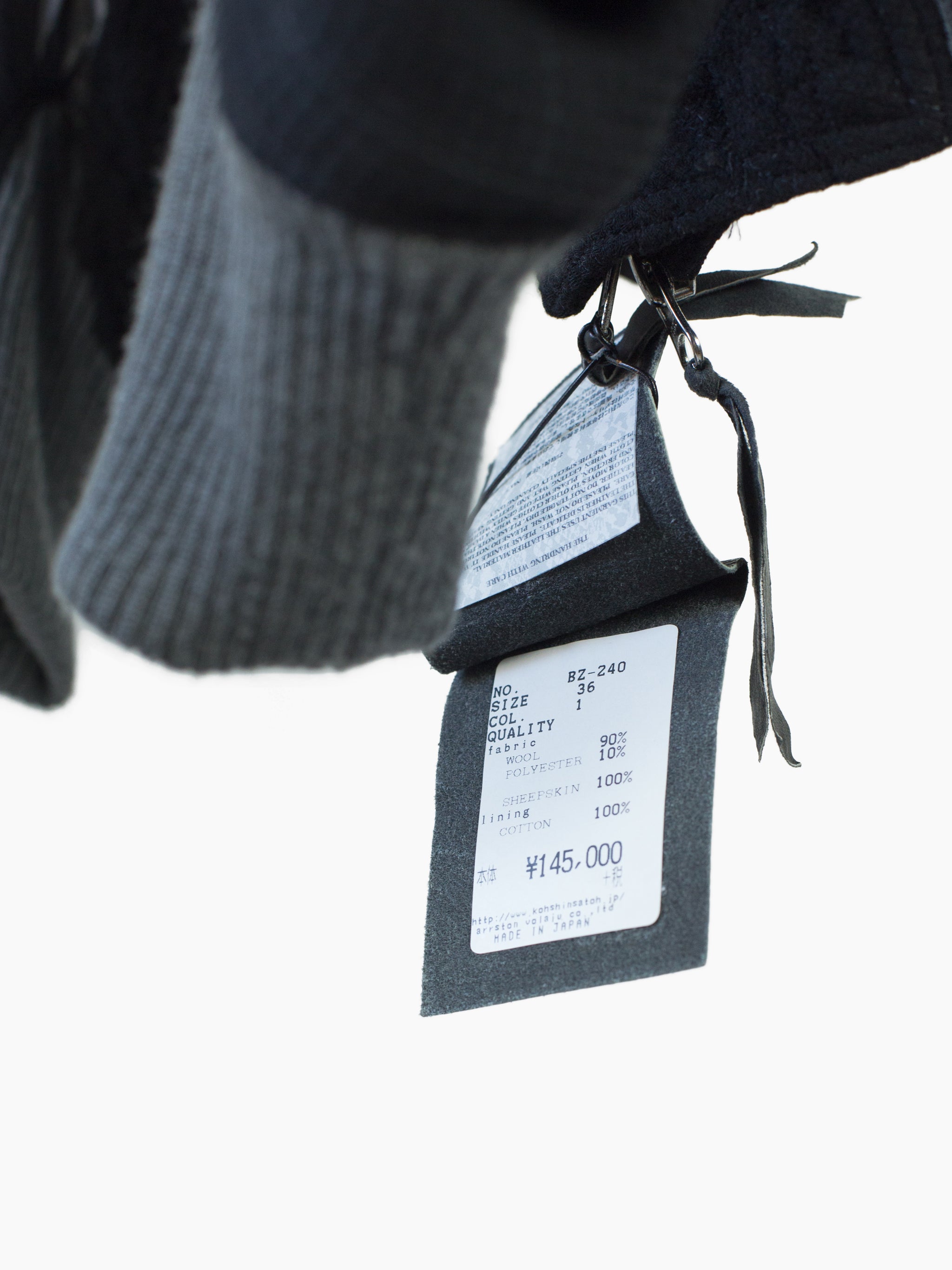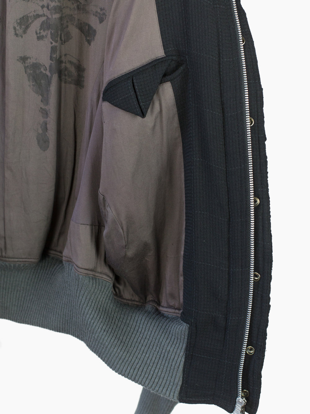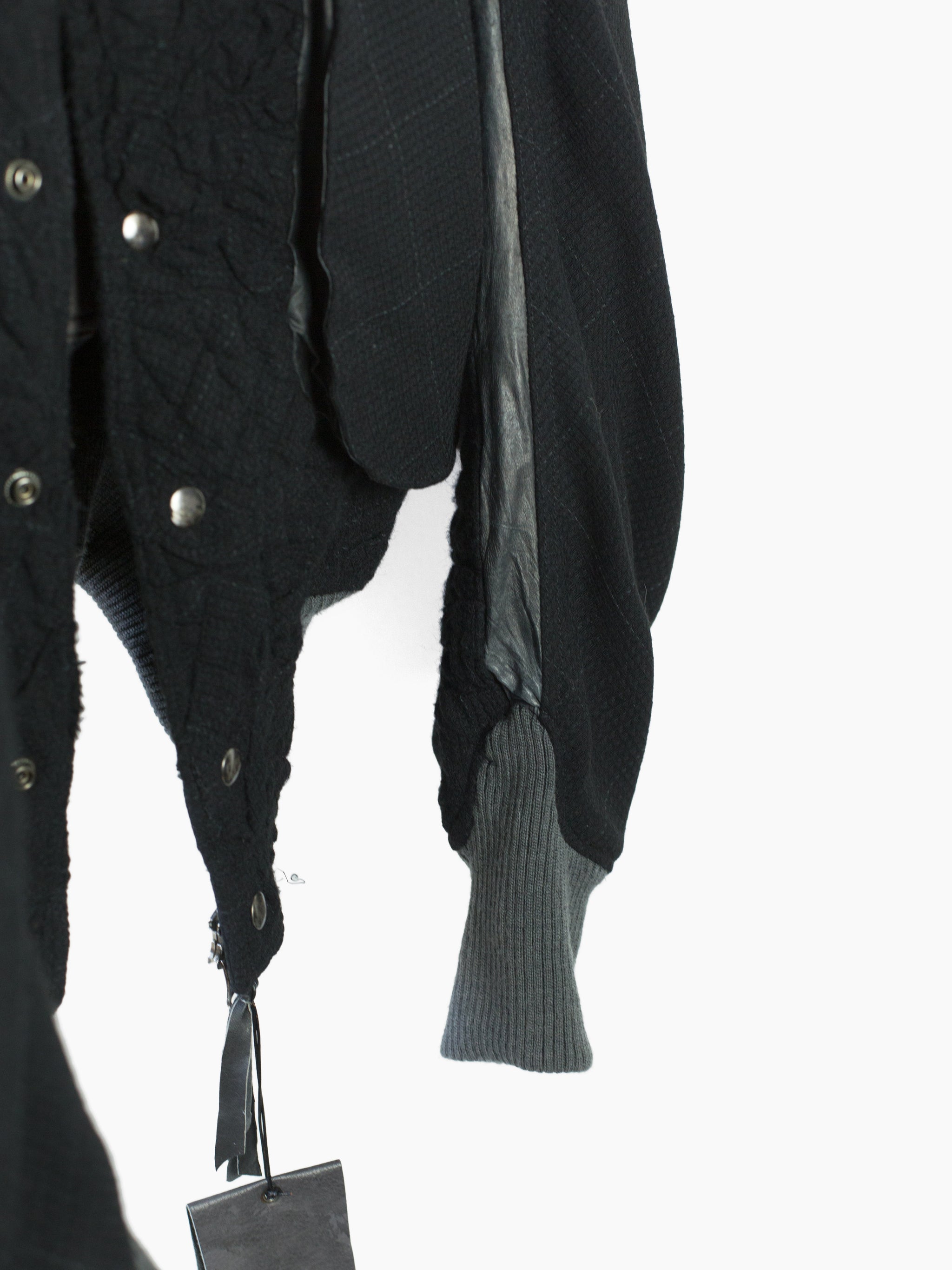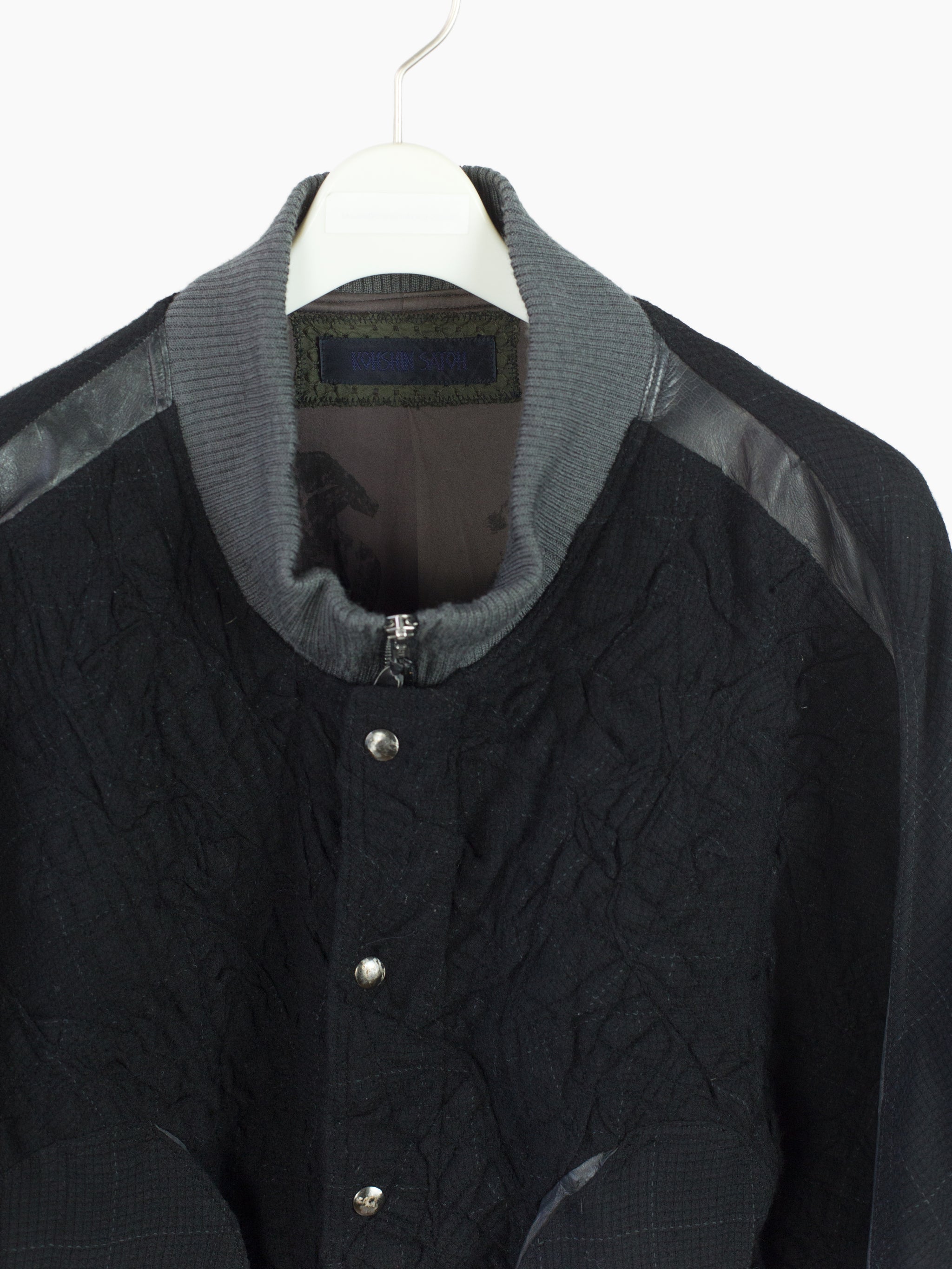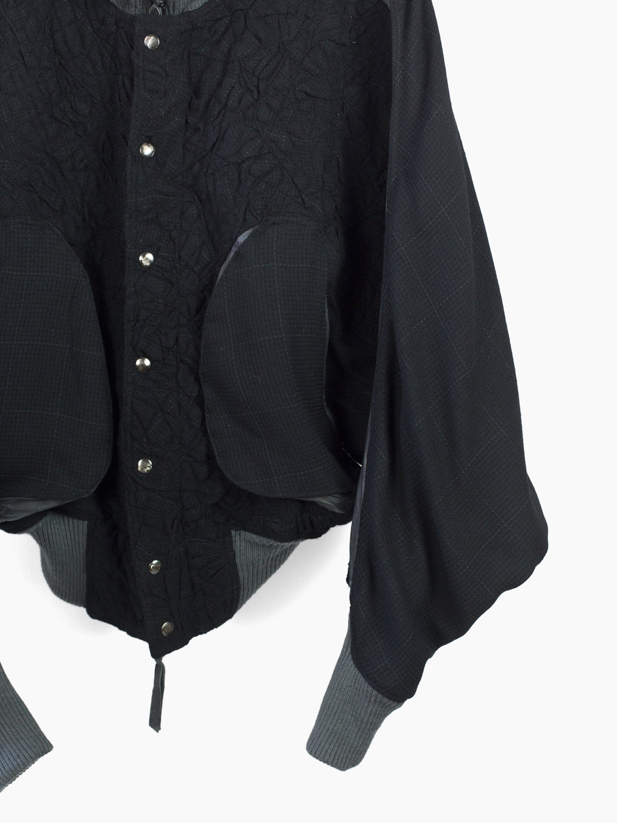 Black stadium jacket from 80s Japanese fashion and costume designer Kohshin Satoh, featuring dramatic cropped body and batwing style low armholes/sleeves. Cut in a luxurious mixed material palette combining sheepskin trim, subtle grey-on-black glen check wool at the sleeves, and a stitched-in-place 'wrinkled' wool body. With artful curved panel construction with sleeves that extend into round gusseted zipped waist pockets and articulated curved rib cuffs.