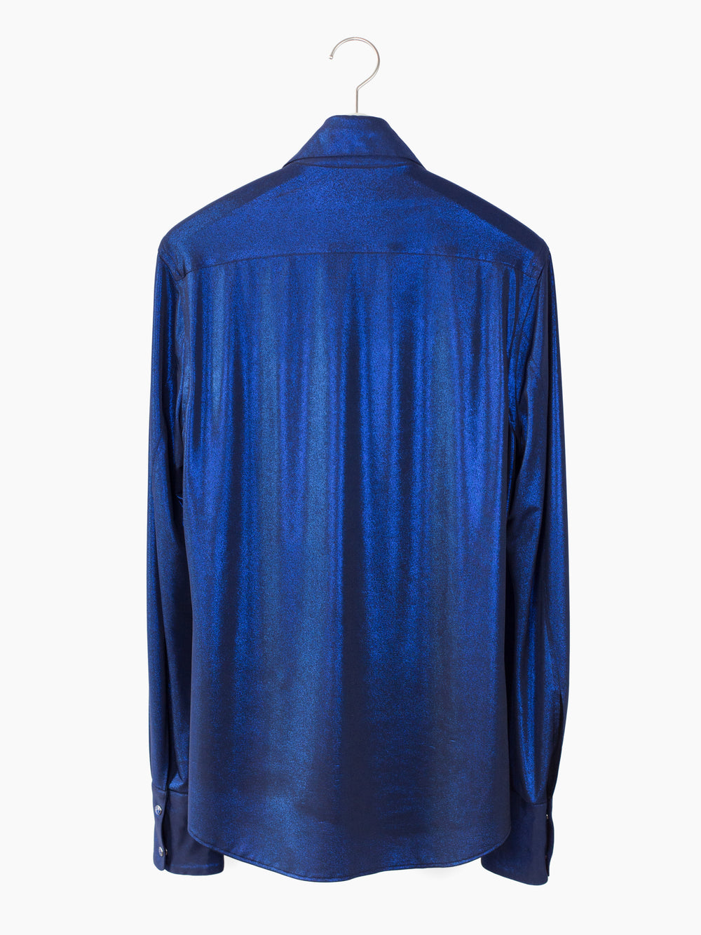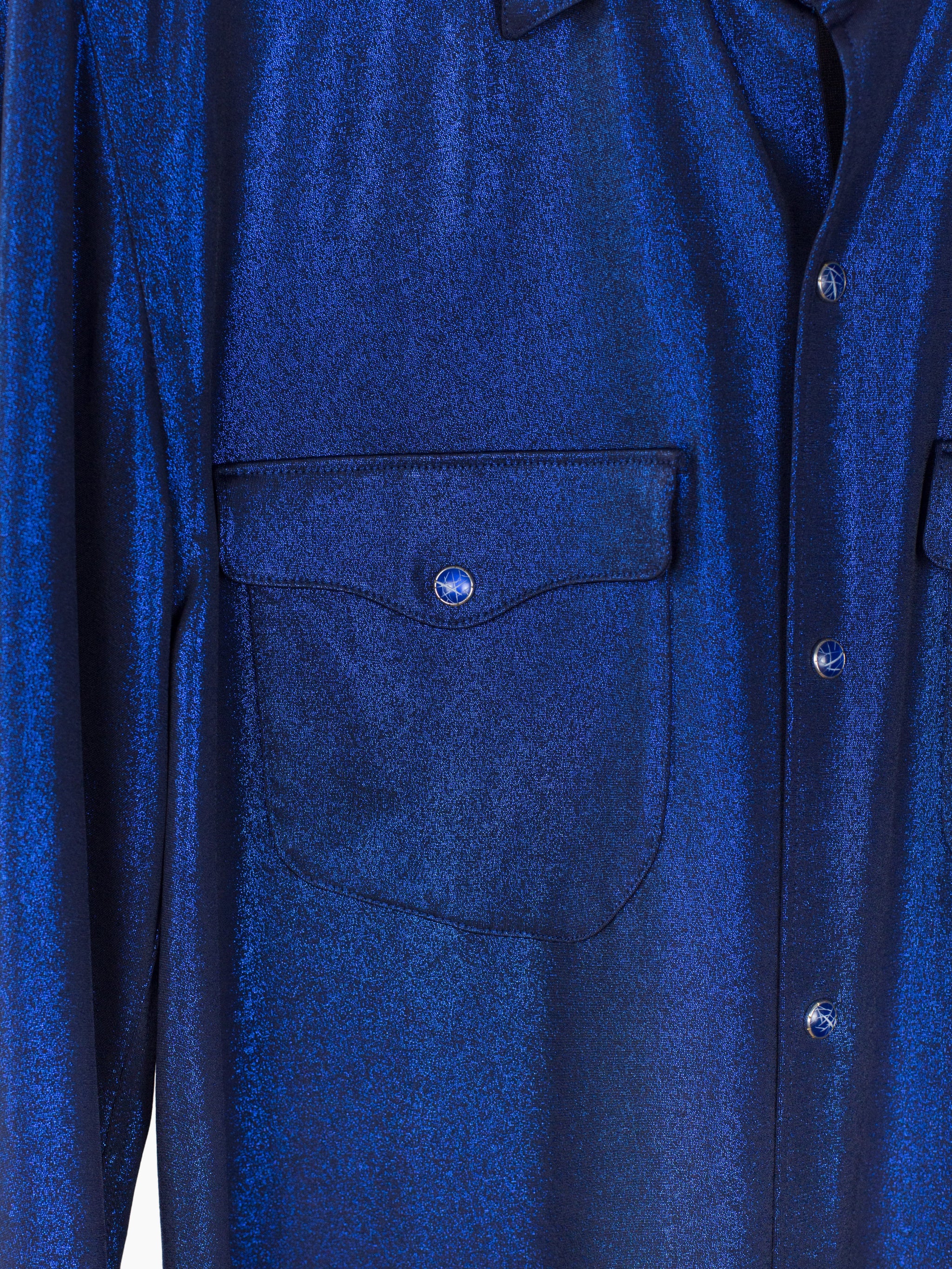 Lurex western shirt from AW18, featuring 'cracked' pearl snaps at front closure, pockets, and sleeves, and oversized point collar. Extra slim shrunken fit hugs the body and arms. Embodies the dark cowboy glamour of the collection.