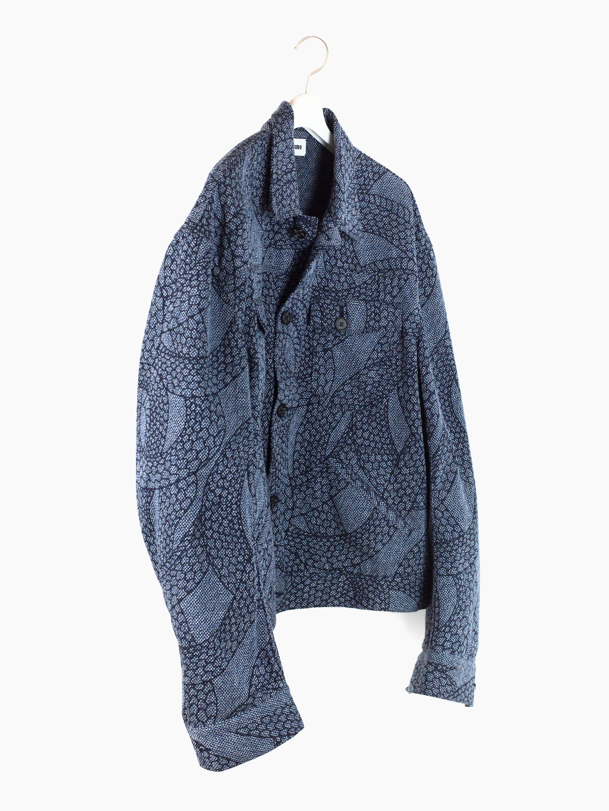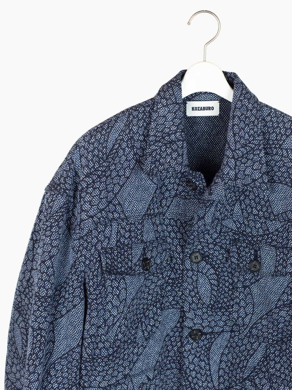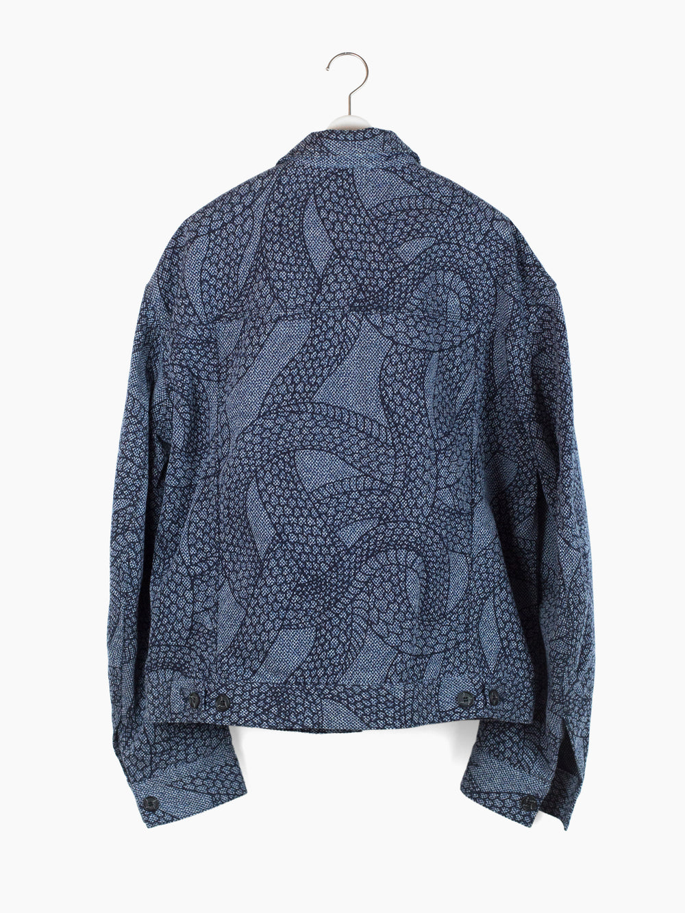 Oversized printed Sashiko trucker from Kozaburo Fall 2018. Features a dramatically oversized fit that will accommodate layers underneath and dramatically curved sleeve for a dynamic, sculptural silhouette. Features Kozaburo signature 'cracked' buttons throughout, two flap-closed chest pockets, and two welt waist pockets. Tons of texture and depth with the 'snake moshpit' print layered atop the already very visually dense sashiko fabric.