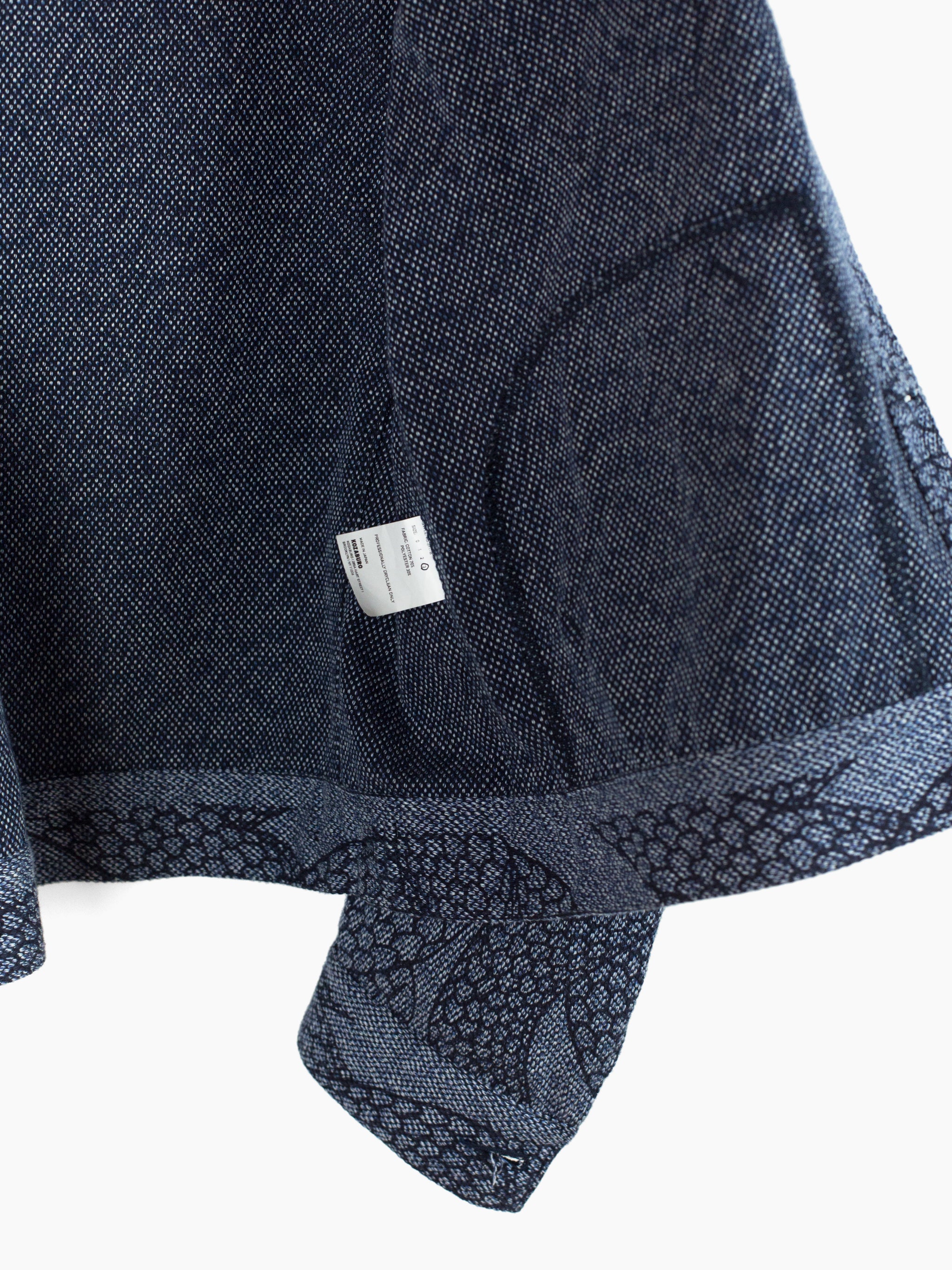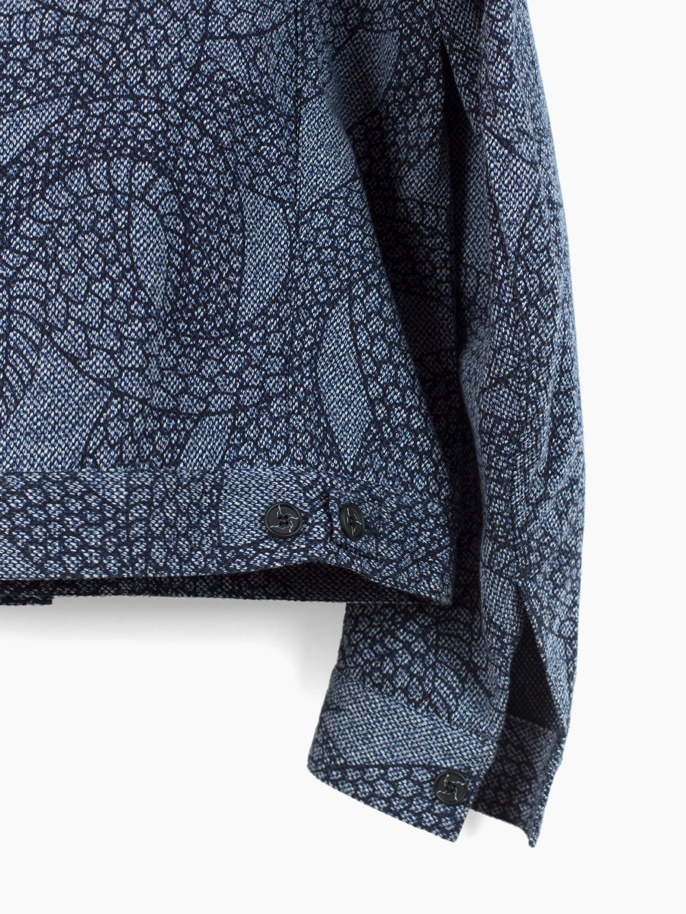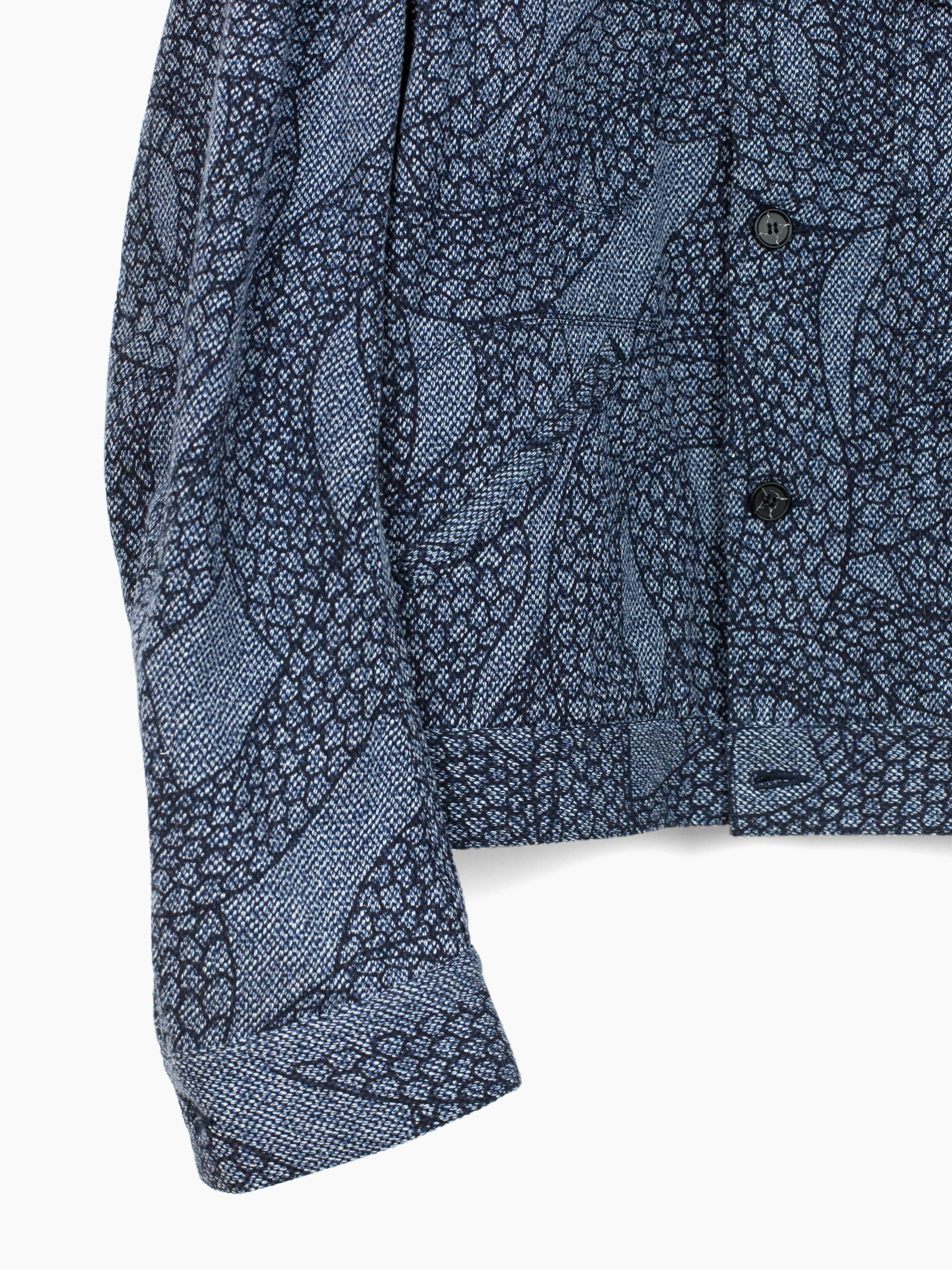Oversized printed Sashiko trucker from Kozaburo Fall 2018. Features a dramatically oversized fit that will accommodate layers underneath and dramatically curved sleeve for a dynamic, sculptural silhouette. Features Kozaburo signature 'cracked' buttons throughout, two flap-closed chest pockets, and two welt waist pockets. Tons of texture and depth with the 'snake moshpit' print layered atop the already very visually dense sashiko fabric.