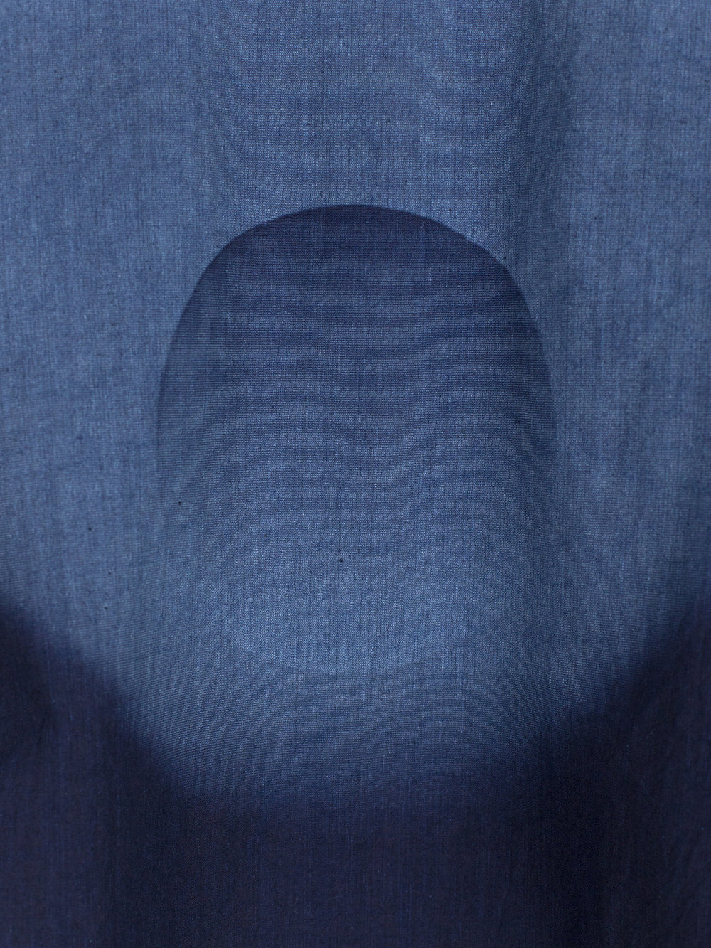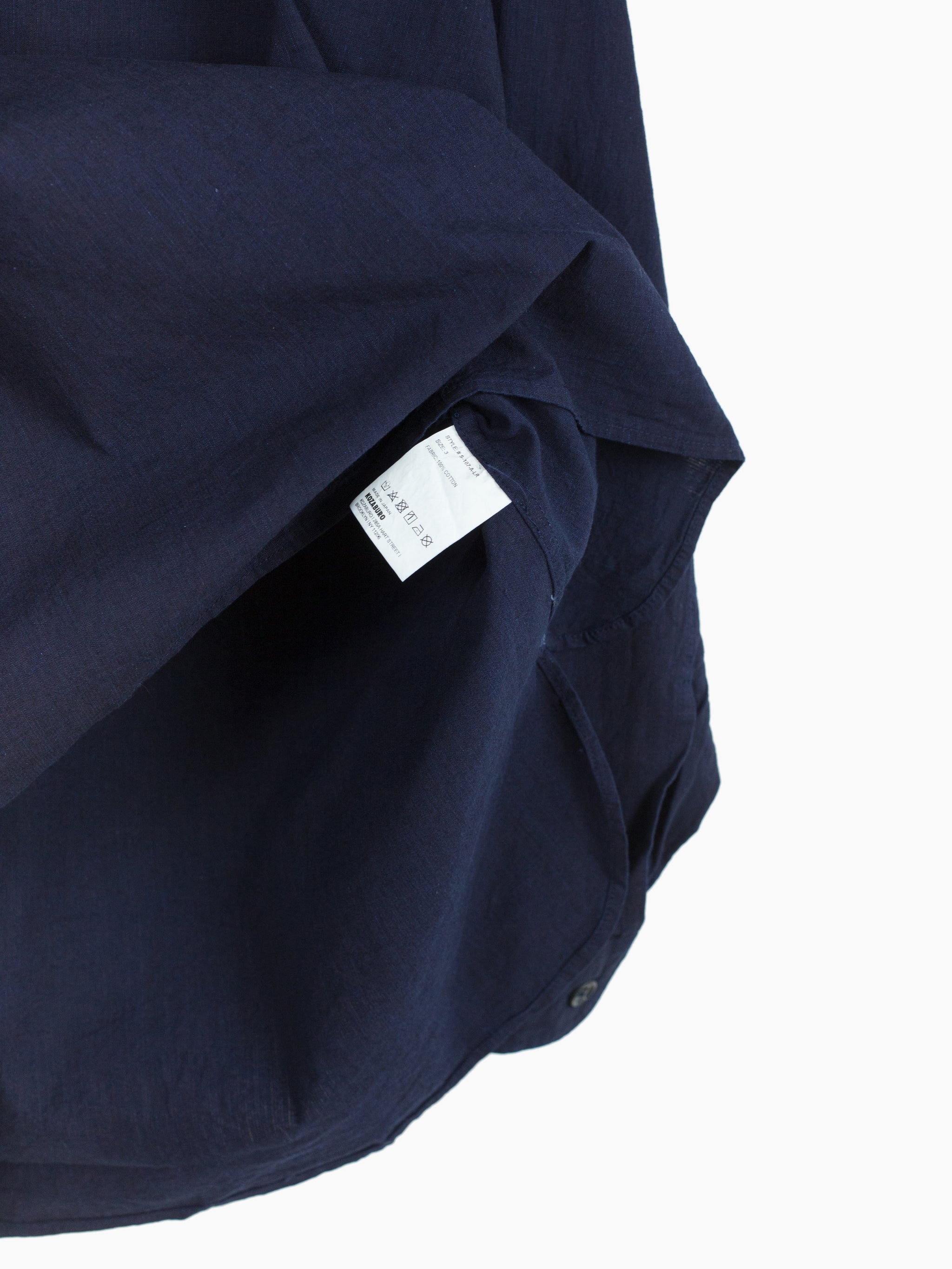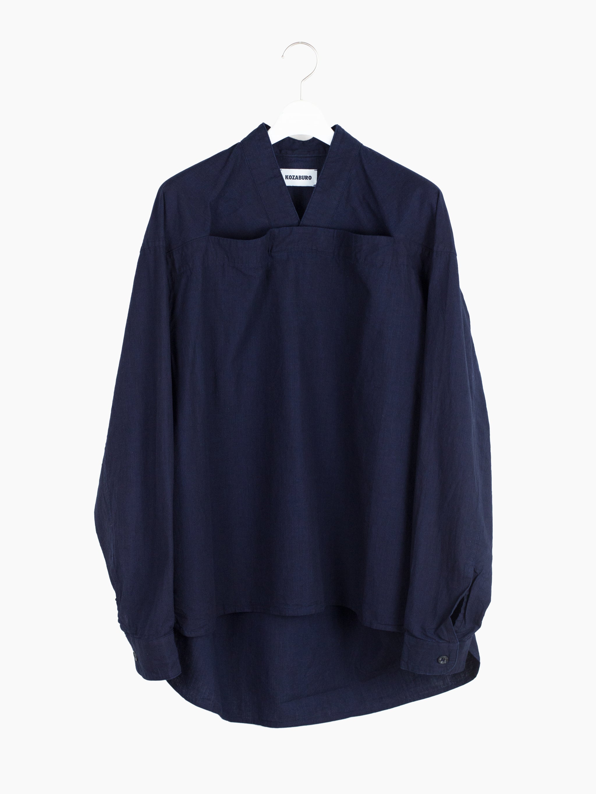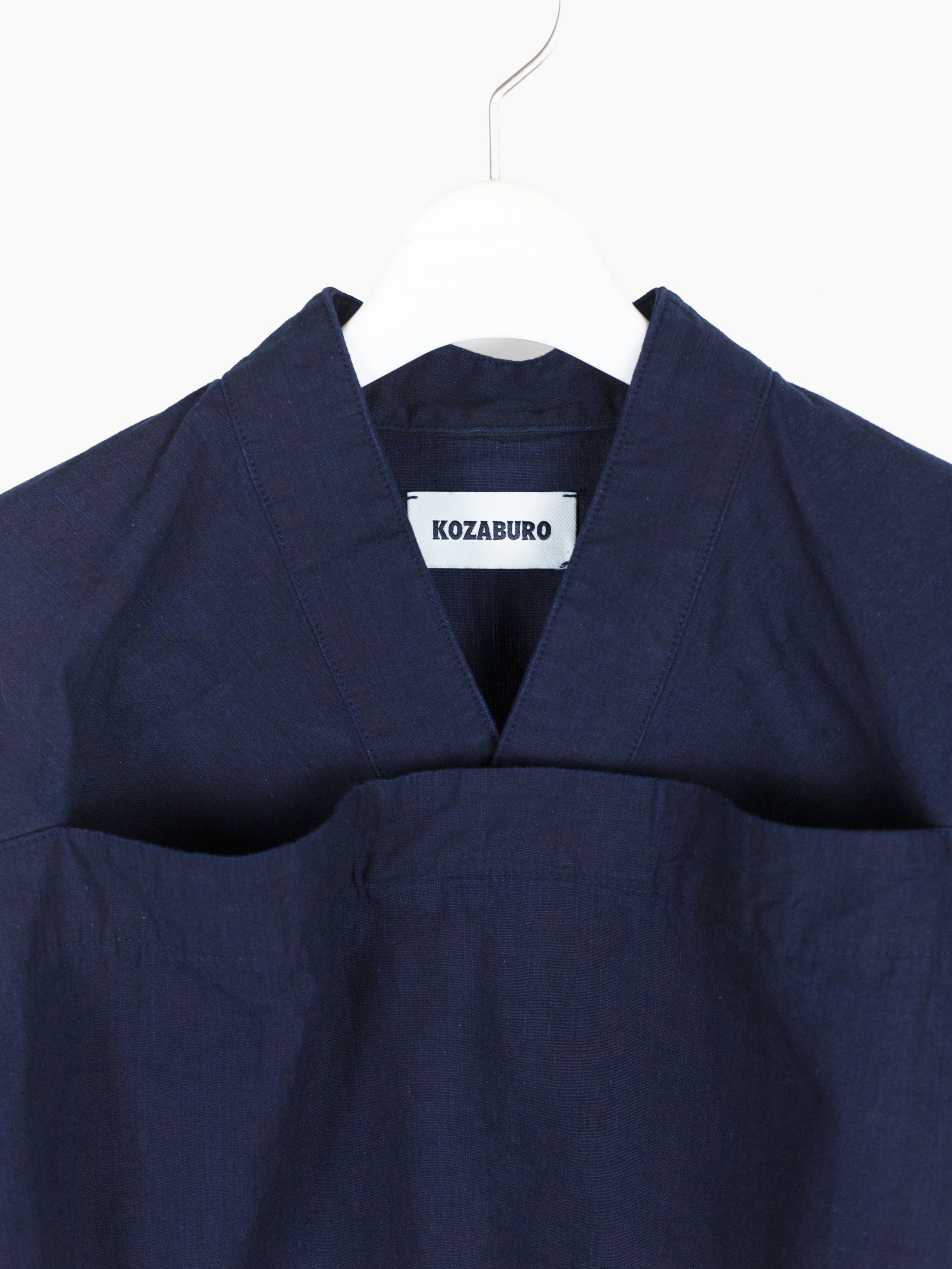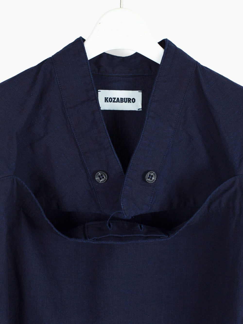 Lightweight plainweave monk shirt with indigo overdyed finish and sweeping laser etched back graphic featuring the sun rising over mountains. Features angular kimono-style collar with horizontal chest placket and pleated back construction that creates a cocoon silhouette. Finished with signature Kozaburo 'cracked' buttons.
