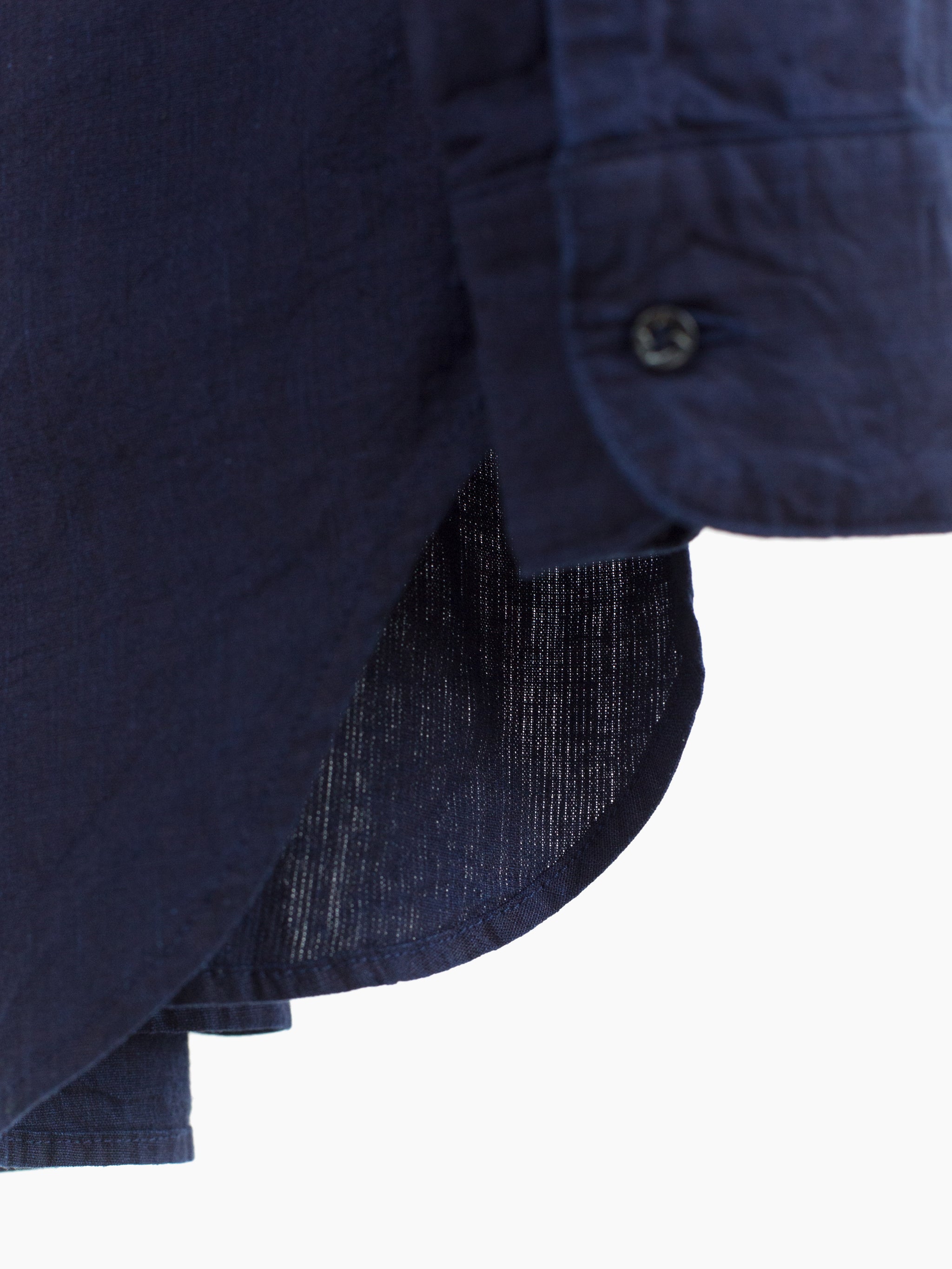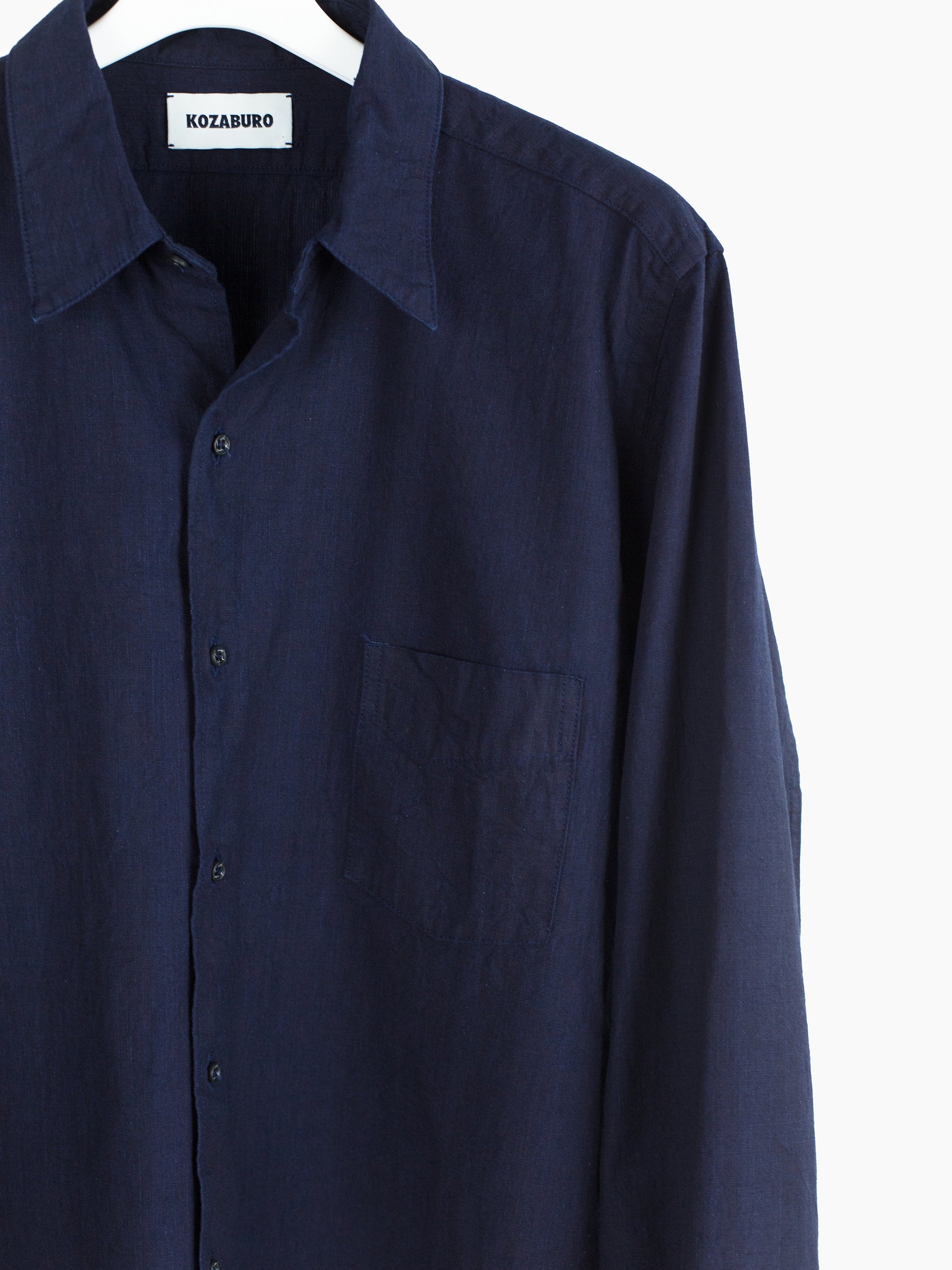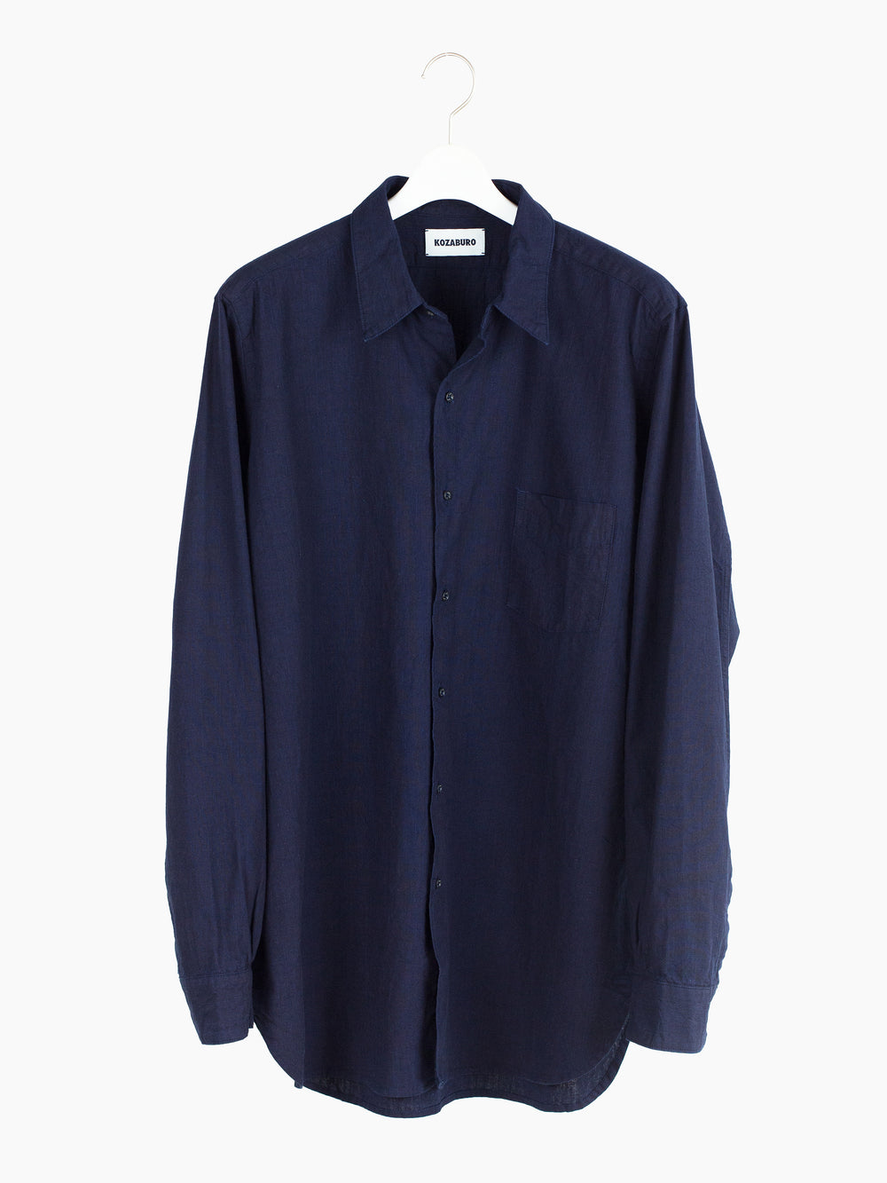 Classic button-down shirt, cut in the lightweight iteration of this season's indigo plainweave cotton. It has a beautiful open woven texture that reads almost like a ramie or linen but with the crisp, dry hand of cotton. Not to mention, the indigo overdye brings a palpable richness and depth in color. Perfect showcase of the seasonal signature laser-etched graphic of a sun rising above mountains on the back as well as Kozaburo signature cracked buttons. Features mid-sized point collar, ruched yoke, and barrel cuffs.