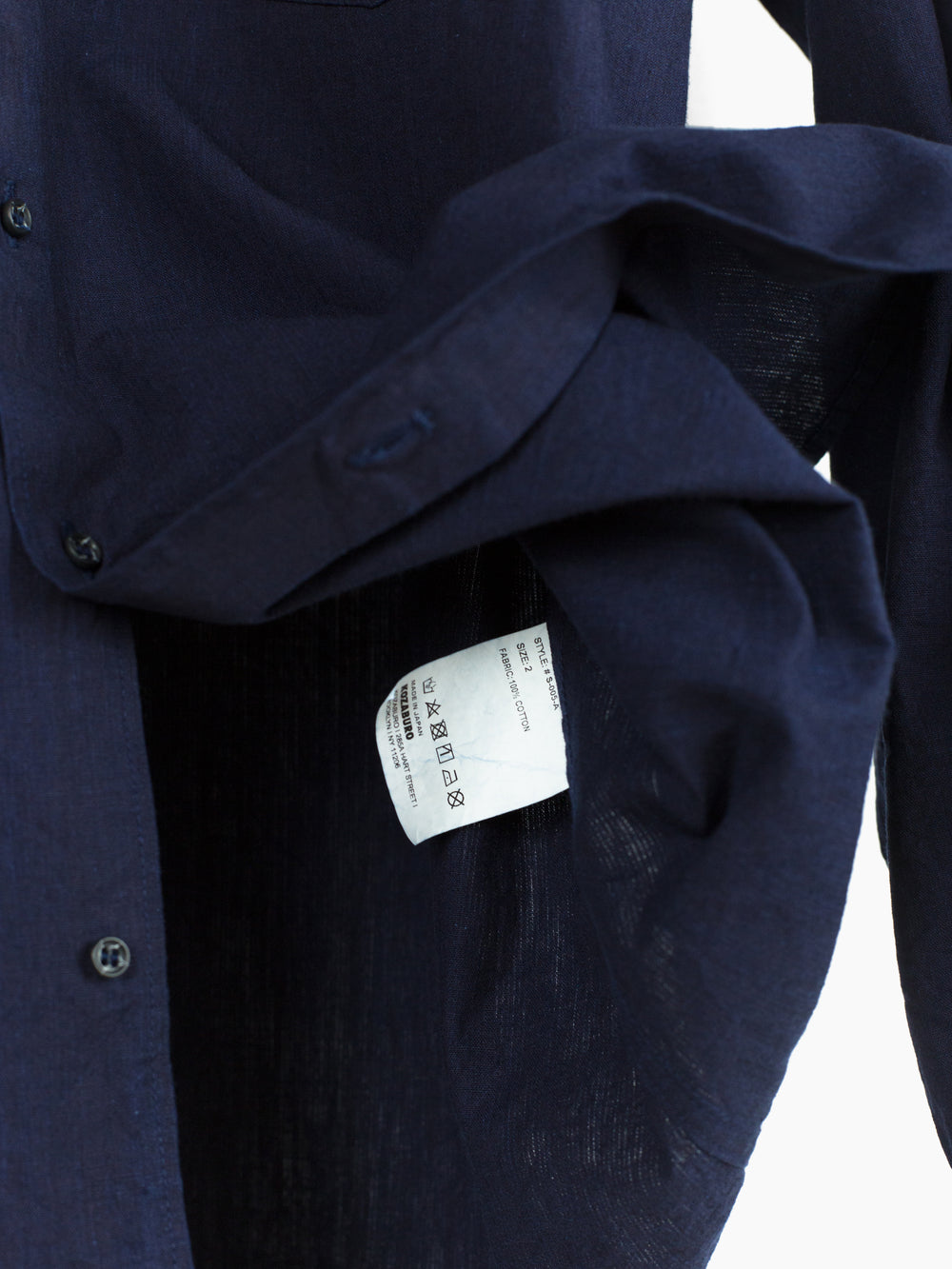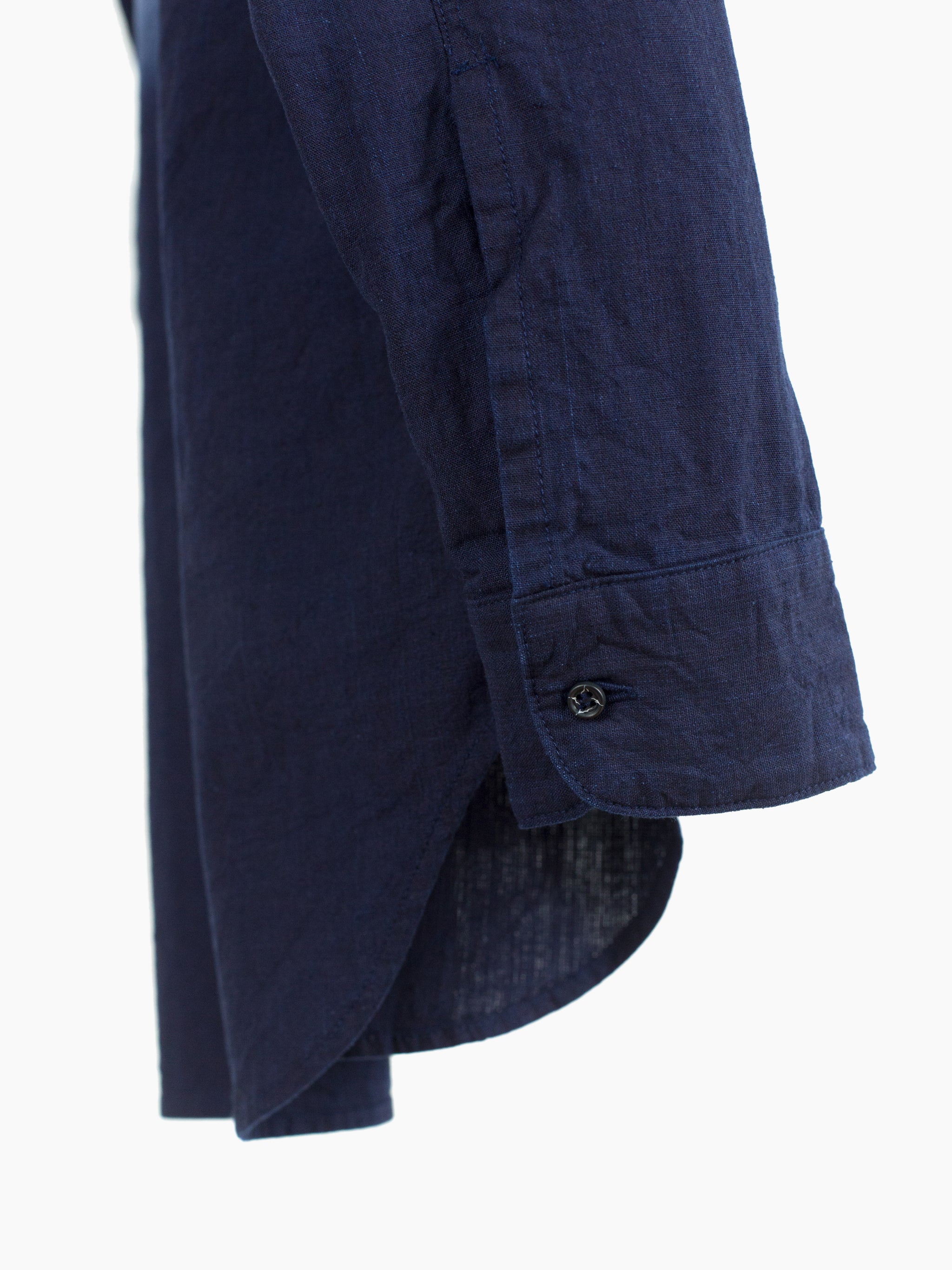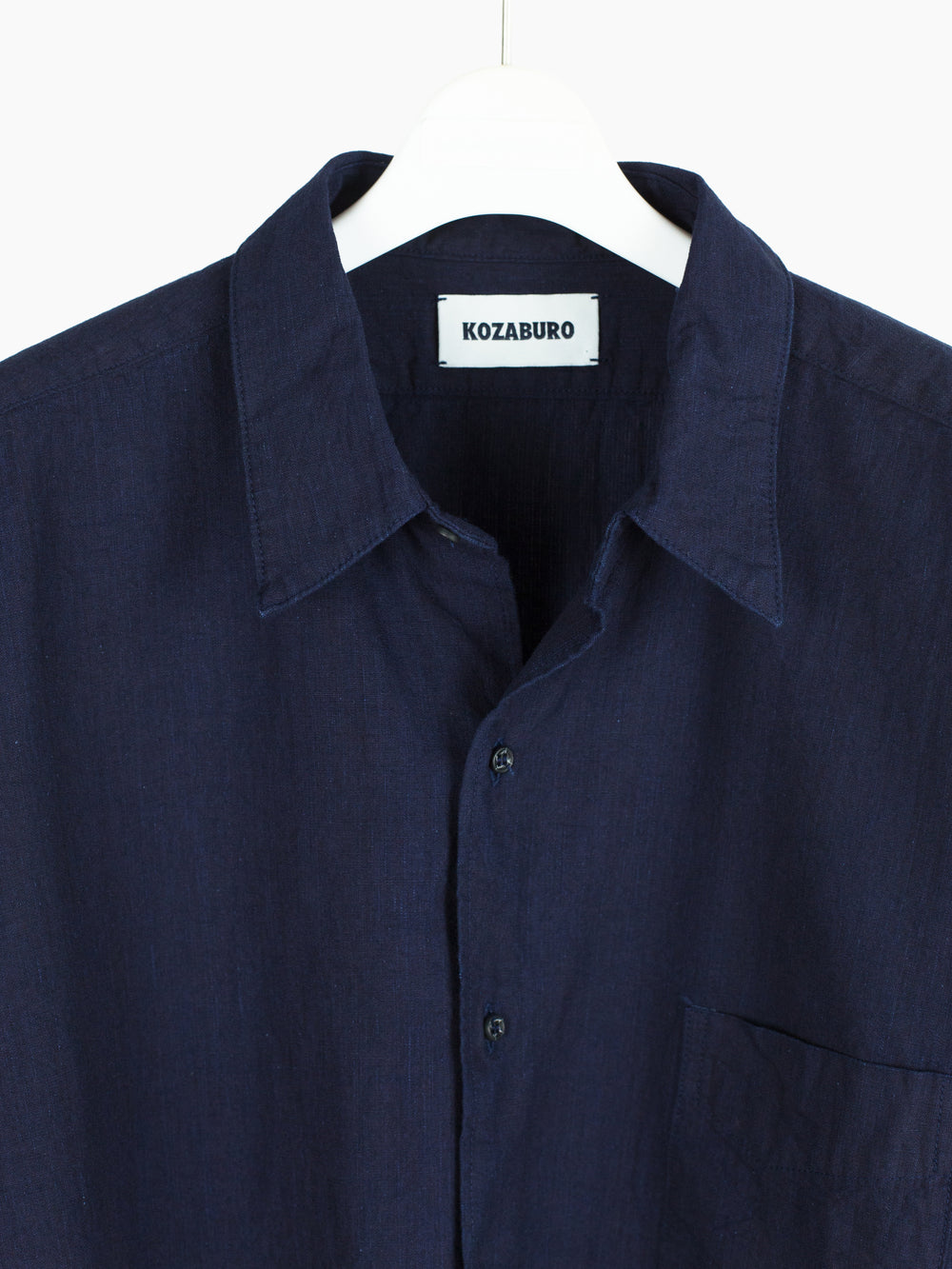 Classic button-down shirt, cut in the lightweight iteration of this season's indigo plainweave cotton. It has a beautiful open woven texture that reads almost like a ramie or linen but with the crisp, dry hand of cotton. Not to mention, the indigo overdye brings a palpable richness and depth in color. Perfect showcase of the seasonal signature laser-etched graphic of a sun rising above mountains on the back as well as Kozaburo signature cracked buttons. Features mid-sized point collar, ruched yoke, and barrel cuffs.