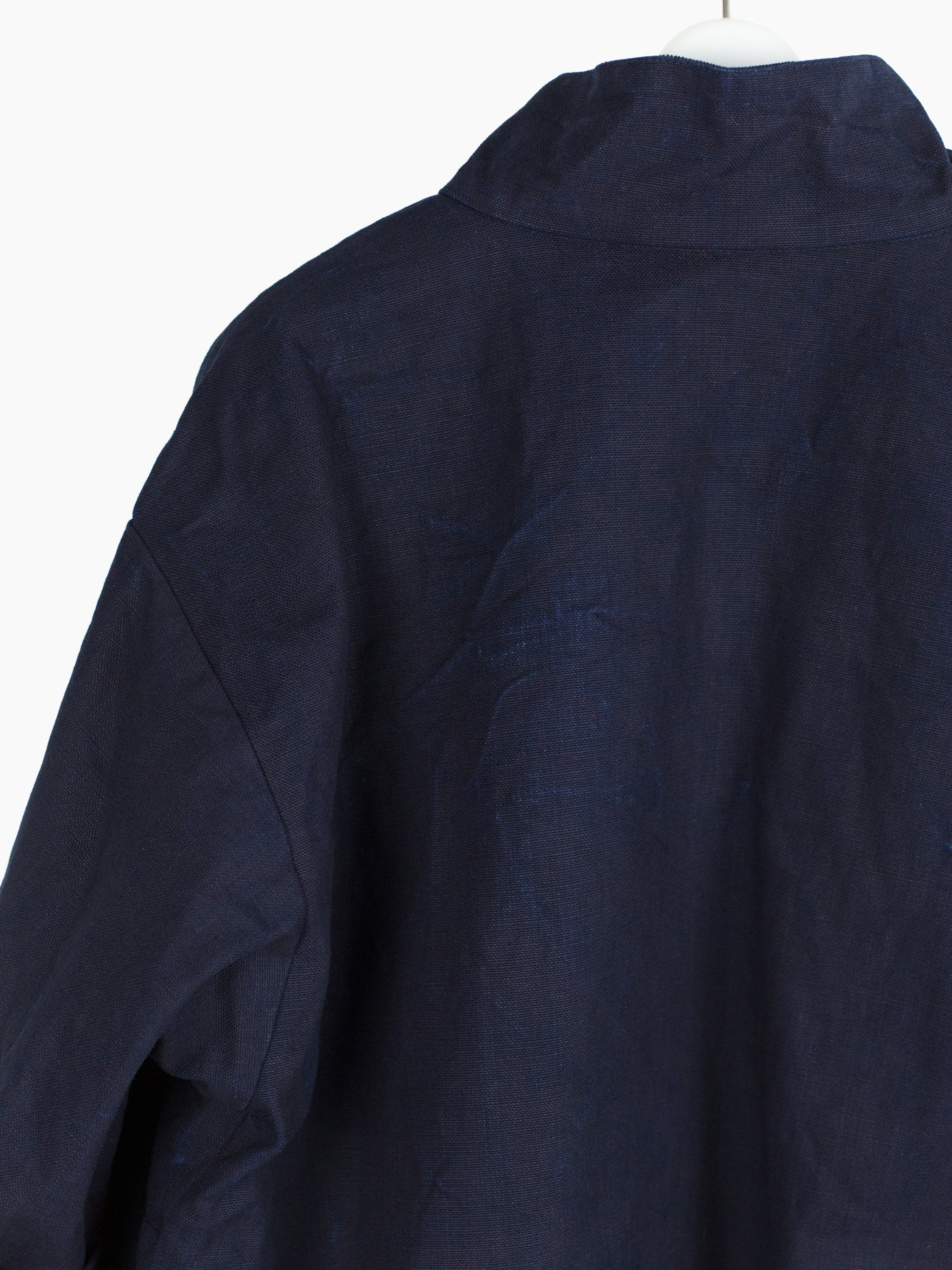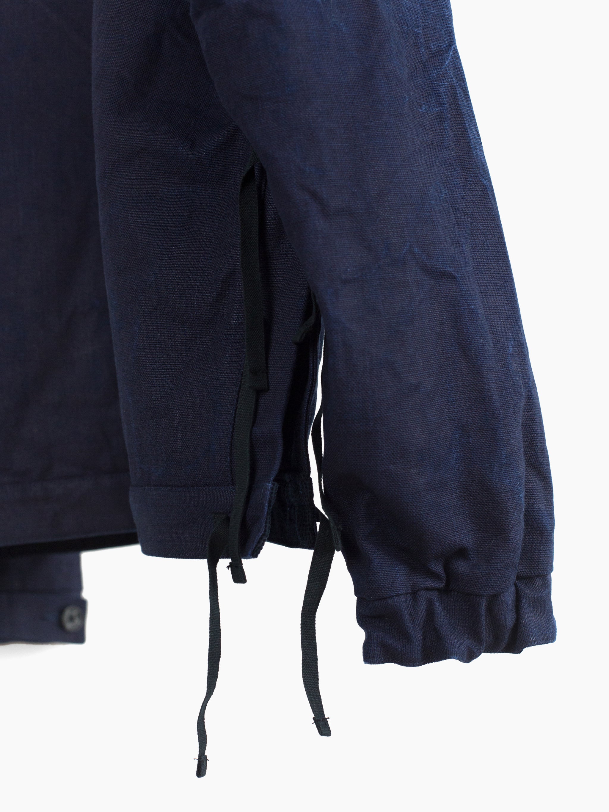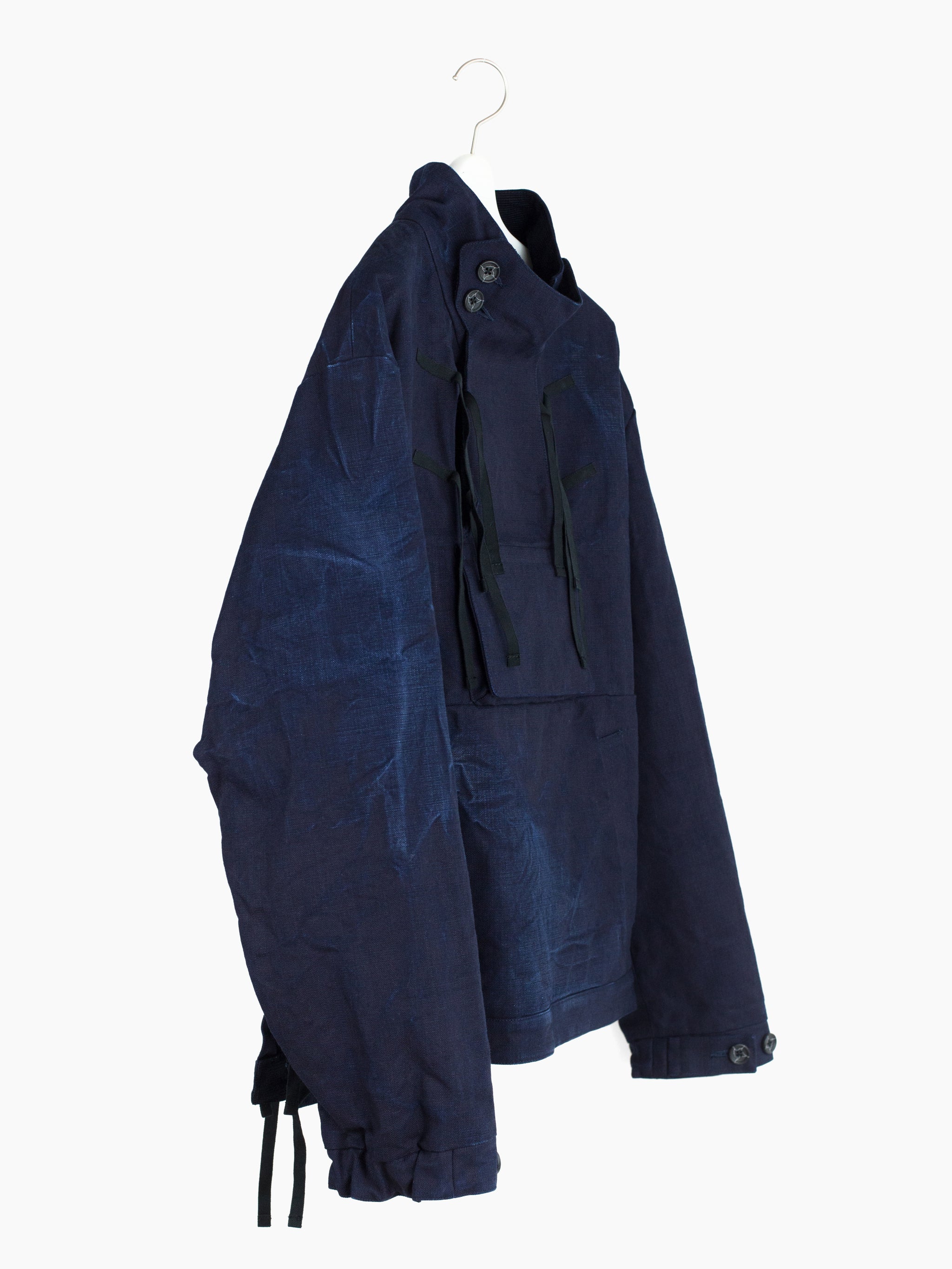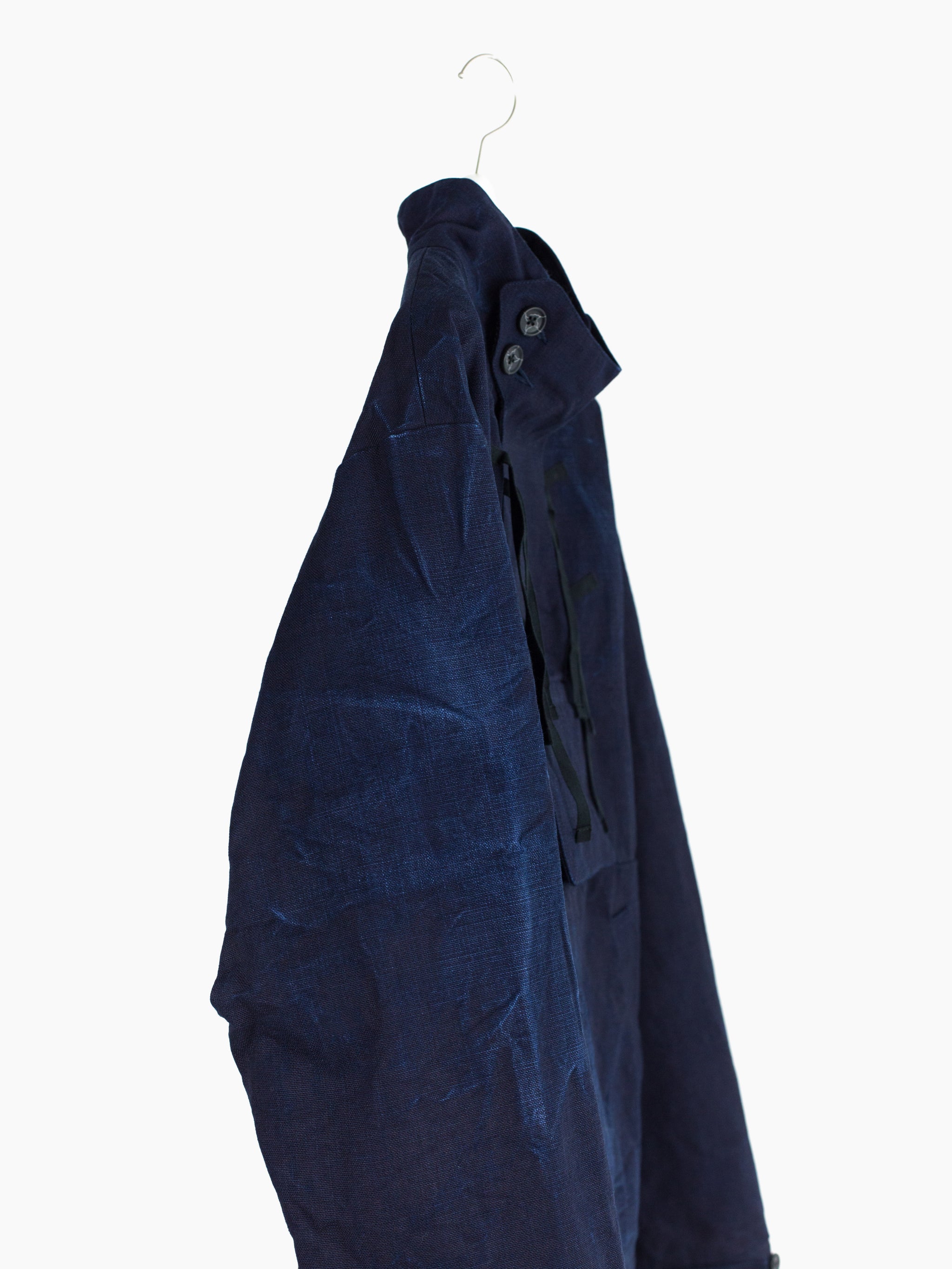 The monk jacket, originally introduced in AW20, returns in this season's heavy indigo plainweave. Irregularly overdyed with several lighter areas, it encapsulates Kozaburo's exploration of the "beauty in imperfection," and shows how the highly textural cotton plainweave might look after it's been properly aged and worn in. Features center chest flap-closed stash pocket, kangaroo style front waist pocket, webbing tied and button-secured dual-opening collar, and single split side with webbing closure on the wearer's right side. Cuff is partially elasticated with additional strap and button cinch. Finished with mini-quilted lining and black waffle cotton trim at the hem.