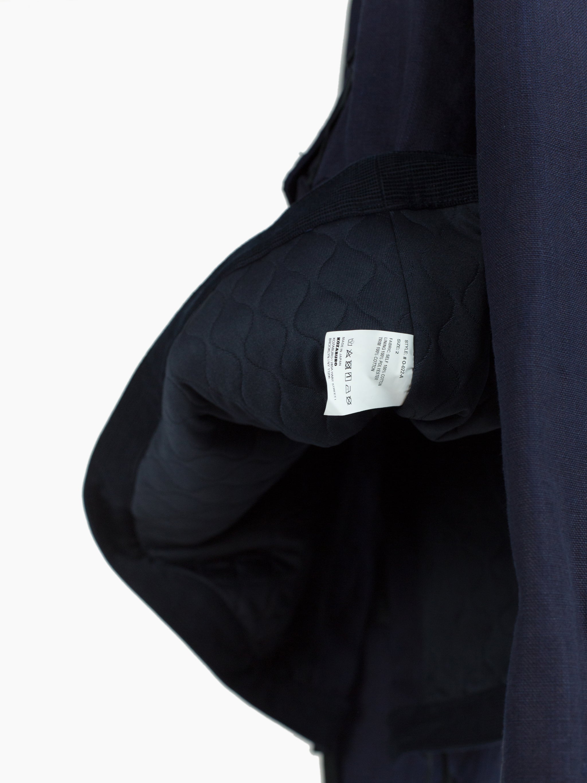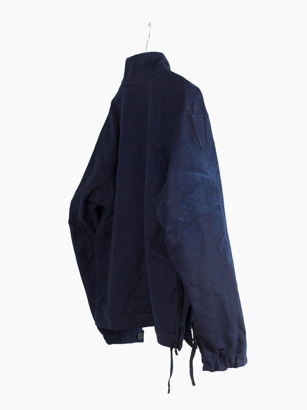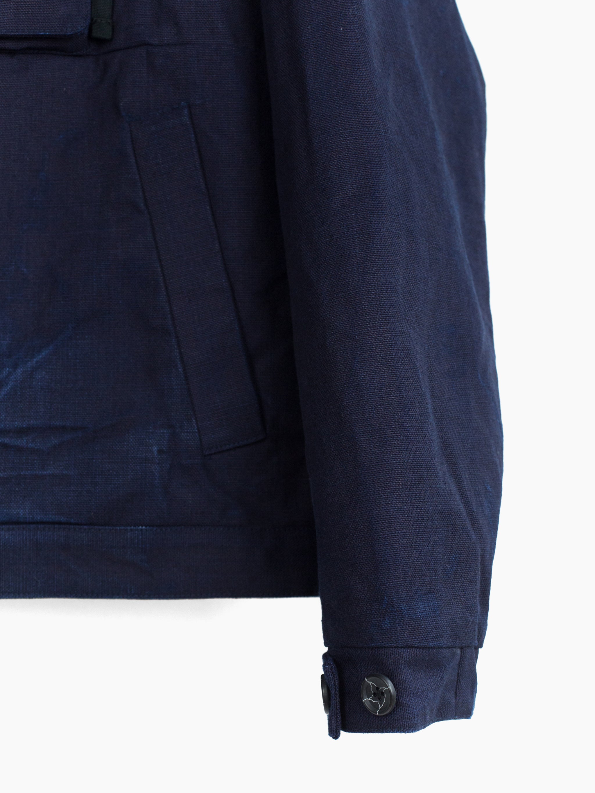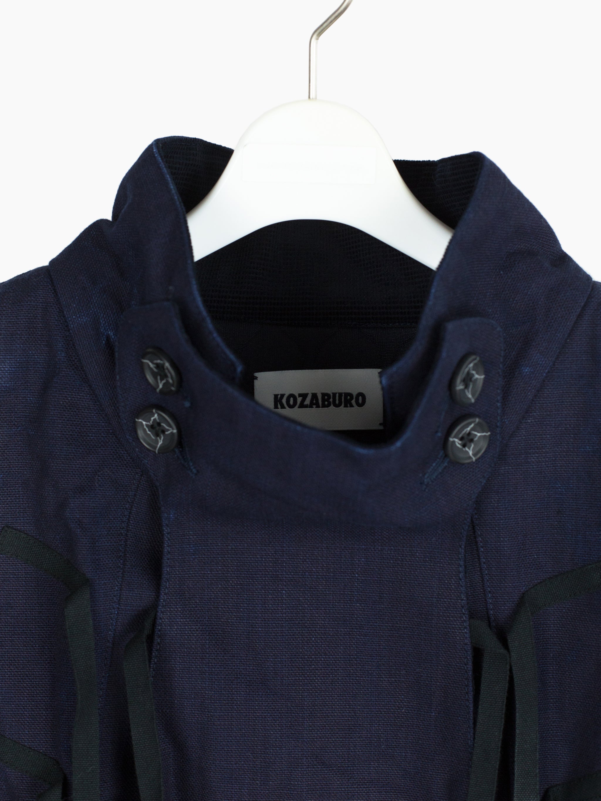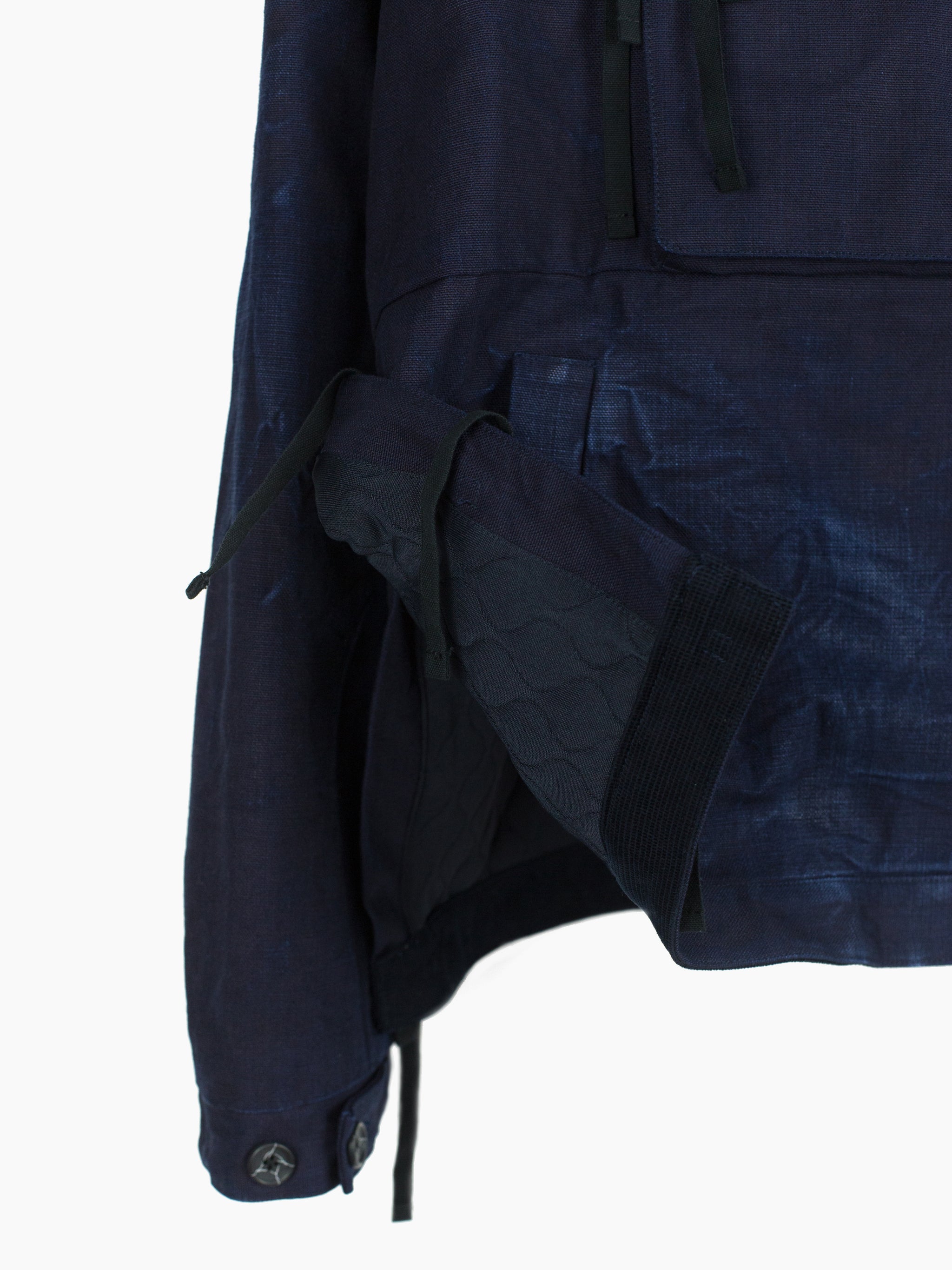 The monk jacket, originally introduced in AW20, returns in this season's heavy indigo plainweave. Irregularly overdyed with several lighter areas, it encapsulates Kozaburo's exploration of the "beauty in imperfection," and shows how the highly textural cotton plainweave might look after it's been properly aged and worn in. Features center chest flap-closed stash pocket, kangaroo style front waist pocket, webbing tied and button-secured dual-opening collar, and single split side with webbing closure on the wearer's right side. Cuff is partially elasticated with additional strap and button cinch. Finished with mini-quilted lining and black waffle cotton trim at the hem.