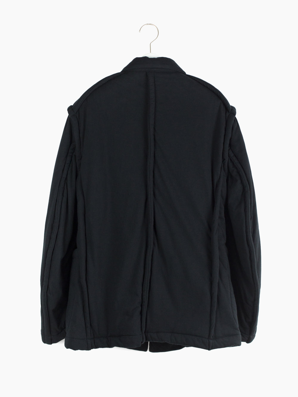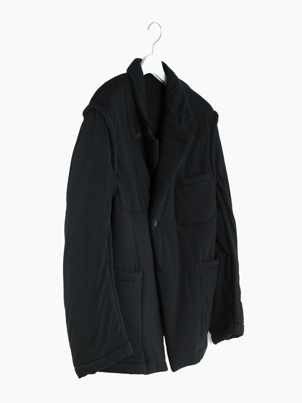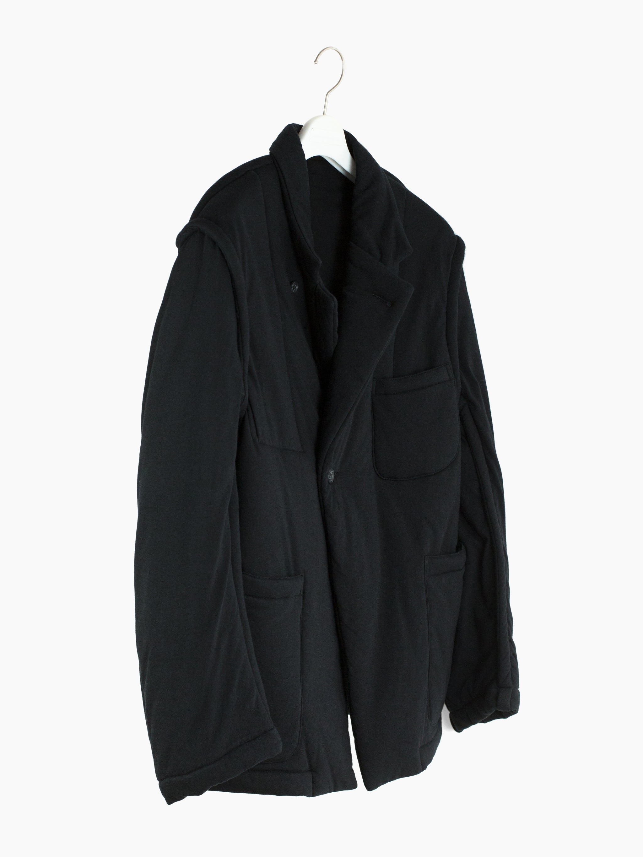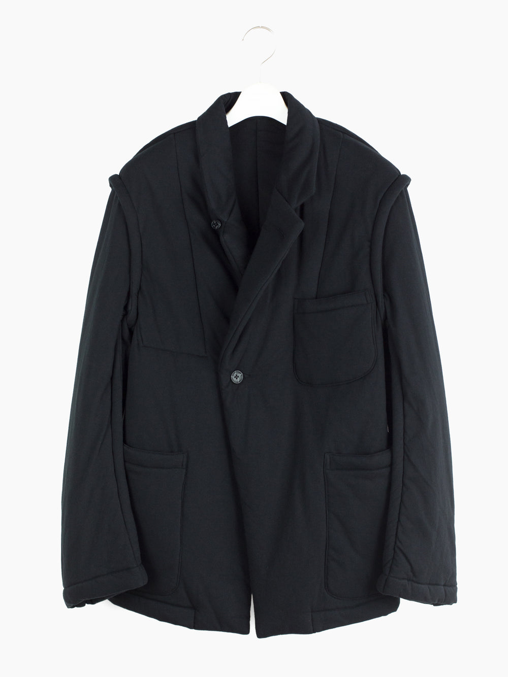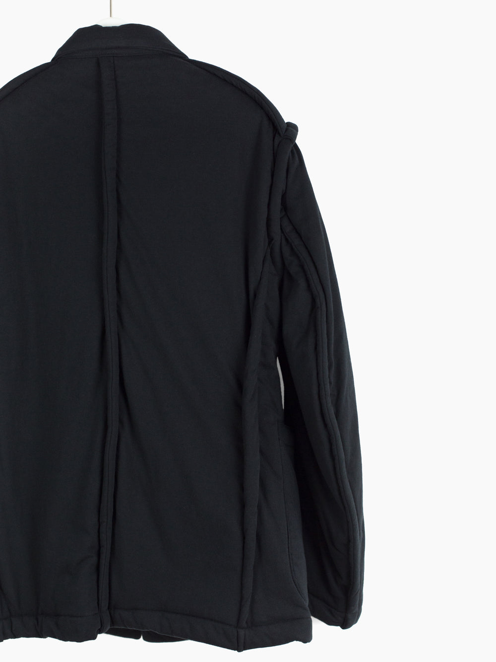 The Semi double suit jacket features a button stance that's halfway between single and double-breasted, a slightly offset closure that brings an air of nonchalance and an interesting twist of formality. It was first introduced in SS21 and here returns in the season's padded jersey, which is a layer of polyester insulation sandwiched between two layers of cotton jersey. The result is a casual suit jacket that feels like a blanket, clashing pajamas with tailoring for an all-in-all compelling garment. Seam allowances are reversed to keep bulk outside and creating sculptural linear details highlighting shape and construction. Sleeves are cut with a dramatic curve, hugging the sides and maintaining an amazingly sleek profile.