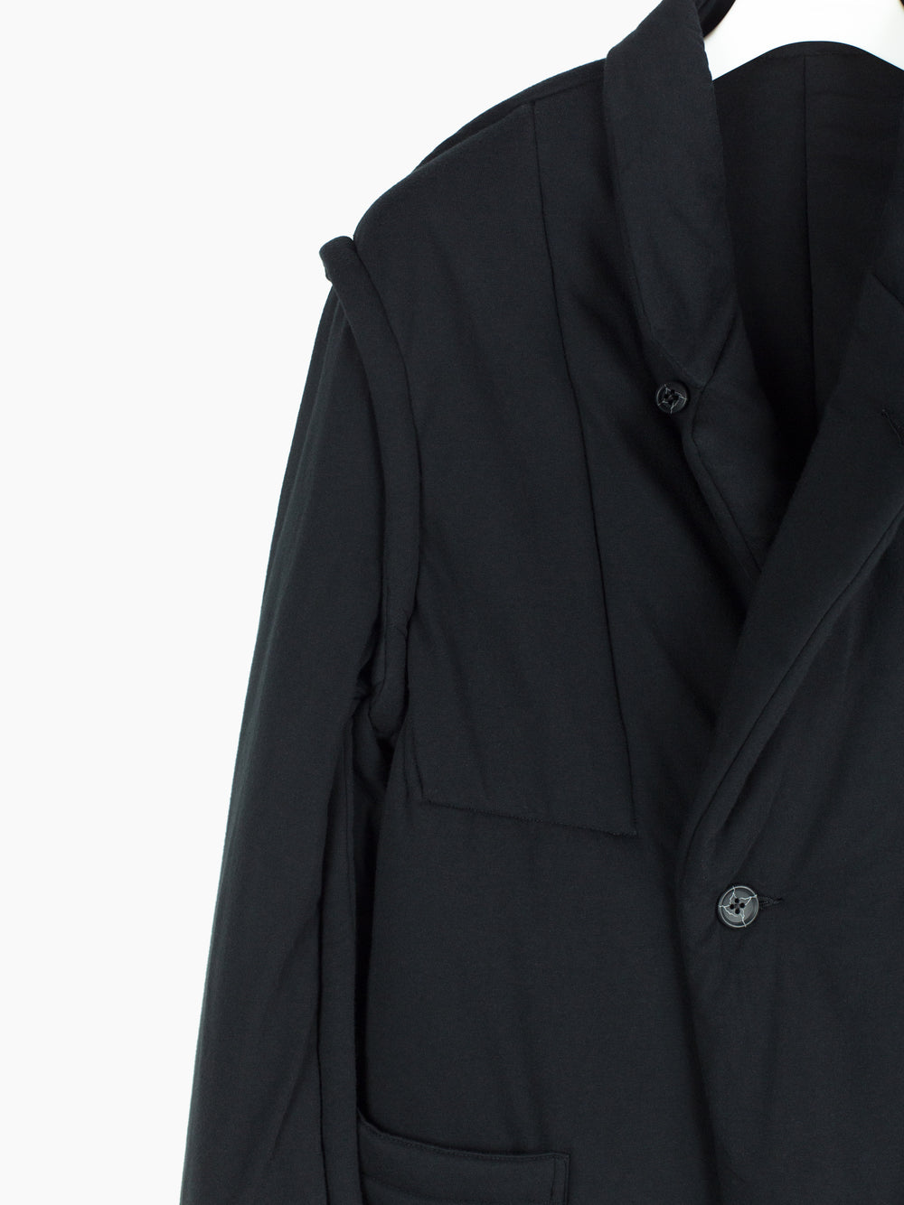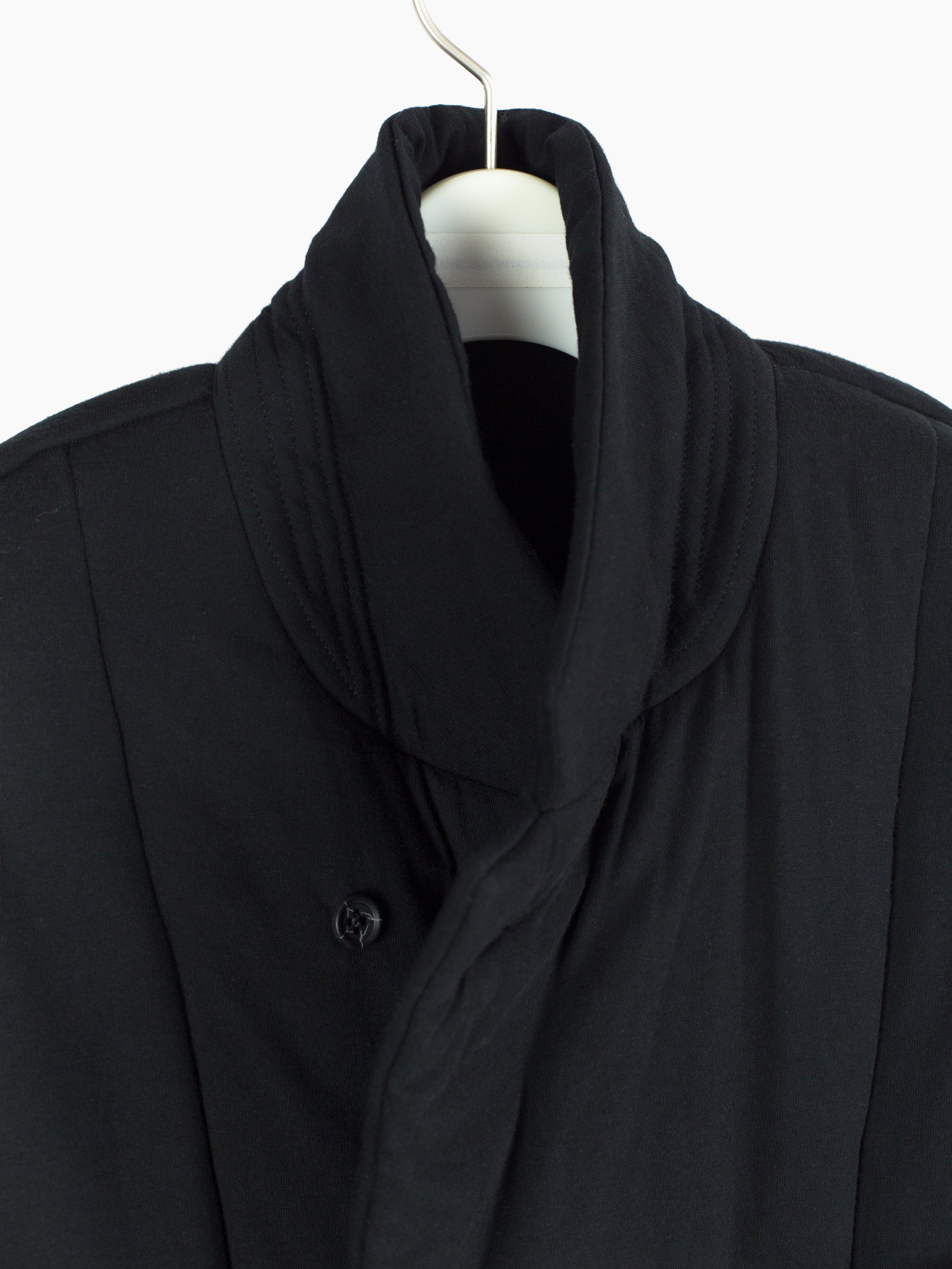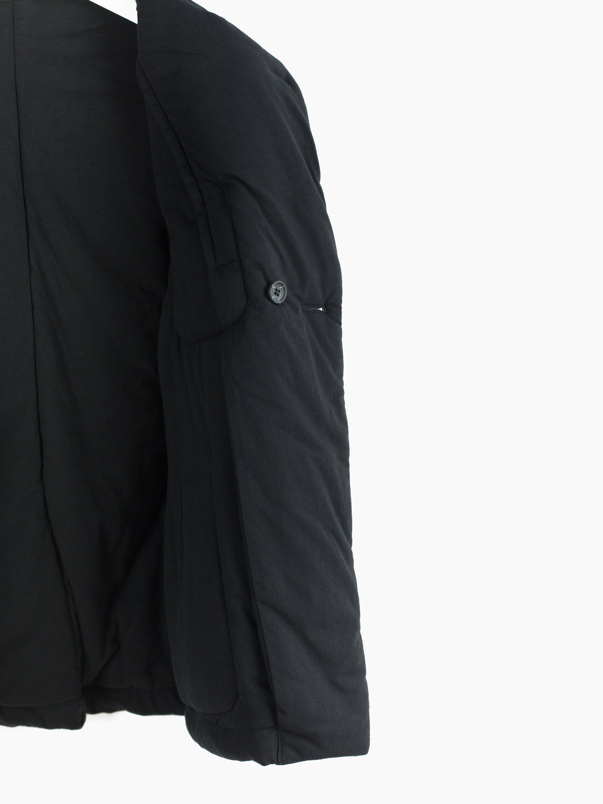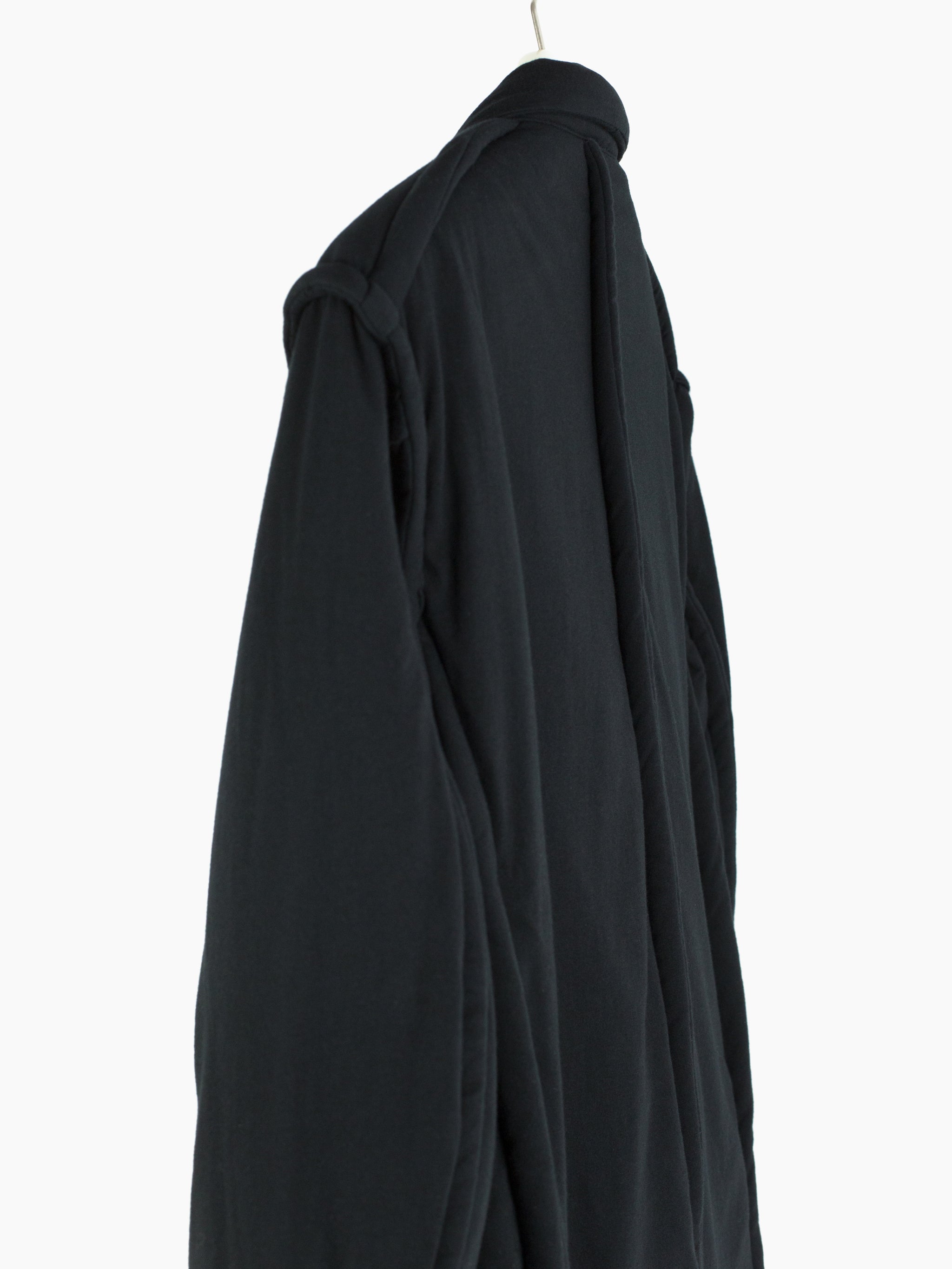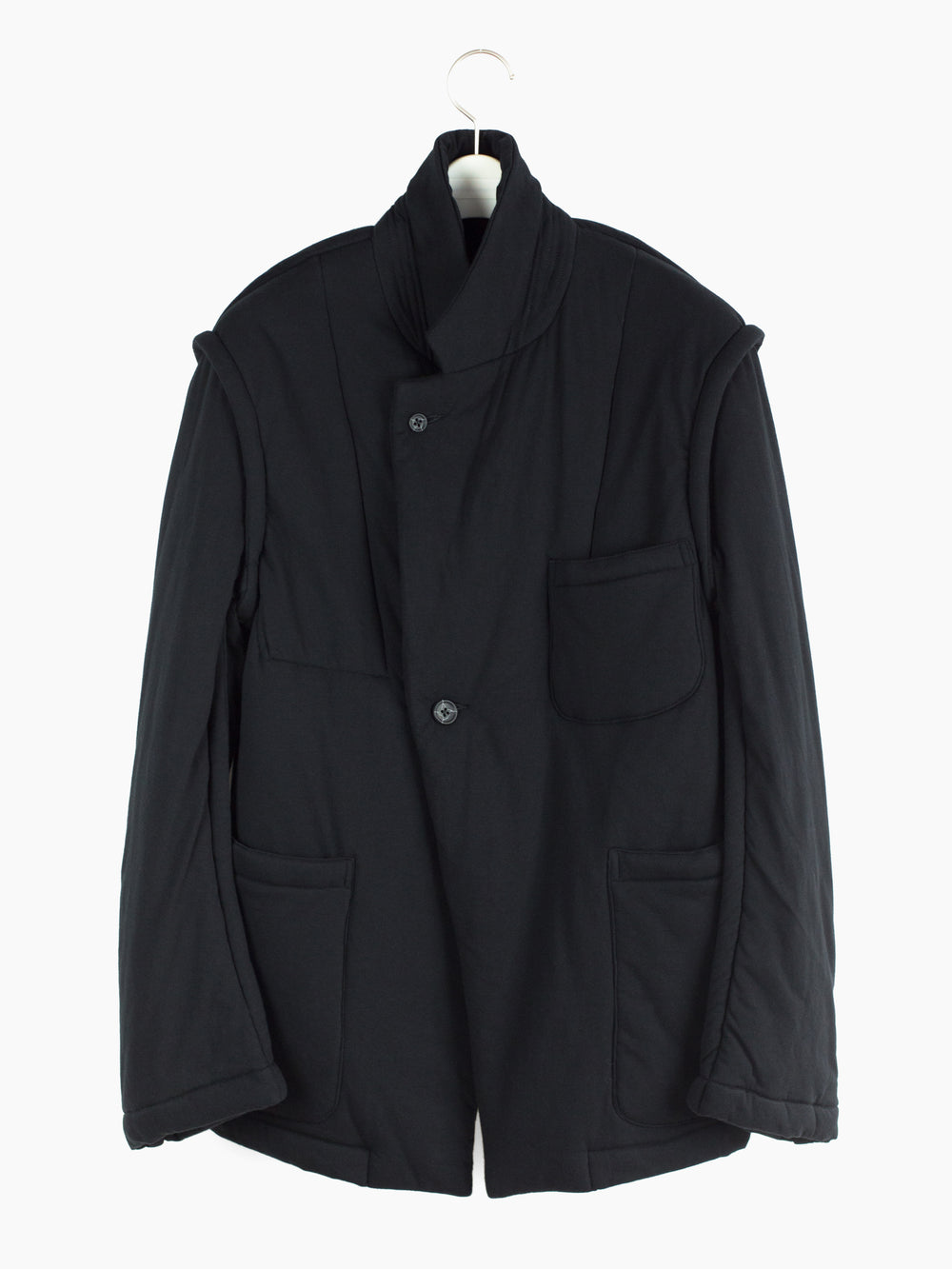 The Semi double suit jacket features a button stance that's halfway between single and double-breasted, a slightly offset closure that brings an air of nonchalance and an interesting twist of formality. It was first introduced in SS21 and here returns in the season's padded jersey, which is a layer of polyester insulation sandwiched between two layers of cotton jersey. The result is a casual suit jacket that feels like a blanket, clashing pajamas with tailoring for an all-in-all compelling garment. Seam allowances are reversed to keep bulk outside and creating sculptural linear details highlighting shape and construction. Sleeves are cut with a dramatic curve, hugging the sides and maintaining an amazingly sleek profile.