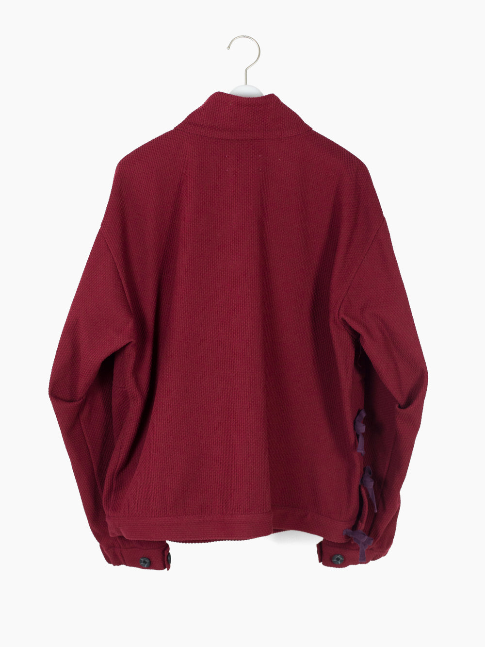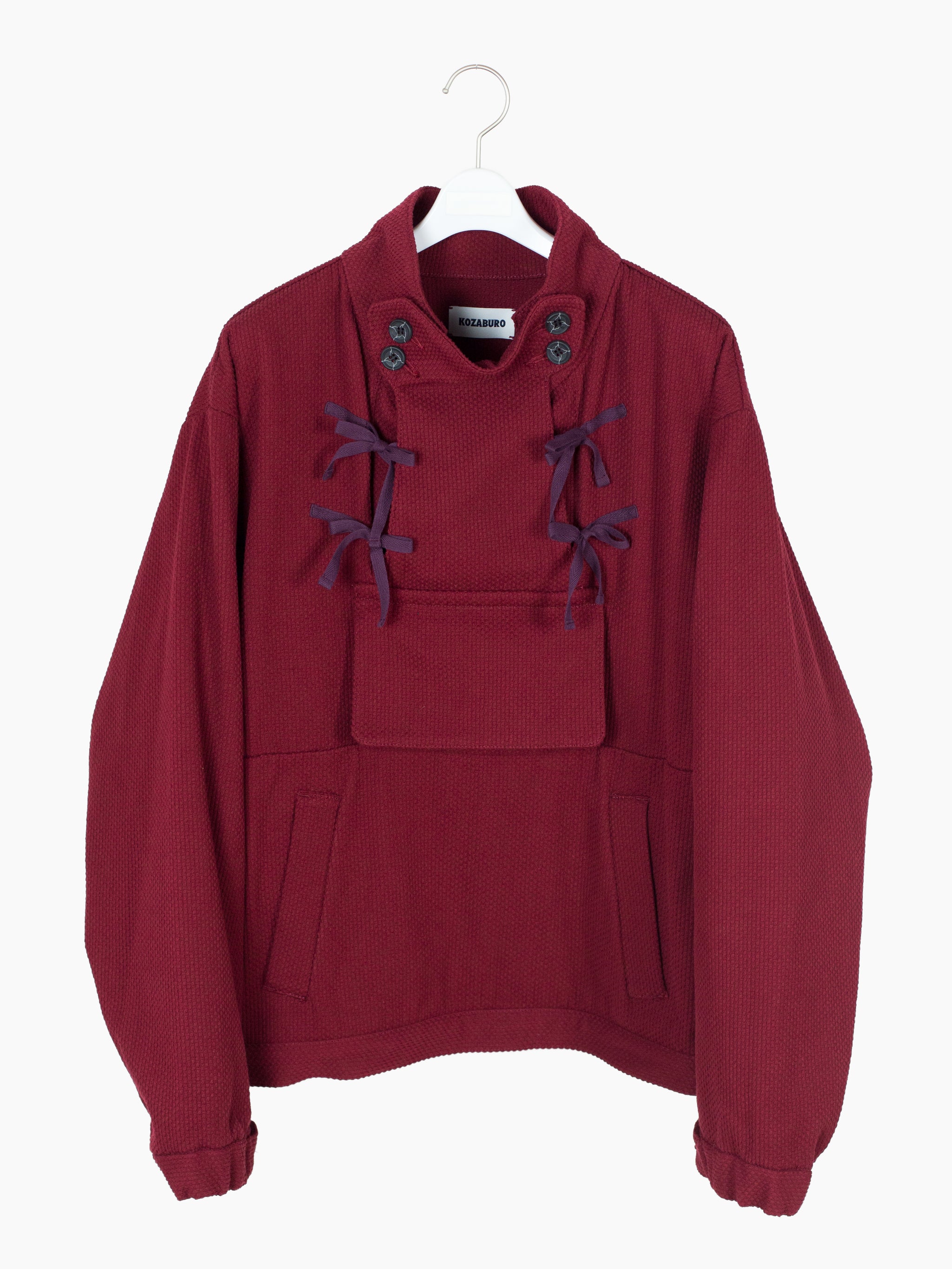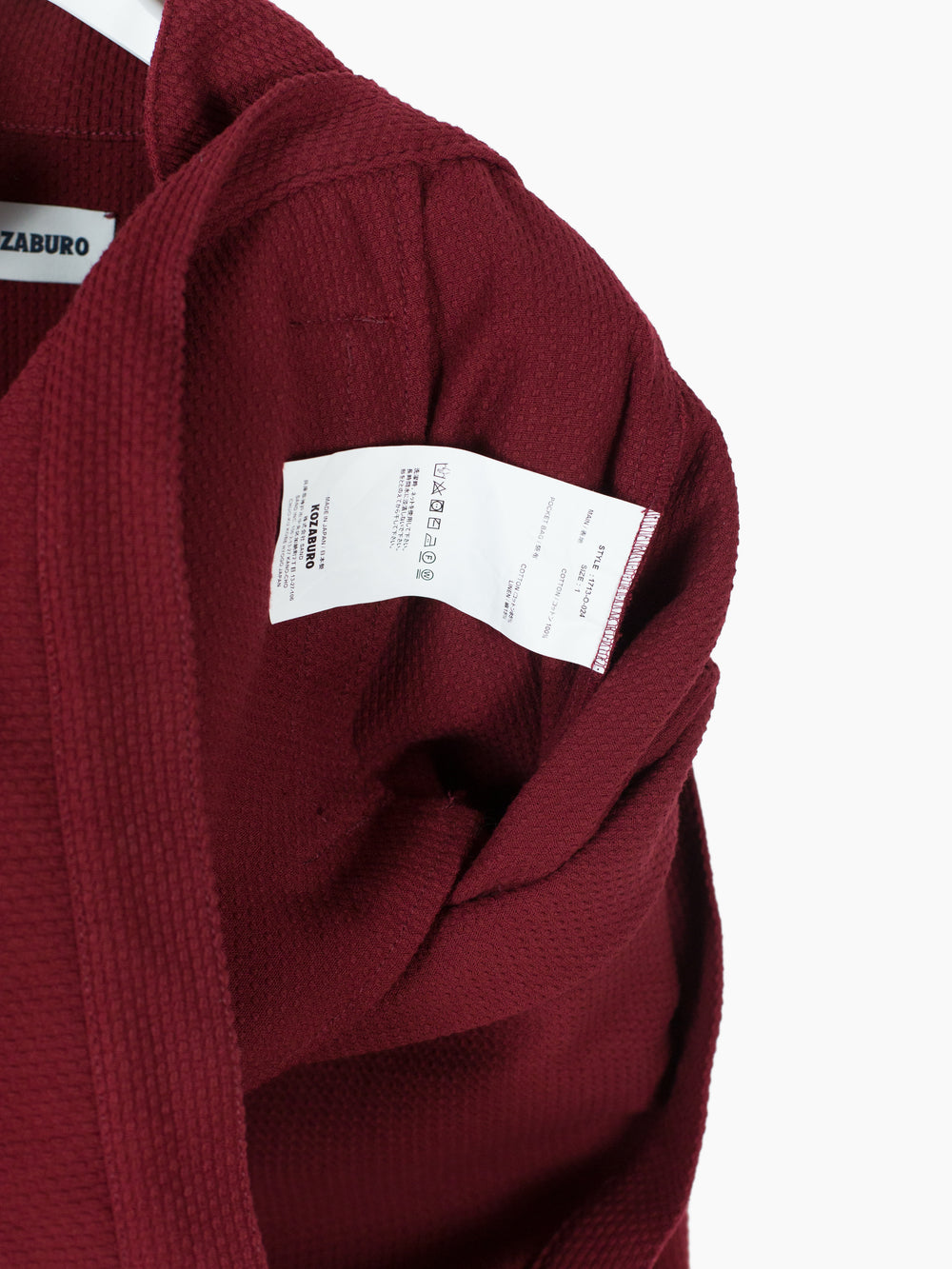 The monk jacket, originally introduced in AW20, returns in this season's monk's robe burgundy sashiko. Features center chest flap-closed stash pocket, kangaroo style front waist pocket, webbing tied and button-secured dual-opening collar, and single split side with webbing closure on the wearer's right side. Cuff is partially elasticated with additional strap and button cinch.