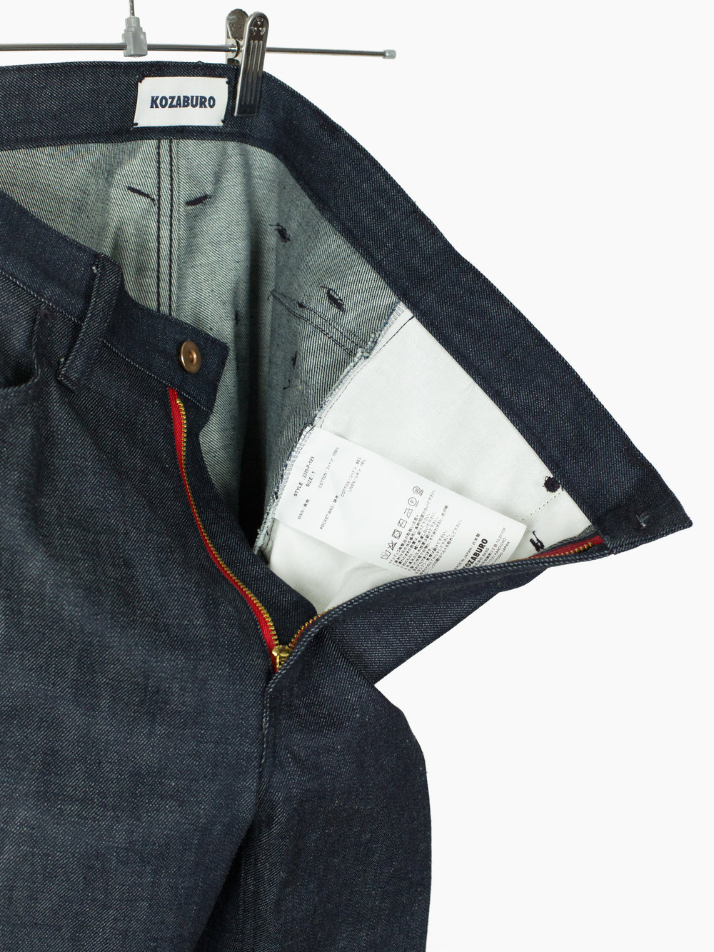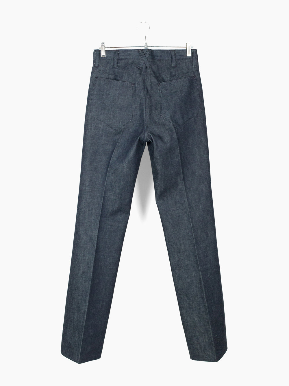 An augmented Wrangler Dress Jean, cut in mid-weight Japanese raw denim. Features stripped back Kozaburo adjustments--side-set back darts replacing a yoke, curved, organically shaped back pockets, copper shank waist button closure, contrast red tape zipper fly. Sewn circular bar tacks serve faux-rivet corner reinforcements. The cut is what speaks--balanced mid rise, perfectly fitted in seat and thighs, with the flared lower leg that creates what is an iconic and classic silhouette. All stitching is tonal for a minimalist, formal finish.