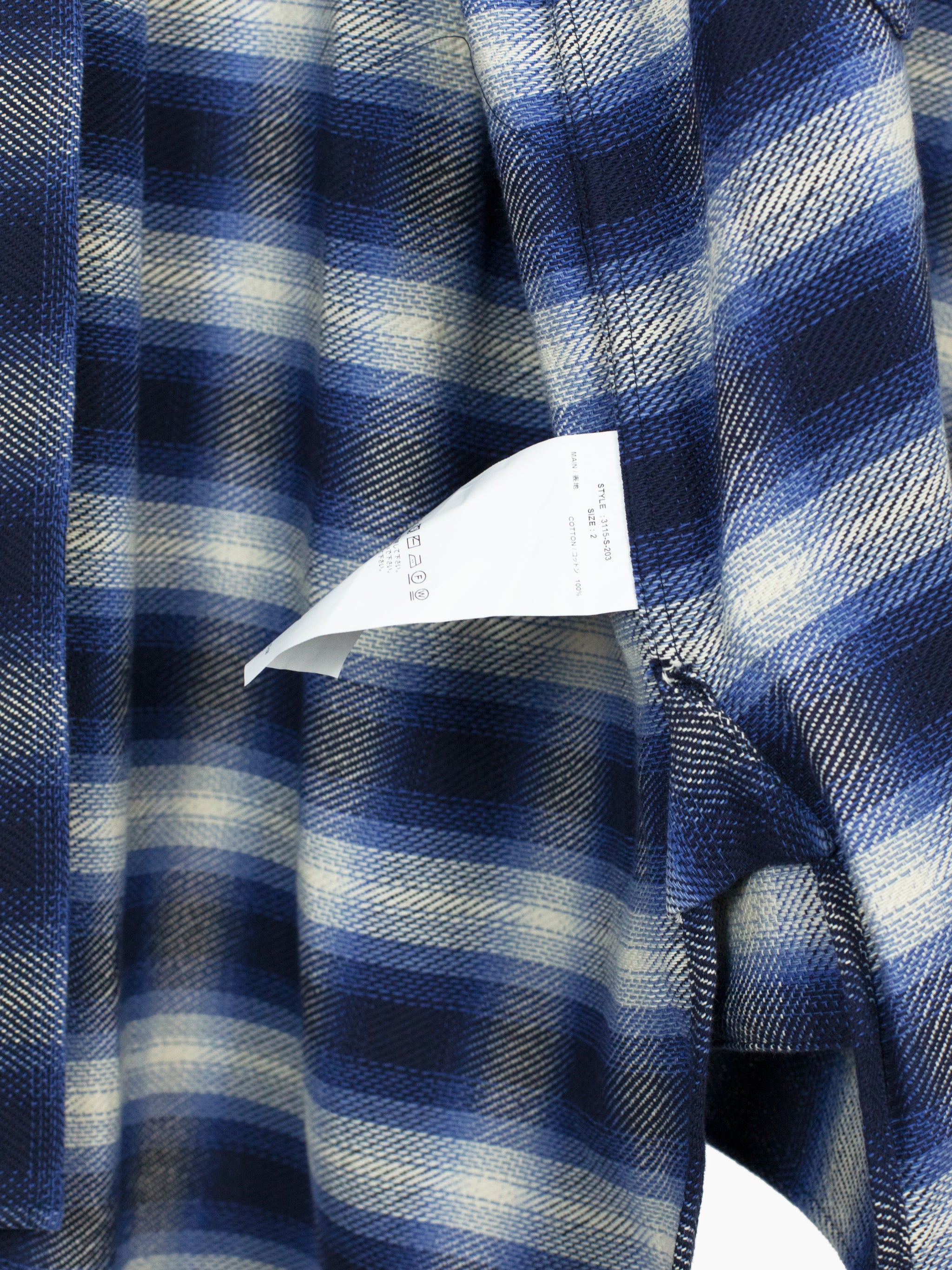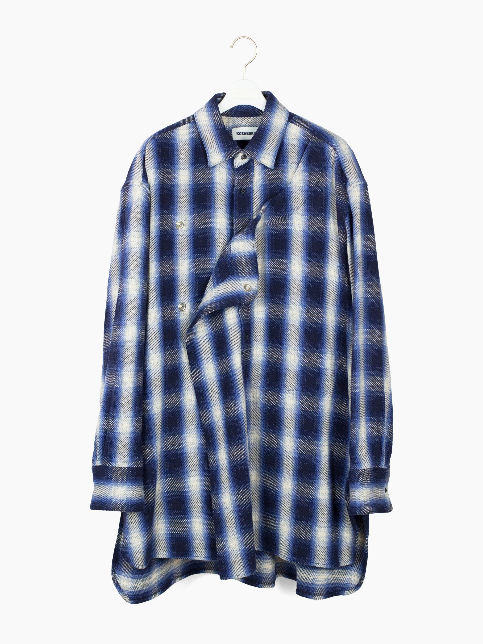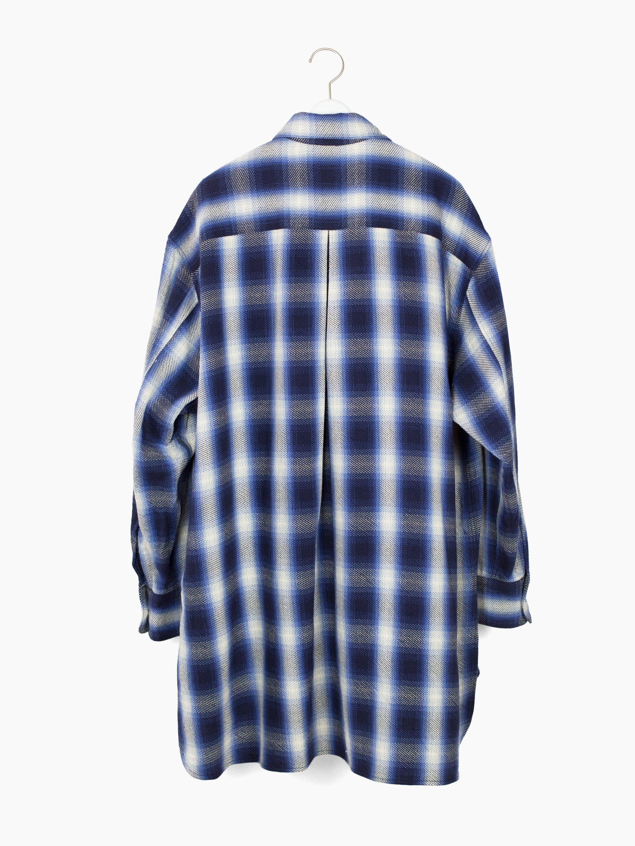 Longline flannel in blue shadow plaid with crossover double-breasted front that brings a hint of eastern monastic influence. Single Shirt-robe-dress hybrid that can be styled leveraging any of these individual archetypes as touchstone.