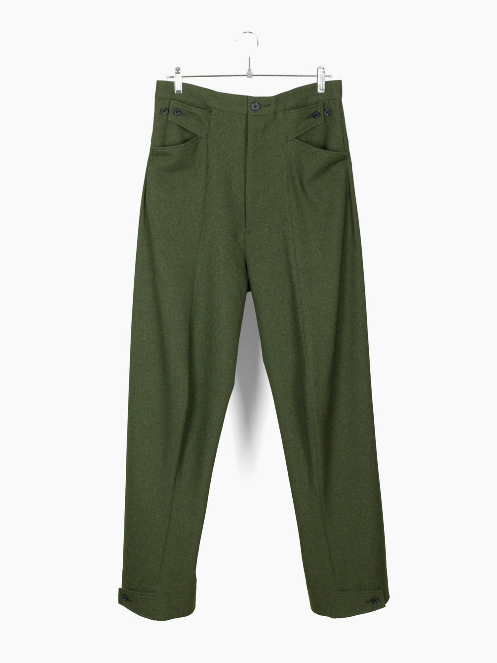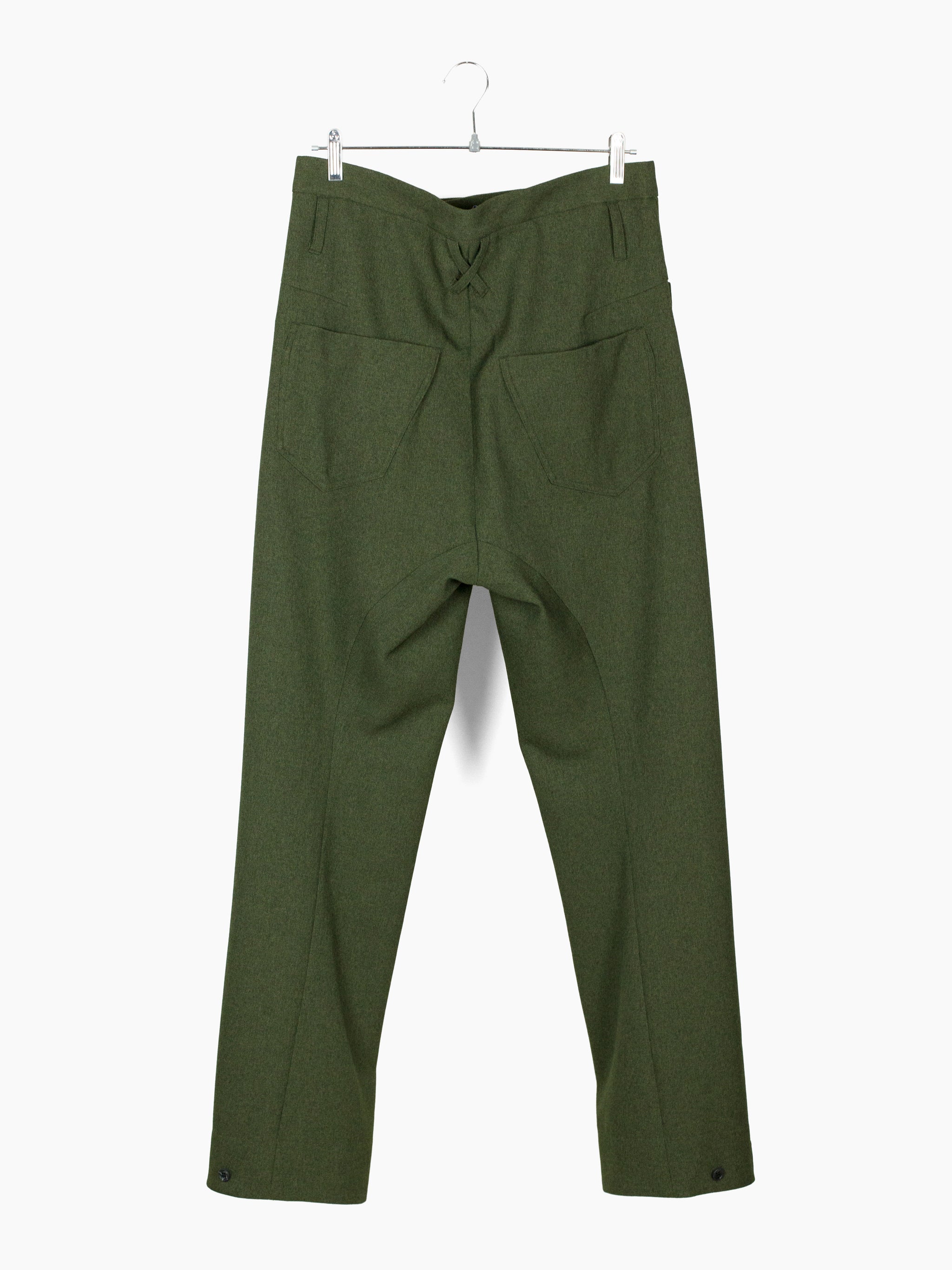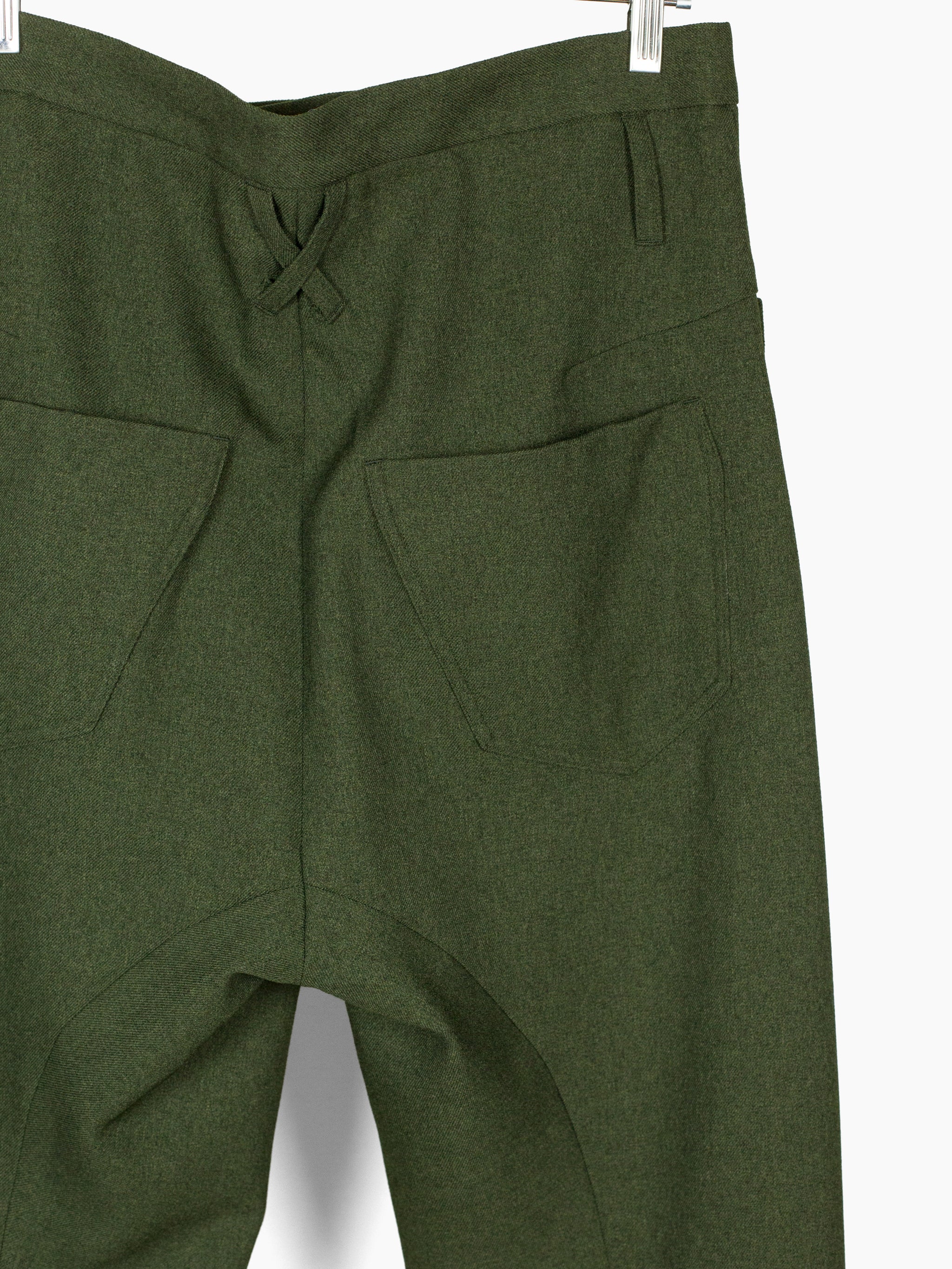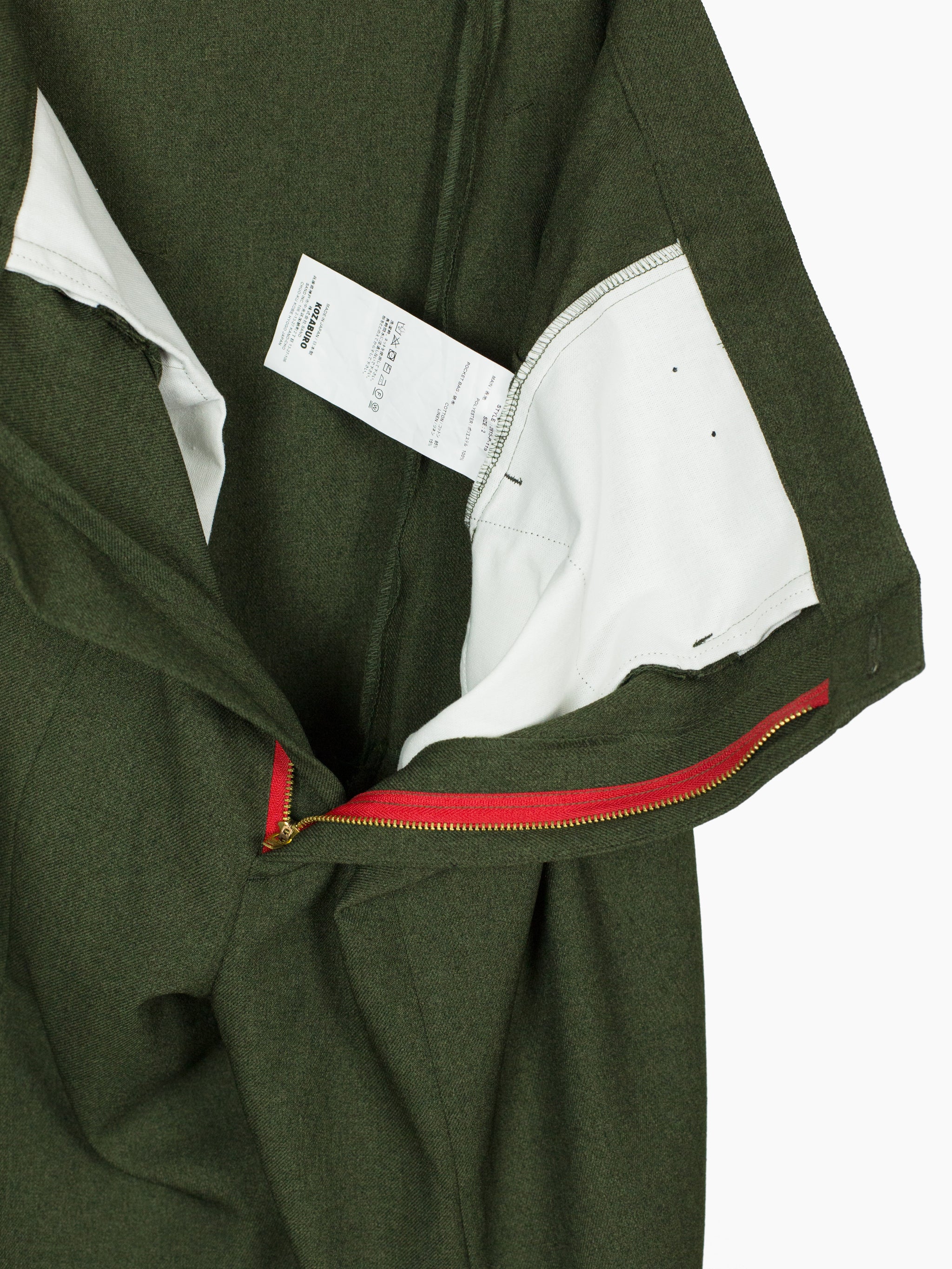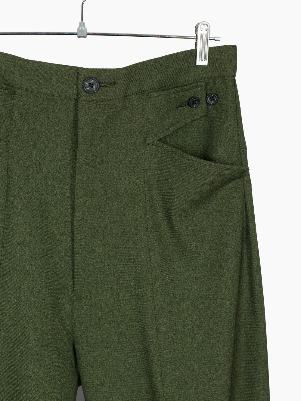 A modified version of the Kozaburo signature 3D Tailored trouser, cut with the same front seam, bent-knee construction. The Z-trouser has an extended and slightly slimmer leg for full coverage and sleeker silhouette in formal settings. Hem can be taken in further with tab and button cinch. Two frontal tabs allow for beltless waist adjustment (~2" difference). This season's poly twill has incredible color depth and a plush, supple handfeel with a fluid drape.