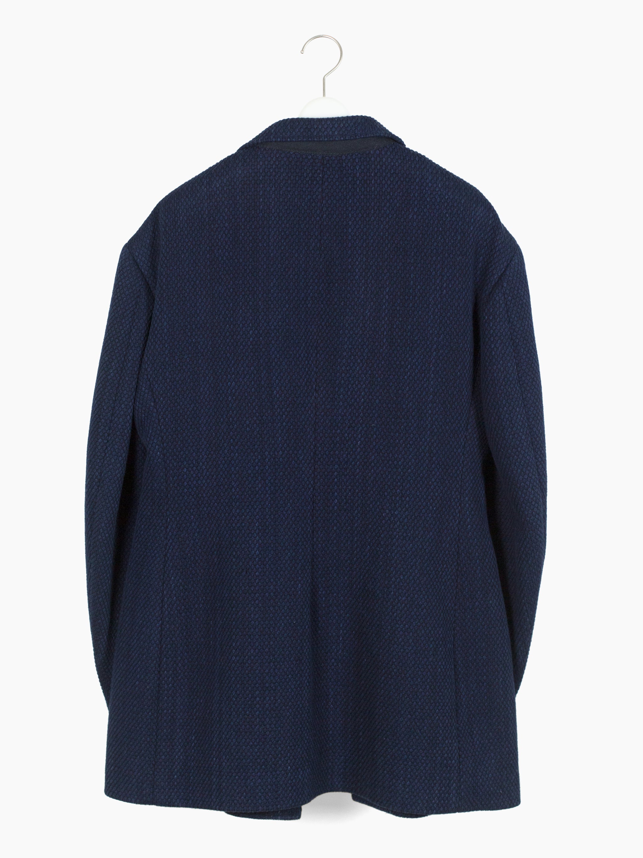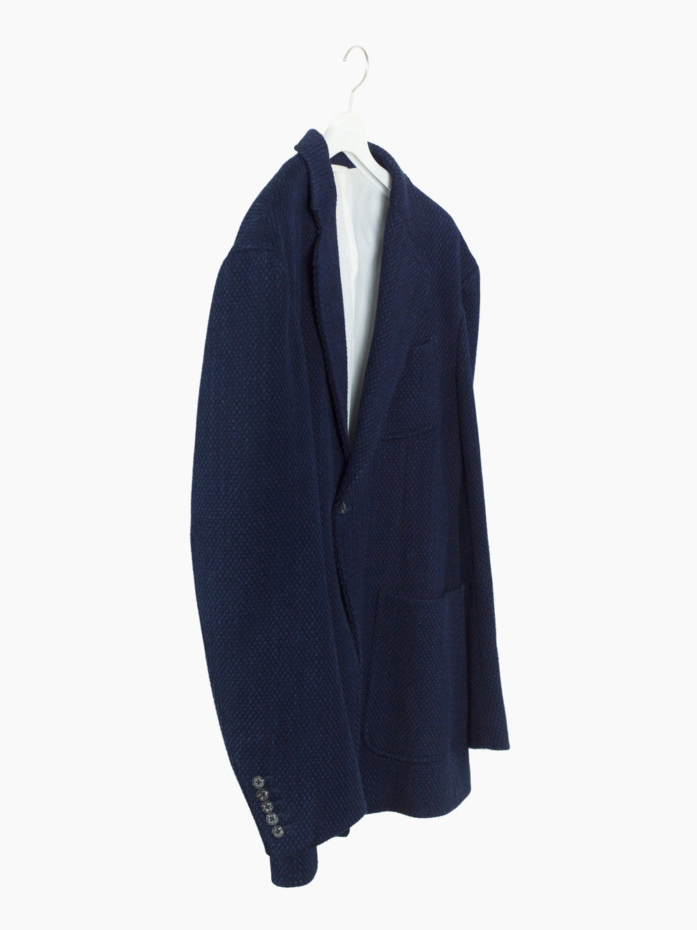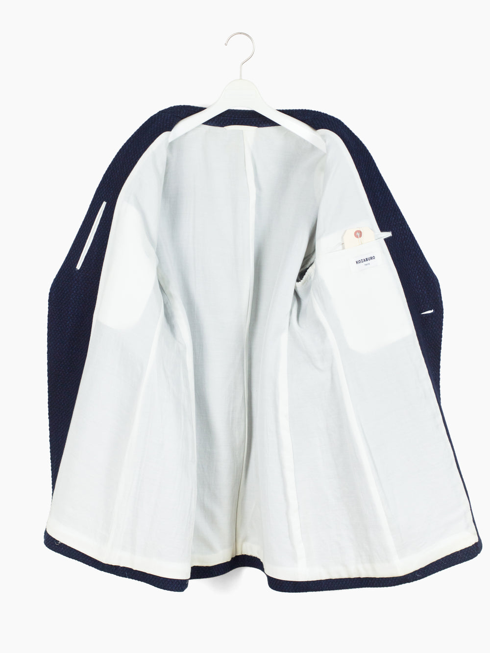 Sturdy Sashiko canvas makes up this classic tailored jacket from one of Kozaburo's earlierseasons. Its structure and texture are removed from their traditional utilitarian origins and remade into a luxurious suit jacket with expertpatterncutting at its fore. The piece combines sharp, broad, oversize shoulders with a dramatic nipped waist and sleeves that are cut extra long and extra curved, creating an elegantly sculptural silhouette.