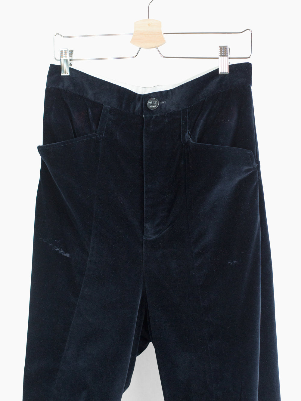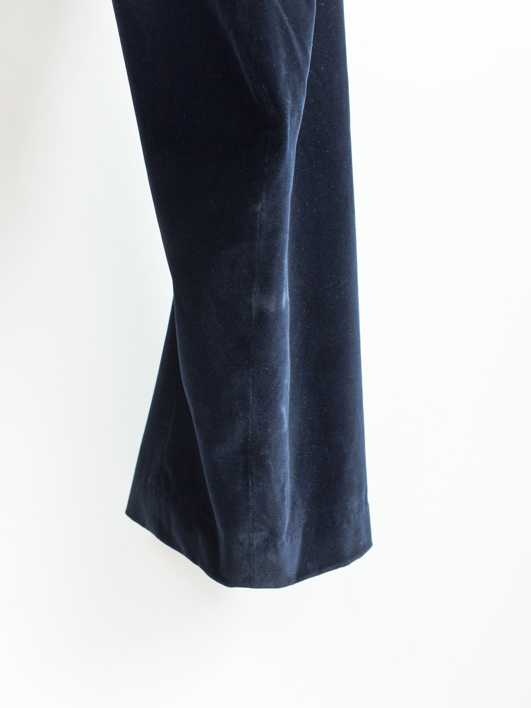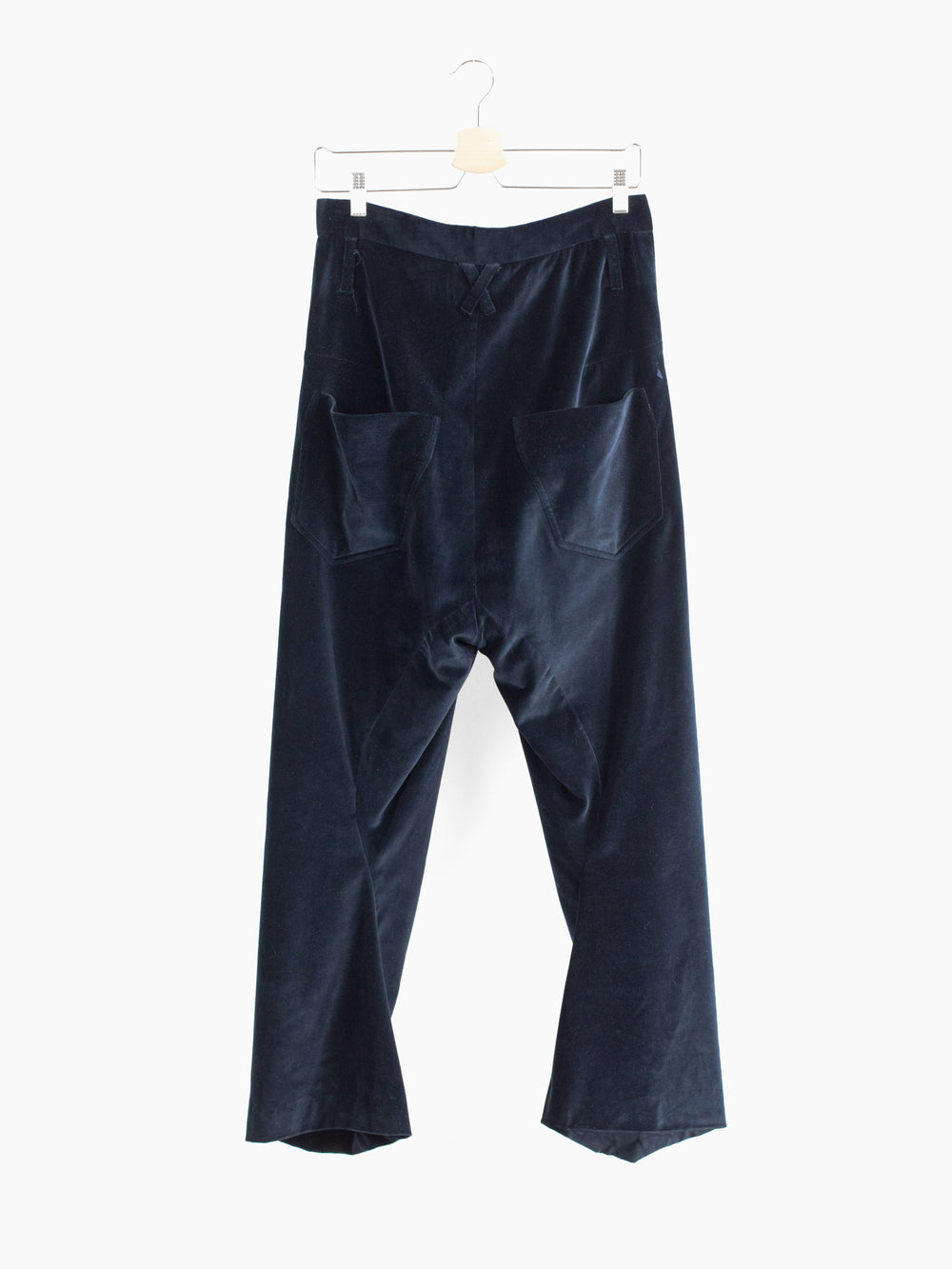 Finished with cupro lining from the waistband down to the calf, modified floating pocket entry, darted yoke, back patch pockets, dropped belt loops, and signature 'cracked' center button closure.