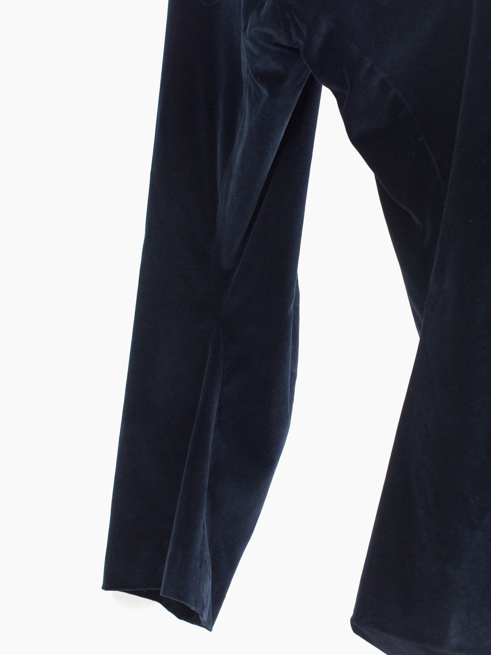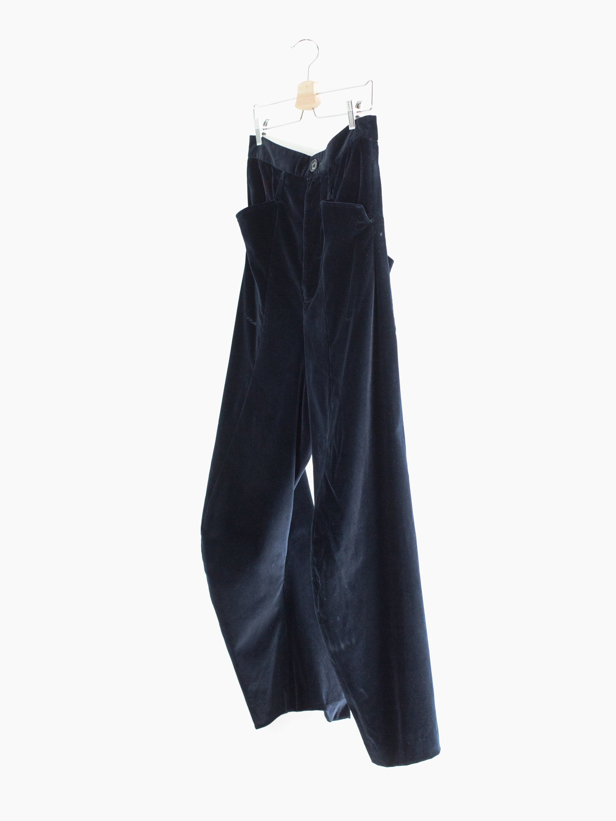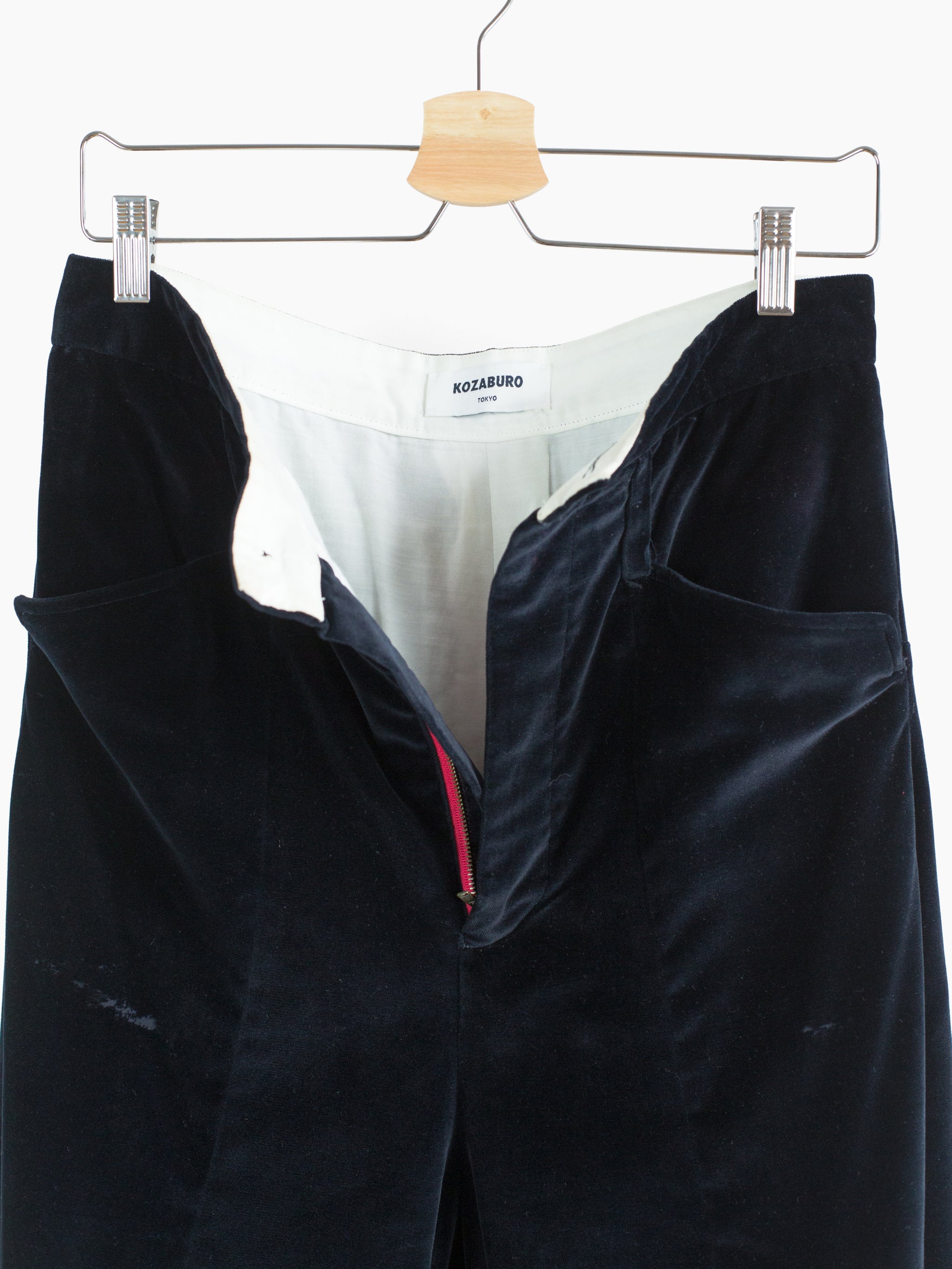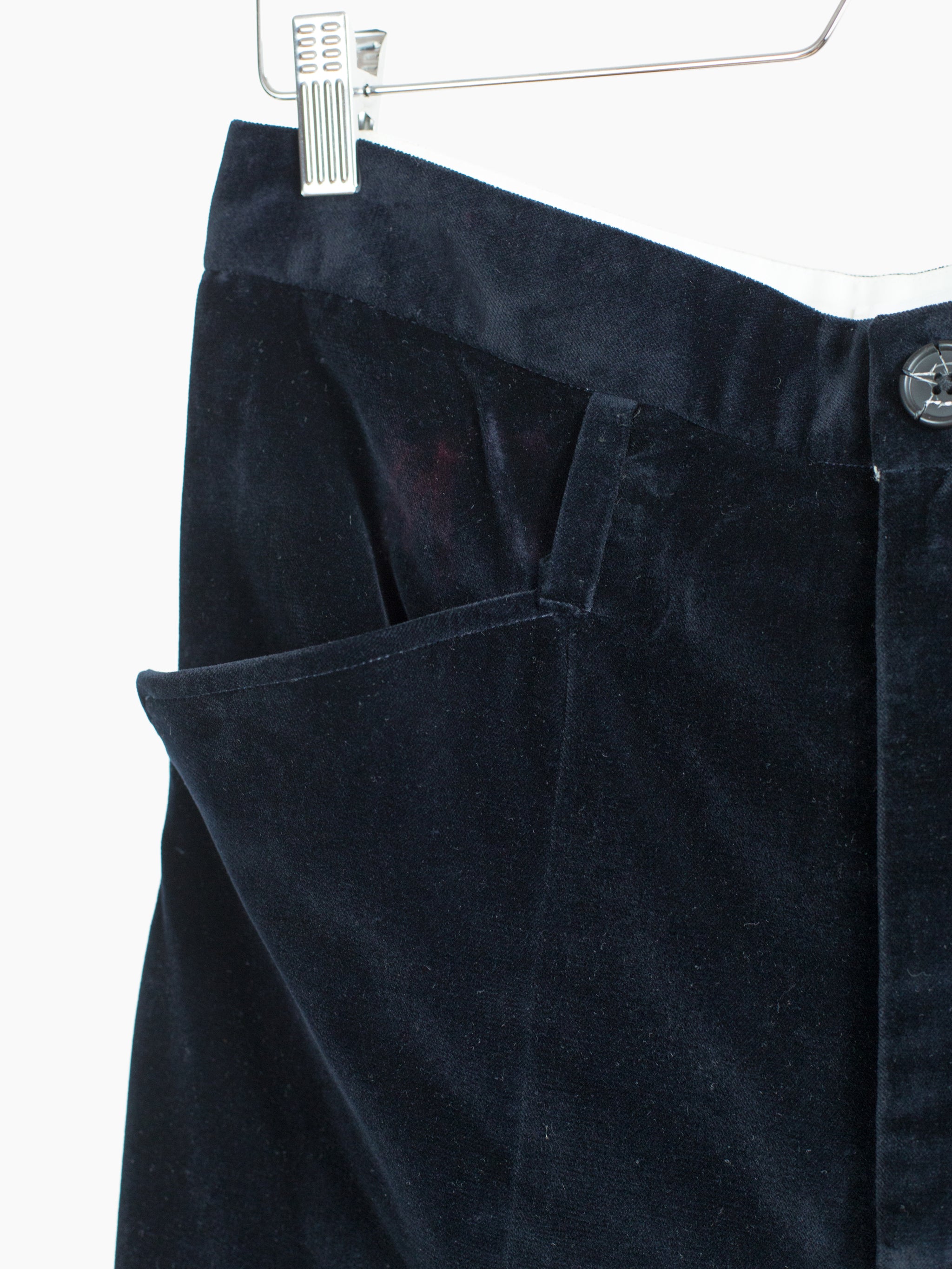 Kozaburo's take on a more formal/tailored pant, utilizing the same style of 3D curved panelling and anatomical articulation as the iconic 3D bootcut jeans. These 3D tailored trousers omit a traditional outseam and are cut with a curved center front seam that when viewed from the side creates a bent leg shape. The inseam is a snaking curve that shapes the lower leg into a canted flare. Compared to the short 3D bootcut, the legs are cut roomier and allow for a more draped, relaxed appearance while still demonstrating the cutting-edge 3D patternmaking and silhouette manipulation that Kozaburo is known for.