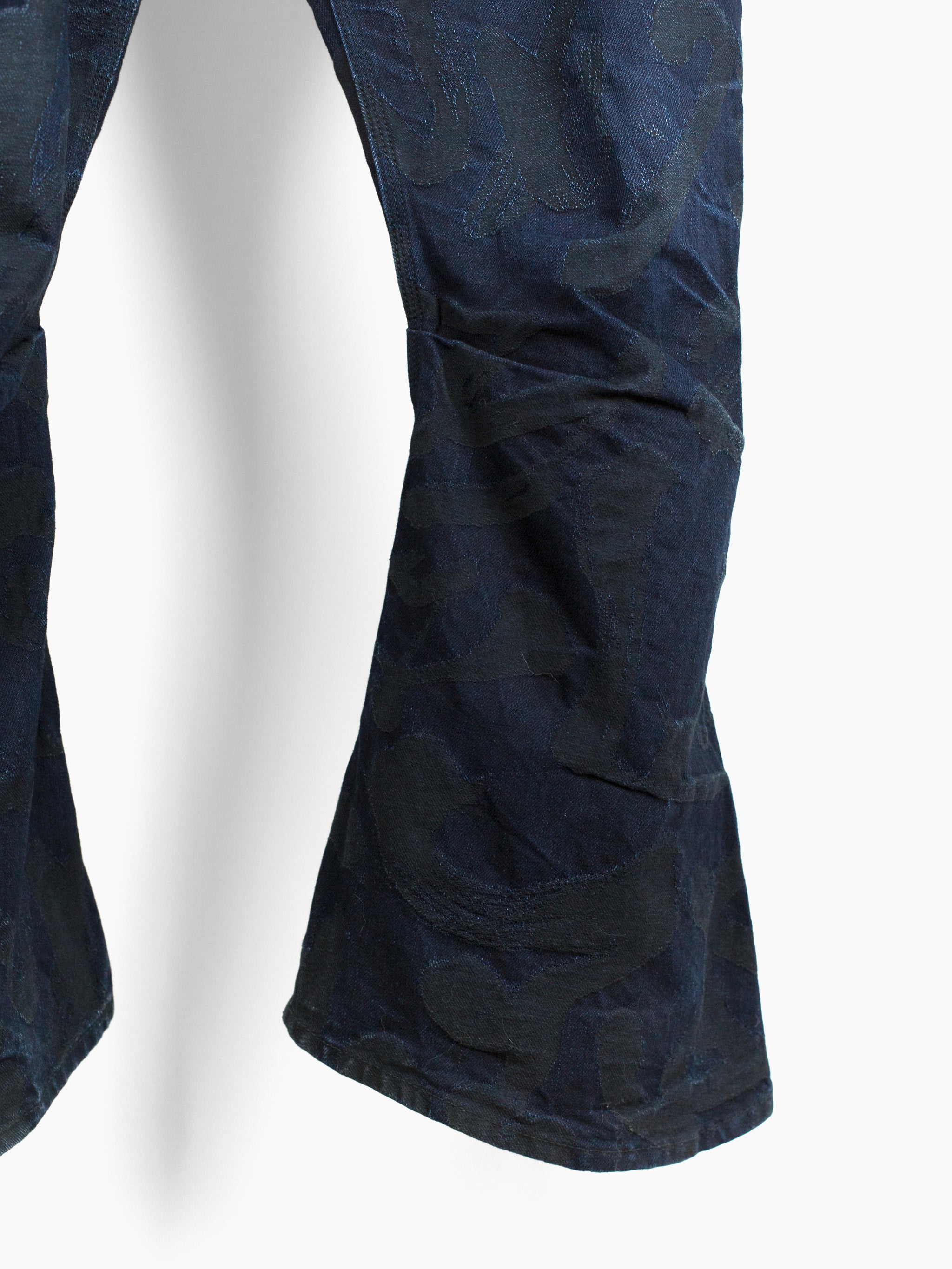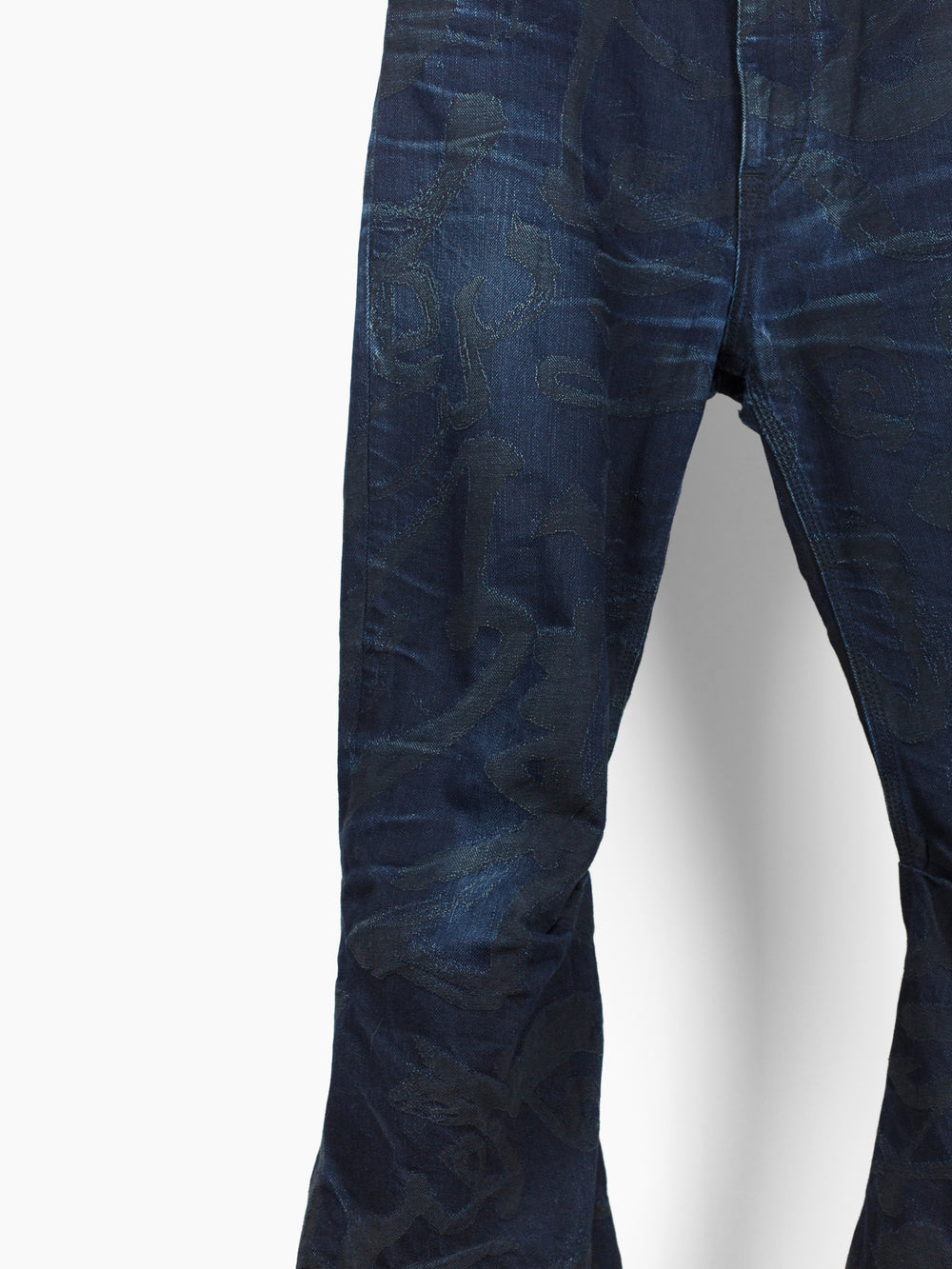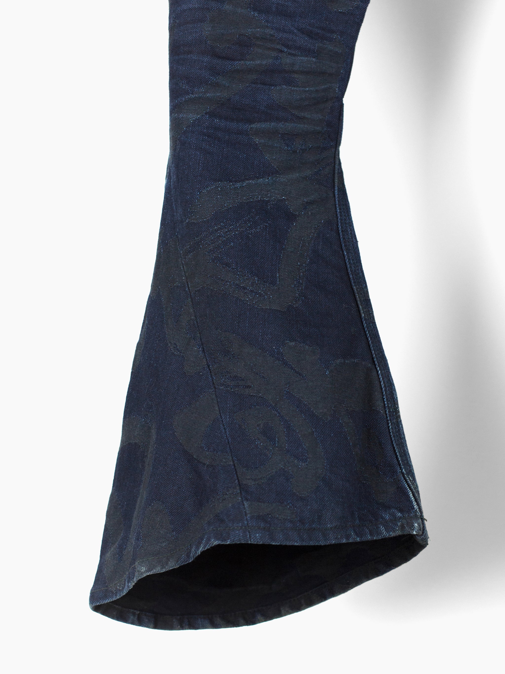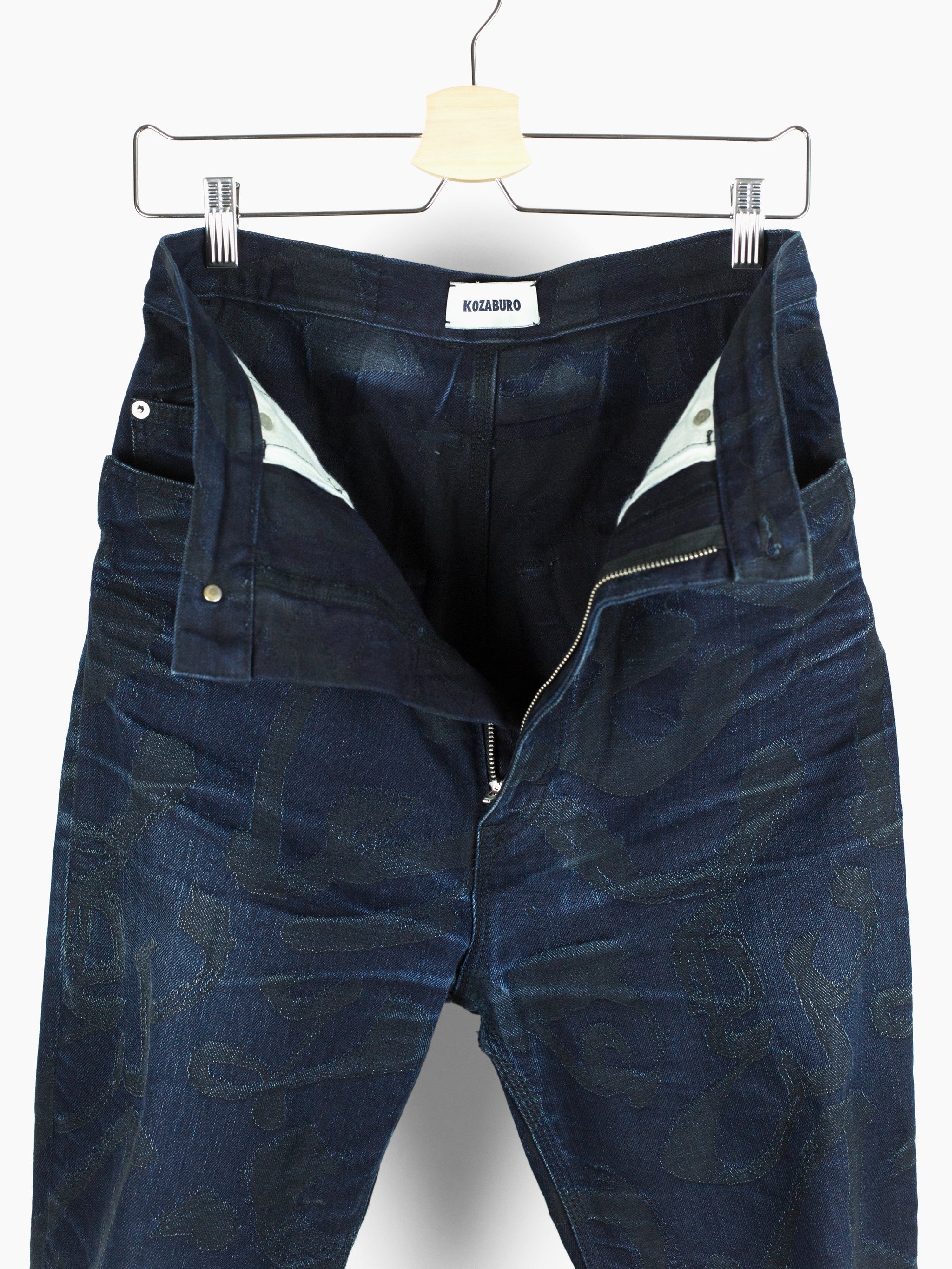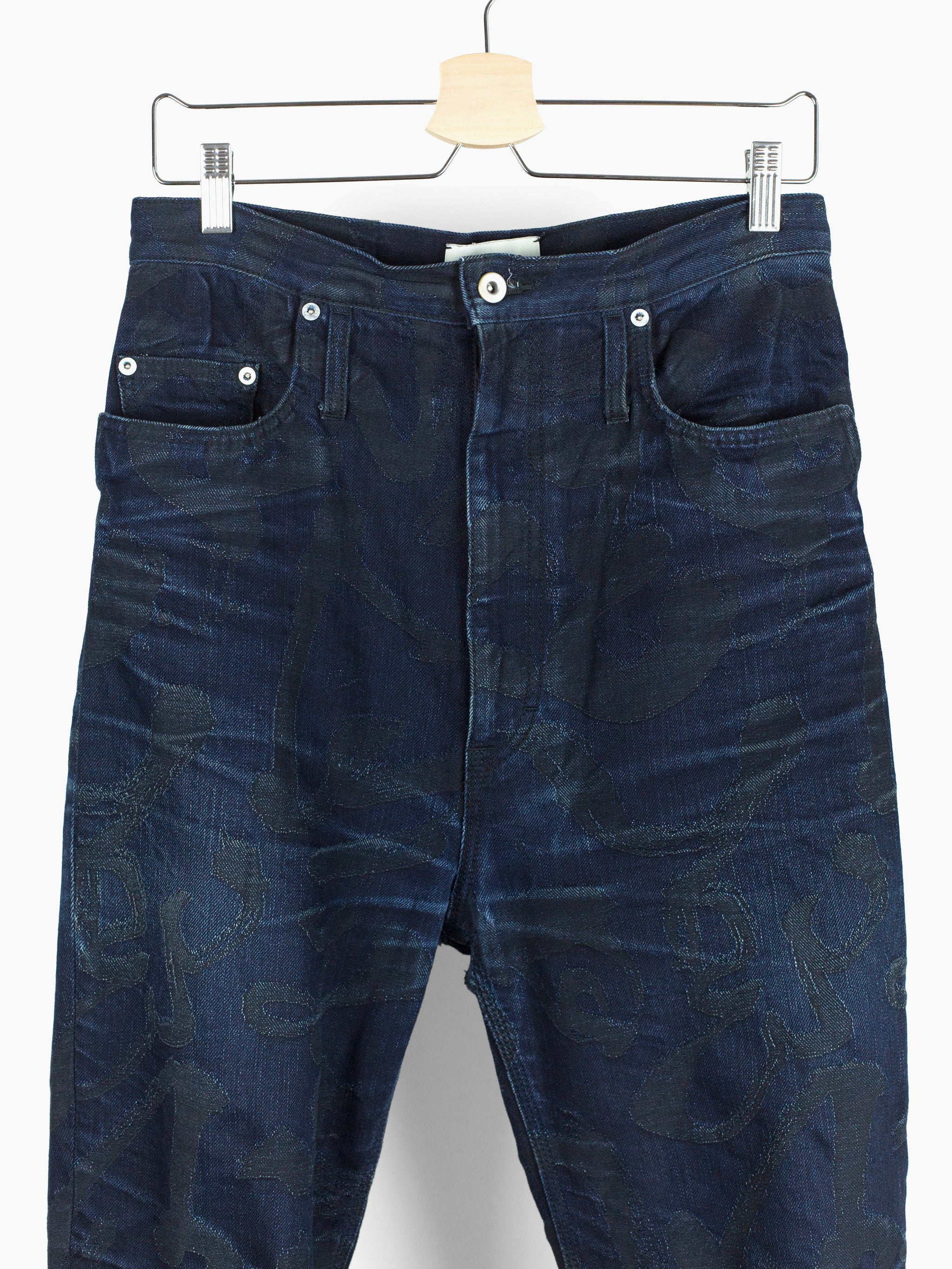 The denim used in this iteration features an all over jacquard woven calligraphy pattern written by Kozaburo's Buddhist monk friend. It's subtle, being woven in black on overdyed indigo twill but with time and wear the pattern will peek through, adding a layer of evolution to look forward to alongside the typical raw denim fading patterns. This pair here is already starting to wear in beautifully and shows just a small bit of what these could become as they age with you.