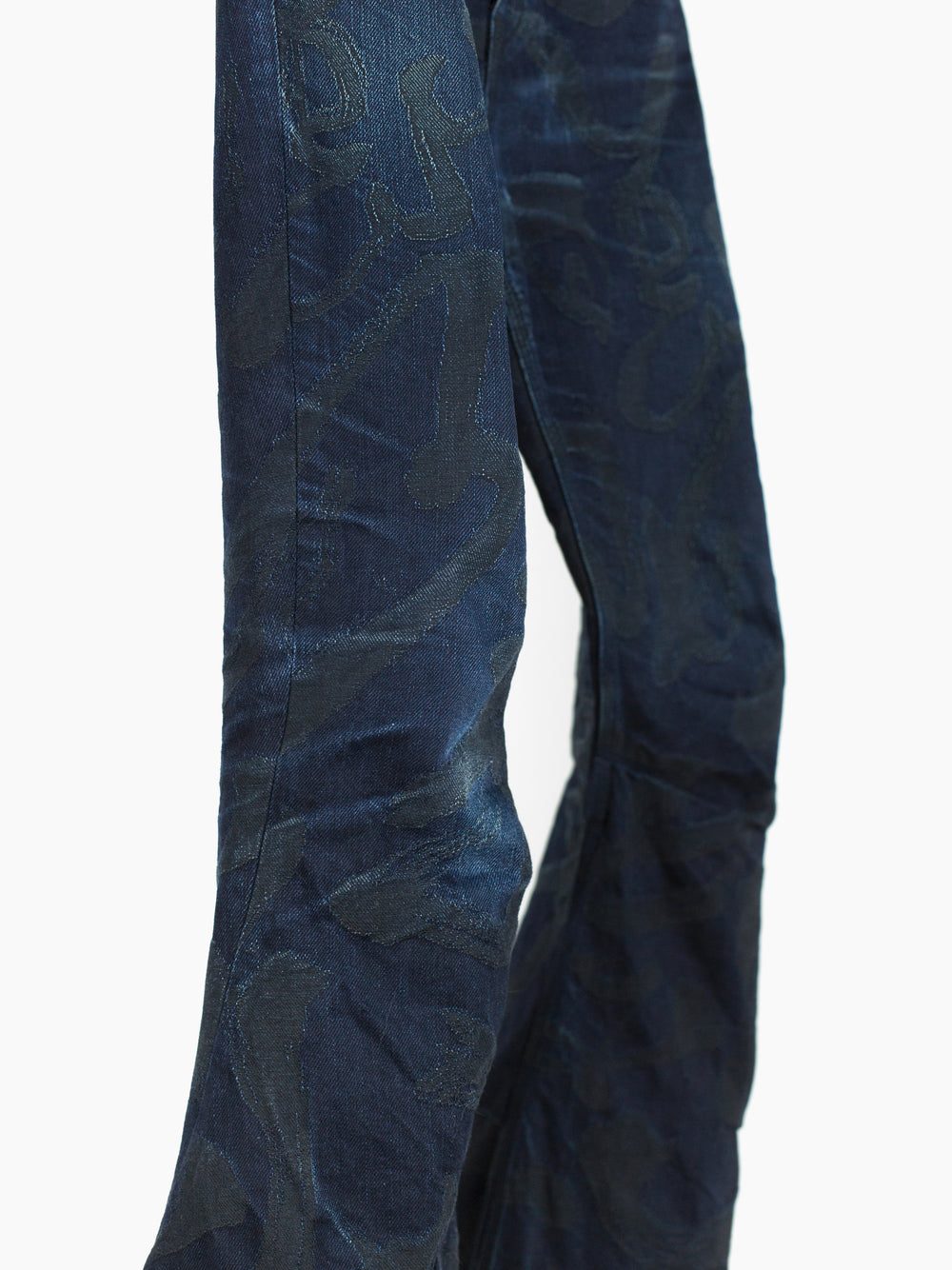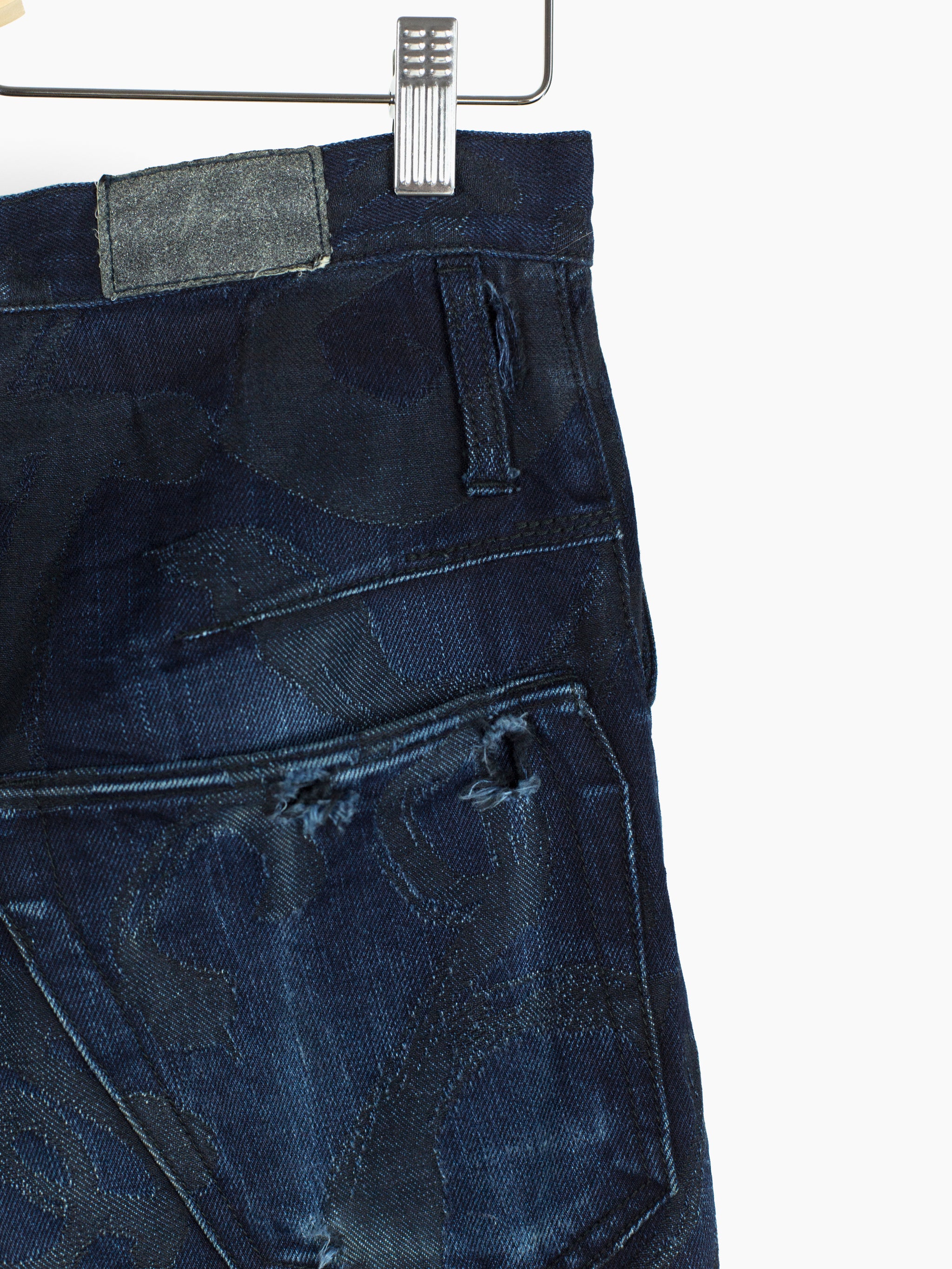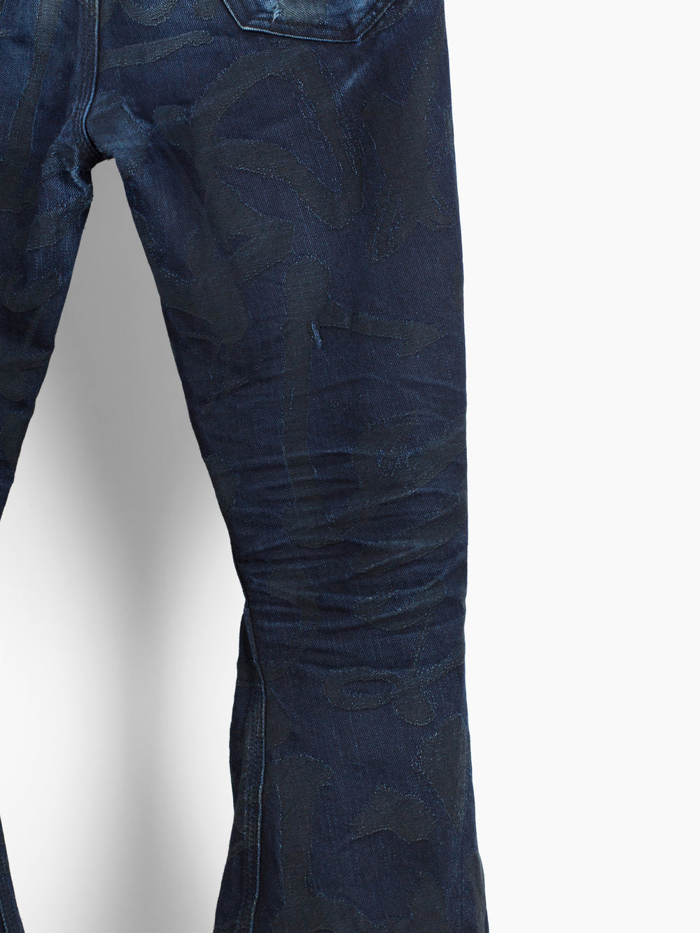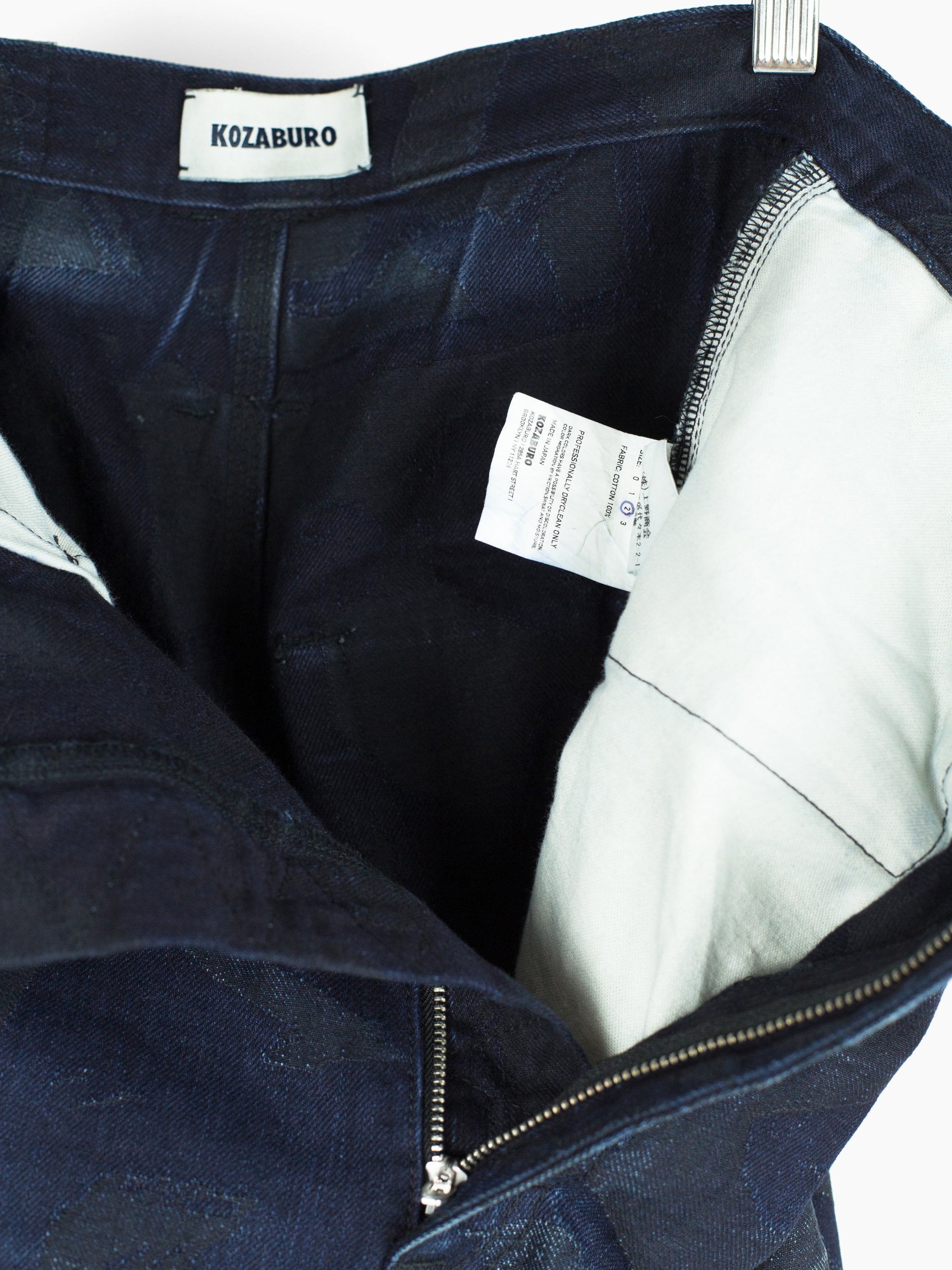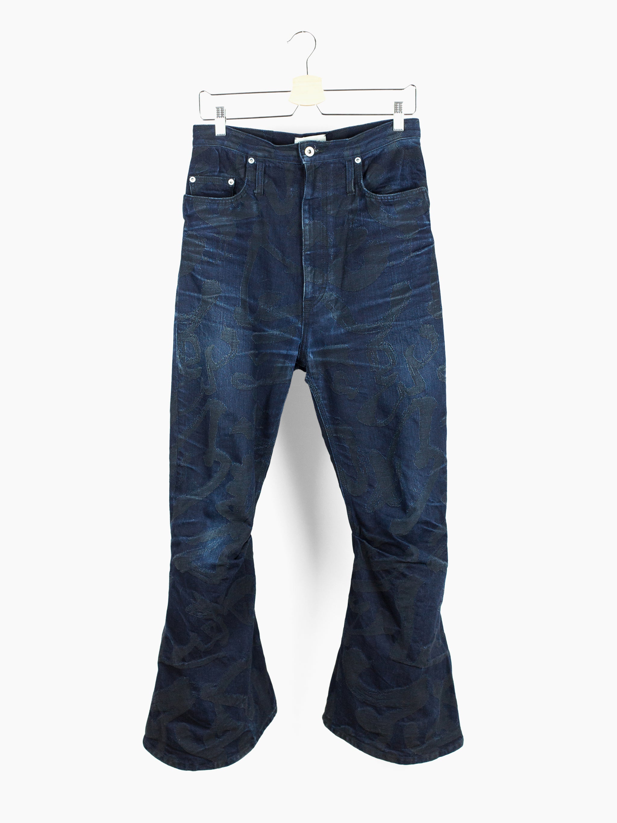 The denim used in this iteration features an all over jacquard woven calligraphy pattern written by Kozaburo's Buddhist monk friend. It's subtle, being woven in black on overdyed indigo twill but with time and wear the pattern will peek through, adding a layer of evolution to look forward to alongside the typical raw denim fading patterns. This pair here is already starting to wear in beautifully and shows just a small bit of what these could become as they age with you.