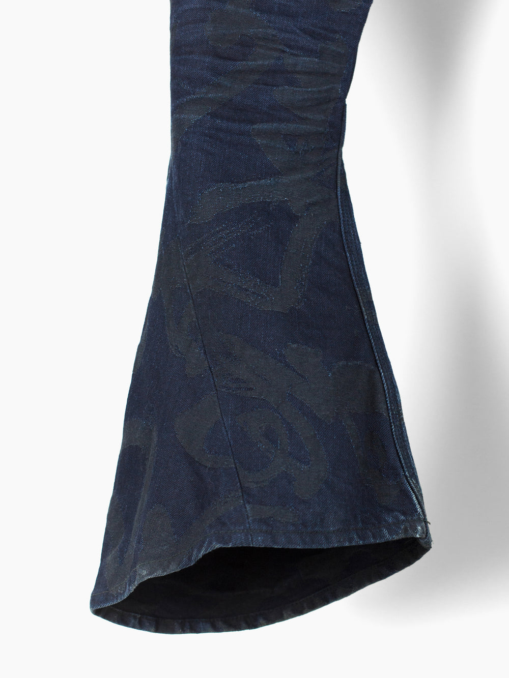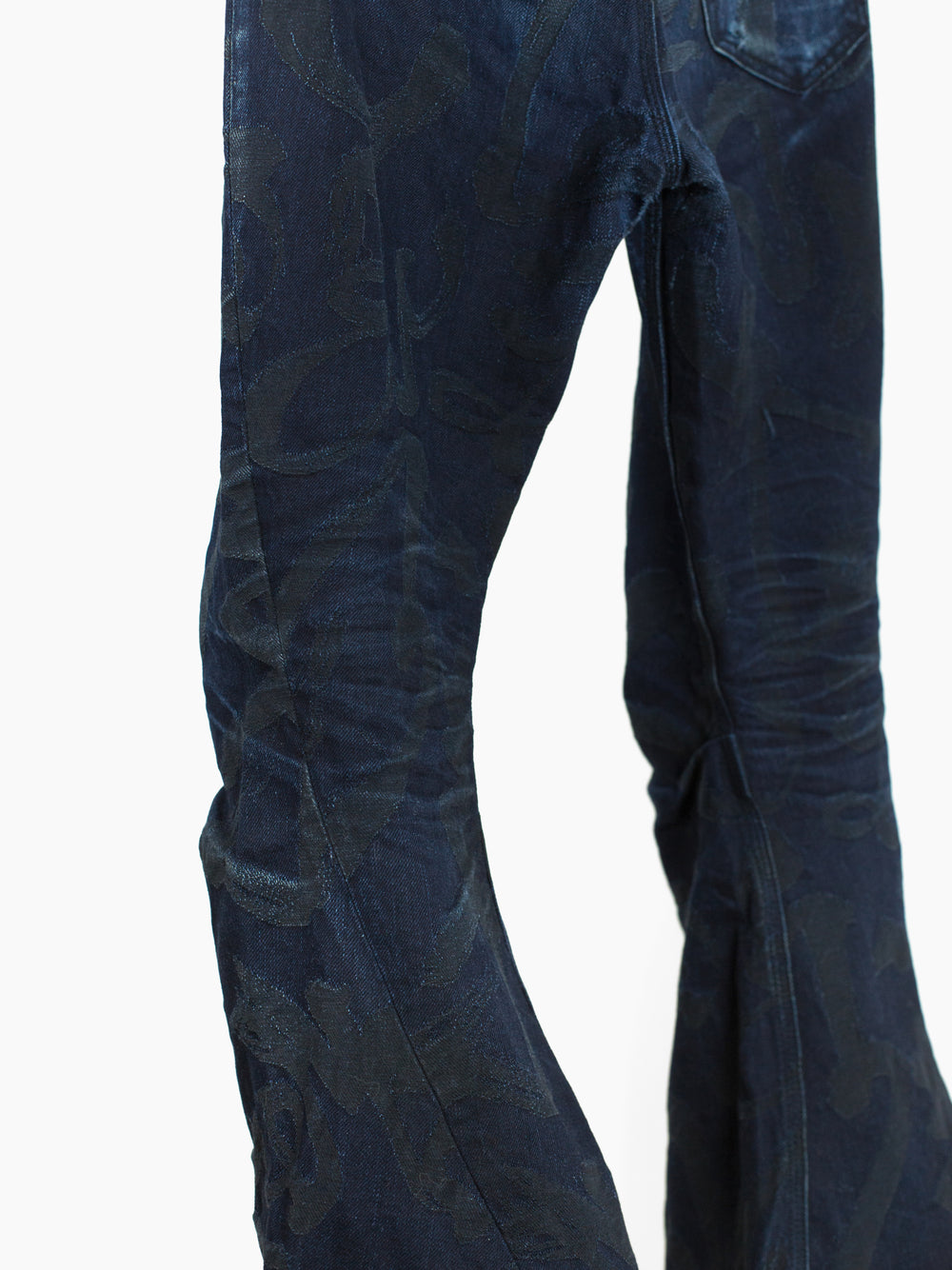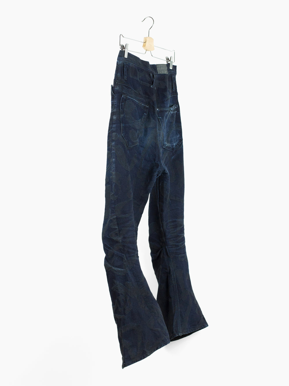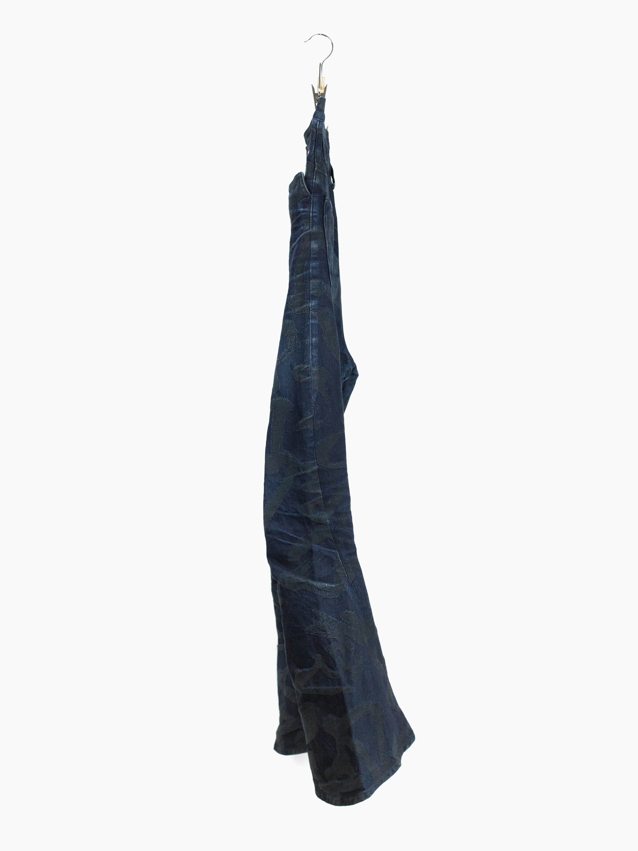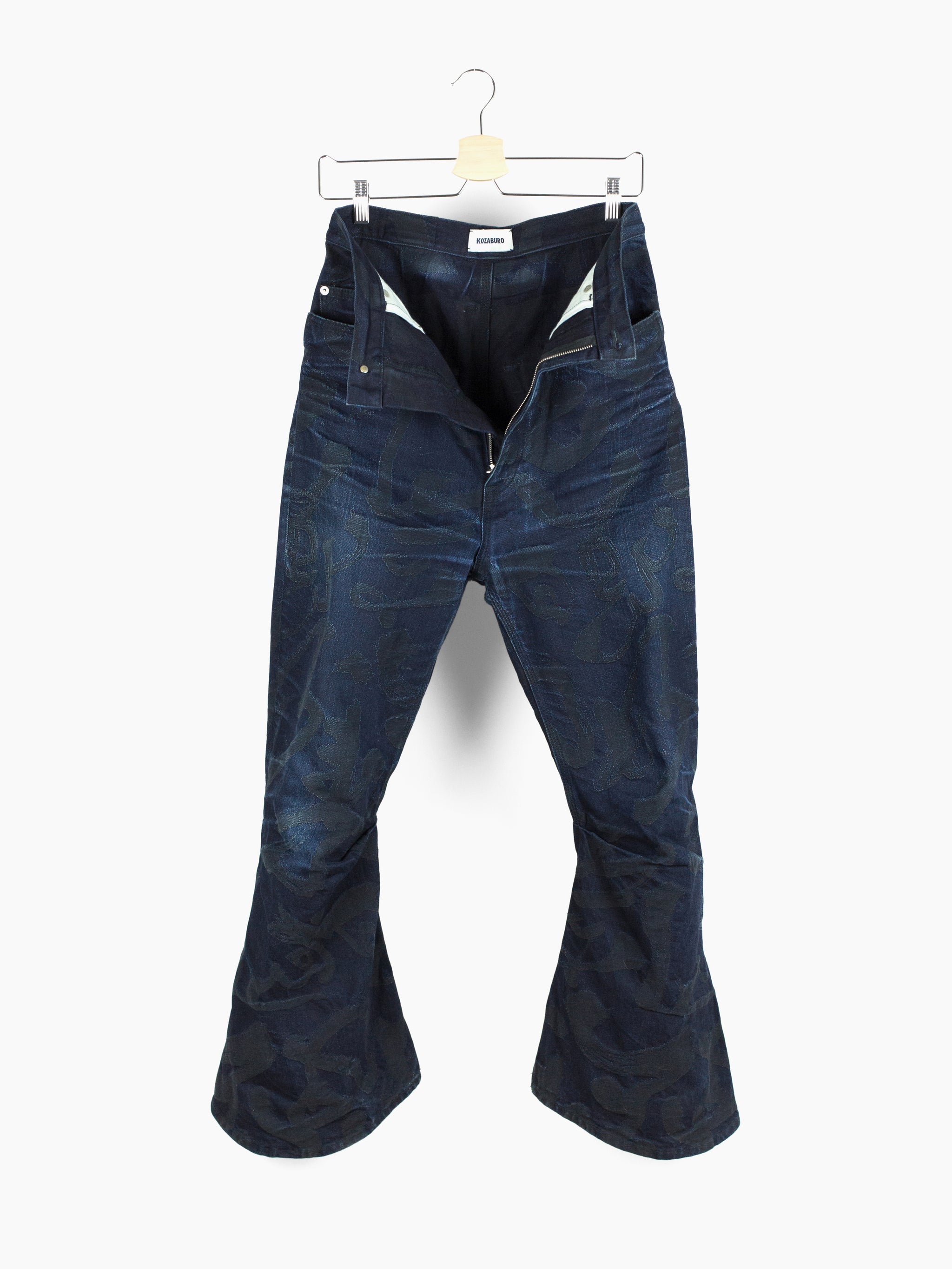 The Kozaburo signature short 3D bootcut jean is a truly new expression of the traditional denim jean that marries past with future. It features curved 3D patternmaking and thoroughly reconsidered construction (via a super high waist, yokeless darted seat, and tight, articulated leg with a dramatic flare underneath the knee) that yield a flattering and sculptural fit. The kick flare here is reinvented and reinvigorated, with a hem that stands off the body, changing from one angle to the next--it seems to be always spiraling around the leg, giving the shape an air of movement and dynamism.