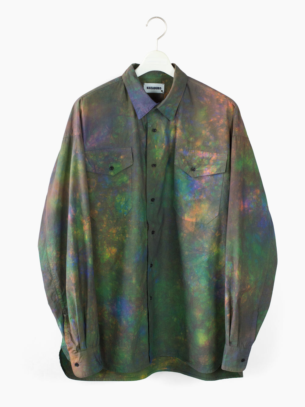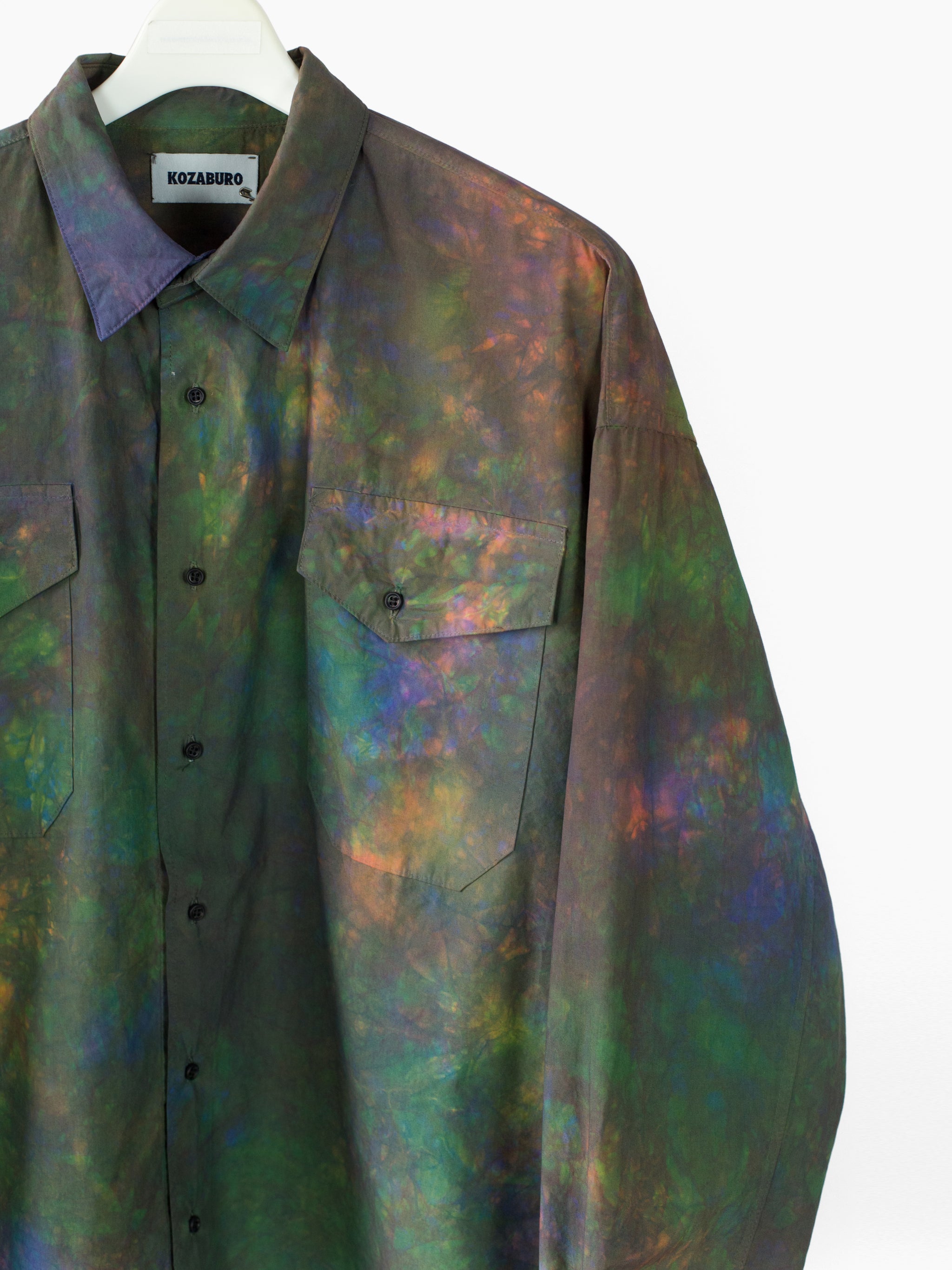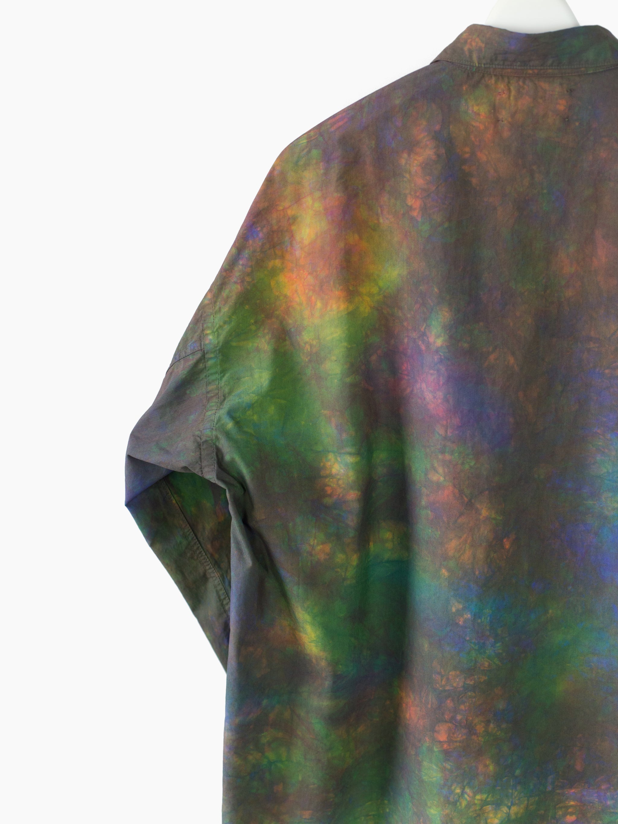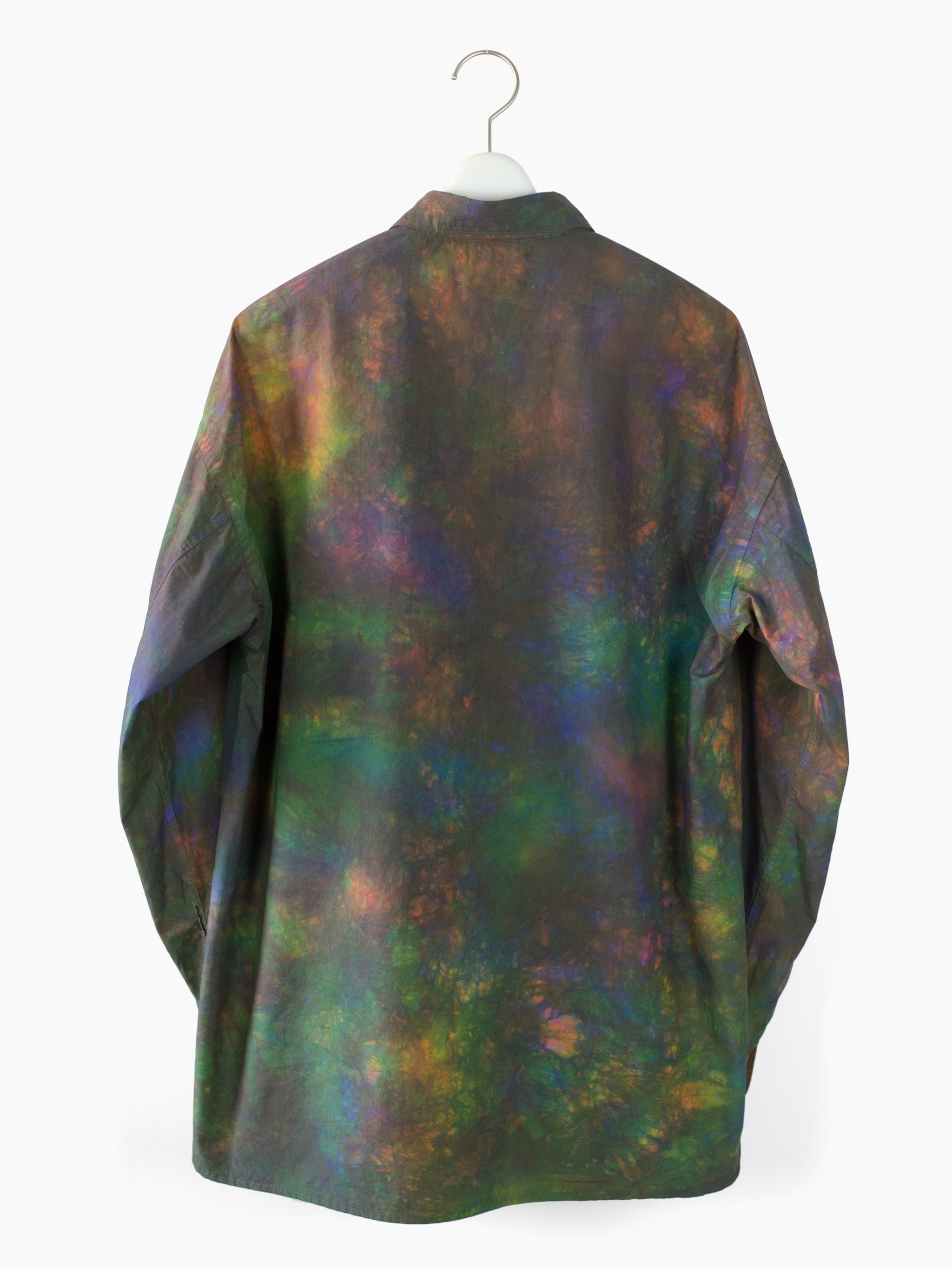 Two-pocket utility shirt in seasonal 'cosmo' pattern, created by multiple rounds of hand dyeing to create a layered, kaleidoscopic nebula look. Beautiful depth that really shines in natural light, one gets peeks of orange, yellow, purple, blue, beneath a rich greenish base.
