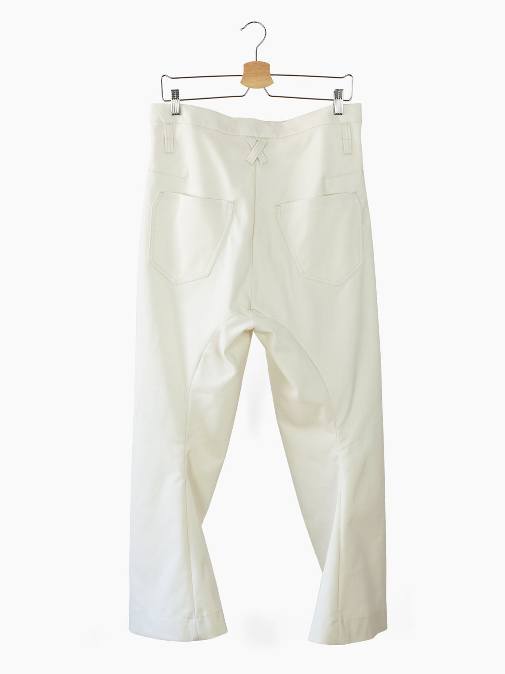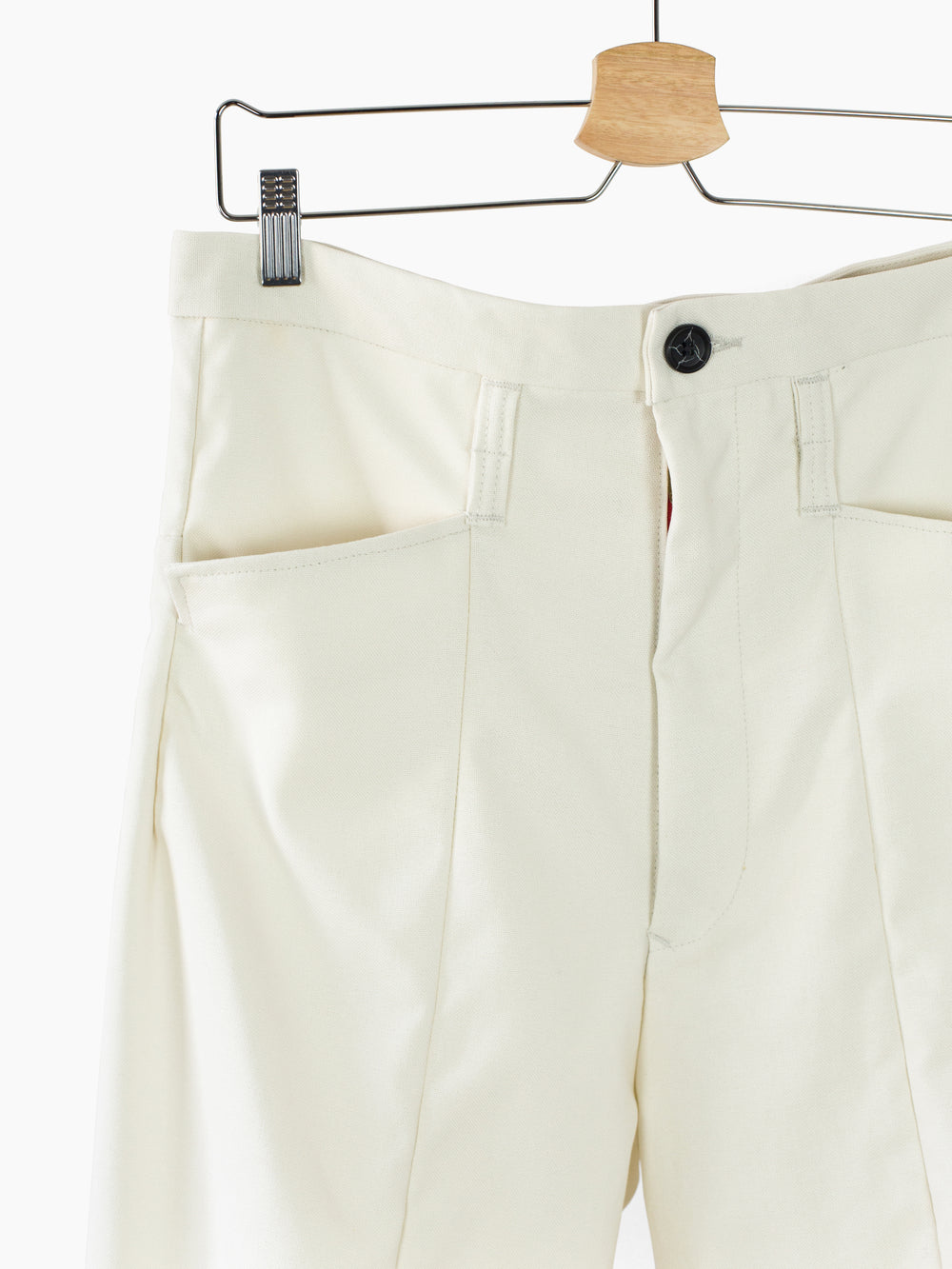 Warm-weather iteration of the classic Kozaburo 3D Tailored trouser, featuring a front seam and curved back shifted 'inseam' that create a bent leg profile and spiraling, dynamic leg shape. The hem cants backwards and has a slight flare, creating a trouser that changes constantly while in motion.