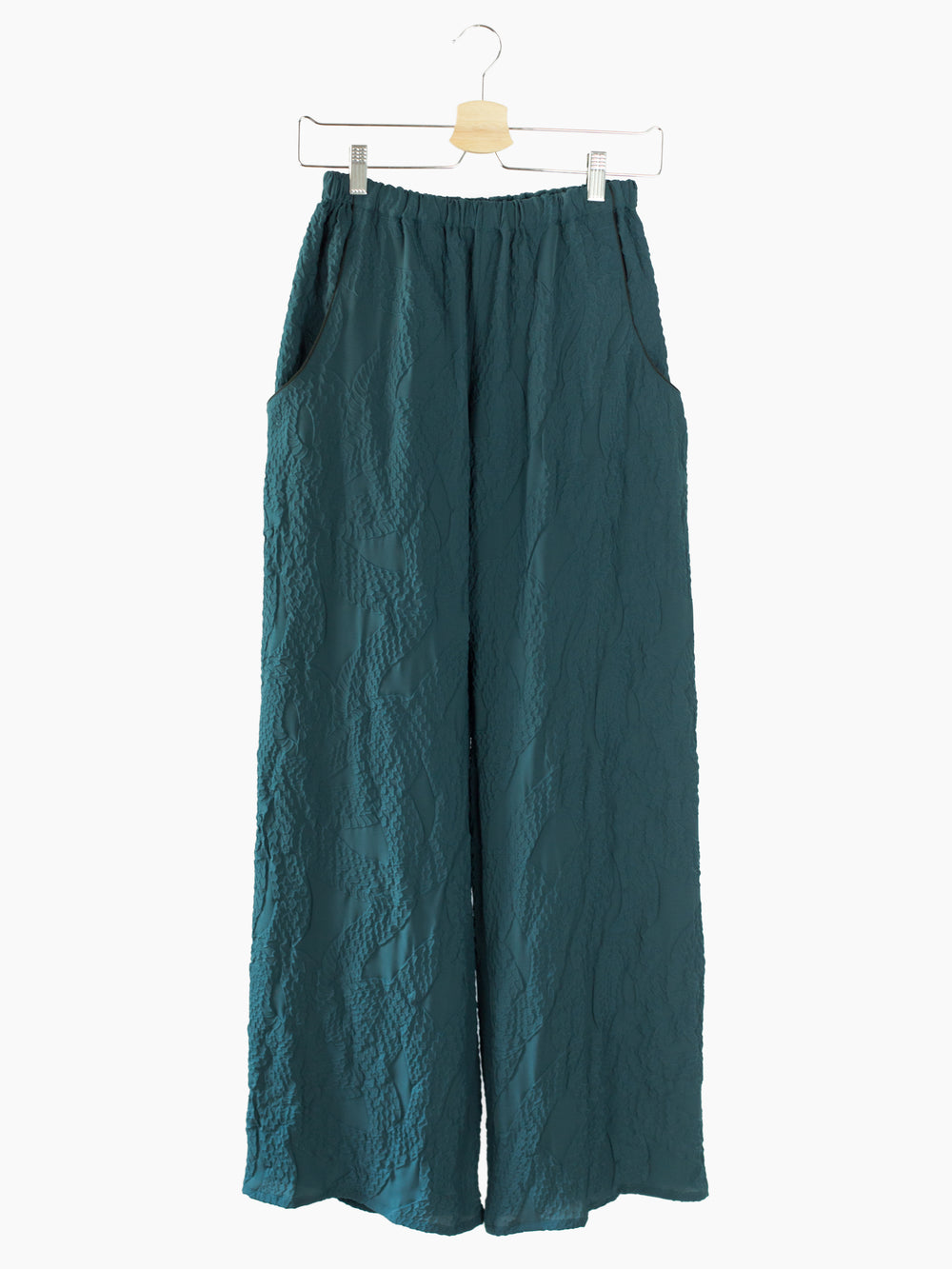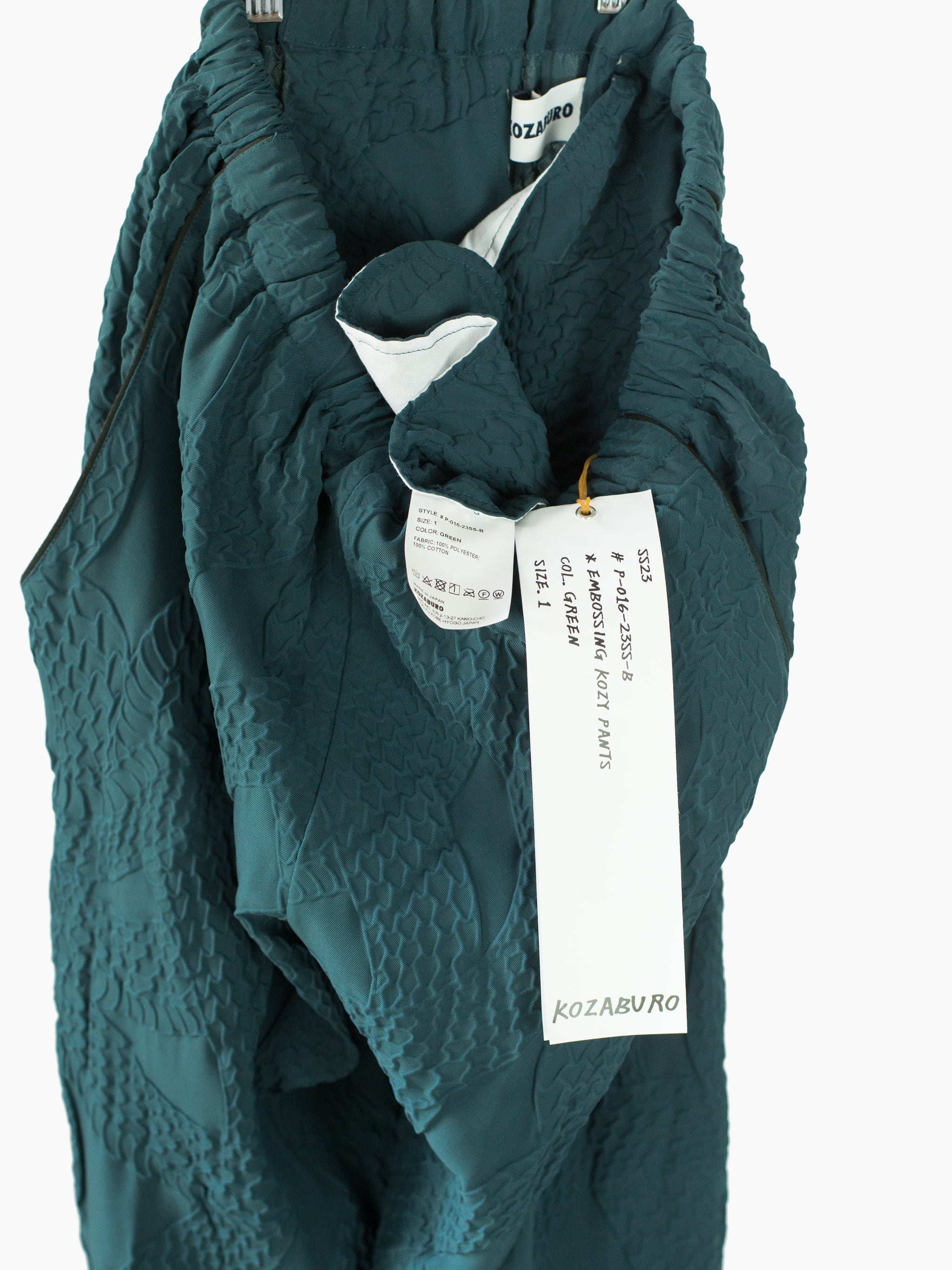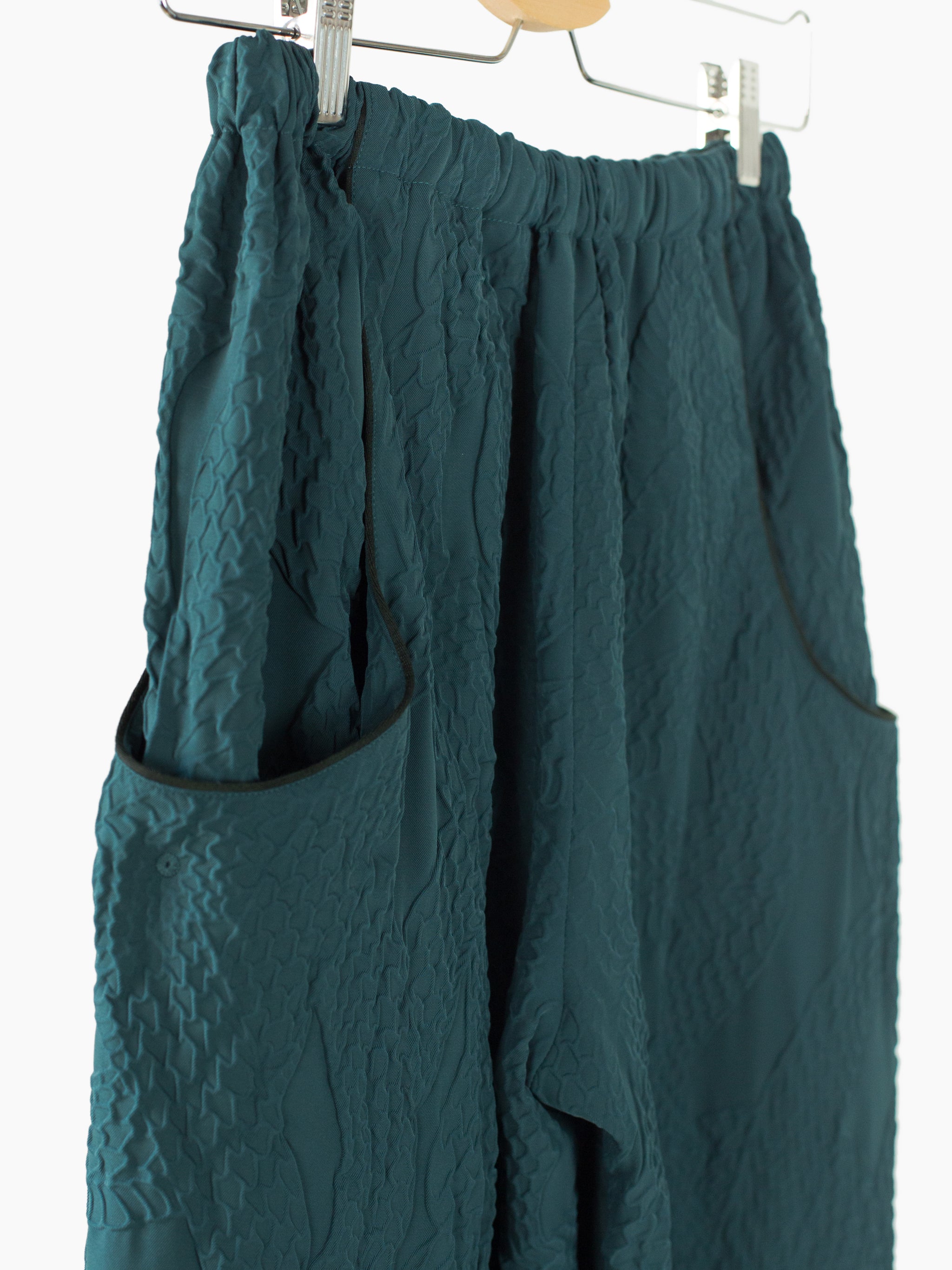 Elasticated-waist house pants in seasonal signature 3D embossed snake pattern polyester. Features circular piped pocket openings that access both the front slash-style waist pockets and rear holster drop pockets, with a decorative separation stitched between. The artful geometry of the pockets works with a single-piece, no-outseam leg construction to create a formally pure aesthetic with minimal bulk and maximal comfort.