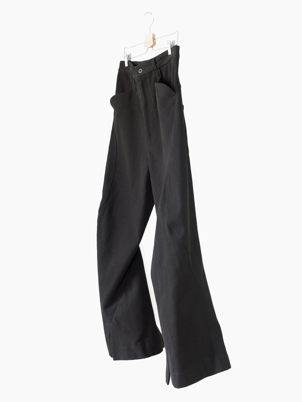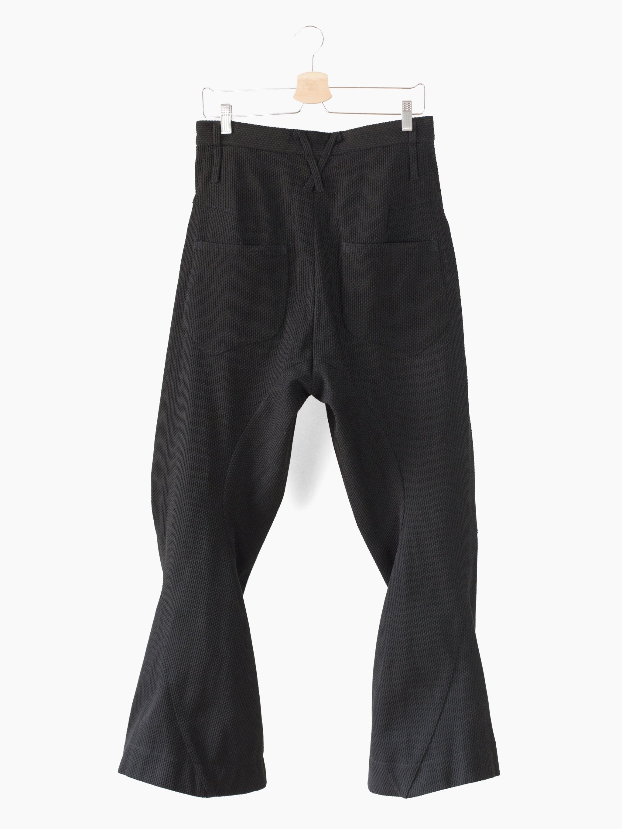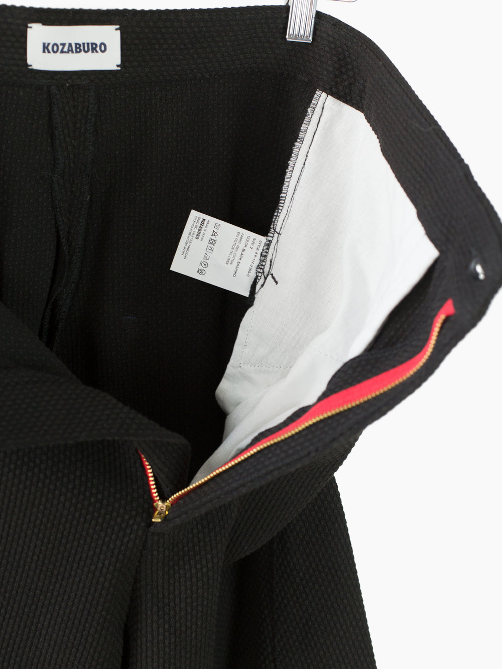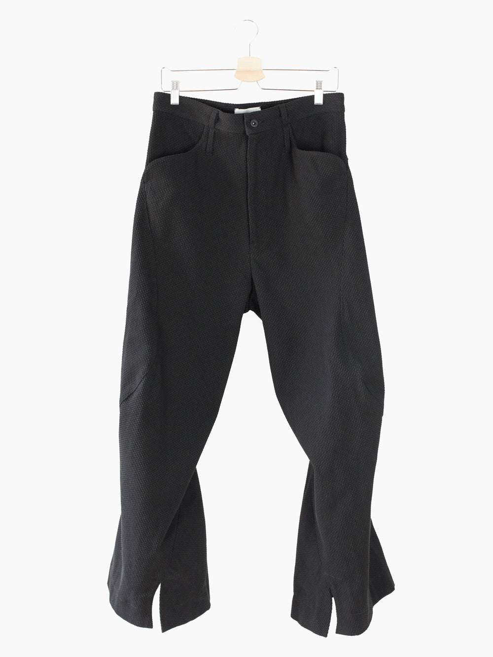 Returning in mid-weight black Sashiko cotton for SS23, the Dexter pant features spiral leg construction that twists around the leg, dialing up the dynamic, movemented look that's foundational to the Kozaburo universe. The curved construction is abstract yet imbues the pants with a zen quality, equal parts directional and meandering, using soft sweeping curves to create an aggressive and graphic visual. Demonstrative of the Kozaburo expertise in blending the poetic, contemplative, and hard-edged.