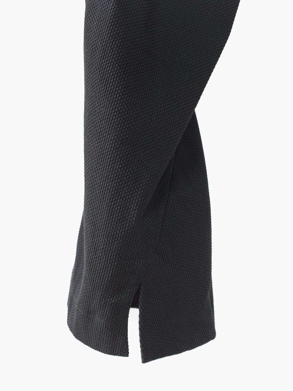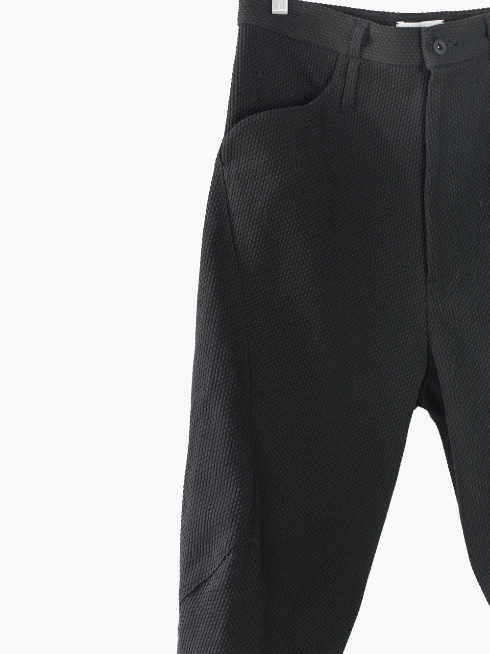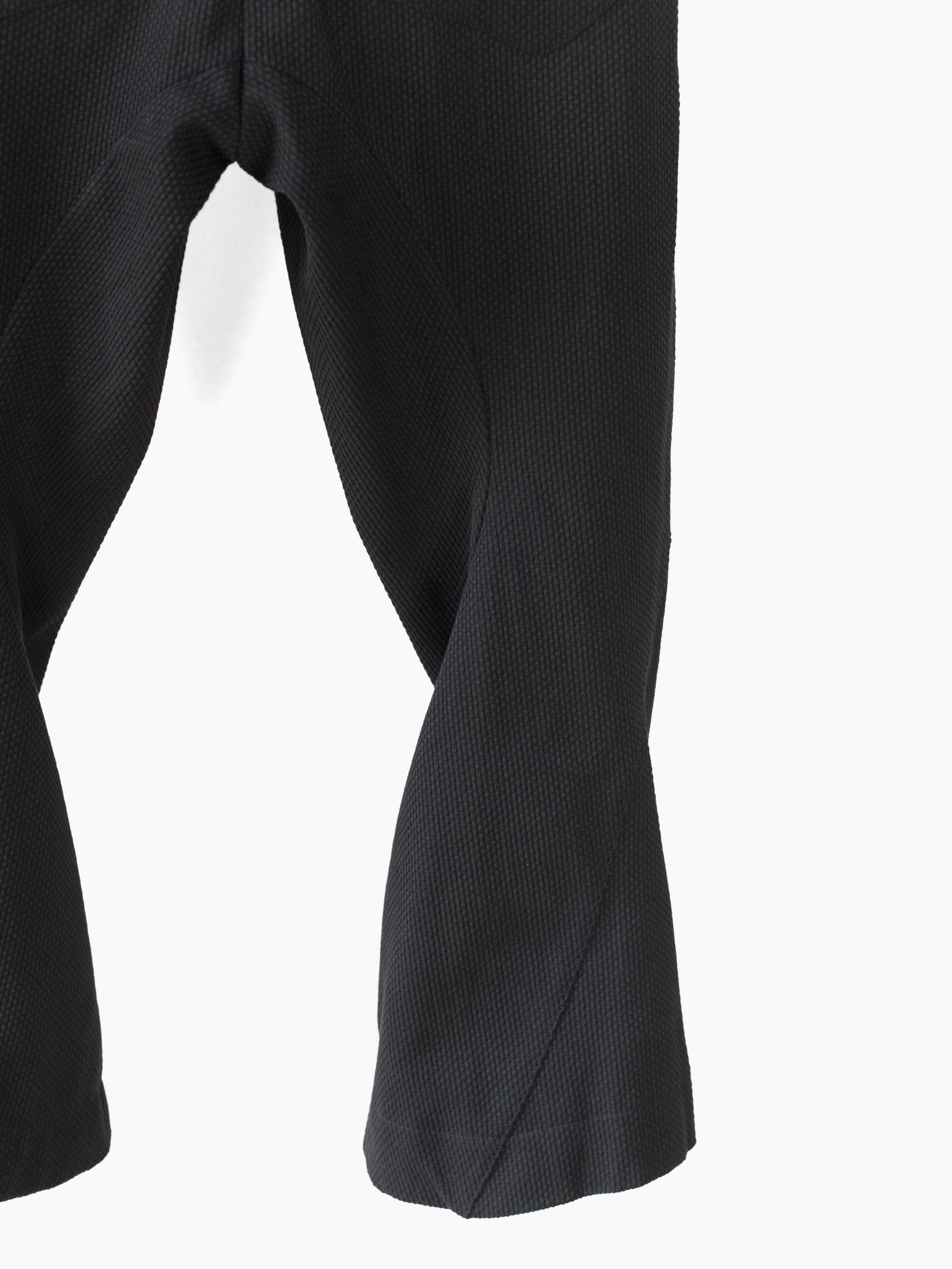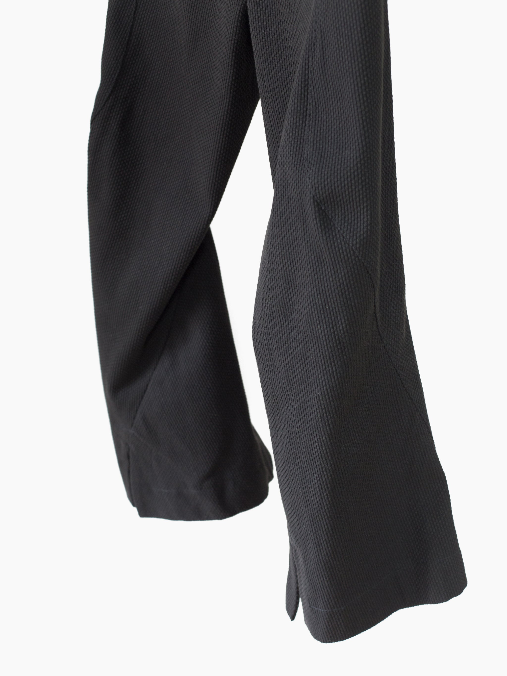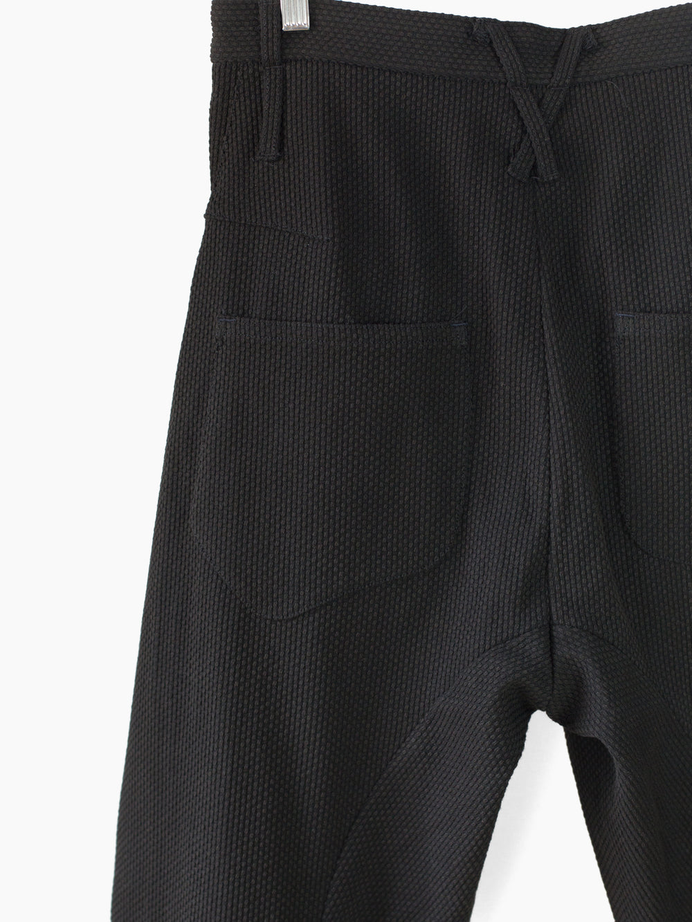 Returning in mid-weight black Sashiko cotton for SS23, the Dexter pant features spiral leg construction that twists around the leg, dialing up the dynamic, movemented look that's foundational to the Kozaburo universe. The curved construction is abstract yet imbues the pants with a zen quality, equal parts directional and meandering, using soft sweeping curves to create an aggressive and graphic visual. Demonstrative of the Kozaburo expertise in blending the poetic, contemplative, and hard-edged.