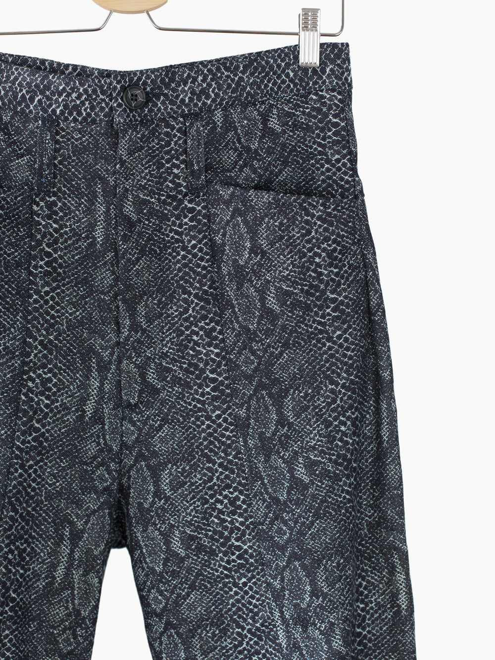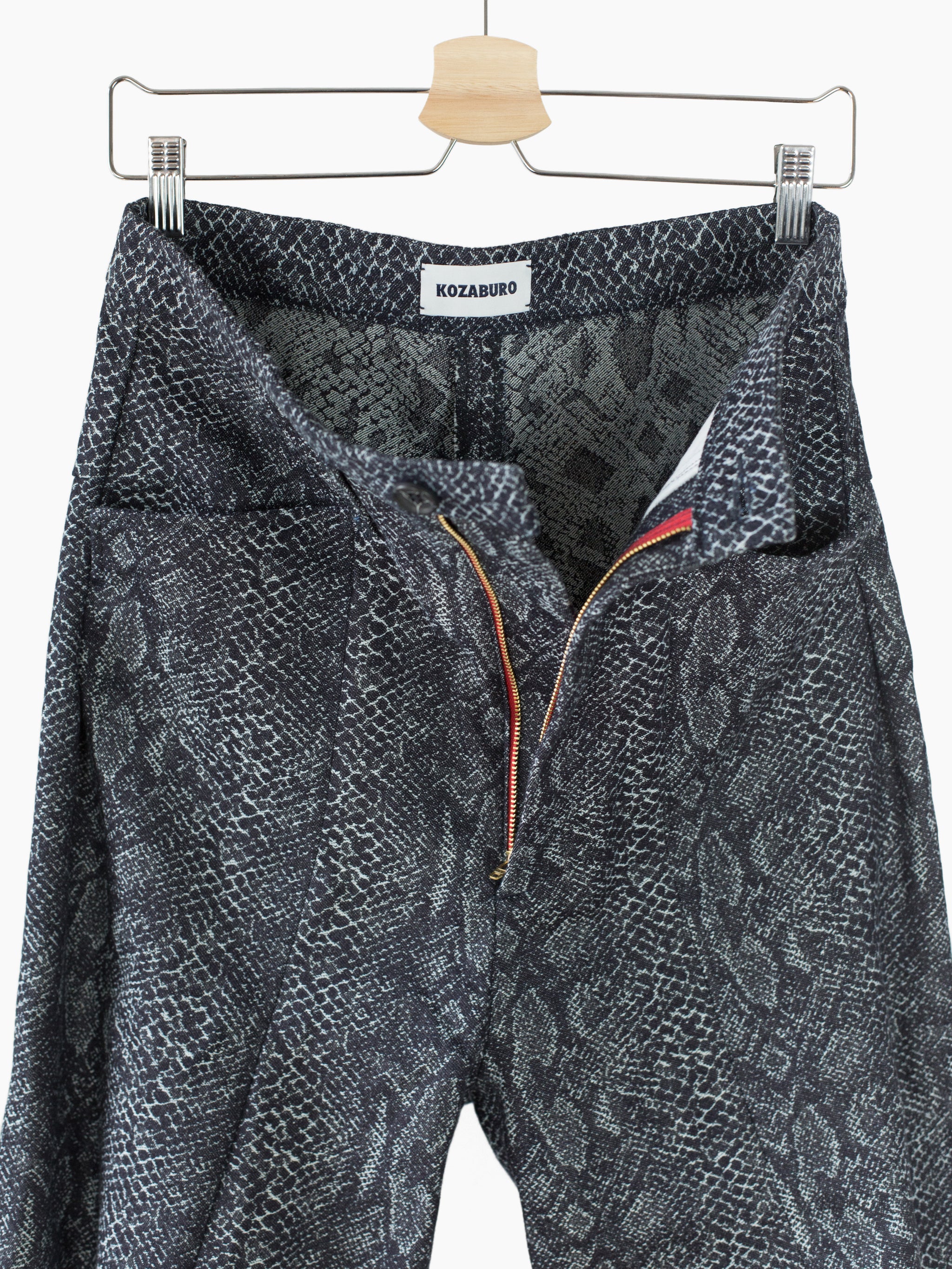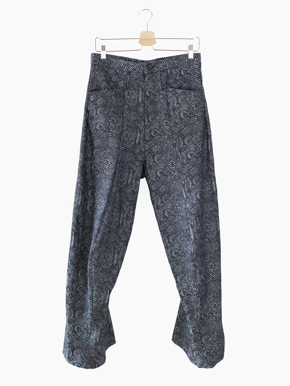 The classic Kozaburo 3D Tailored trouser rendered here in a decorative snake-scale open weave jacquard that's perfect for warmer weather, featuring a front seam and curved back shifted 'inseam' that create a bent leg profile and spiraling, dynamic leg shape. The hem cants backwards and has a slight flare, creating a trouser that changes constantly while in motion.