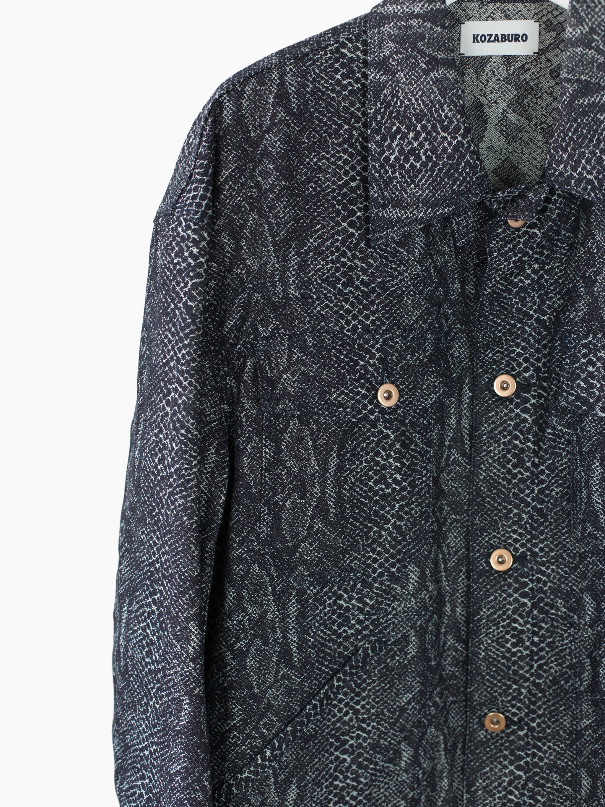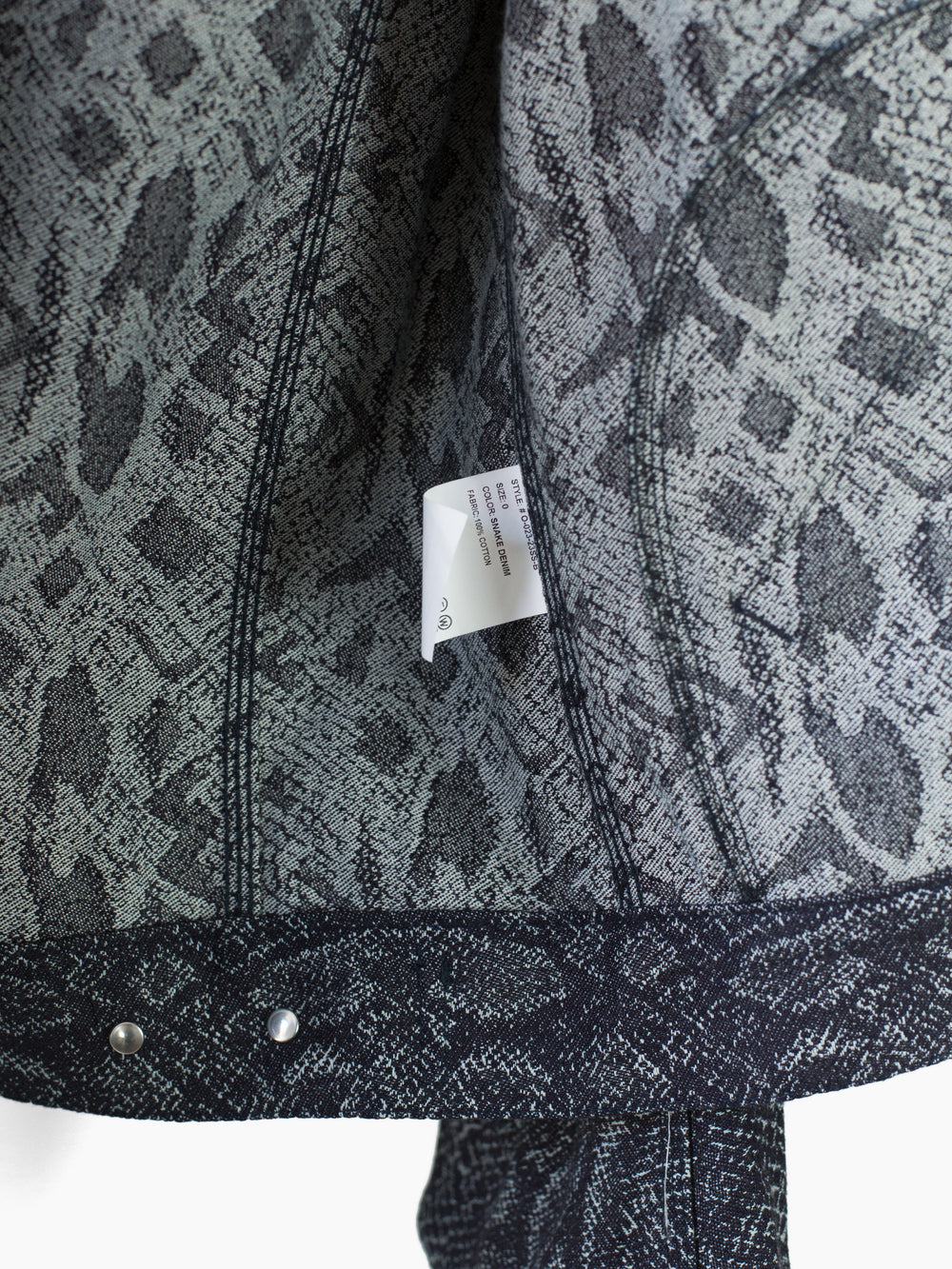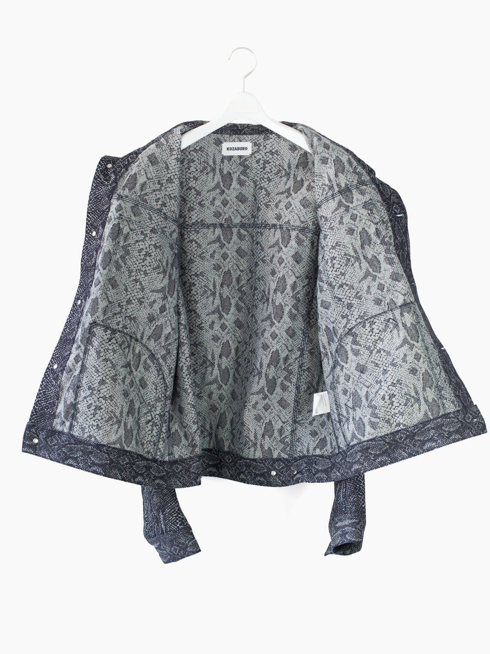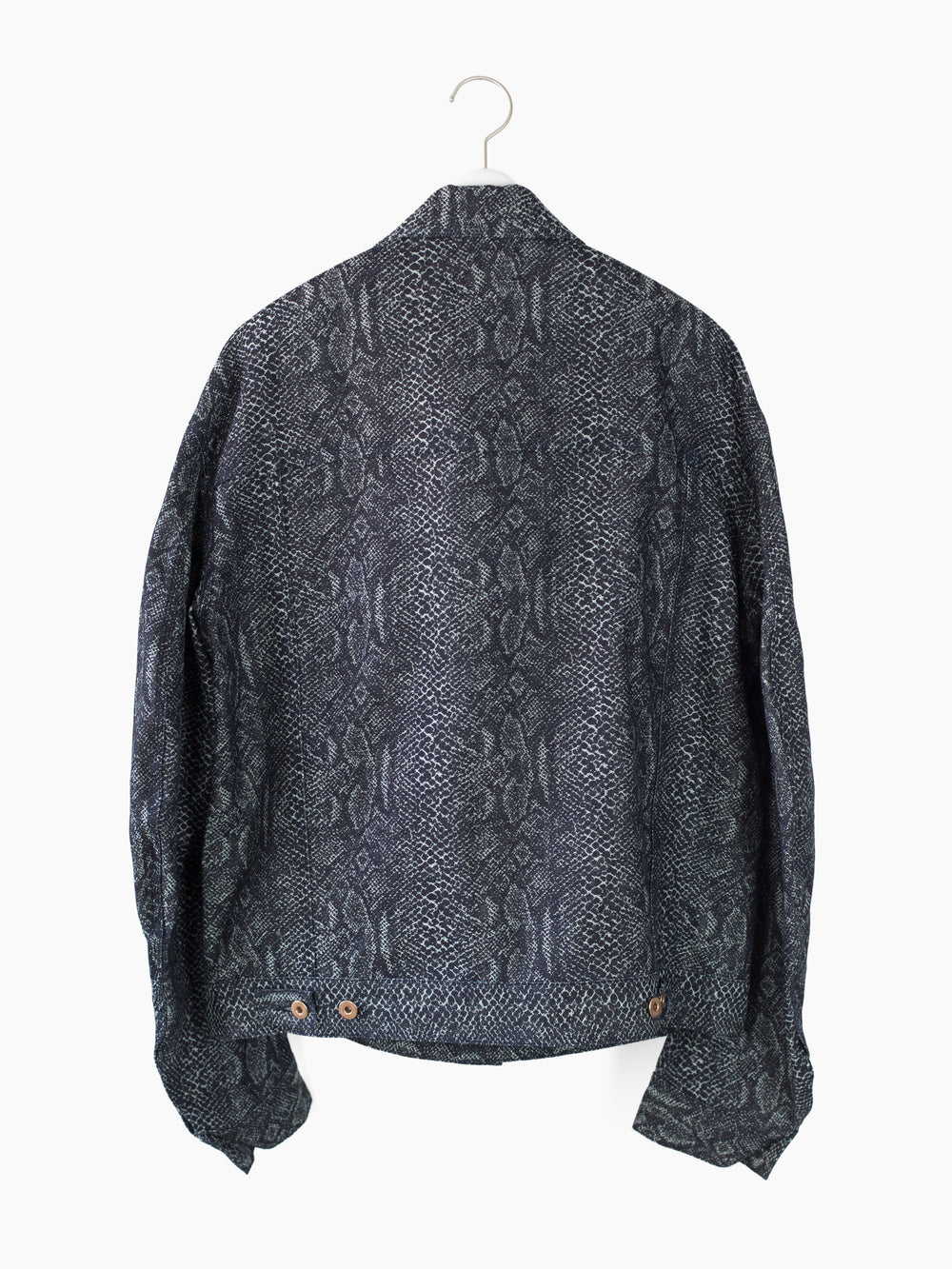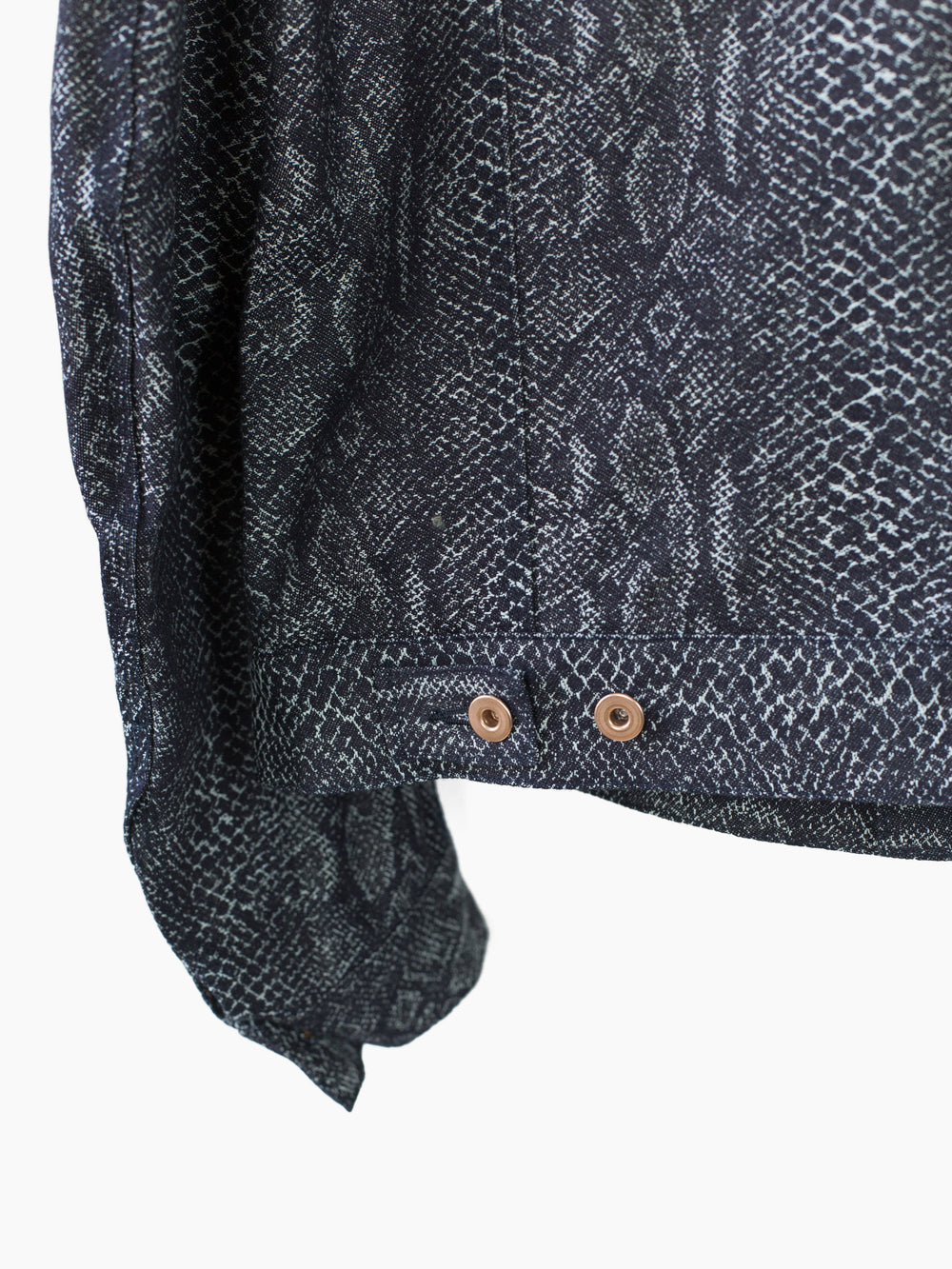 Type 3 Trucker Jacket by Kozaburo, a western staple reimagined with an oversize fit through the body and overlong sleeves cut with a dramatic curved shape. Wearable standalone as a piece of light outerwear or as a top layer over longer shirting and coats. Features bronze metal shank closures throughout, two flap-closed chest pockets, and two welt waist pockets.