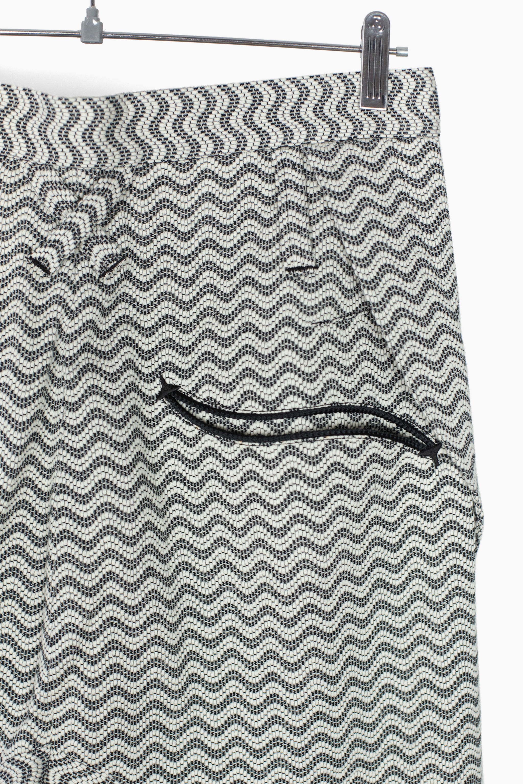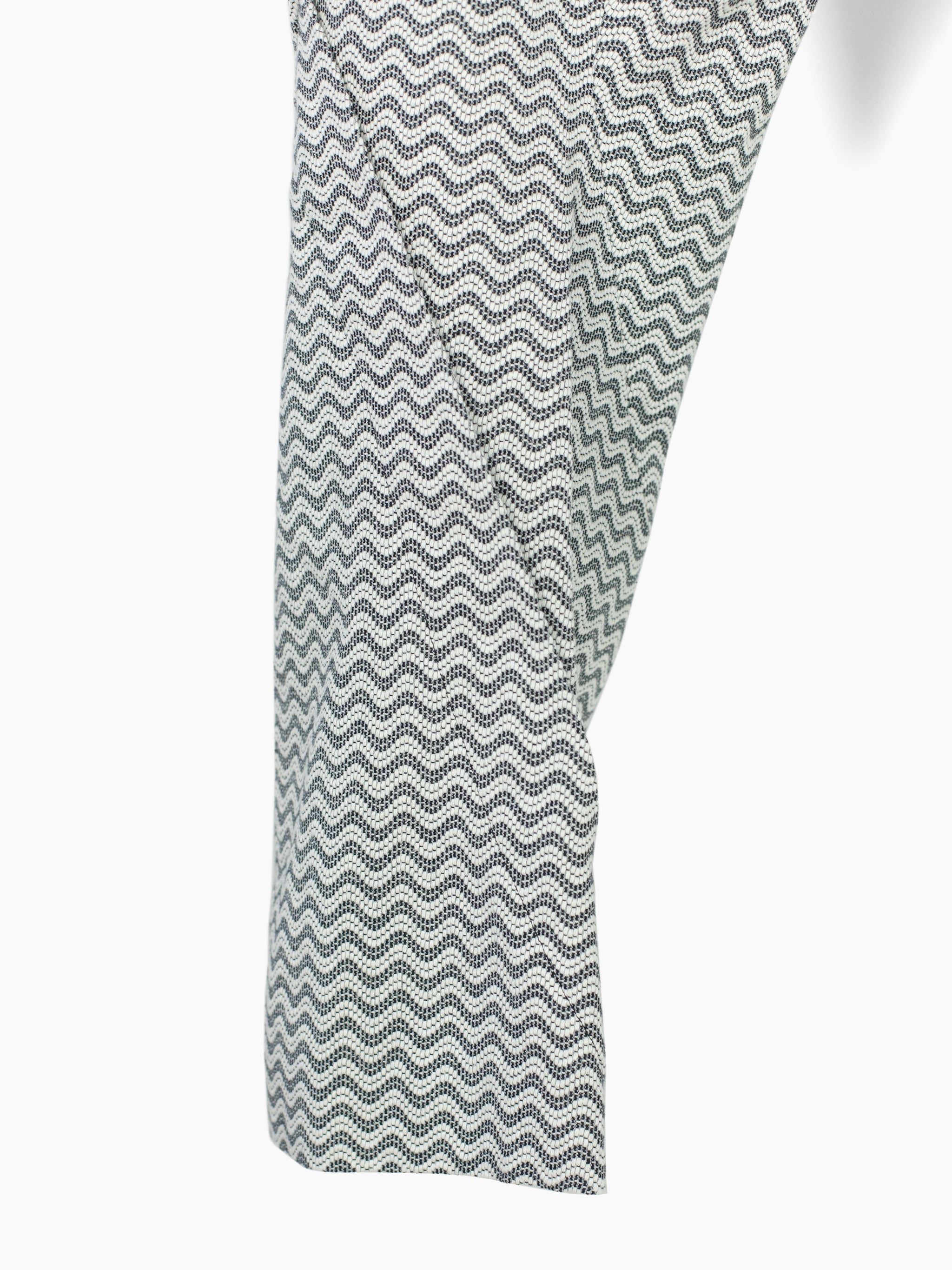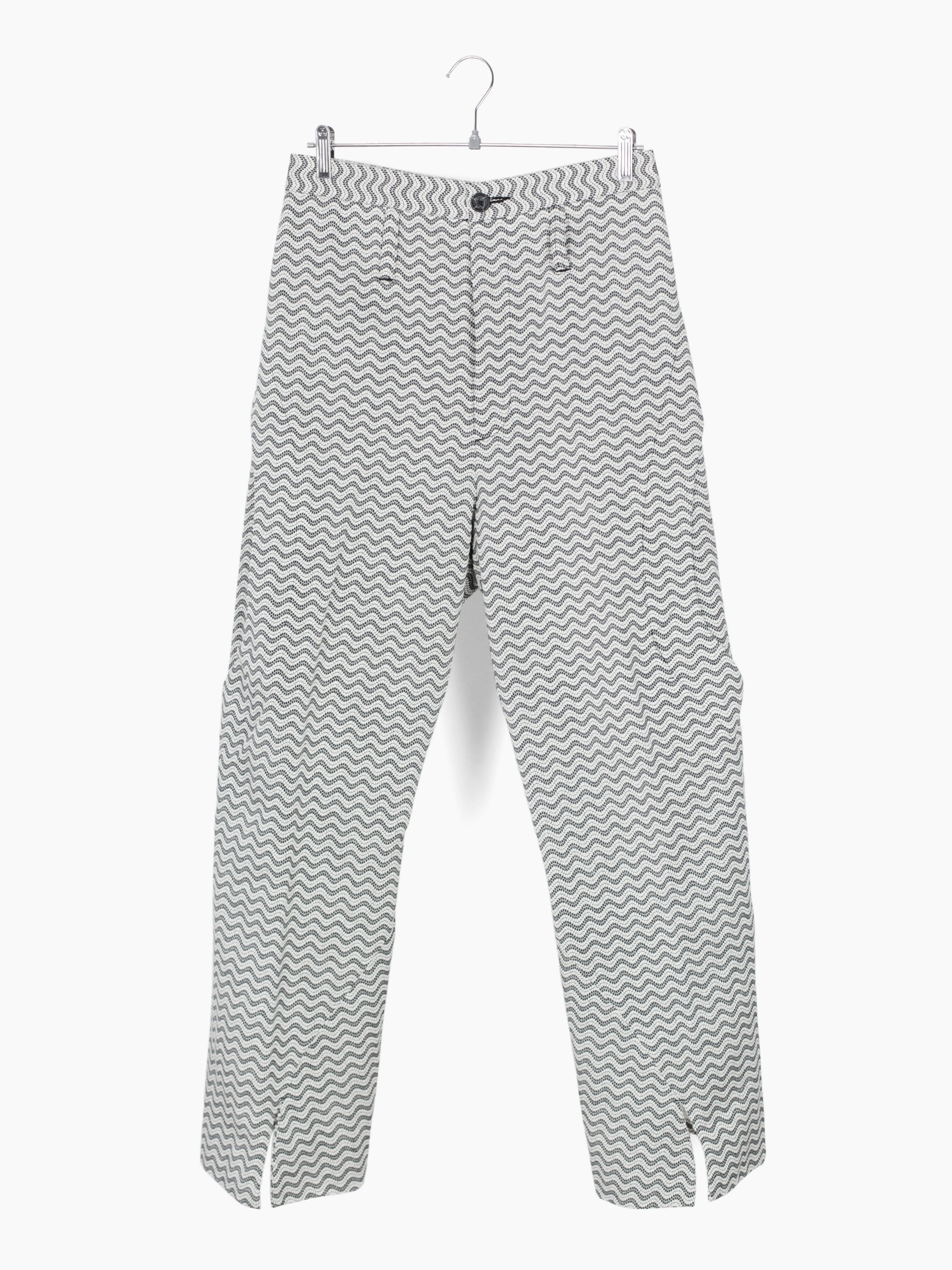 Returning for SS24 in an undulating black/white wave pattern jacquard, the Dexter pant features spiral leg construction that twists around the leg, dialing up the dynamic, movemented look that's foundational to the Kozaburo universe. The curved construction is abstract yet imbues the pants with a zen quality, equal parts directional and meandering, using soft sweeping curves to create an aggressive and graphic visual. Demonstrative of the Kozaburo expertise in blending the poetic, contemplative, and hard-edged.
