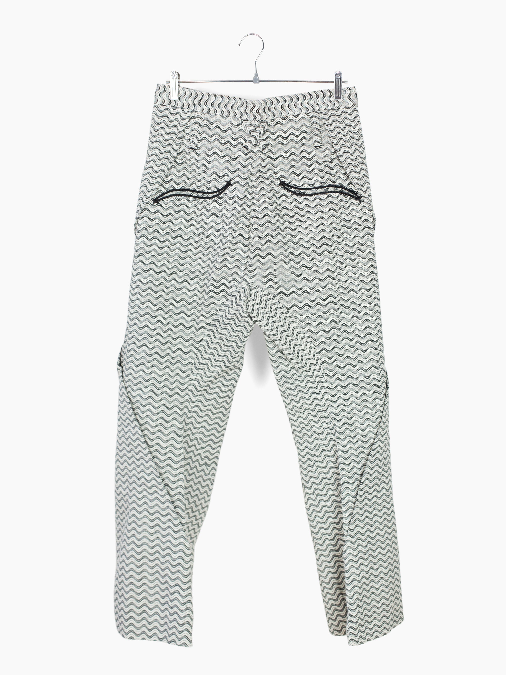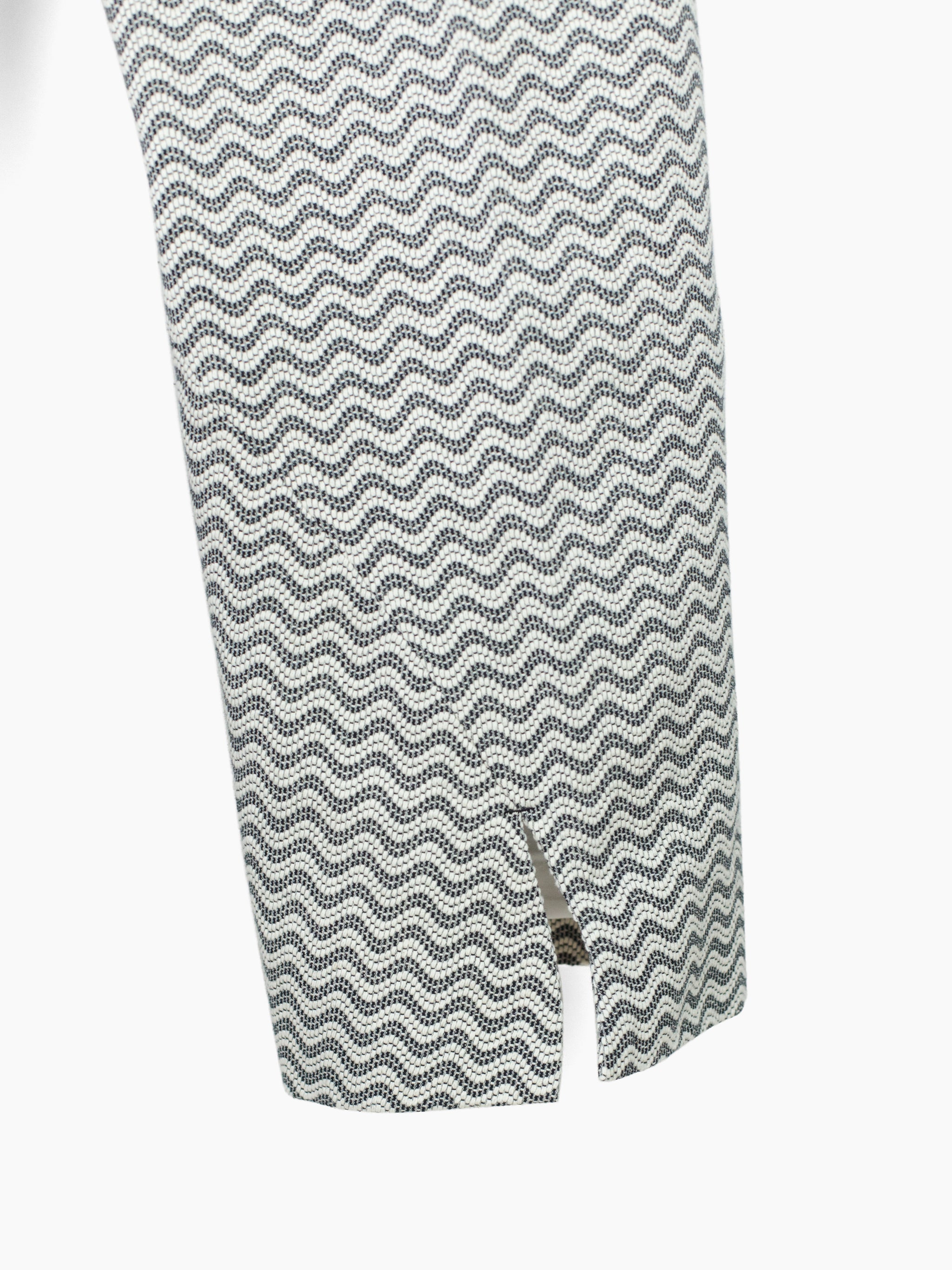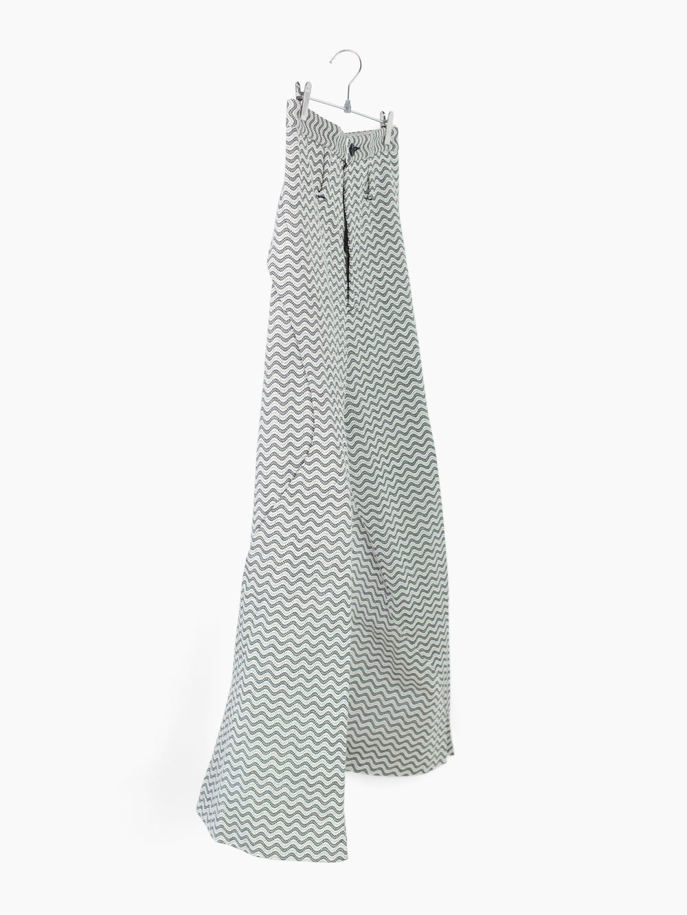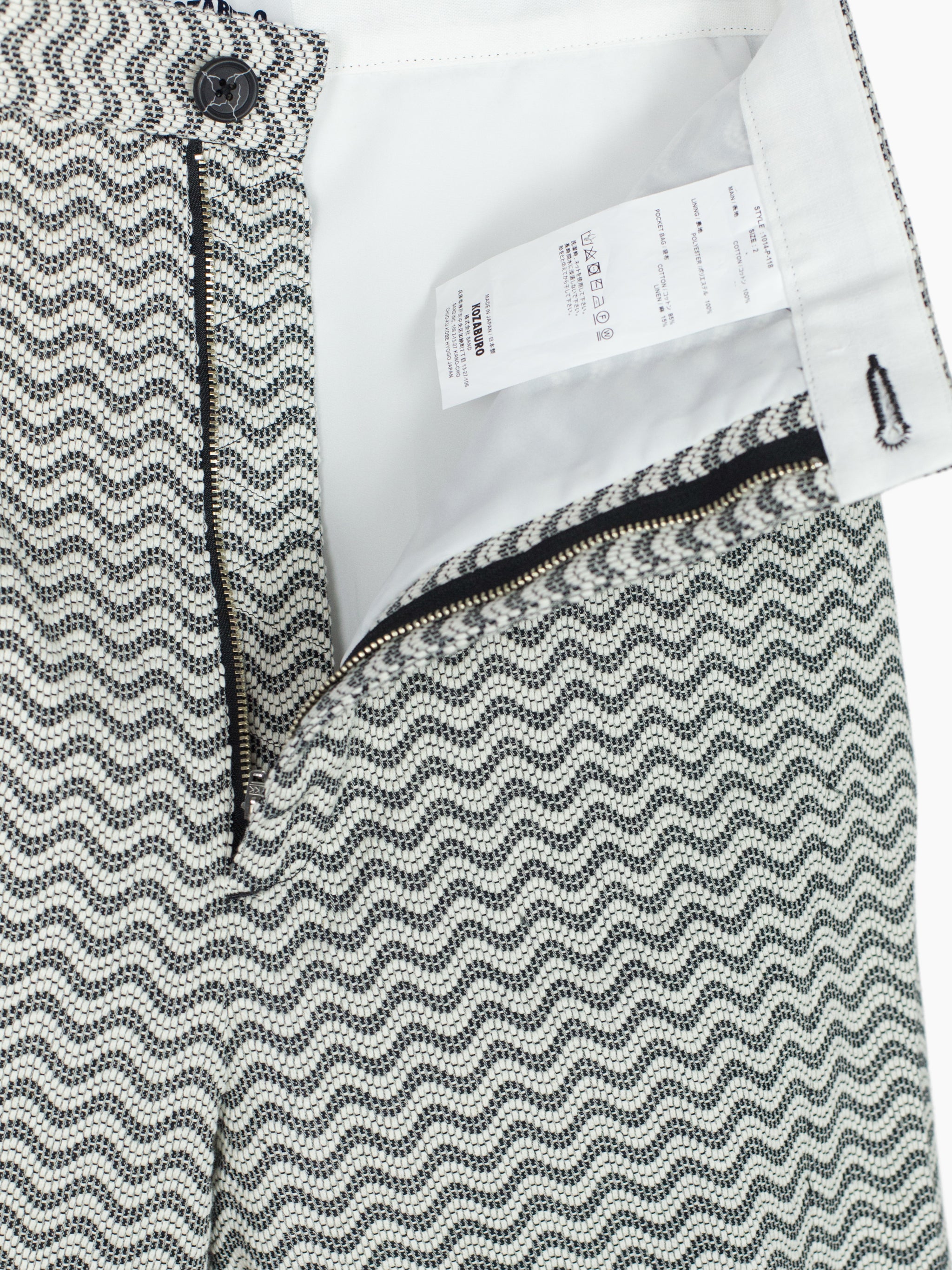 Returning for SS24 in an undulating black/white wave pattern jacquard, the Dexter pant features spiral leg construction that twists around the leg, dialing up the dynamic, movemented look that's foundational to the Kozaburo universe. The curved construction is abstract yet imbues the pants with a zen quality, equal parts directional and meandering, using soft sweeping curves to create an aggressive and graphic visual. Demonstrative of the Kozaburo expertise in blending the poetic, contemplative, and hard-edged.