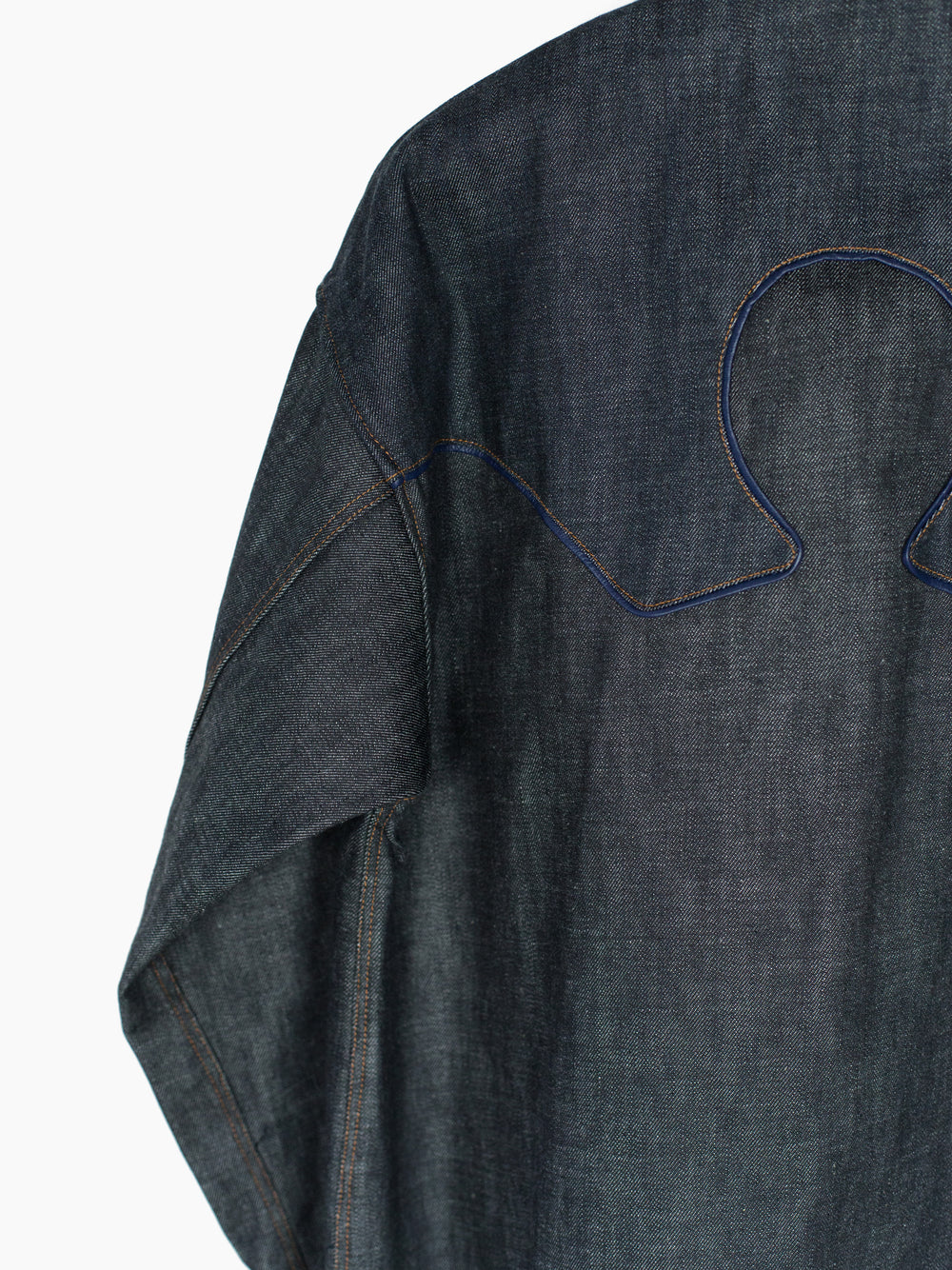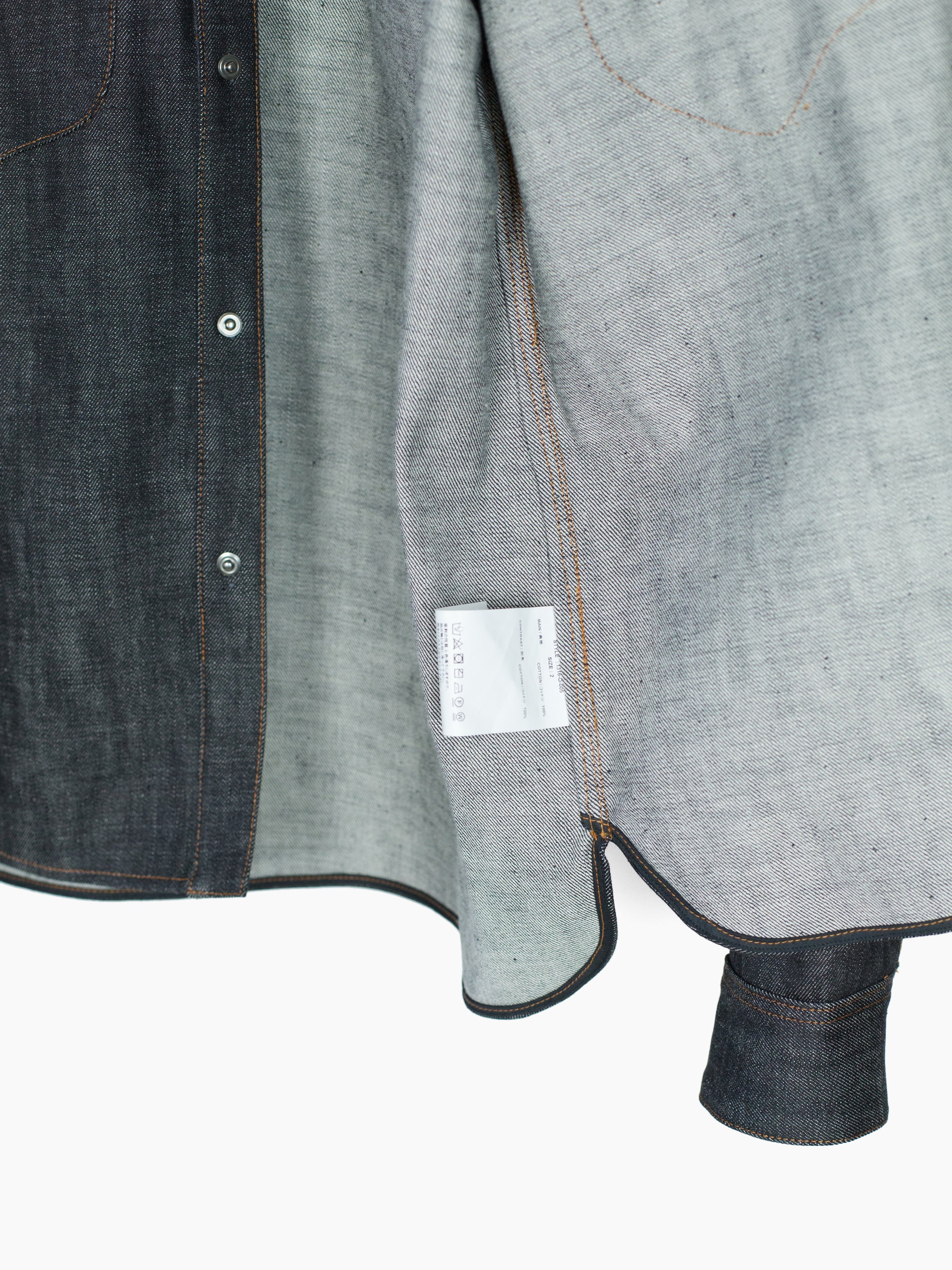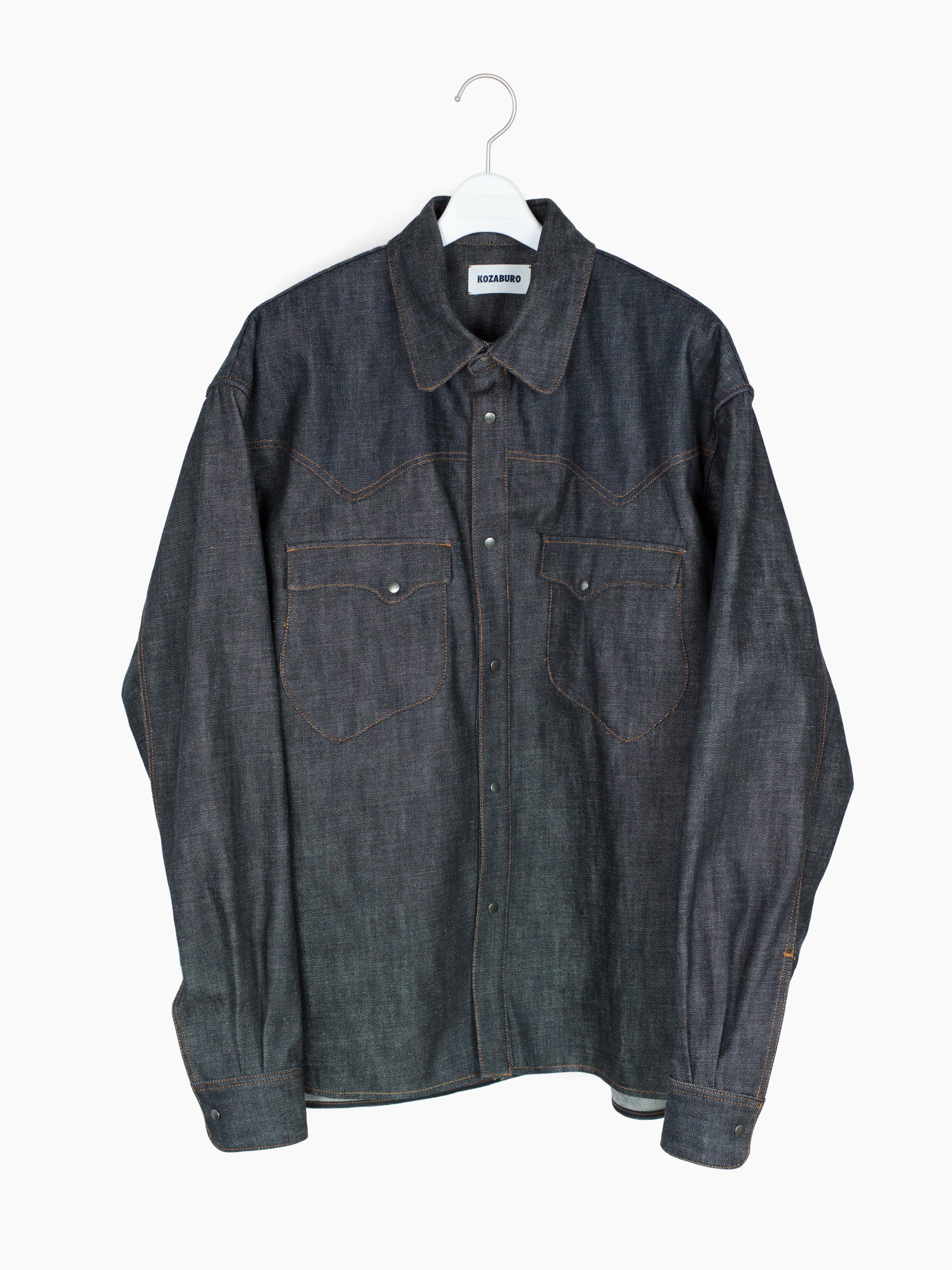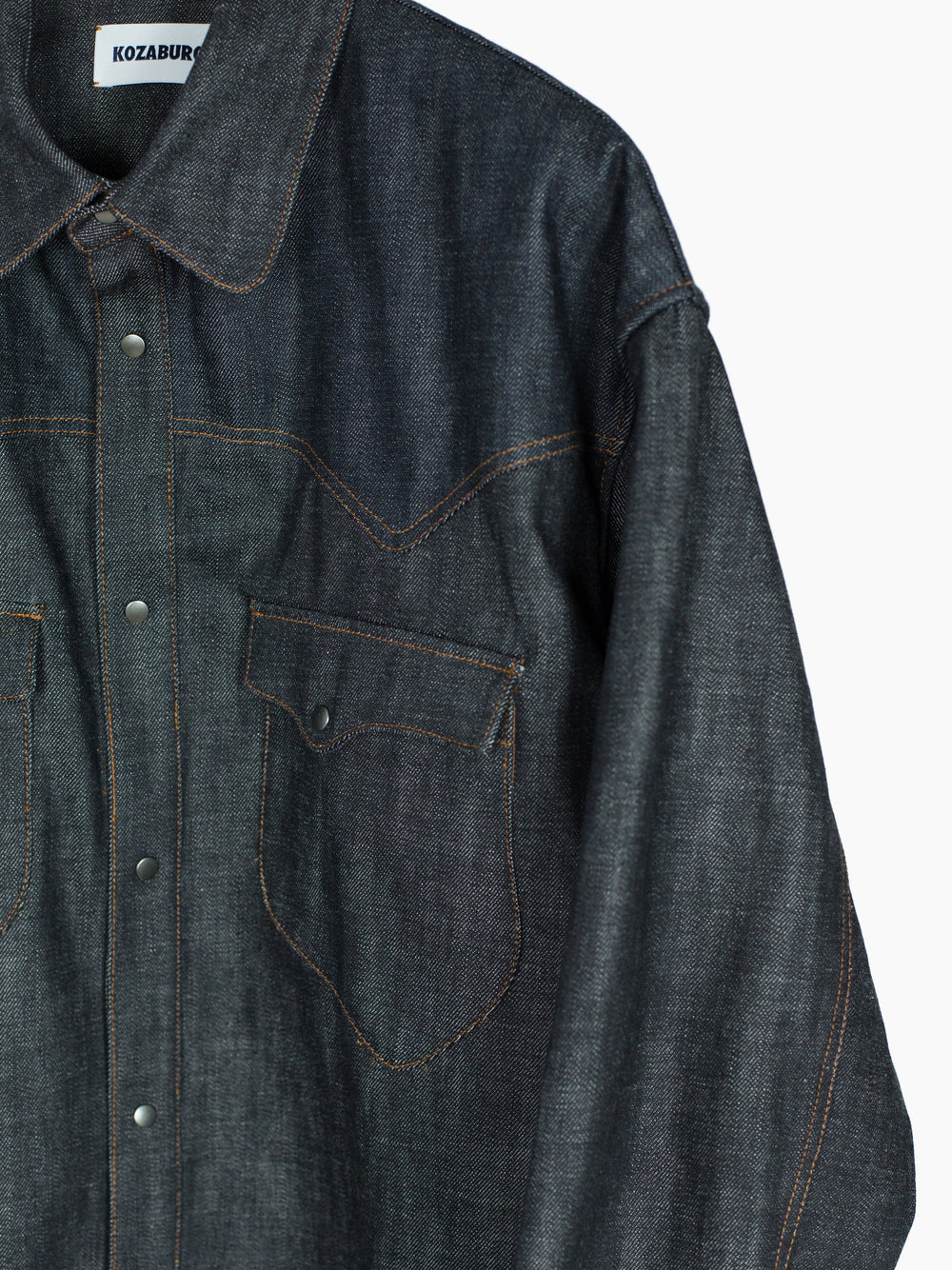 Raw black japanese denim western shirt with indigo contrast panelling/navy leather piping at chest and back yokes. Midweight, approx. 13oz denim that is still unrinsed and stiff. Very heavy for a shirt and will break in beautifully with wear.